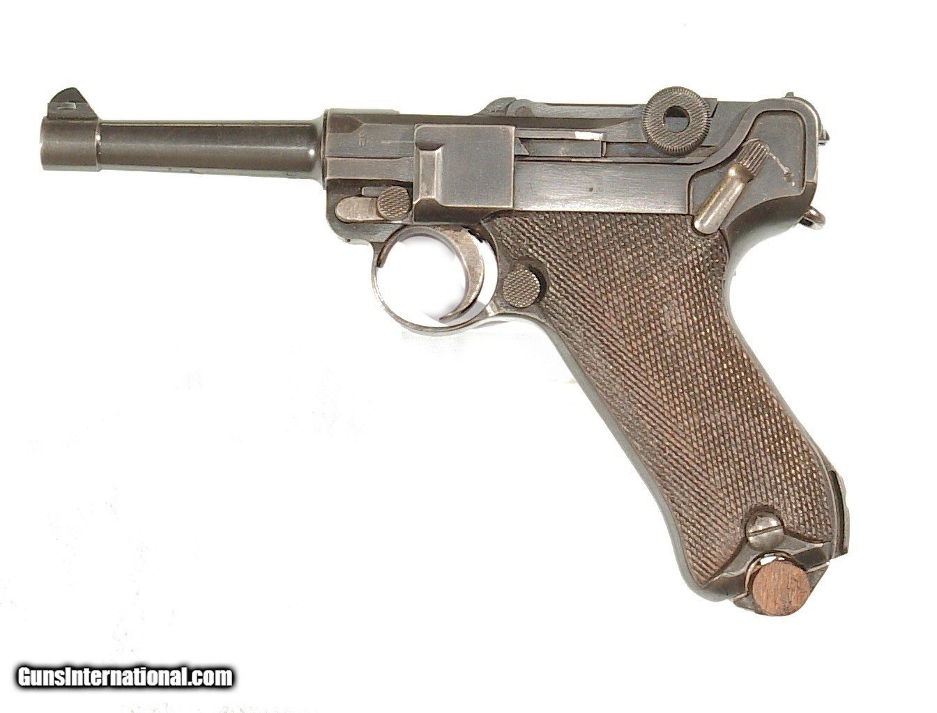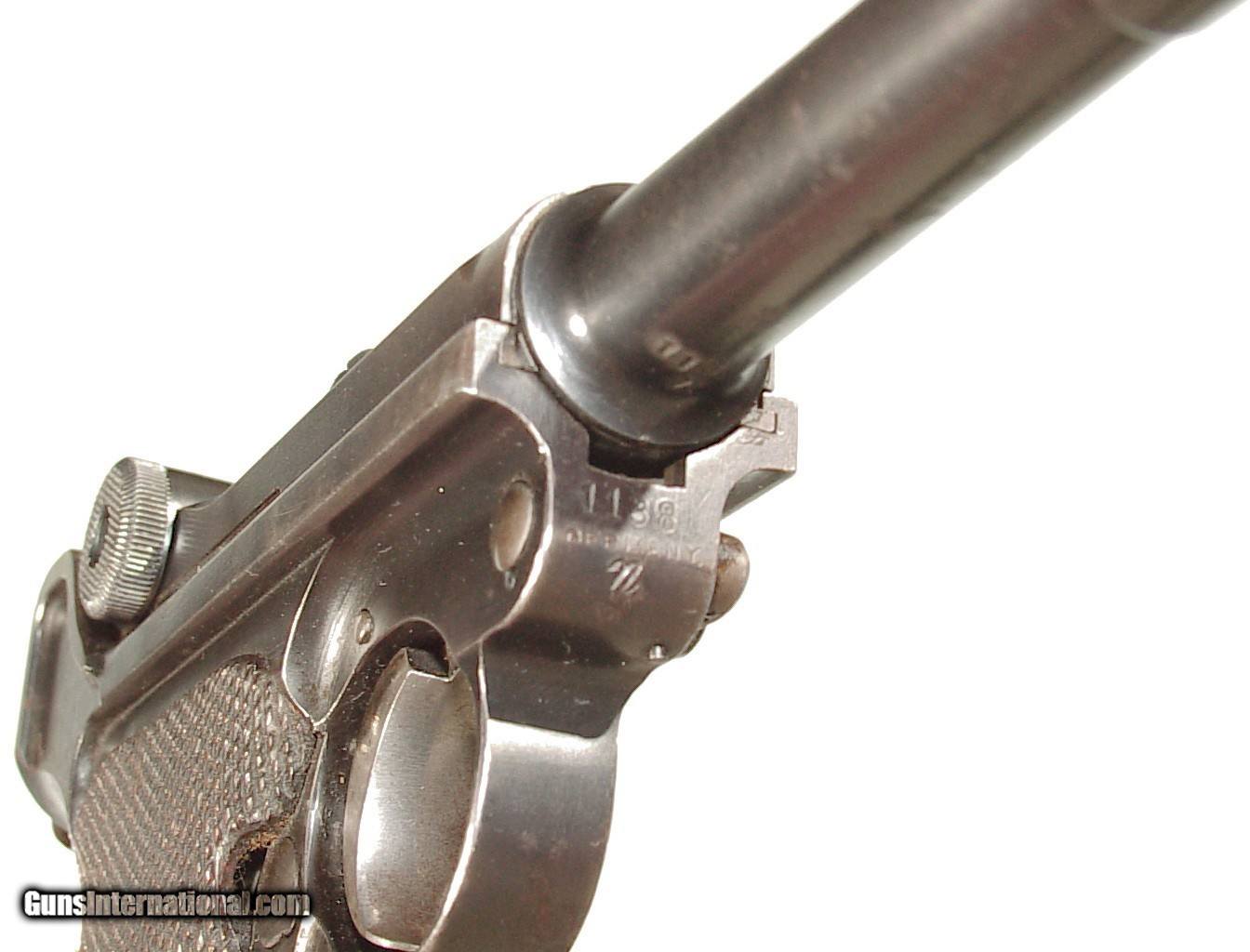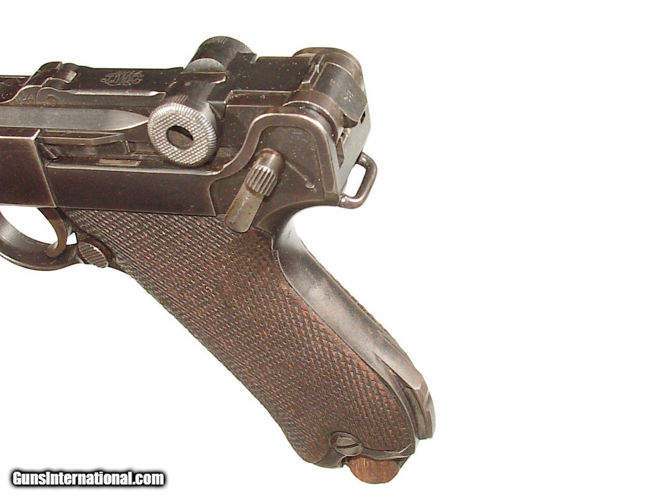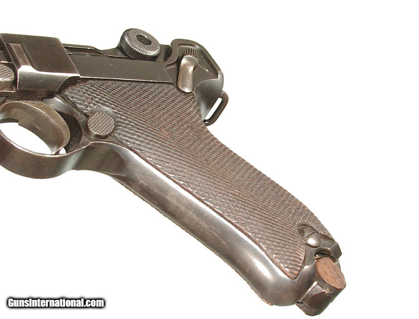 Description: .30 cal (7.65 mm) 3 7/8" barrel. (DWM) mfg. and marked on the toggle. "N" under crown proof on the barrel and upper receiver. Checkered walnut grips. Reworked from military surplus and marked "GERMANY" on the front of the receiver under the barrel. In very nice condition retaining most of the blue showing some light wear and edge highlighting from being in a holster. Mint bore. SOLD Curio/Relic: Yes |