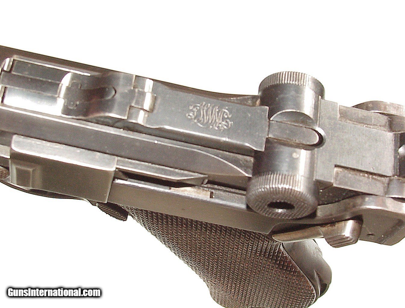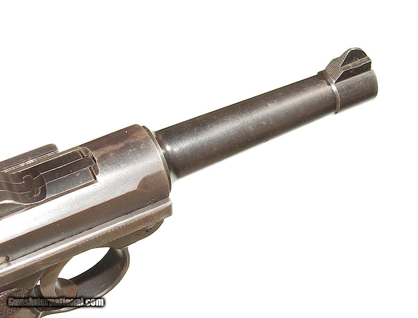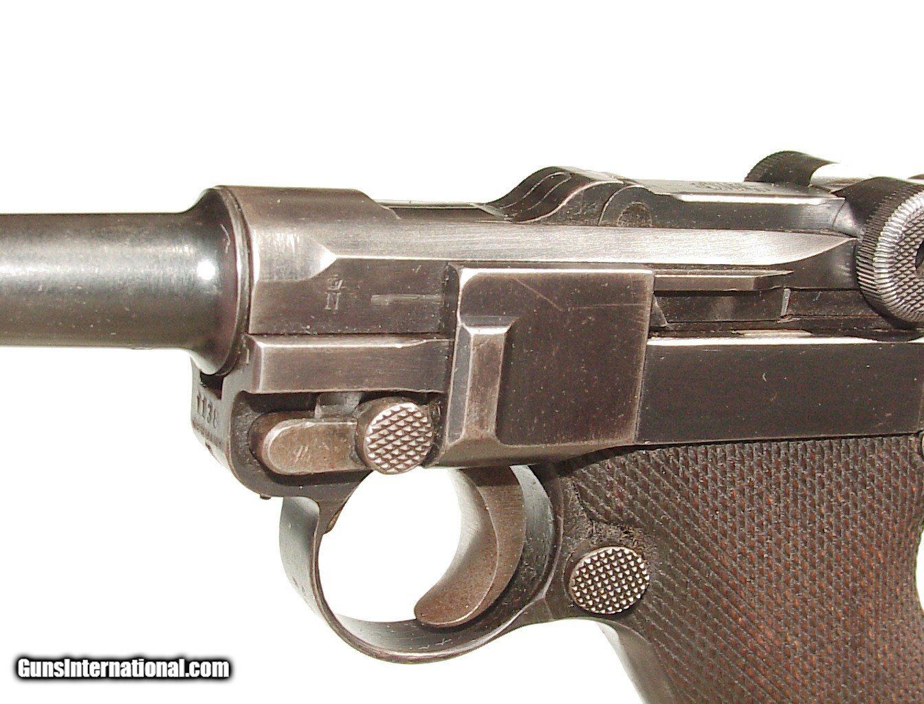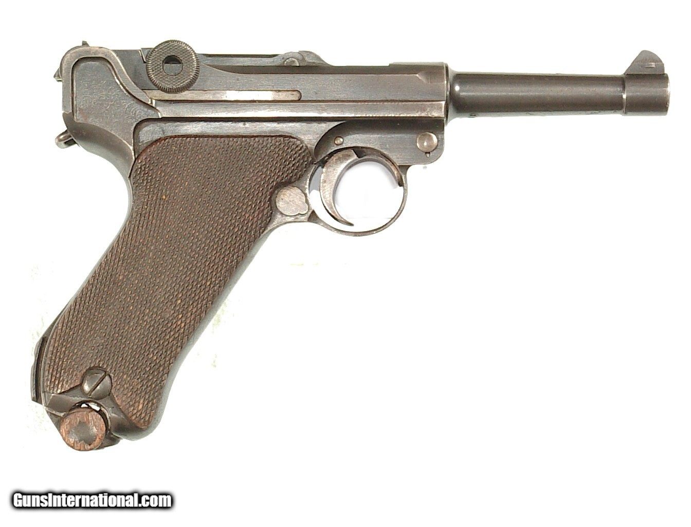 Description: .30 cal (7.65 mm) 3 7/8" barrel. (DWM) mfg. and marked on the toggle. "N" under crown proof on the barrel and upper receiver. Checkered walnut grips. Reworked from military surplus and marked "GERMANY" on the front of the receiver under the barrel. In very nice condition retaining most of the blue showing some light wear and edge highlighting from being in a holster. Mint bore. SOLD Curio/Relic: Yes |