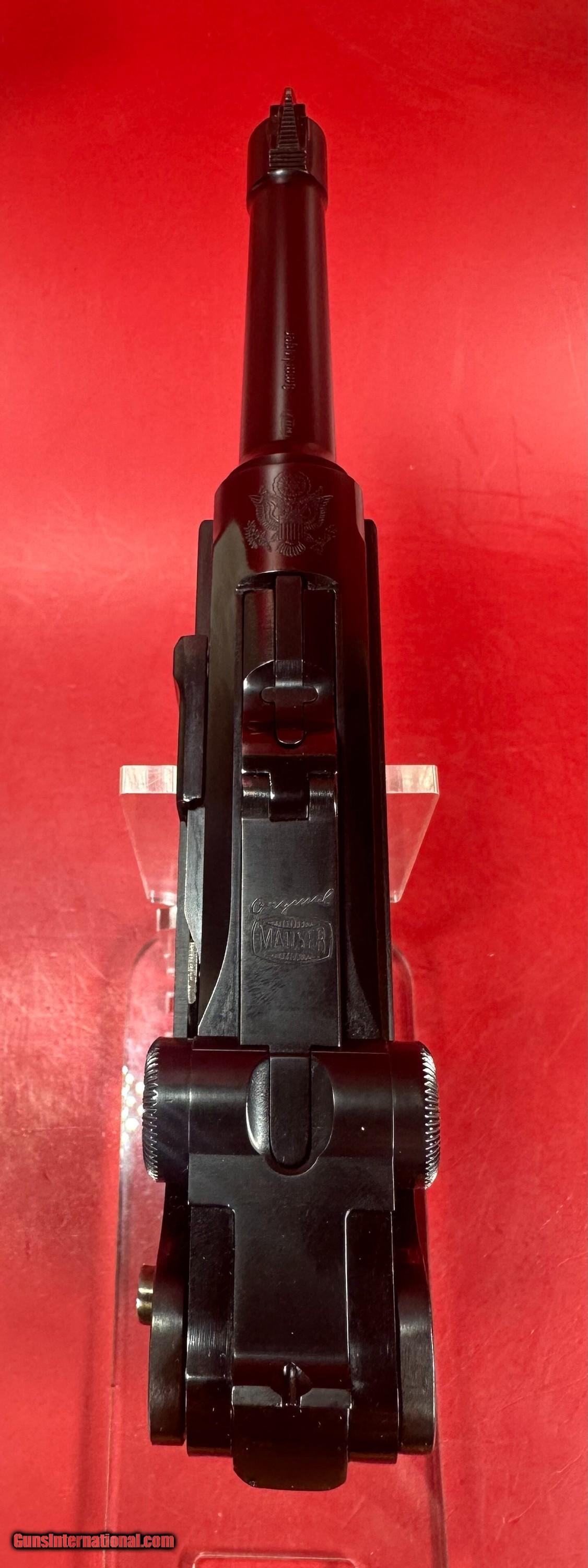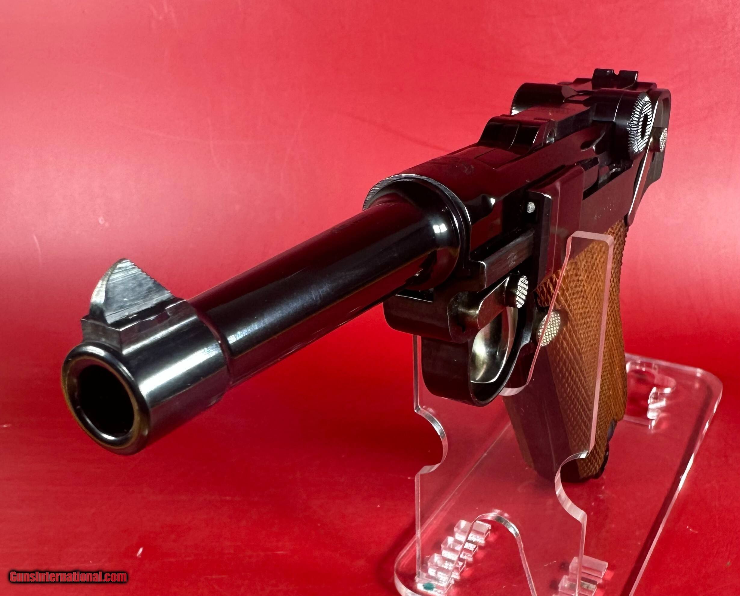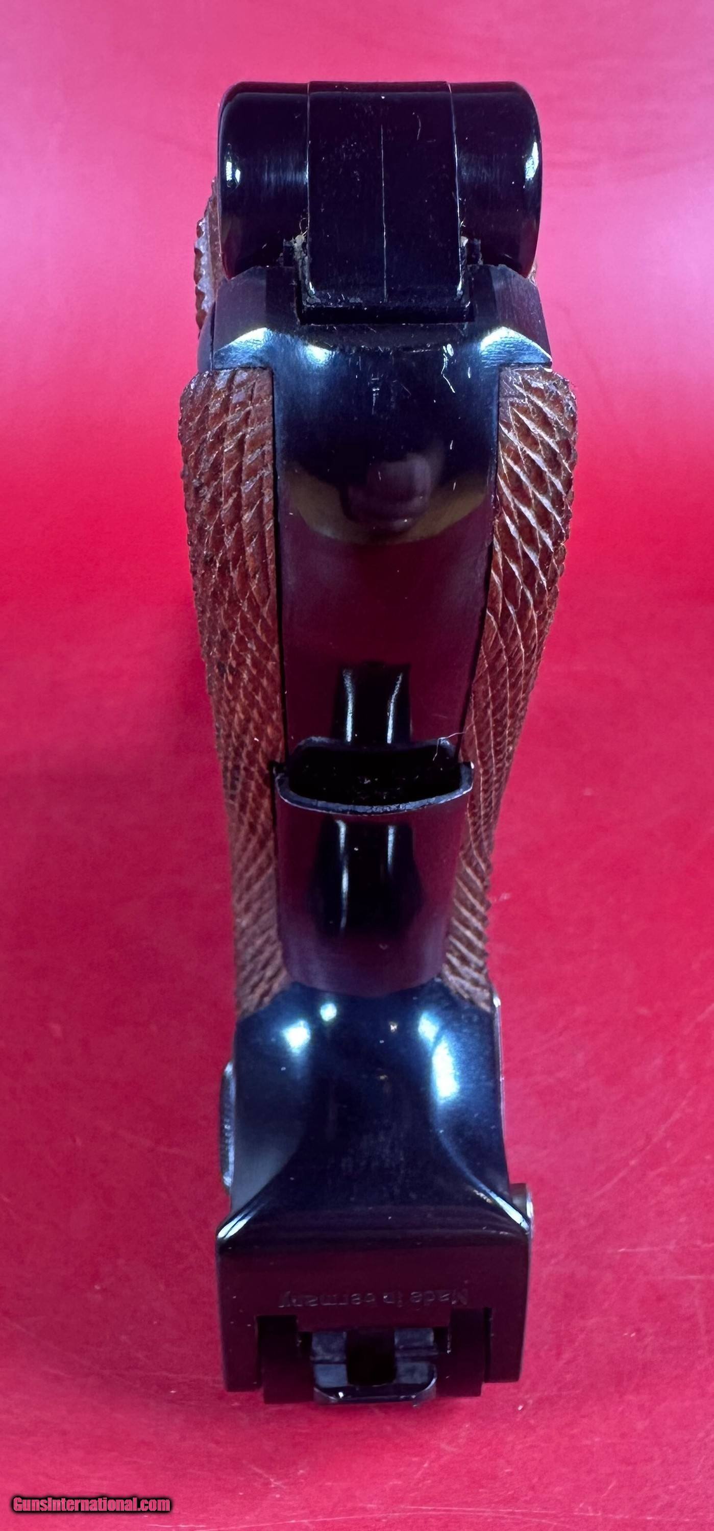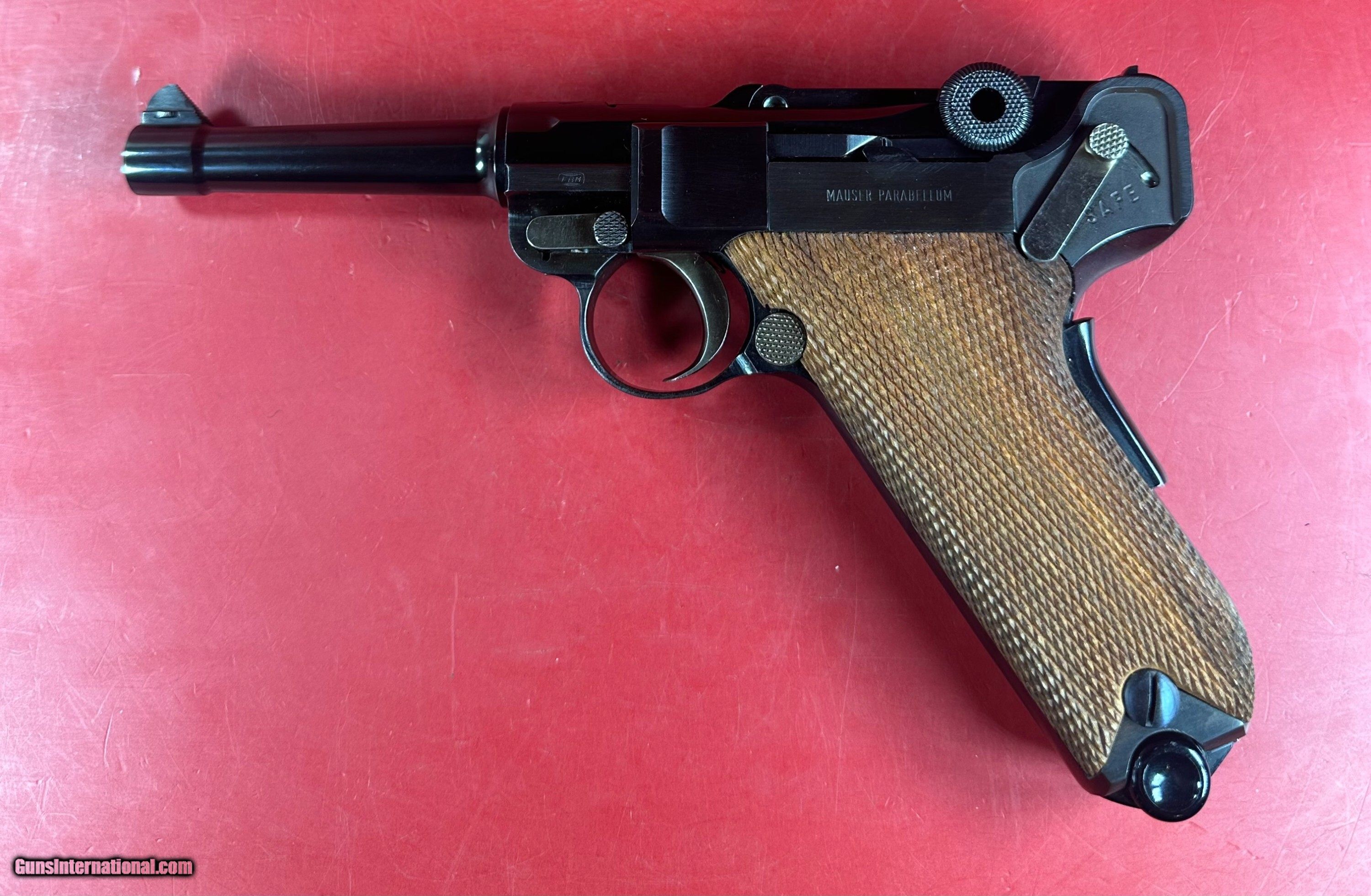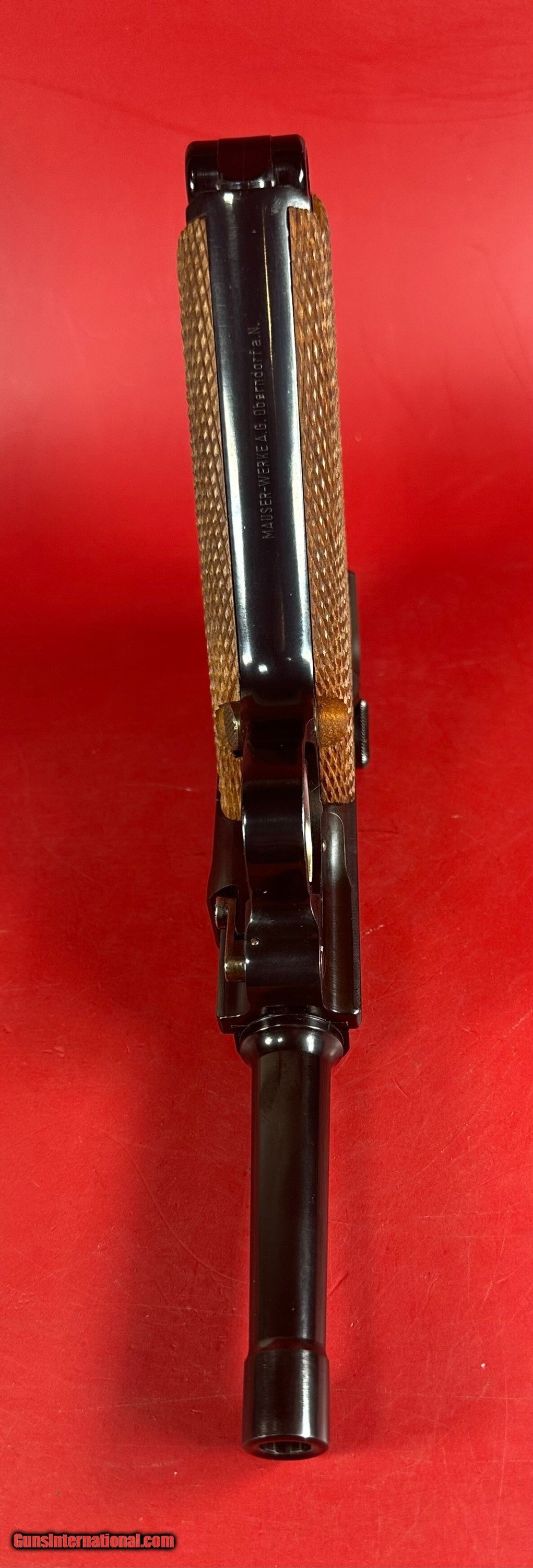 Description: After WWII, the demand for Luger pistols gradually picked back-up and copies of the original Luger pistols were made by Mauser as well as Stoeger. This pistol was made by Mauser. For sale Near Mint condition West German made Mauser-Werke “Original Mauser” American Eagle Parabellum 9mm Luger pistol 4" BBL with original matching box, manual, two magazines and tools. It has a grip safety as well as a manual safety. Perfect original high polish blue finish with perfect mechanics and shiny bore. Finish and grips are about 99%. Box is numbered and matches the pistol. This gun will make a great addition to any collection. C&R eligible. Manufacturer: Mauser-Werke A.G. Oberndorf a.N Caliber: 9,mm Luger Finish: Blue Barrel Length: 4" Optics/Sights: Serrated Ramp Front with U-Notch Rear Stock/Grips: Fully Checkered Walnut Grips Action: Semi-Automatic Layaway and no interest payment plan are available. SOLD Handgun Caliber: 9x19mm Parabellum (9mm Luger, 9x19mm NATO) |