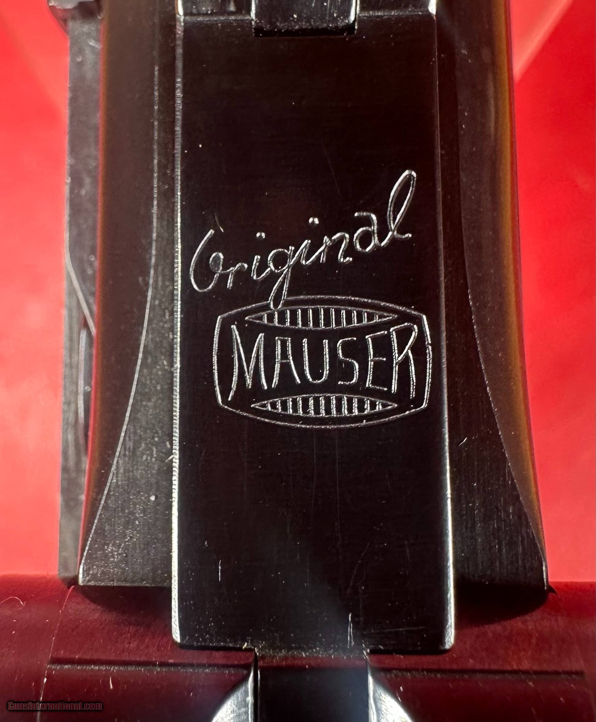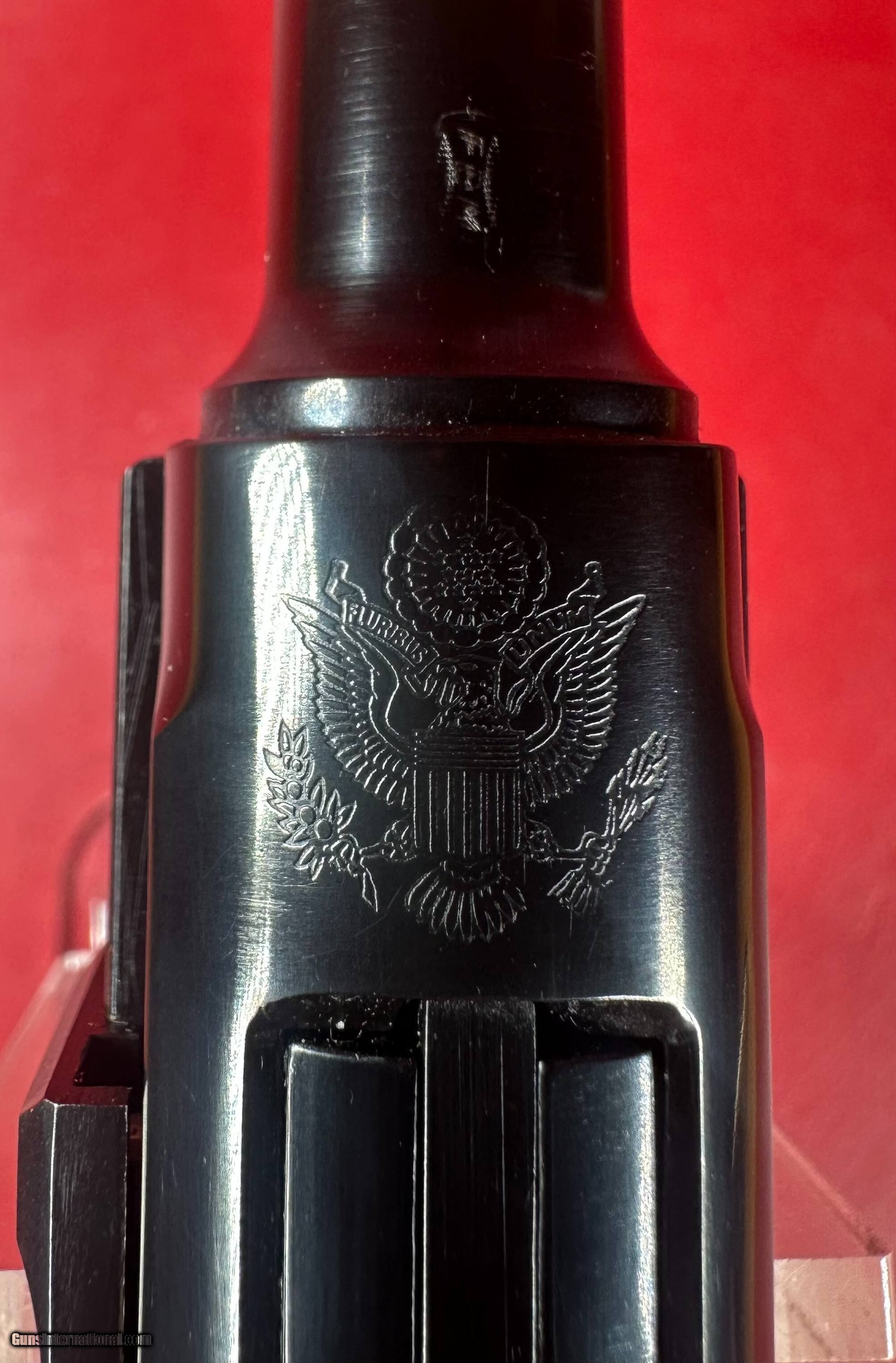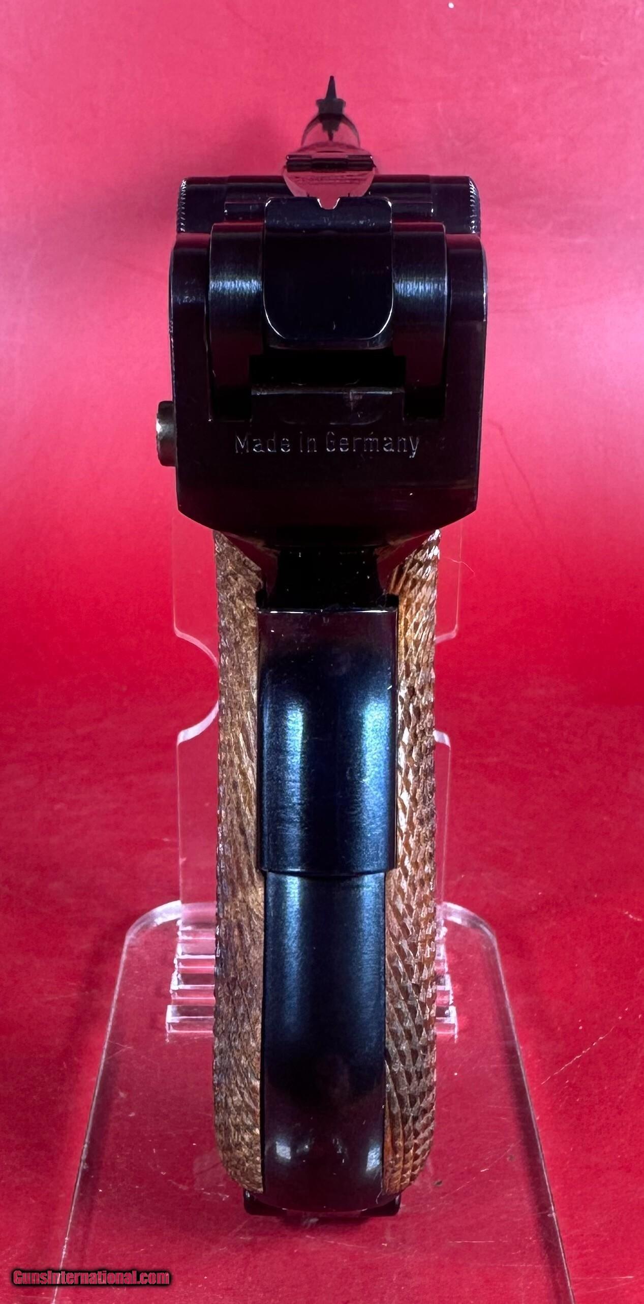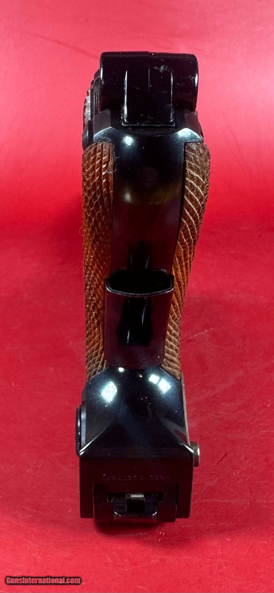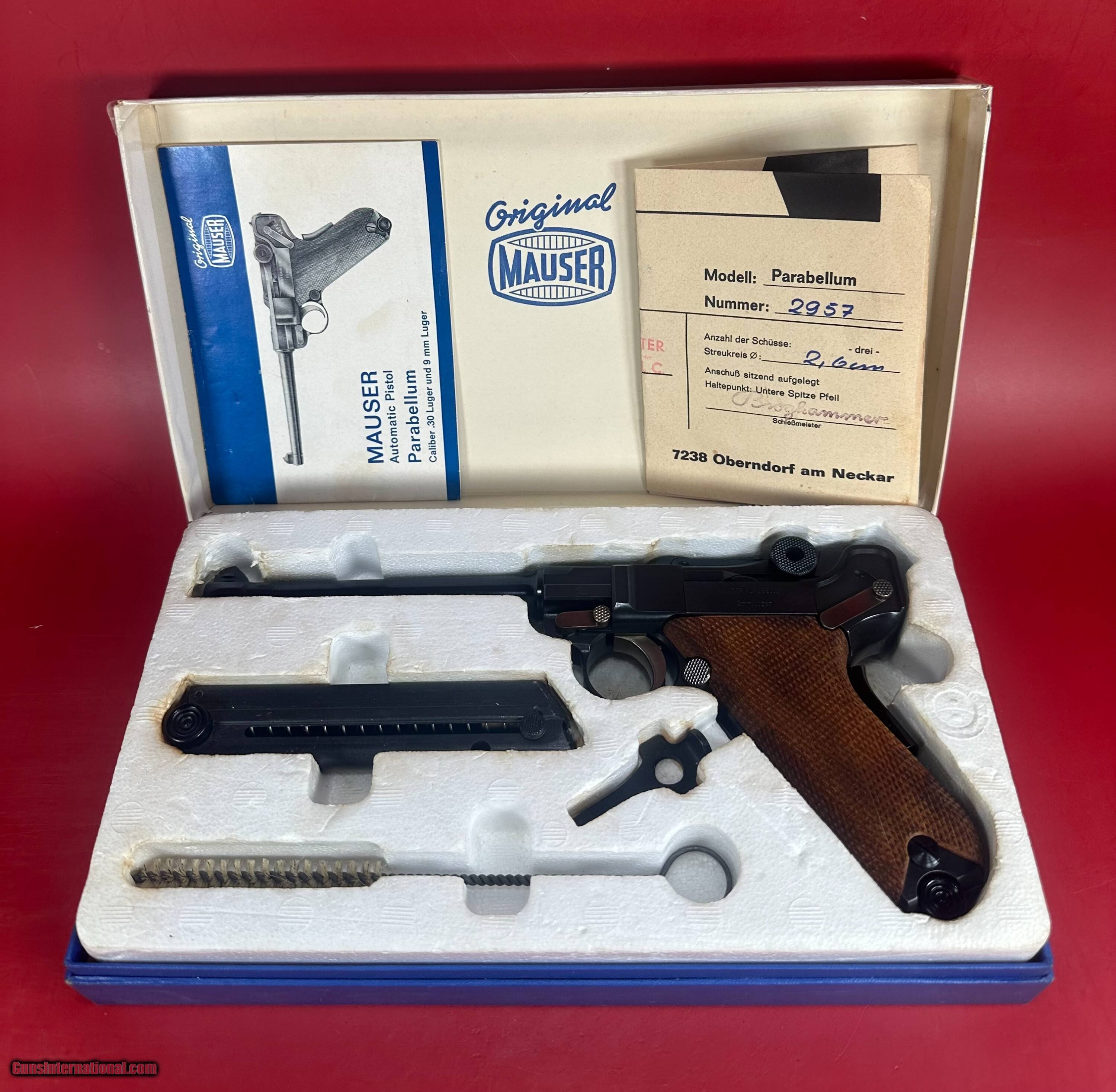 Description: After WWII, the demand for Luger pistols gradually picked back-up and copies of the original Luger pistols were made by Mauser as well as Stoeger. This pistol was made by Mauser. For sale Mint condition West German made Mauser-Werke “Original Mauser” American Eagle Parabellum 9mm Luger pistol 6" BBL with original matching box, manual, test target, two magazines and tools. It has a grip safety as well as a manual safety. Perfect original high polish blue finish with perfect mechanics and shiny bore. Finish and grips are about 99%. Box is numbered and matches the pistol. This gun will make a great addition to any collection. C&R eligible. Manufacturer: Mauser-Werke A.G. Oberndorf a.N Caliber: 9,mm Luger Finish: Blue Barrel Length: 6" Optics/Sights: Serrated Ramp Front with U-Notch Rear Stock/Grips: Fully Checkered Walnut Grips Action: Semi-Automatic Layaway and no interest payment plan are available. Handgun Caliber: 9x19mm Parabellum (9mm Luger, 9x19mm NATO) Price: $2,299.00 Shipping: $39.00 Contact Seller |