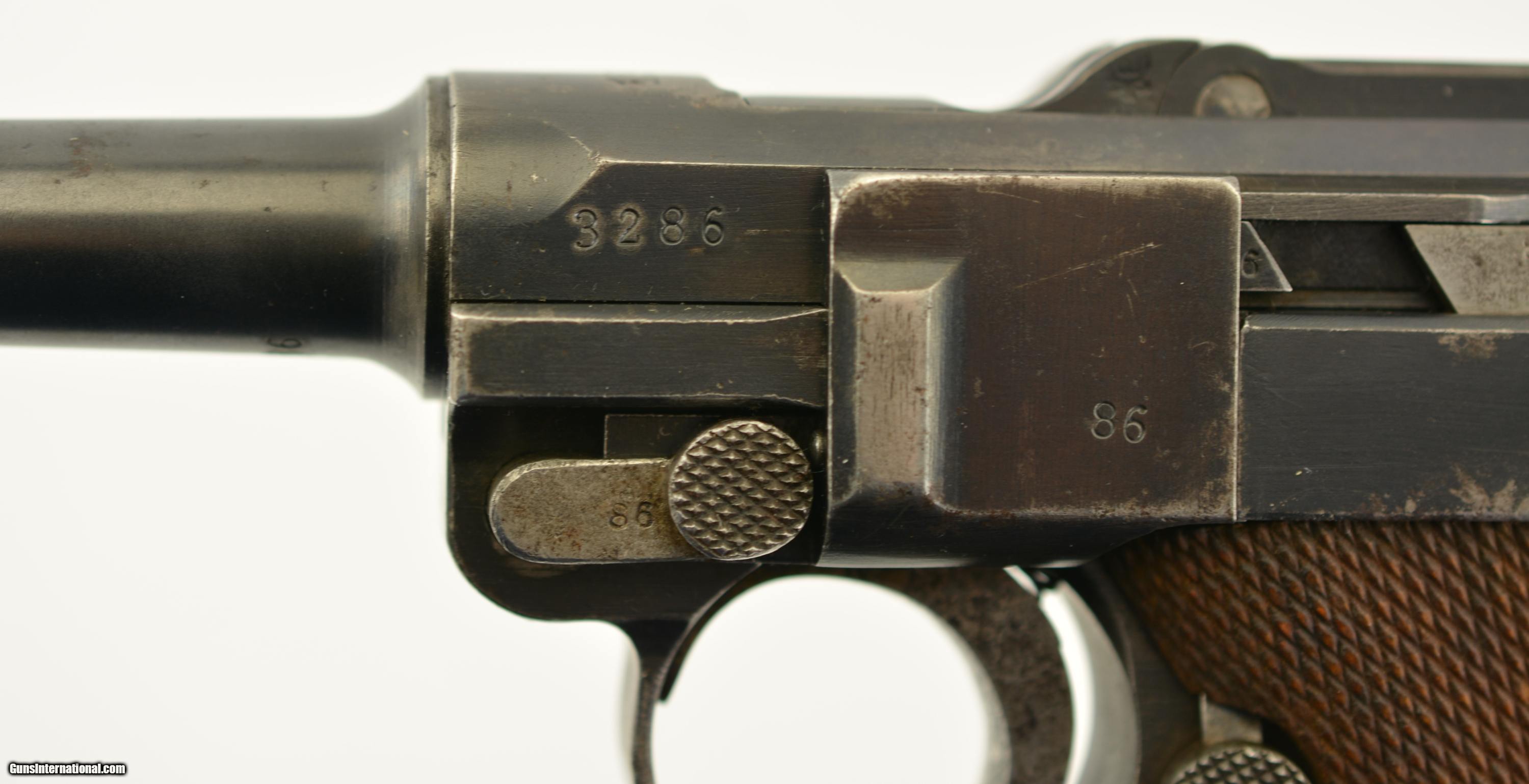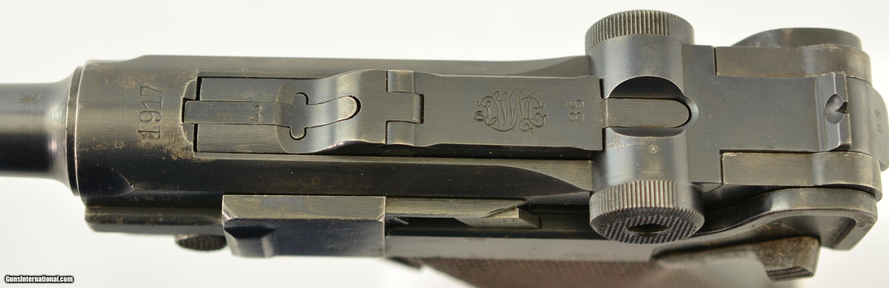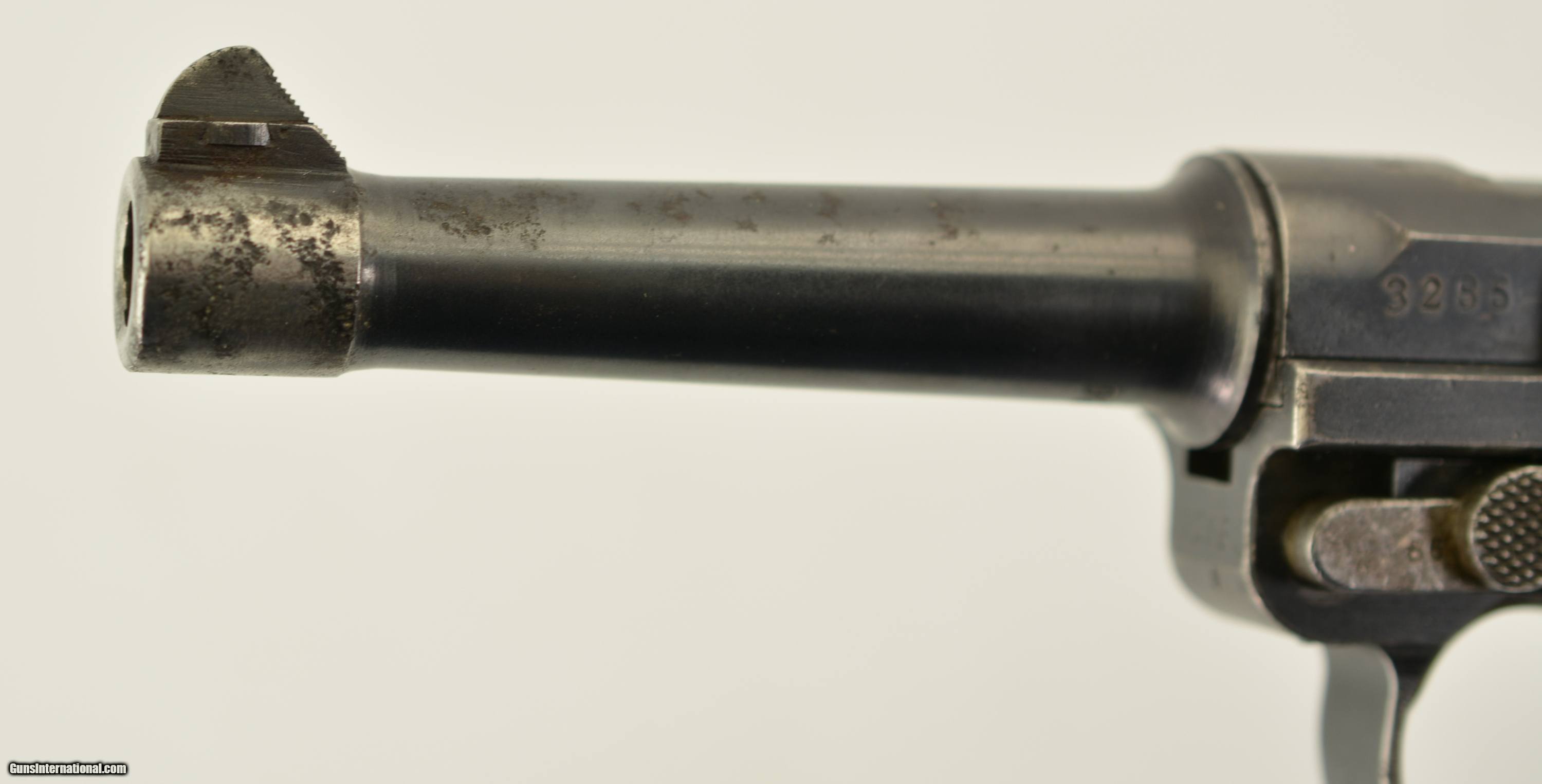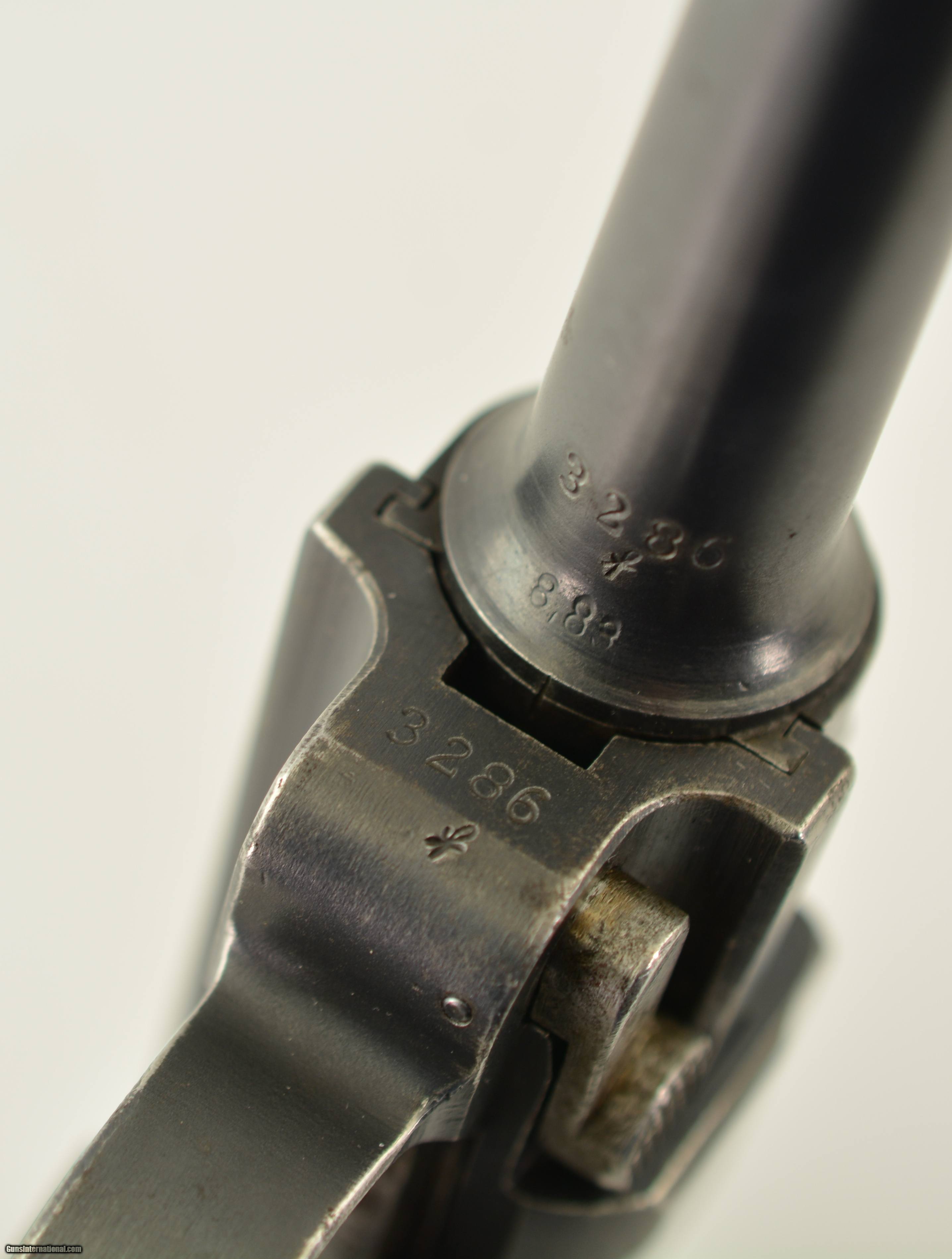 Description: Serial #3286f, 9mm Para., 4 inch barrel with a fine, bright bore that has very faint traces of freckling within the grooves. This is a 1917 dated pistol that has all matching numbers (except for the unnumbered grips) and the metal retaining 80-85% of the original blue finish that has silvered along the exposed edges and surfaces. Additionally, there is light-moderate pitting at the muzzle (which exhibits some cleaning as well) and on the left sides of the take-down lever, trigger, and safety lever. The trigger and take-down lever have lots of original straw color remaining on the right side, as do the magazine release and ejector. The checkered wooden grips are in very good shape with light flattening of the points on either side as well as some slightly heavier wear at the butt. The pistol comes with a single matching numbered wood base magazine and is a very good-fine example of a World War I Luger overall. FFL or C&R SOLD Curio/Relic: Yes Manufacturer: German Model: Luger Serial Number: 3286f Caliber Info: 9mm Gauge Info: 9mm |