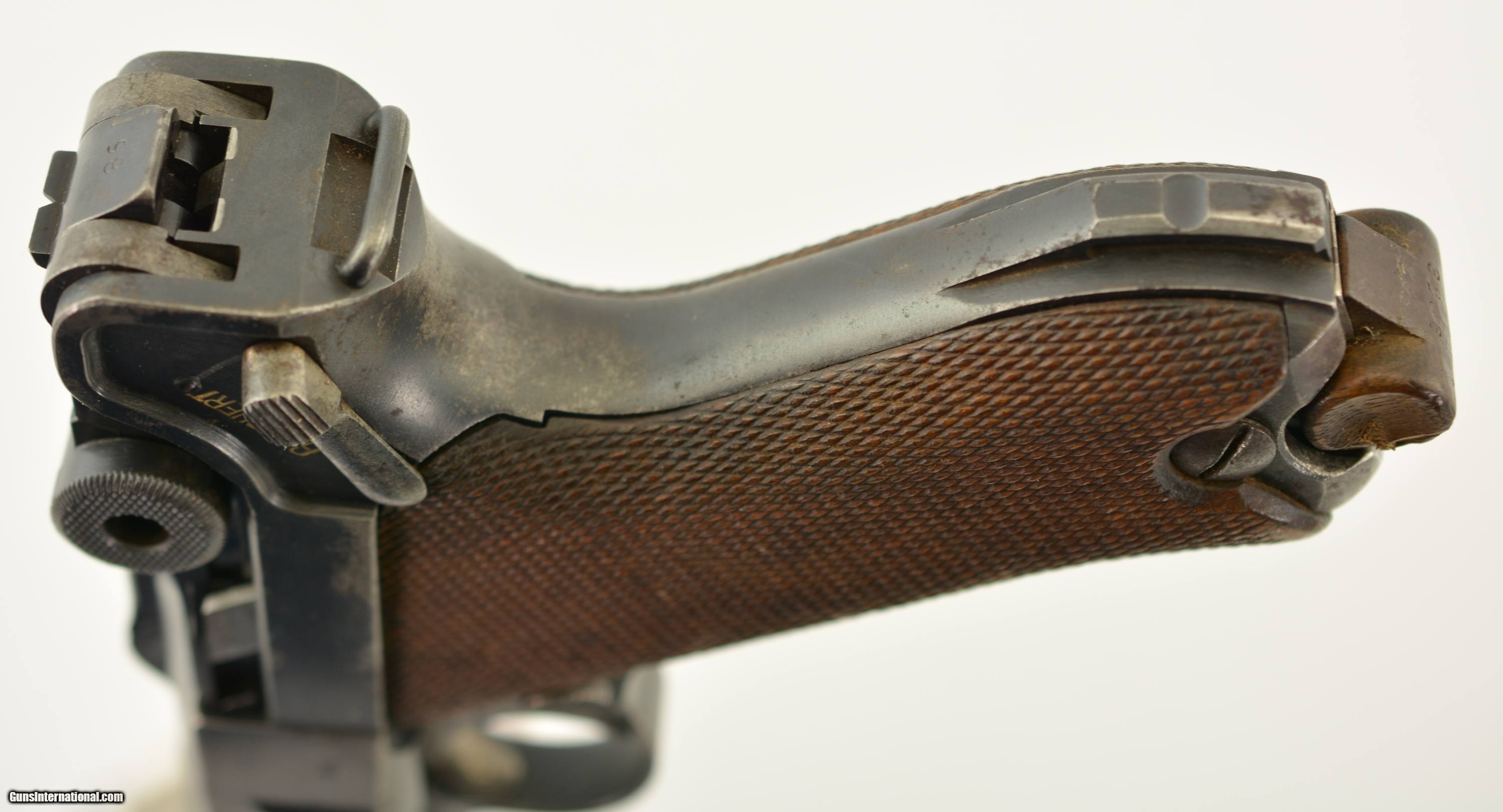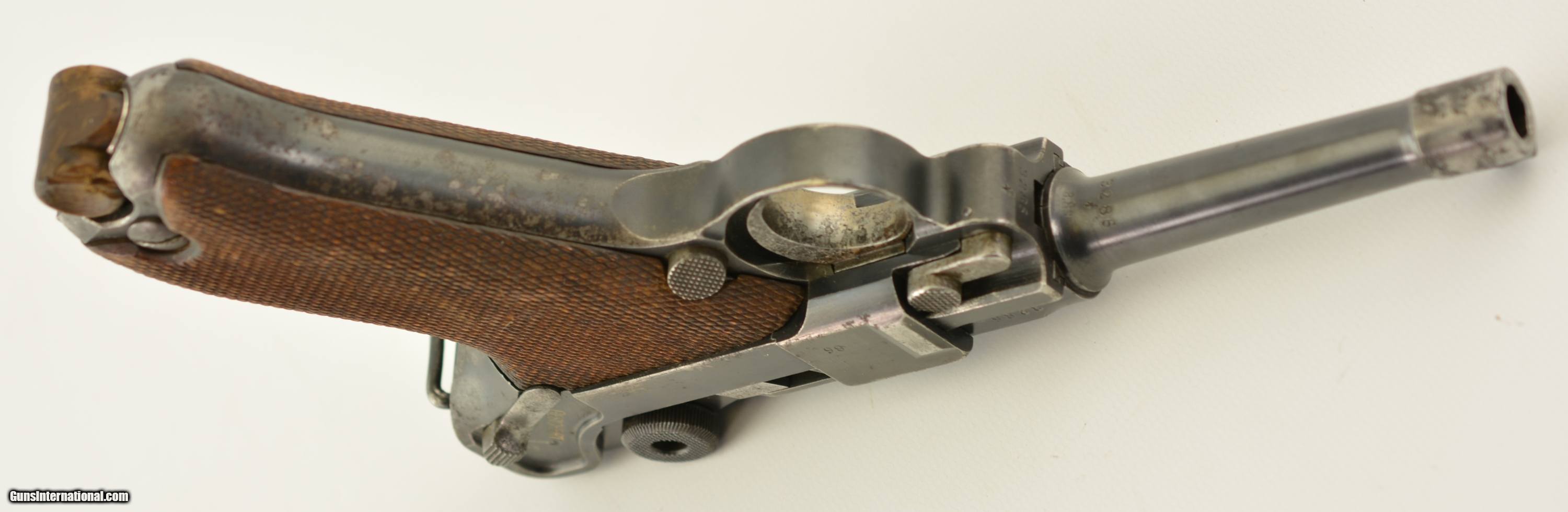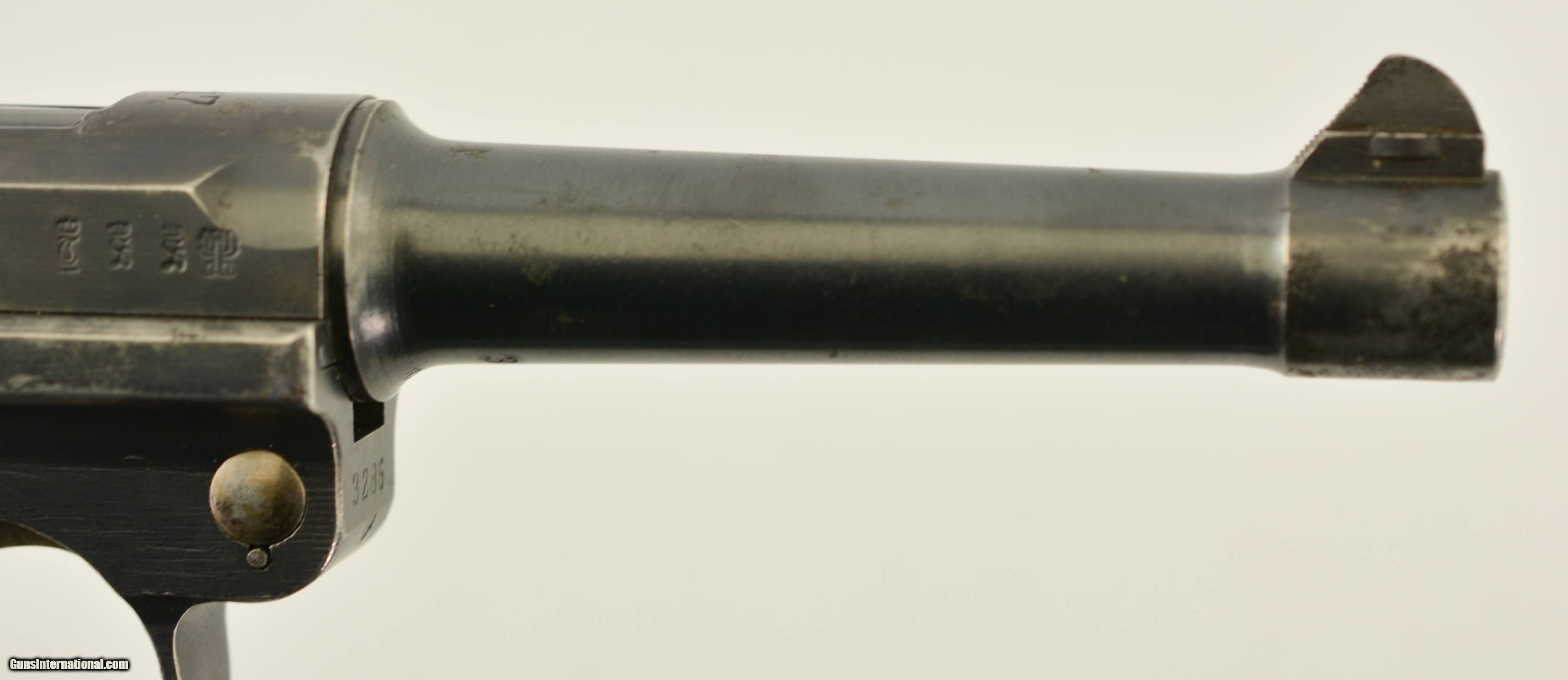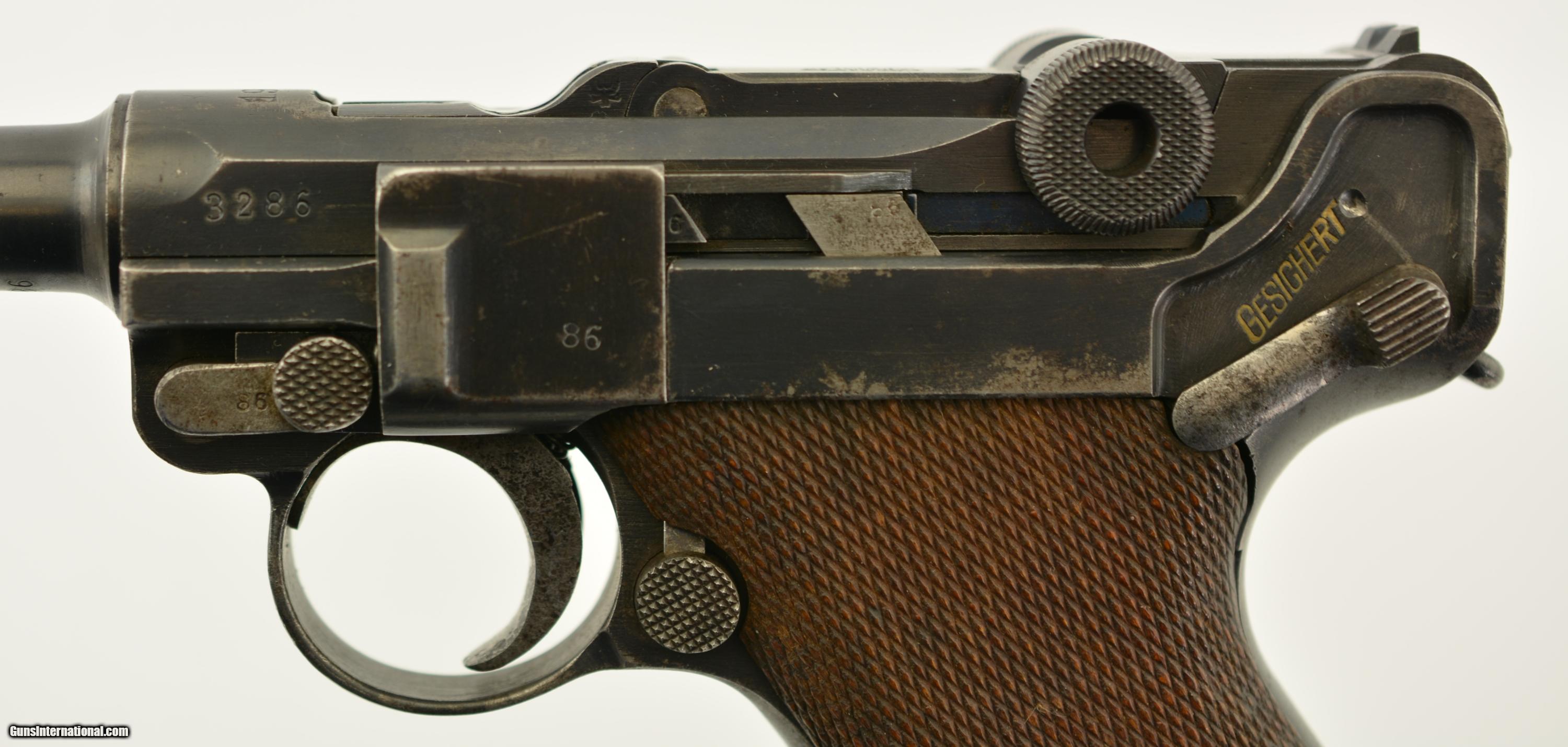 Description: Serial #3286f, 9mm Para., 4 inch barrel with a fine, bright bore that has very faint traces of freckling within the grooves. This is a 1917 dated pistol that has all matching numbers (except for the unnumbered grips) and the metal retaining 80-85% of the original blue finish that has silvered along the exposed edges and surfaces. Additionally, there is light-moderate pitting at the muzzle (which exhibits some cleaning as well) and on the left sides of the take-down lever, trigger, and safety lever. The trigger and take-down lever have lots of original straw color remaining on the right side, as do the magazine release and ejector. The checkered wooden grips are in very good shape with light flattening of the points on either side as well as some slightly heavier wear at the butt. The pistol comes with a single matching numbered wood base magazine and is a very good-fine example of a World War I Luger overall. FFL or C&R SOLD Curio/Relic: Yes Manufacturer: German Model: Luger Serial Number: 3286f Caliber Info: 9mm Gauge Info: 9mm |