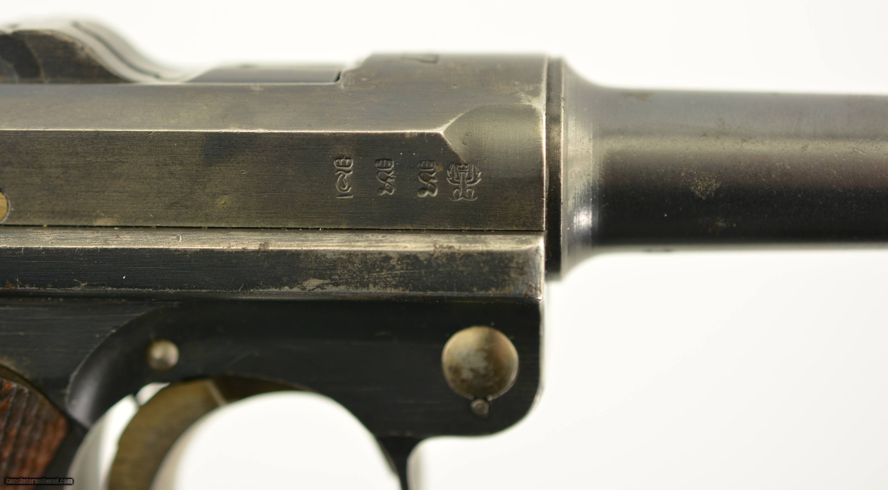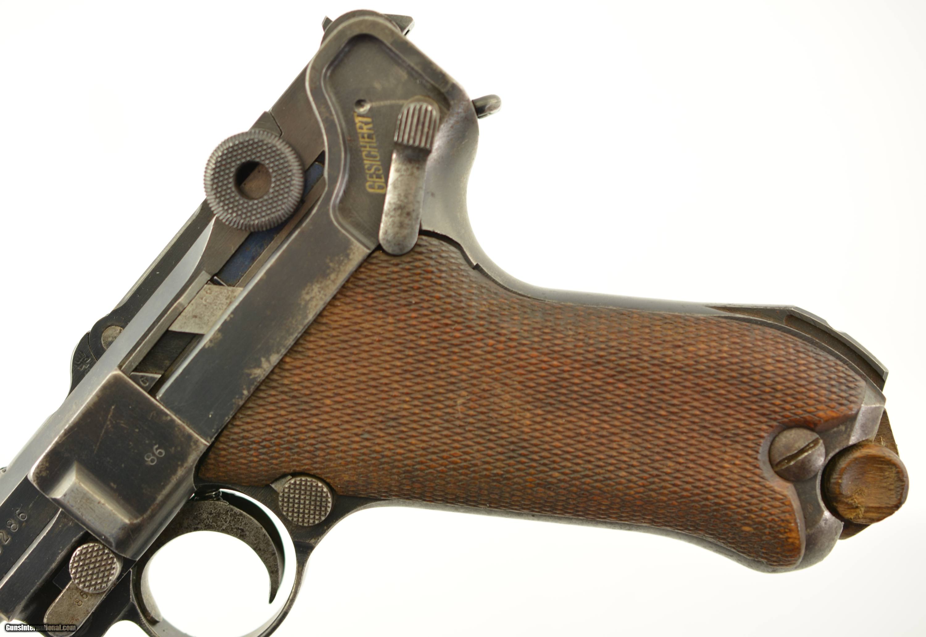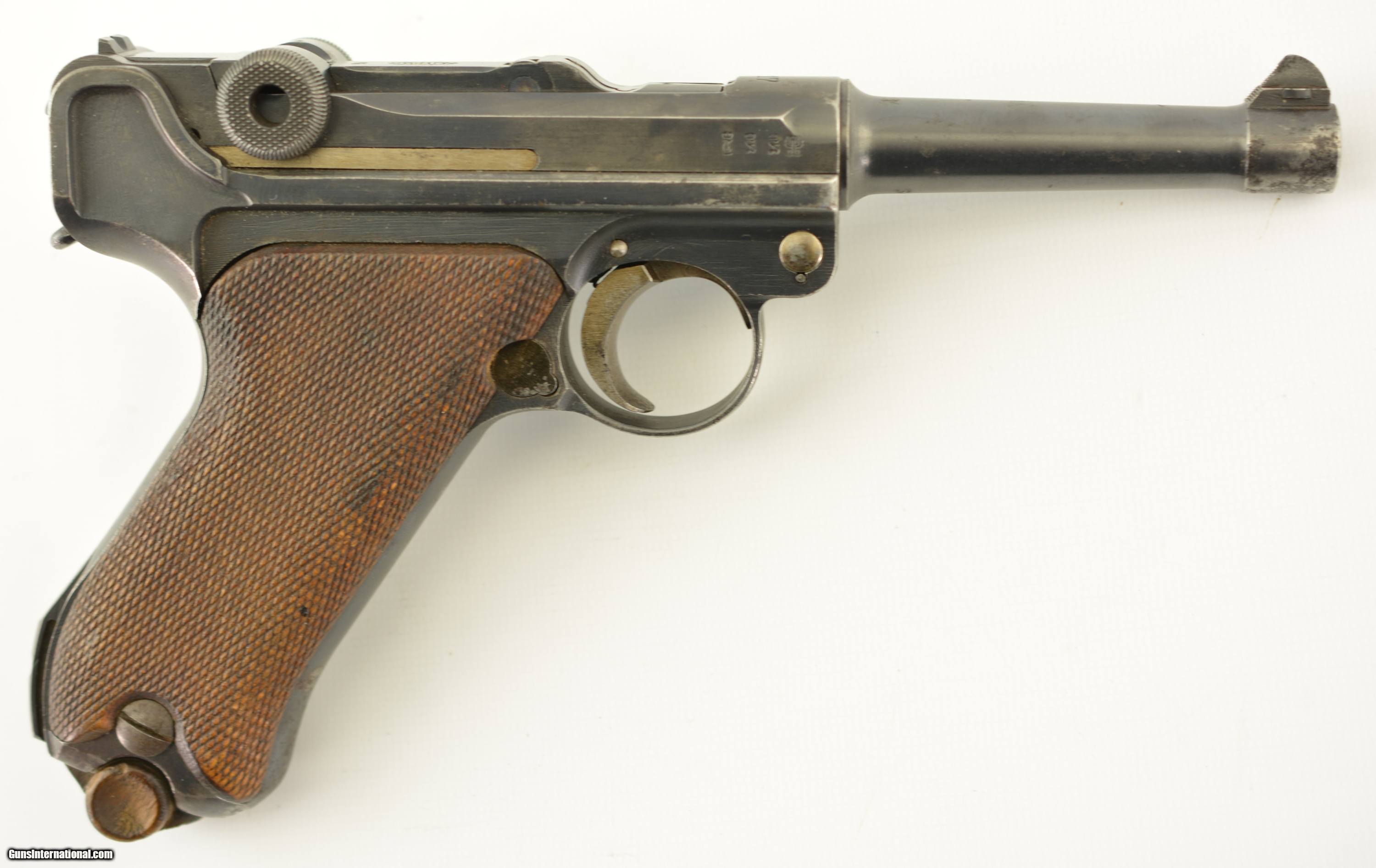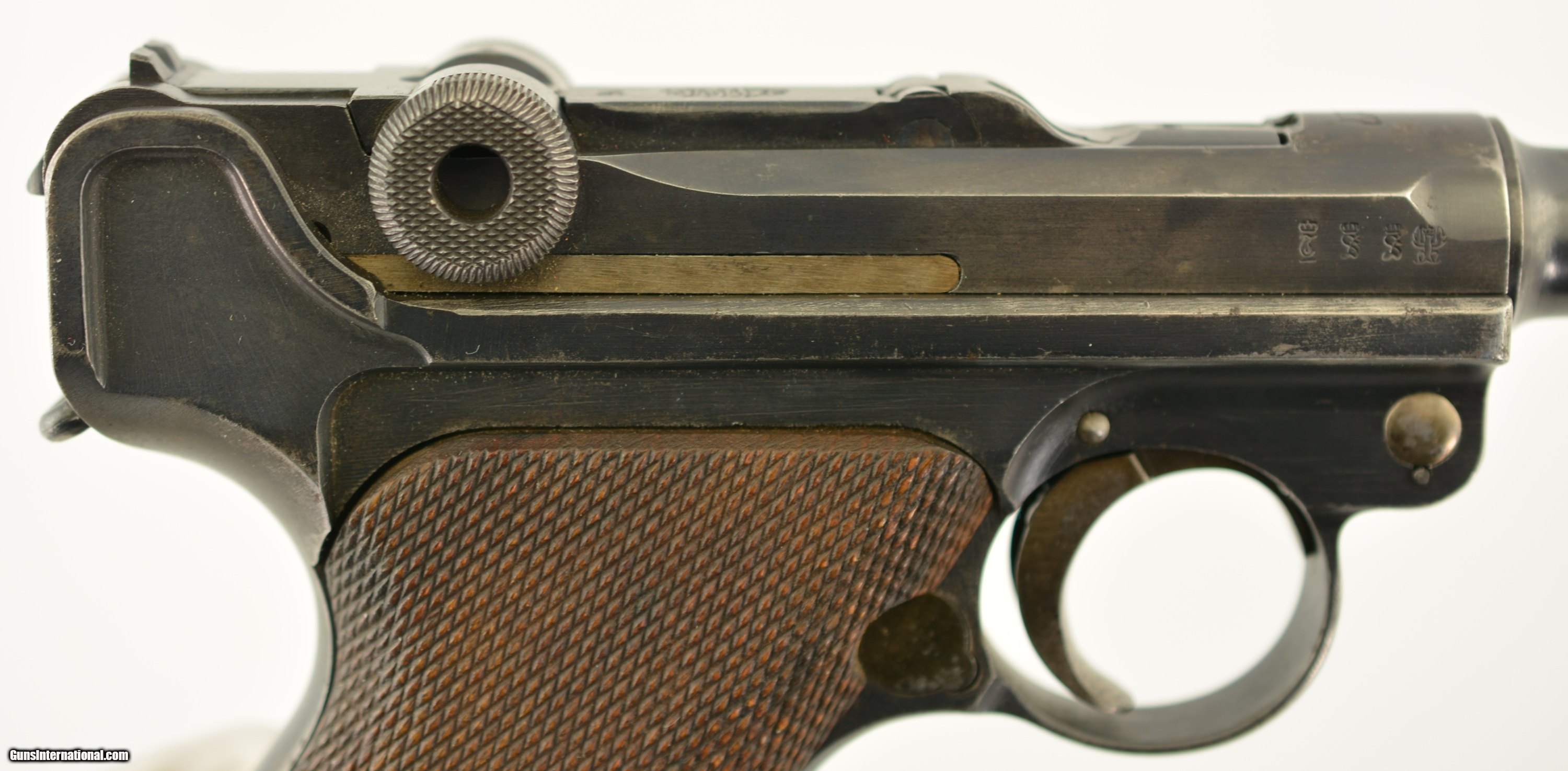 Description: Serial #3286f, 9mm Para., 4 inch barrel with a fine, bright bore that has very faint traces of freckling within the grooves. This is a 1917 dated pistol that has all matching numbers (except for the unnumbered grips) and the metal retaining 80-85% of the original blue finish that has silvered along the exposed edges and surfaces. Additionally, there is light-moderate pitting at the muzzle (which exhibits some cleaning as well) and on the left sides of the take-down lever, trigger, and safety lever. The trigger and take-down lever have lots of original straw color remaining on the right side, as do the magazine release and ejector. The checkered wooden grips are in very good shape with light flattening of the points on either side as well as some slightly heavier wear at the butt. The pistol comes with a single matching numbered wood base magazine and is a very good-fine example of a World War I Luger overall. FFL or C&R SOLD Curio/Relic: Yes Manufacturer: German Model: Luger Serial Number: 3286f Caliber Info: 9mm Gauge Info: 9mm |