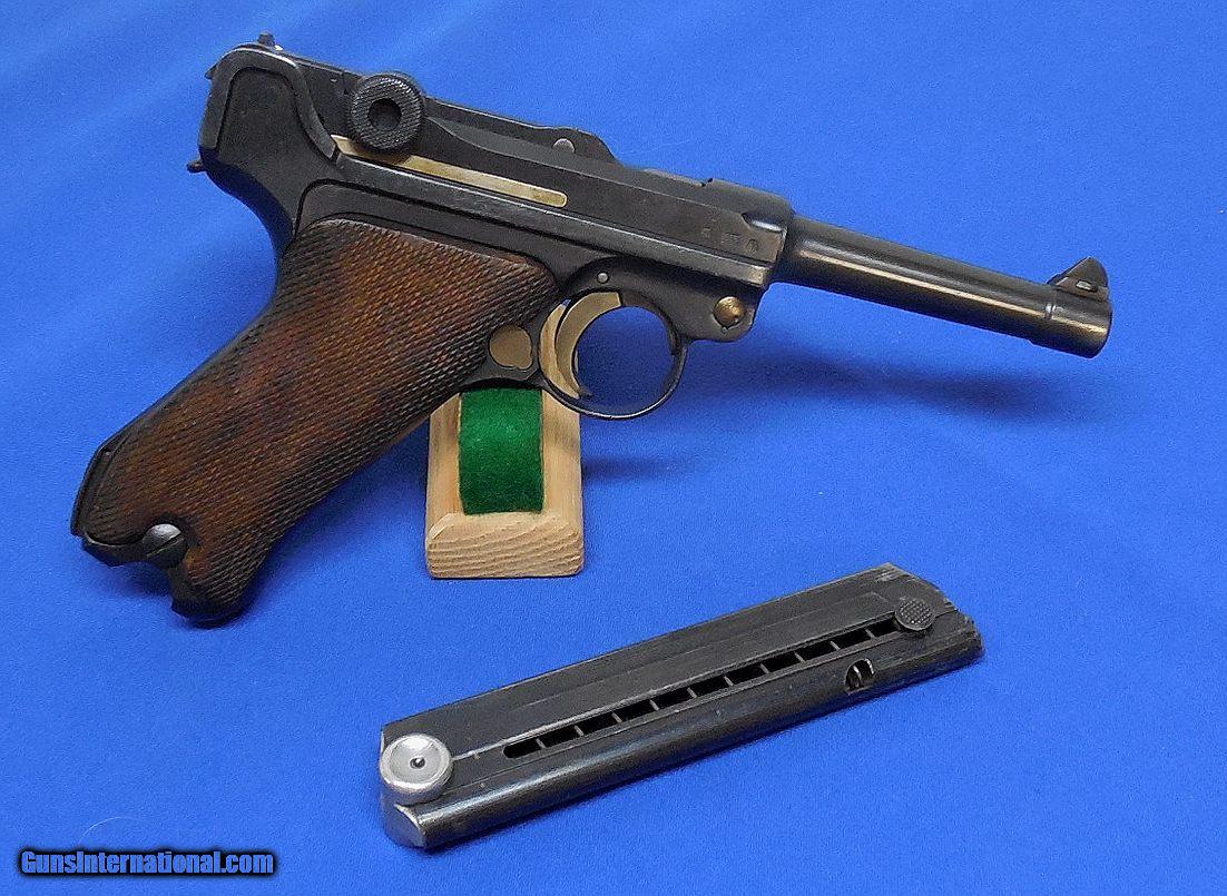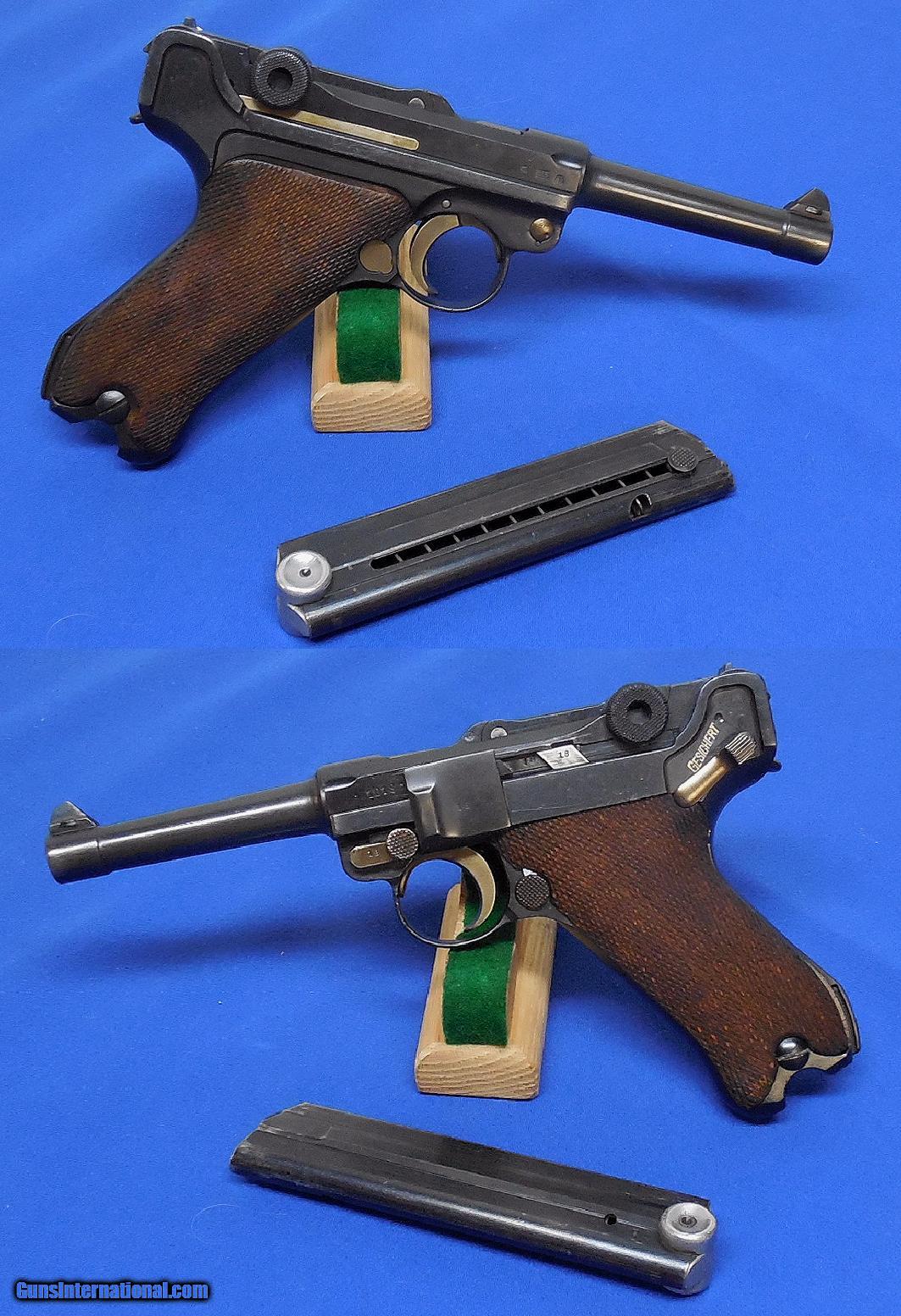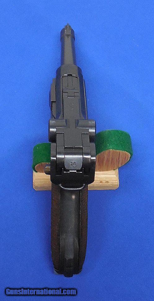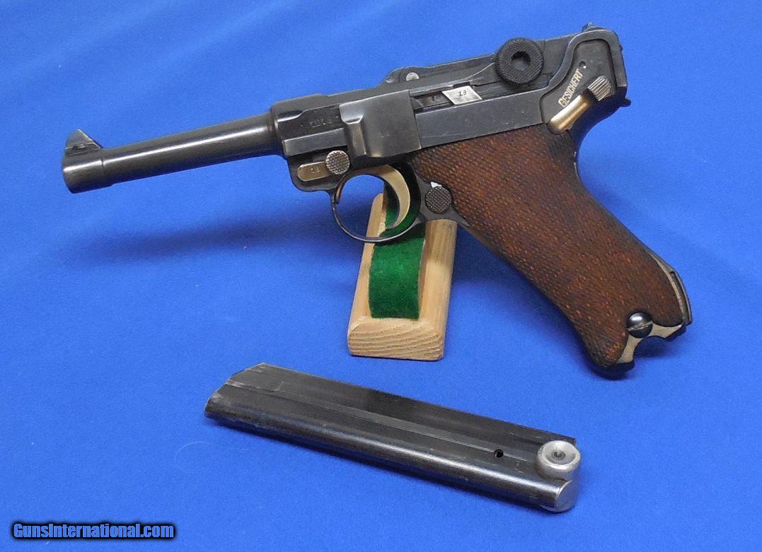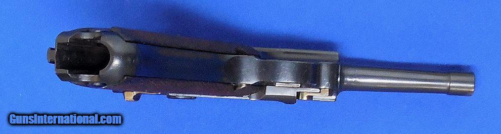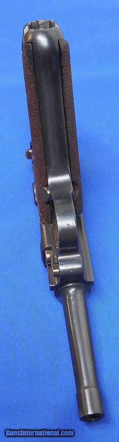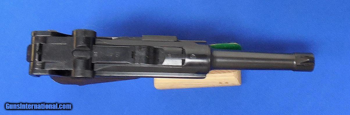 Description: German P.08 Luger "G" date Pistol, code: S/42 Mauser, serial # 1xx8 d, cal. 9mm, 4" barrel with a bright about excellent bore with minor frosting in the grooves. The metal surfaces retain 95% refinished blue along with the straw parts. There is some minor pinprick pitting on the trigger guard, breech block and side plate and scratches /tool marks on the right side of the frame below the receiver but nothing I would consider drastic. The toggle is marked with an "S/42" assembly code, the chamber is G-dated and all of the visible numbered parts are matching with the exception of the grooved firing pin which is numbered 67 to a different gun. The checkered walnut grips rate about very good with an overall flattening of the points and they are not numbered on their interior. Included is a single blue-bodied, aluminum-based magazine. The overall condition is very good - very good plus. Inv.: # 1-1322 SOLD Curio/Relic: Yes |