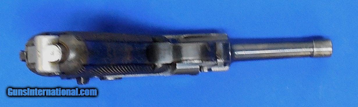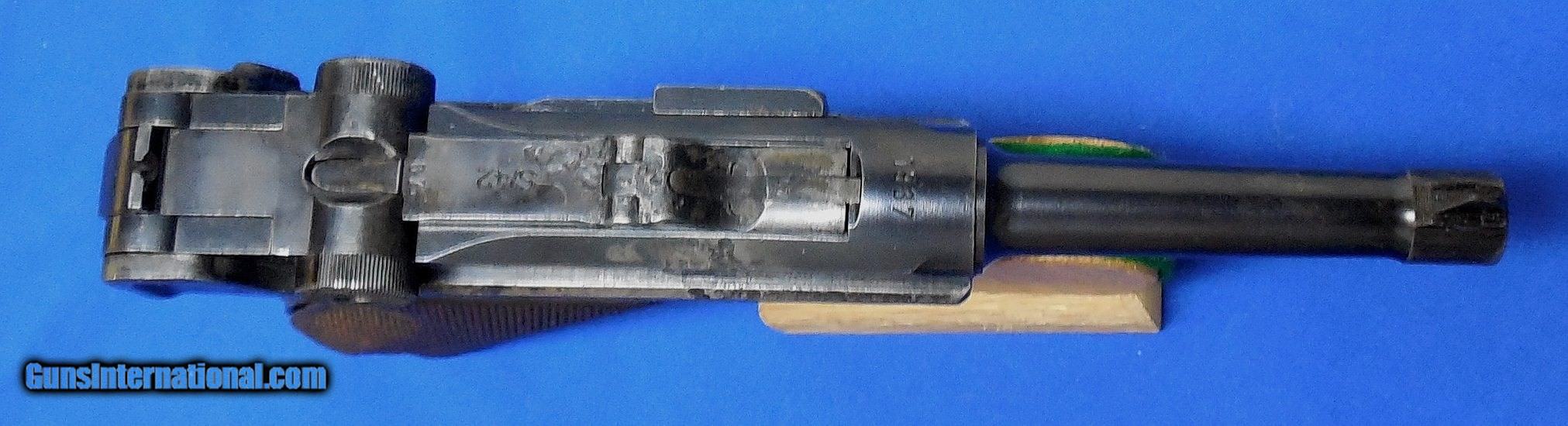 Description: SOLD Pending Funds / German P.08 Luger S/42 Pistol, serial # 2xx7 z, cal. 9mm, with a 4" barrel and a mostly bright very good plus bore showing a few tiny spots of light oxidation. The metal surfaces of this 1937-dated pistol retain about 60% arsenal-quality blue showing high edge wear, areas of heavy pitting at the muzzle, left side frame, receiver, top of the toggle and underneath the grip panels, areas toning to gray patina, oxidation staining and handling marks. Most of the markings are still quite crisp and clear. The checkered walnut grips are stamp-numbered "72" and remain in fair plus condition showing some scattered light staining, significant smoothing overall, a couple tiny chips, small dings and handling marks. All of the serialized parts are matching including the grooved firing pin and the pistol includes a single bright-bodied aluminum base magazine waffenampted E/37 and numbered 78 +. This pistol has seen some tough use, just wish it could talk, but function correctly, retains a nice bore and I believe its condition as photographed and described is good. {C&R} Inv.: # 1-1348 SOLD Curio/Relic: Yes |