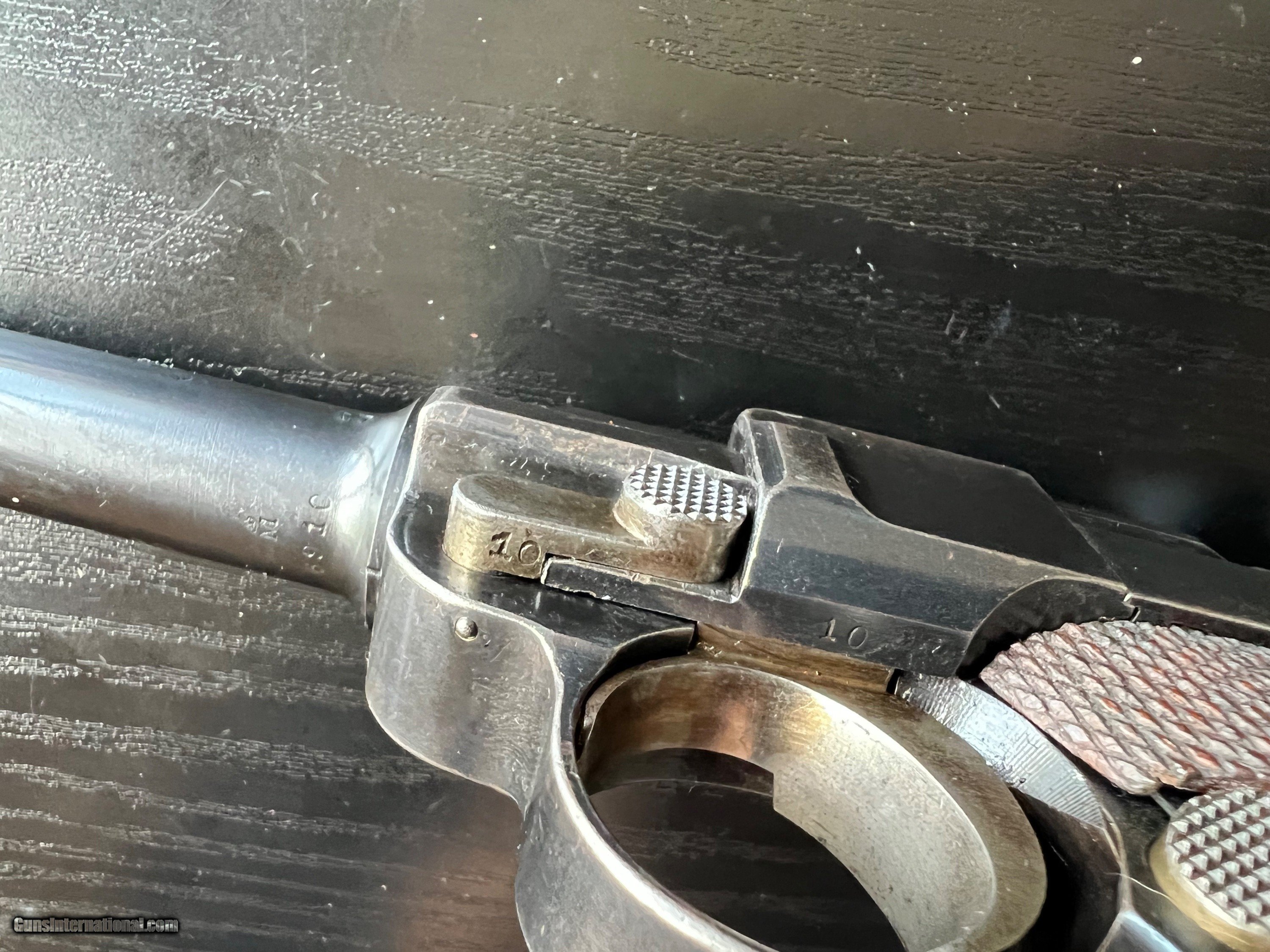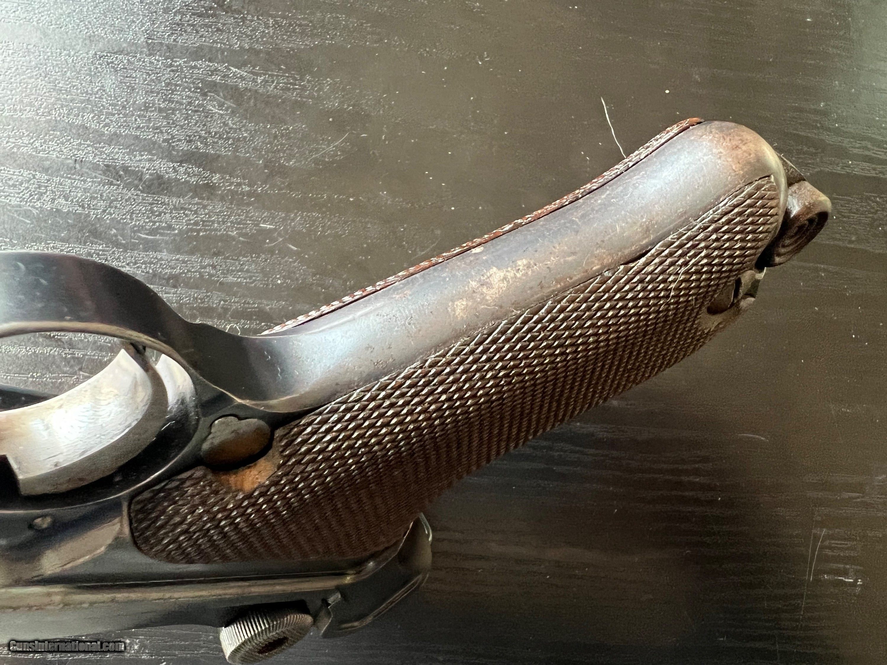 Description: SOLD: This is a way above average example of an Imperial German Navy Luger pistol, chambered in 9 mm Para and made in 1906. It is all original with sharp proof marks and over 95% of the original blue remaining with most of the wear localized on the grip straps and sharp edges. It is an all matching(including grips!) gun with a mismatched navy proofed magazine. Bore shows dulling/peppering in the grooves but has strong rifling and is very shootable. Desirable Navy property/Unit mark on the rear grip strap. Two position rear sight. Way above average example of a scarce pre-WWI Navy Luger. 3-day inspection. FFl or C&R(where allowed) $40 shipping in Conus SOLD Curio/Relic: Yes |