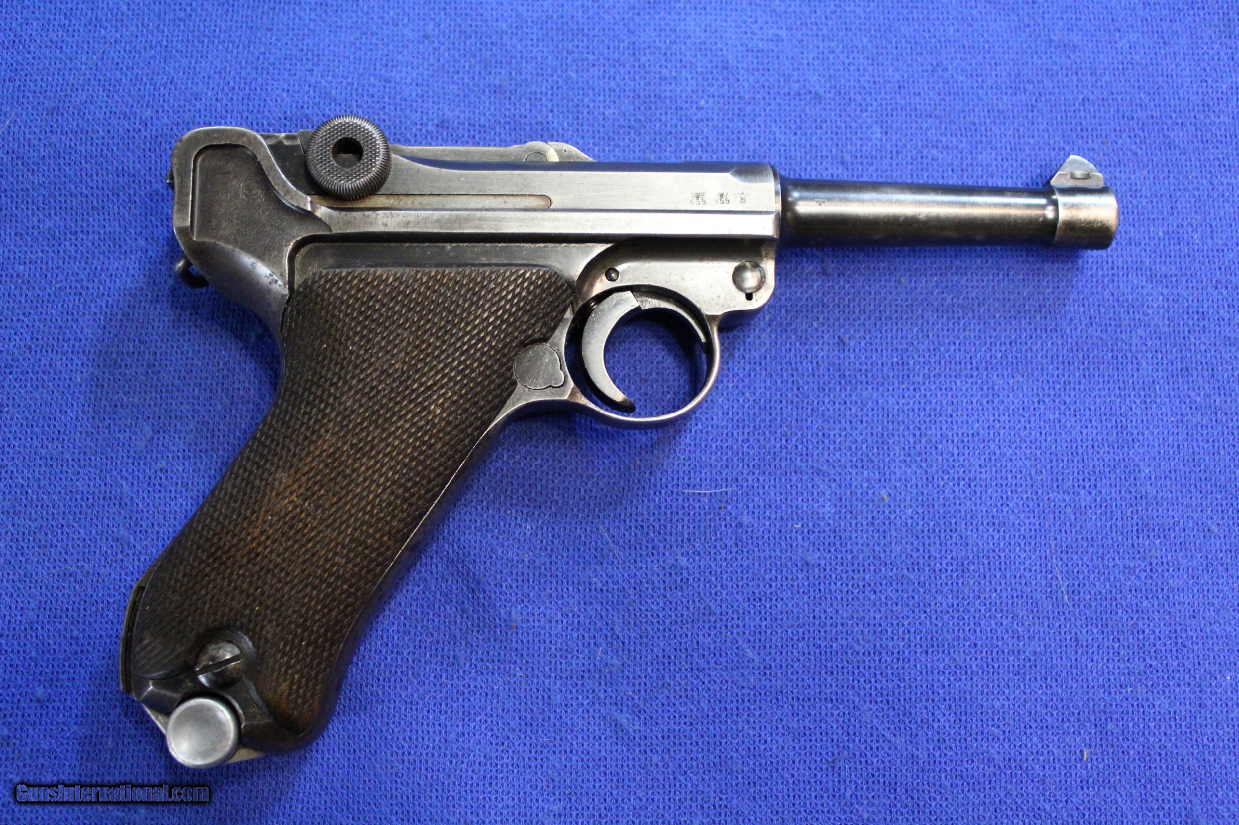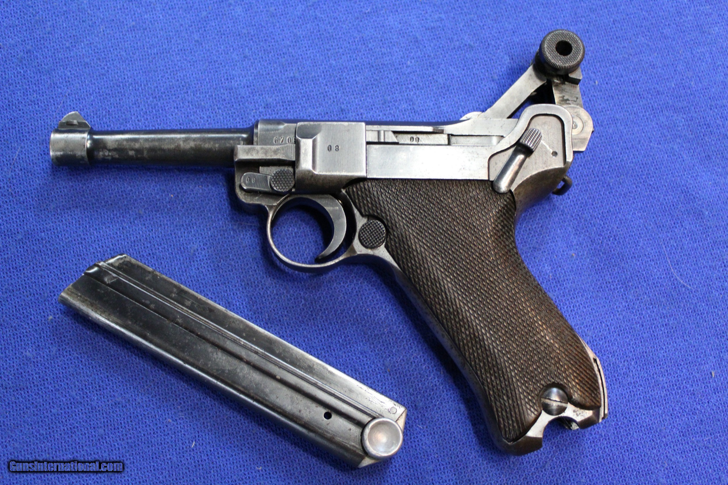 Description: Up for sale today is a German WWII 42-Code P-08 Luger serial no. 6708 chambered in caliber 9mm Parabellum. This excellent original Luger was produced in 1940 by Mauser Oberndorf. The pistol is a vet bring-back that is all-matching except for the magazine hold open latch which is numbered “76,” and a magazine which is period correct, but not matching. The pistol comes with an interesting ersatz holster, and the pistol shows a good bit of holster wear and evidence of service. A nice example of a P-08 and a great shooter as well. All Pennsylvania residents please add 6% sales tax. If paying with a card, a 4% card service fee will be added to the total price of the sale. SOLD Curio/Relic: Yes Manufacturer: Mauser Oberndorf Model: Pistole 08 Luger Serial Number: 6708 Caliber Info: 9x19 Parabellum Condition: Excellent Original Metal Condition: Excellent Original Wood Condition: Excellent Original Bore Condition: Excellent |