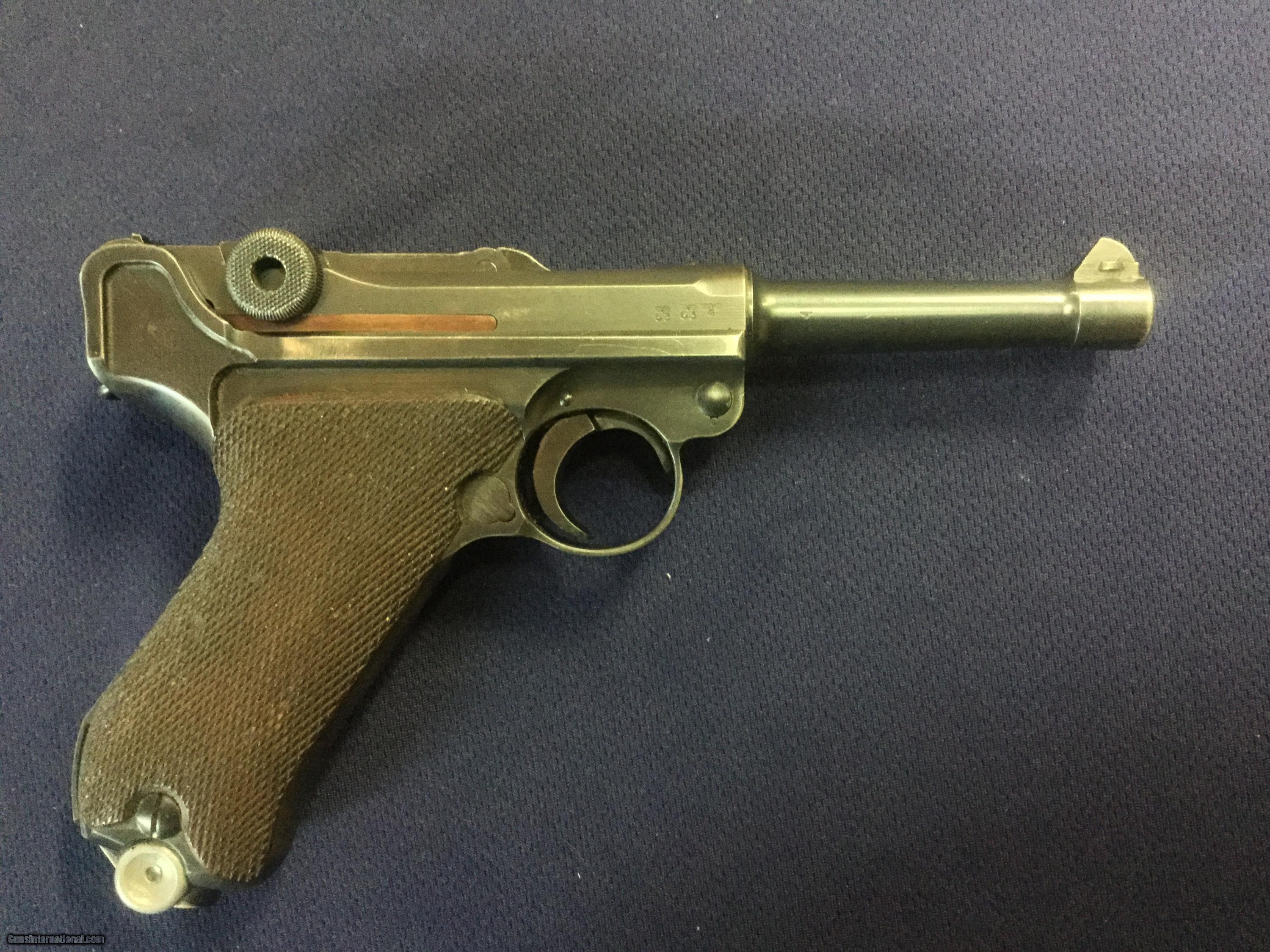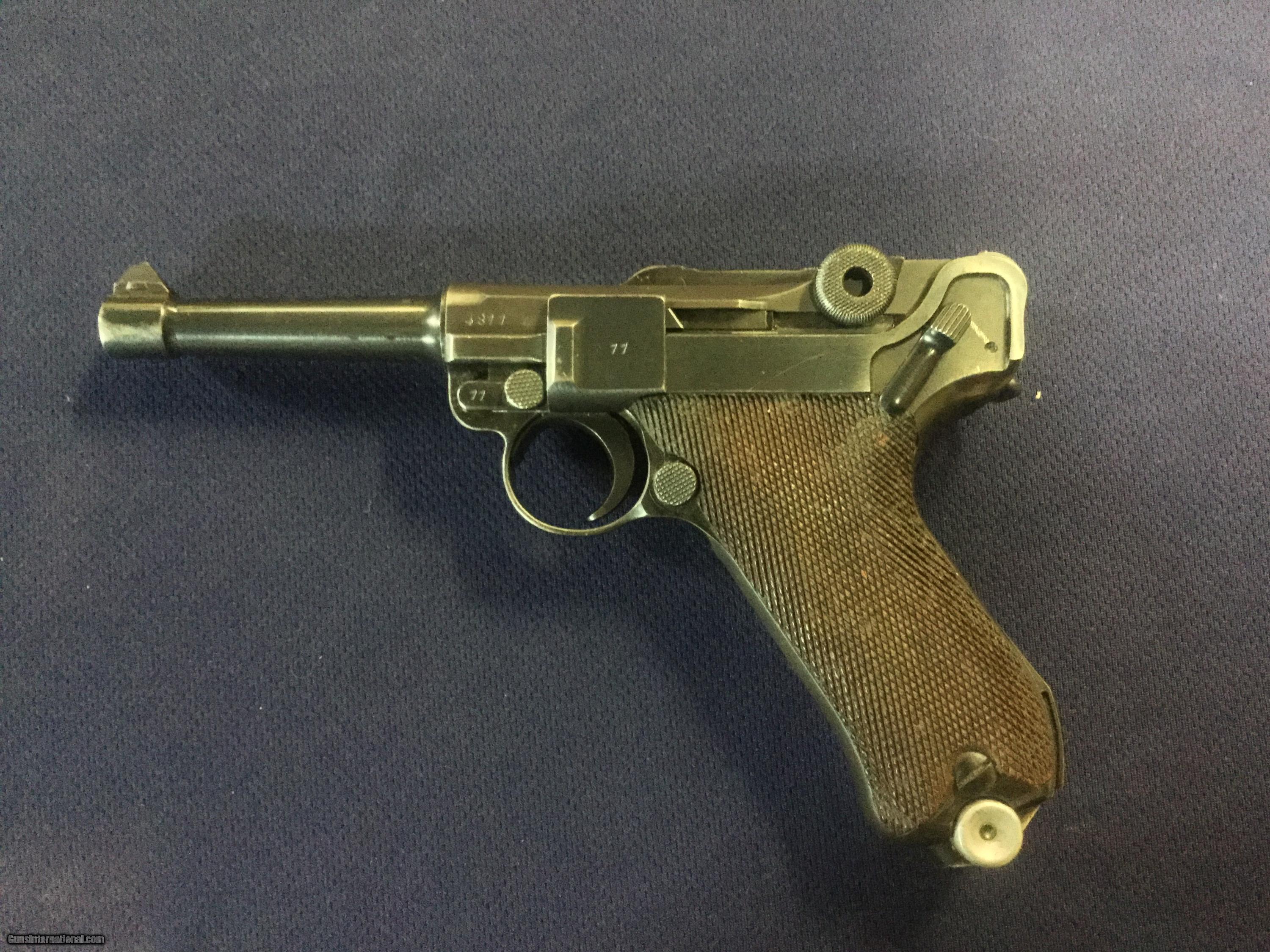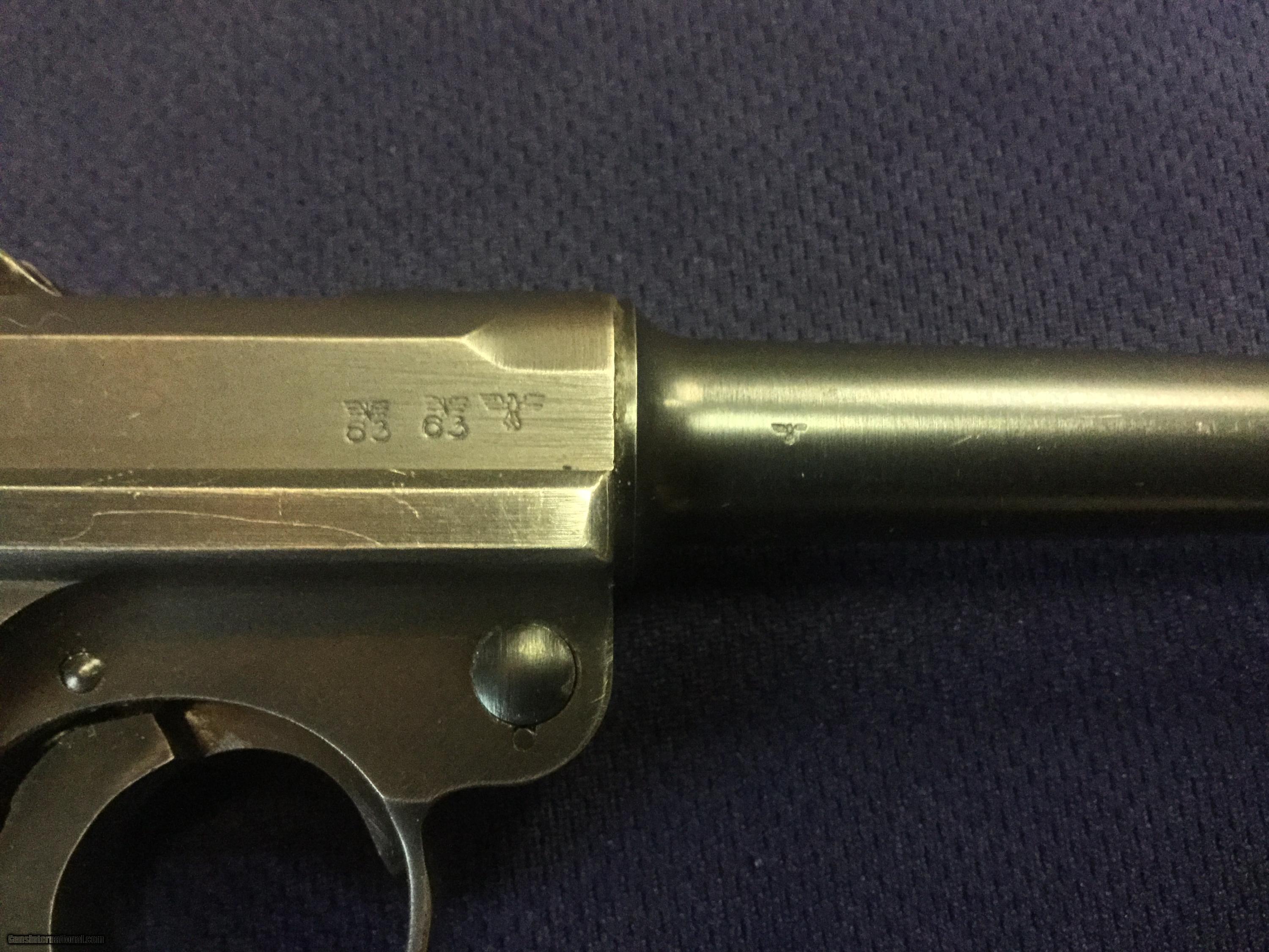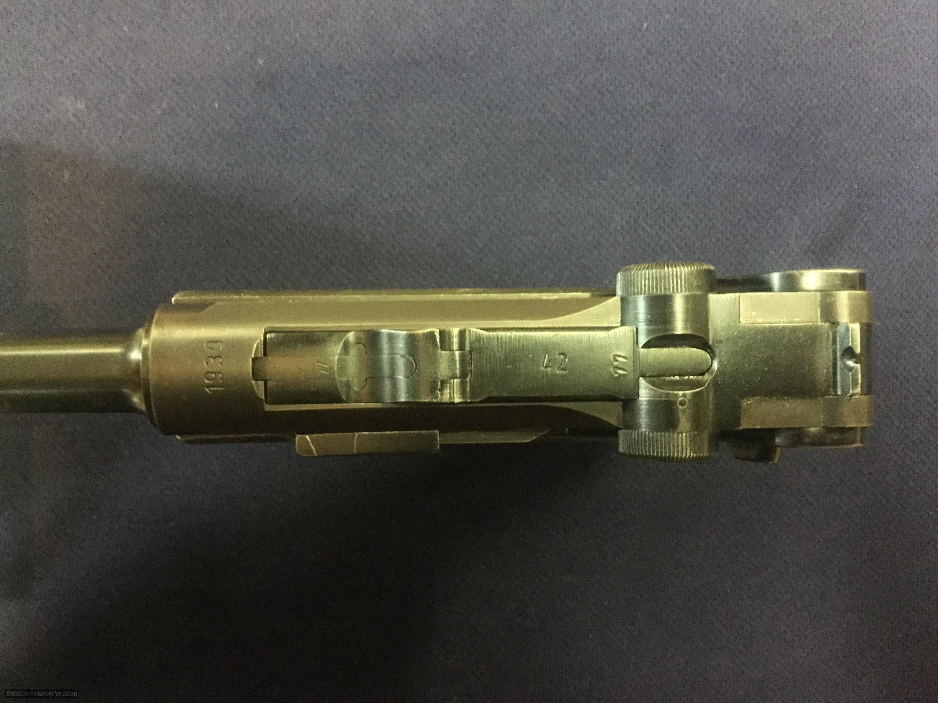 Description: Up for sale today is a German P08 Luger serial no. 4877u chambered in caliber 9mm Luger. This outstanding original Luger was produced by Mauser in 1939. It has a mint bore and shows outstanding original finish on both metal and wood. This pistol is all numbers matching except for the magazine, which is an original German magazine numbered to another pistol. This pistol is a vet bring-back and shows no import markings. A beautiful, clean Luger with crisp markings and a great addition to the discerning connoisseur's collection. All Pennsylvania residents please add 6% sales tax. SOLD Curio/Relic: Yes Manufacturer: Mauser Model: P08 Luger Serial Number: 4877u Caliber Info: 9x19 Condition: Excellent Metal Condition: Excellent Wood Condition: Excellent Bore Condition: Mint |