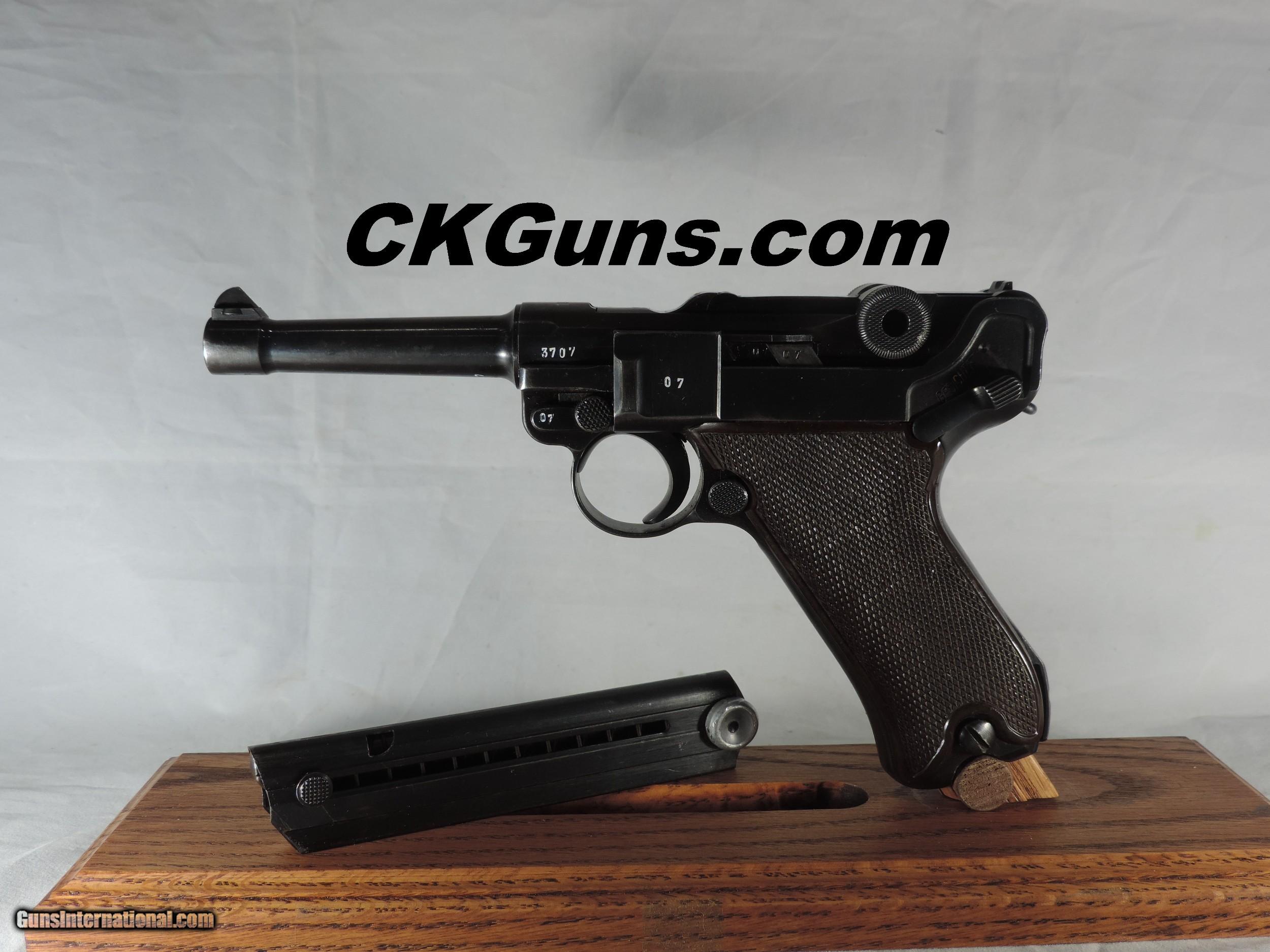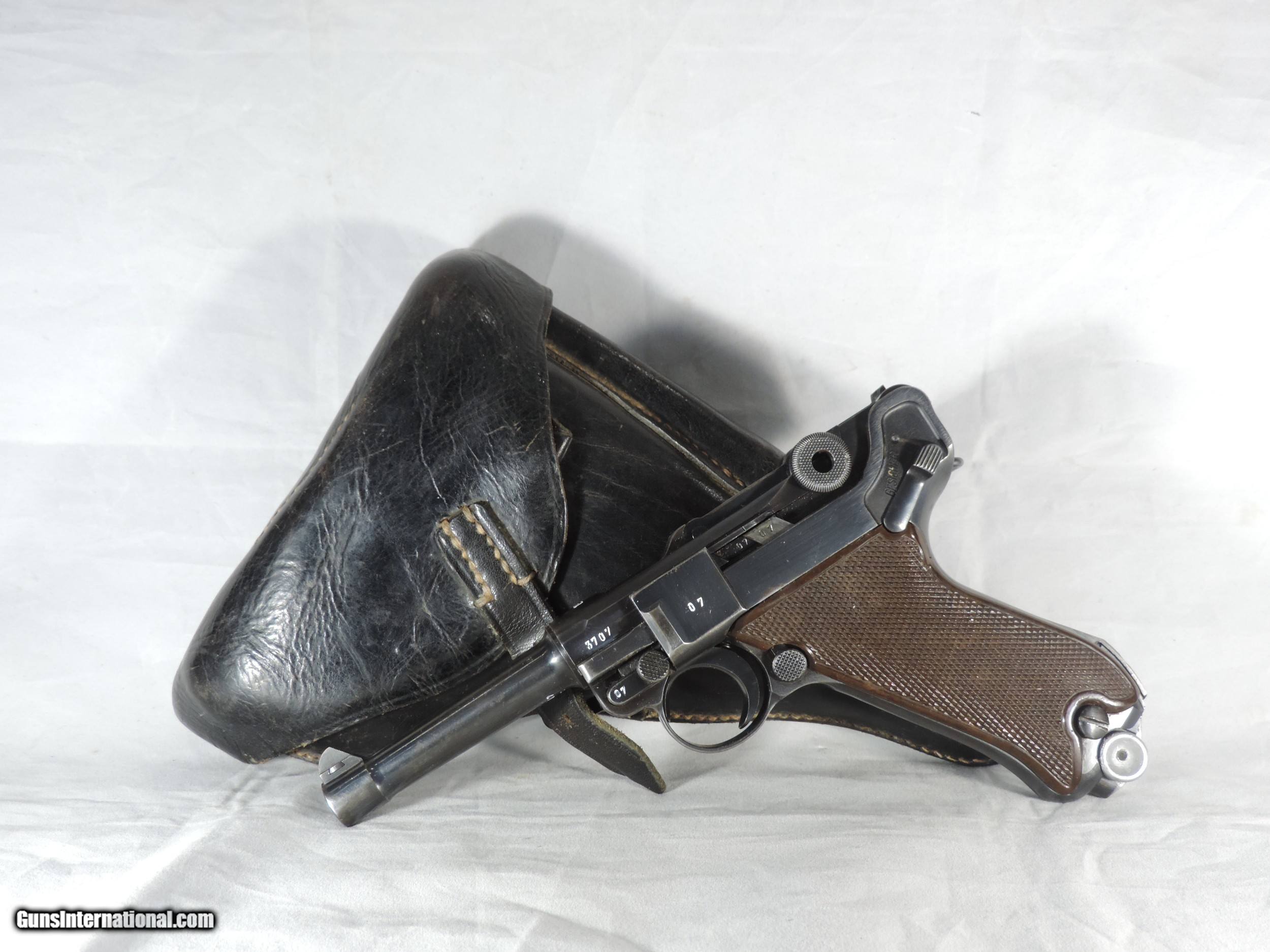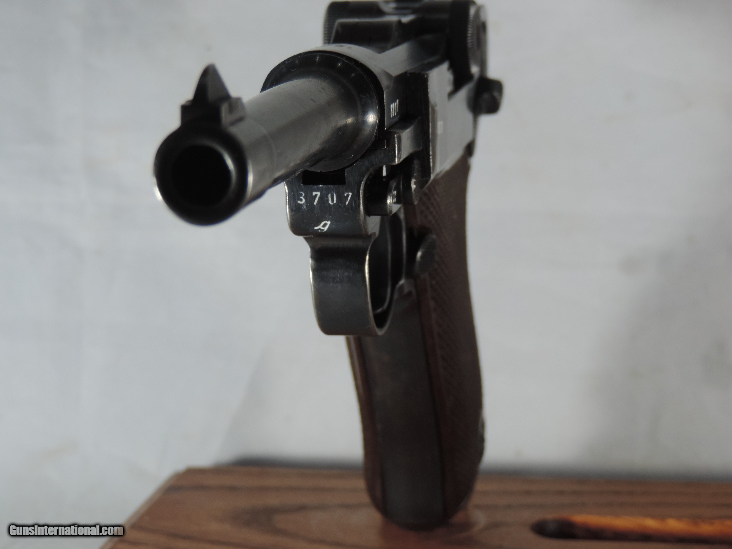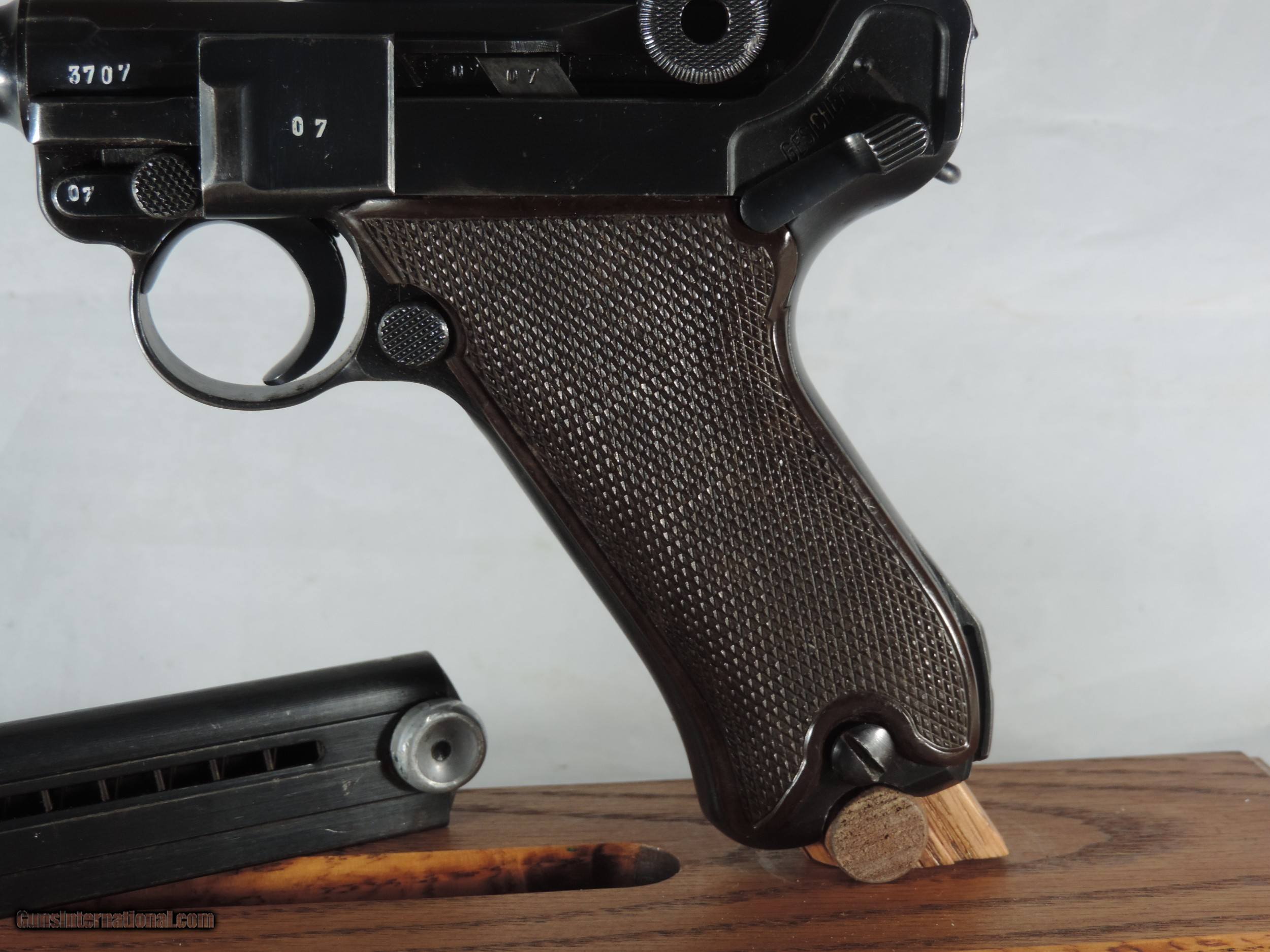 Description: AWESOME KREIGHOFF/MAUSER (P-08) LUGER RIG, 9MM # 3707g, 1940. THIS "TRUNK QUEEN" HAS THE SUPER RARE "KREIGHOFF" GRIPS AND IS IN AWESOME CONDITION. IN 1940 WHEN MAUSER RAN OUT OF WOOD GRIPS NAZI ORDINANCE ORDERED KRIEGHOFF TO SEND THEM 1500 SETS OF PLASTIC SETS OF GRIPS FOR REPLACEMENTS. IN ADDITION IT HAS RETAINED ABOUT 98+% OF THE ORIGINAL BLUE. THE LITTLE LOSS THERE IS, IS FROM SOME VERY MINOR SHARP EDGE SILVERING. THERE IS NO RUST OR SCRATCHES ANYWHERE AND THE GRIP STRAPS SHOW NO SIGN OF GRAYING. ALL NUMBERS MATCH AND IT HAS ALL THE PROPER EAGLE/655 AND EAGLE/SWASTIKA WAFFENAMTS.*** THE KREIGHOFF GRIPS AND GRIPSCREWS ARE PERFECT. THE BOLT FACE, SLIDE RAILS SHOW VERY LITTLE USE. THE BORE IS PRISTINE LIKE THE REST OF THE GUN. MIRROR BRIGHT WITH RAZOR SHARP RIFLING, NOT A BIT OF FROST ANYWHERE. THE RIG COMES WITH AN ORIGINAL BLACK LEATHER HOLSTER IN FINE CONDITION. THE BACK IS STAMPED DIO/42, EAGLE/WAA195, TWO PROPER NON MATCHING MAGAZINES. AND AN ORIGINAL P-08 TAKEDOWN TOOL. A GREAT FIND FOR A EVEN THE MOST CRITICAL COLLECTOR/INVESTOR. MODESTLY PRICED AT.........$4295...SHIPPED** **PURCHASE SATISFACTION GUARANTEED. ***ALL MARKINGS HAVE BEEN WHITE WAXED SO THE BUYER CAN CHECK THEIR AUTHENTICITY. LIGHTER FLUID REMOVES IT QUICKLY. WE WILL DO IT ON REQUEST. To purchase this firearm or if you want to request more information contact us at: Email ckguns[at]ymail[dot]com Phone 201-512-0002 Cell 201-575-6838 FAX 201-215-4759 We accept most major credit cards. Prices shown are Discounted 3% for Cash or Check. The buyer must be familiar with all the laws governing the purchase and the ownership of firearms in their own city and state. The Yankee Armorer, Inc is not responsible for any failure to comply with or observe these laws. The Yankee Armorer, Inc will only ship after full payment and receipt of all required documents. Shipping: Add $35.00 for handguns, $45.00 for long guns. New Jersey buyers are subject to a 7% sales tax. The Yankee Armorer, Inc offers a 3 day inspection period with full refund upon return of intact firearm and in the original condition. The Yankee Armorer, Inc offers a no interest lay away program - 25% down; 25% in 30 days; 25% in 60 days; and full payment in 90 days. Any violation of this policy is subject to restocking and forfeiture of all payments. Any variation from this policy must be agreed to in advance. Unshipped Cancelled sales are subject to a 20% restocking fee. Be advised that all firearms sold by The Yankee Armorer, Inc. or the Gun Exchange, LLC (SELLER) are sold as collector’s items. They have not been fired or tested for safety and must be examined by a license gunsmith prior to use. By purchasing any item from the (SELLER), you are agreeing to hold the (SELLER) free from any damages or lawsuits of any nature. Any item left for transfer or storage will be charged to $25.00 per month, per item from the day of its receipt. Any variation from this policy must be agreed to in advance. Store hours 10:00 am to 5:00 pm Tuesday -Saturday. It's always best to call for appointment. Store 201-512-0002, cell 201-575-6838. SOLD Handgun Caliber: 9x19mm Parabellum (9mm Luger, 9x19mm NATO) |