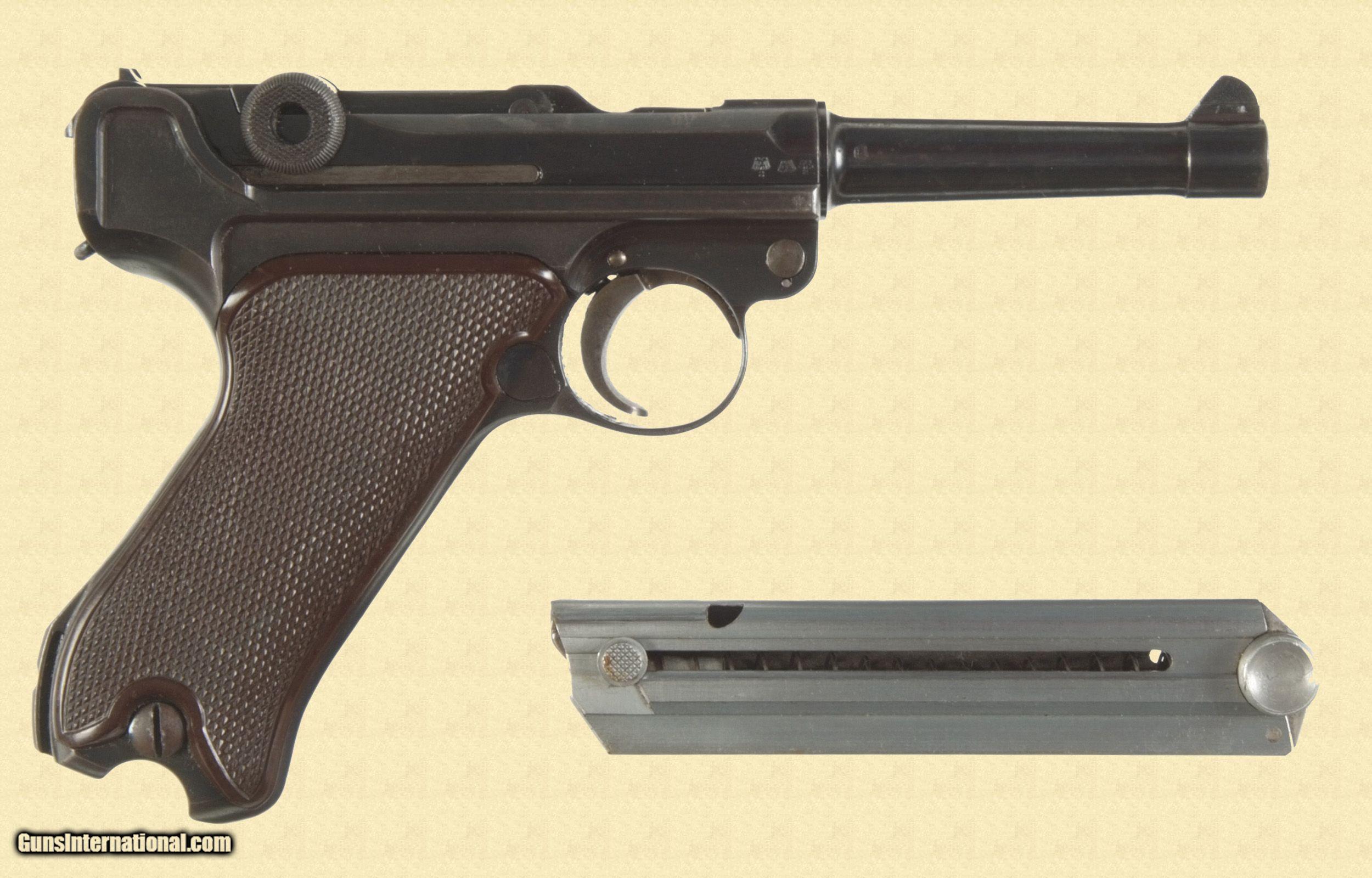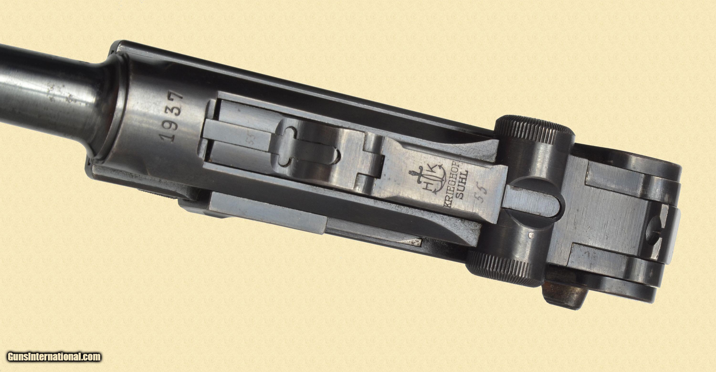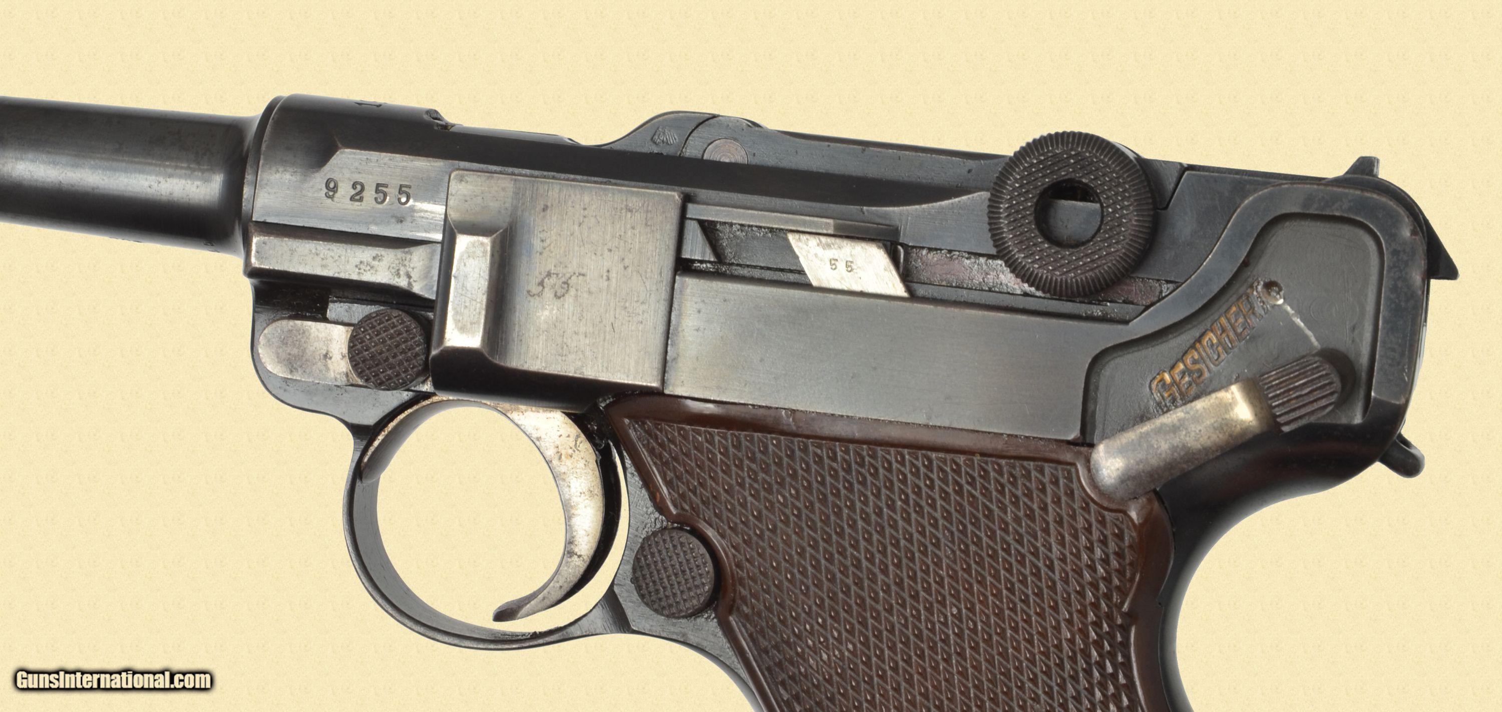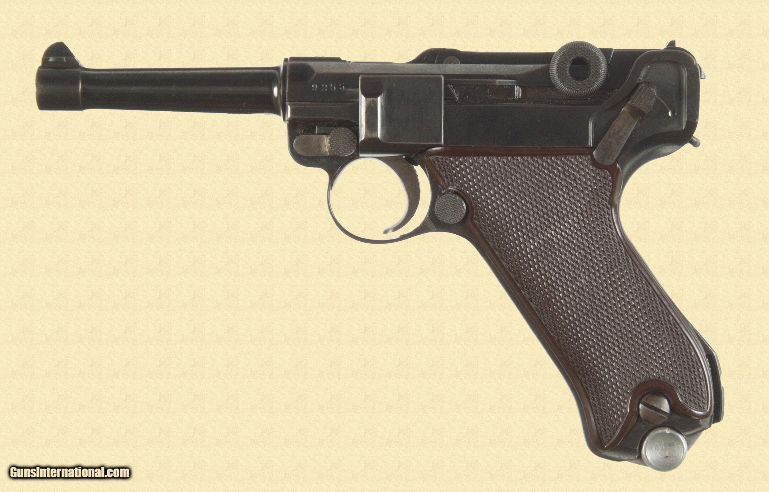 Description: 9mm Luger; 96% blue, 70% straw, very good bore, very good grips, 4'' barrel, Original blue finish, strawed small parts and checkered brown plastic grips. Matching except the magazine which is numbered 8739 with a Krieghoff eagle/2 proof. The sideplate, toggle and extractor have the matching number lightly electro-penciled on the exterior, done by unit level armorers, with the original stamped matching numbers internally. The small parts have the Krieghoff eagle/2 proof. The top of the toggle is stamped with the Krieghoff H anchor K logo over KRIEGHOFF/SUHL and on top of the chamber with the date 1937. The right side of the receiver is stamped with two eagle/2 proofs flanking the acceptance mark. Other acceptance marks appear on the right side of the barrel and left side of the breechbolt. The metal finish shows light sharp edge wear and fairly light high point holstering wear. The grips show light handling. Mechanically fine, the bore has been greased and should clean to at least very good condition. C&R/FFL FEDERAL FIREARMS LICENSE (FFL): is required on all shipments of modern guns. We must wait for a copy from your dealer before we can ship to them. We will also ship C&R eligible firearms to Curio and Relic (C&R) license holders. We accept your signed, legible FFL and C&R licenses via fax at 309/ 342-5730 (always on), email at FFLsimpsonltd or through the mail at Simpson Ltd; 140 S Seminary St; Galesburg, IL 61401. Pre-1898 firearms and non-firearms items are exempt from licensing requirements. All items shipped to an Illinois address will be charged 8.75% sales tax. NOTE: Because of recent shipping restrictions and charges placed on us by UPS and FedEx (handguns must ship via next day or 2nd day air and they have added a $10 surcharge for parcels over 48”. Our return policy lasts a maximum of 3 days from the time you receive your item. If 3 days have passed since you received your purchase, and we have not been contacted by you, unfortunately, we can’t offer you a refund or exchange. If you are not happy with your purchase, please contact us by phone and/or email to arrange for a return. Items must be shipped back to us to arrive with 7 days of notification of return. SOLD Curio/Relic: Yes Serial Number: 9255 |