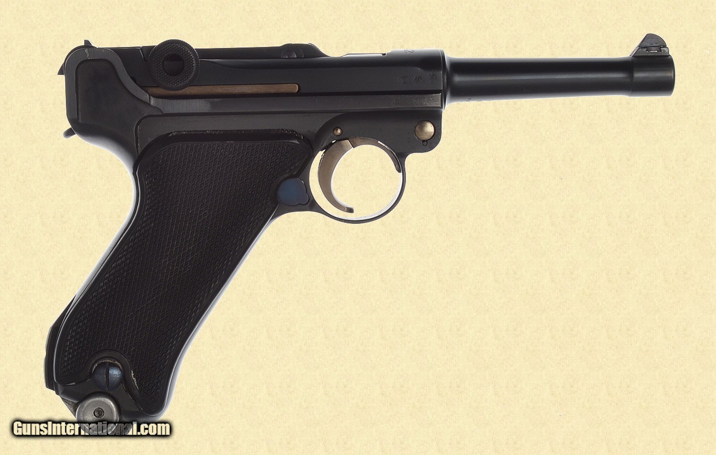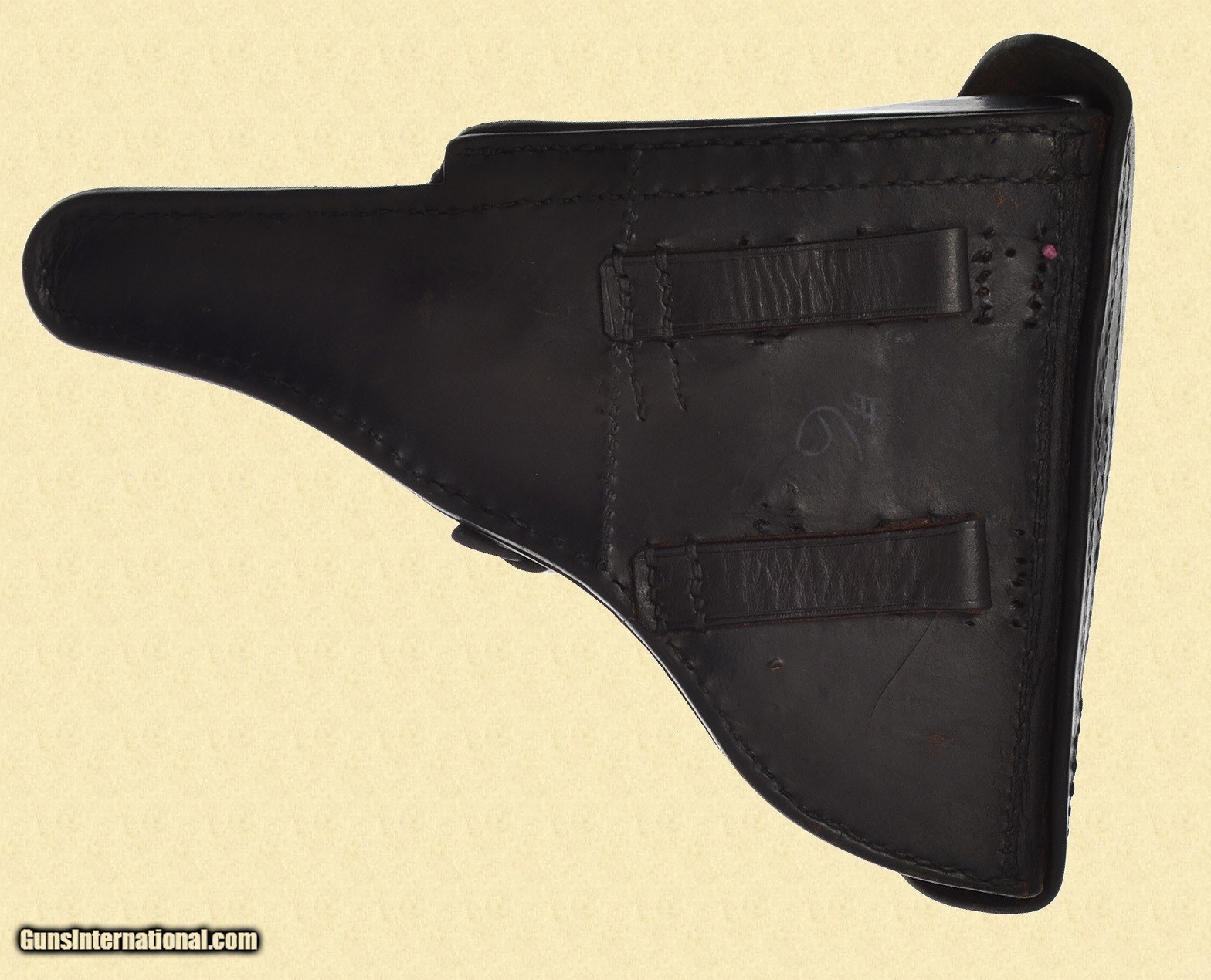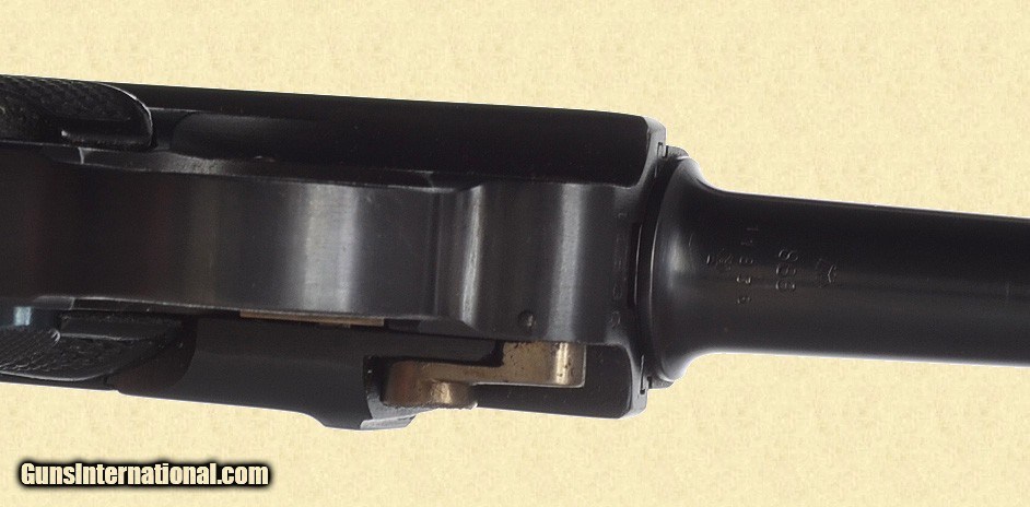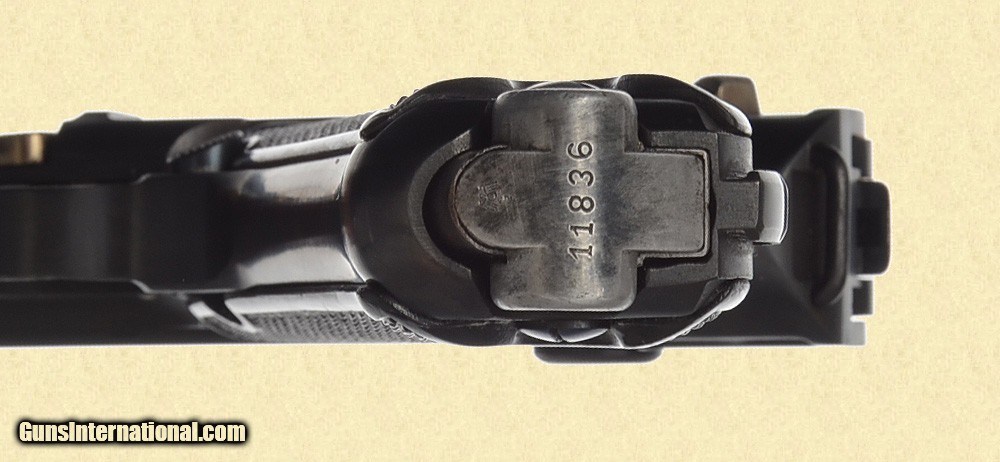 Description: 9 mm; 98% blue, 95% straw, fair bore, very good grips, 4'' barrel, Restored blue metal finish, restrawed small parts, original checkered black plastic grips. Numbered parts are matching, including both magazines which have questionable numbering and proofing, 122 code variations with pinned aluminum bases and eagle/37 proofs. Hold open and magazine catch are not numbered or proofed. Safety assembly has no visible proofs. Firing pin spring guide is matching, not proofed. Stamped on top of the toggle with the H/anchor/K logo over 'KRIEGHOFF/SUHL". Right receiver stamped with two Luft eagle/2 proofs and Luft eagle acceptance mark. Mechanically fine. The bore has pitting and corrosion in the grooves, strong rifling. Rig, includes an original Kreighoff eagle/2 proofed holster in good condition, dyed black and oiled, showing some wear, and an eagle/2 proofed takedown tool. C&R/FFL Please call (309)342-5800 Tues-Fri, 10 am -6pm (CST), or Sat 1pm-6pm (CST), to speak with our sales team for further information, or to purchase firearms. FEDERAL FIREARMS LICENSE (FFL): is required on all shipments of modern guns. We must wait for a copy from your dealer before we can ship to them. We will also ship C&R eligible firearms to Curio and Relic (C&R) license holders. We accept your signed, legible FFL and C&R licenses via fax at 309/ 342-5730 (always on), email at FFLsimpsonltd or through the mail at Simpson Ltd; 140 S Seminary St; Galesburg, IL 61401. Pre-1898 firearms and non-firearms items are exempt from licensing requirements. All items shipped to an Illinois address will be charged 8.75% sales tax. NOTE: Because of recent shipping restrictions and charges placed on us by UPS and FedEx (handguns must ship via next day or 2nd day air and they have added a $10 surcharge for parcels over 48”. Our return policy lasts a maximum of 3 days from the time you receive your item. If 3 days have passed since you received your purchase, and we have not been contacted by you, unfortunately, we can’t offer you a refund or exchange. If you are not happy with your purchase, please contact us by phone and/or email to arrange for a return. Items must be shipped back to us to arrive with 7 days of notification of return. LAYAWAY POLICY: We are willing to put items on layaway for you under the following conditions: The item must be priced at $500 or more with a 20% minimum deposit and must be paid off within 30 days. You may have a maximum of 2 items on layaway at one time. If the balance is not paid off within the 30 day period, all deposits and payments will be forfeited and not returned or applied to another item. SOLD Curio/Relic: Yes Serial Number: 11836 |