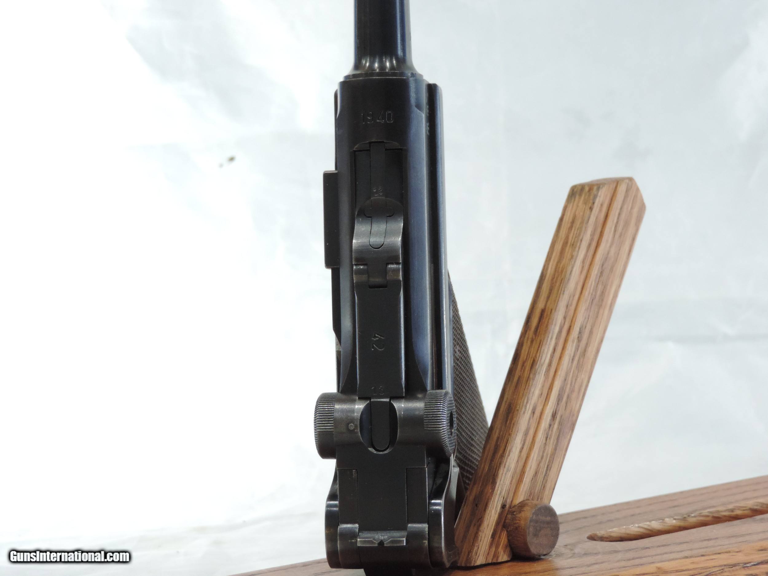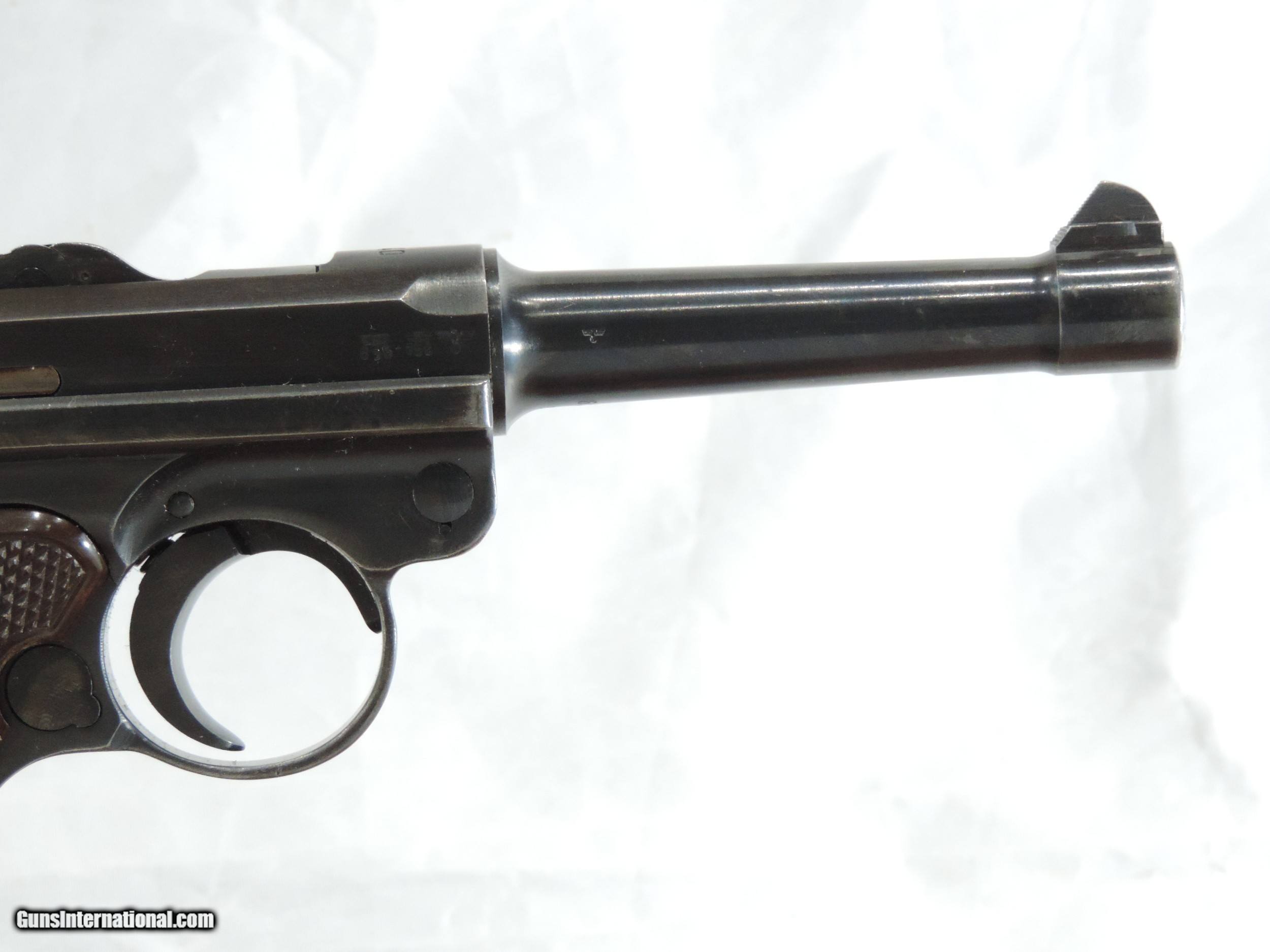 Description: REDUCED INV. 9635 KRIEGHOFF/ MAUSER LUGER, (CODE 42) P.08, CAL. 9MM, SER. 6313k, DATED 1940, THIS VERY EARLY "40 CODED" BEAUTY IS FITTED WITH THE VERY RARE KREIGHOFF PLASTIC GRIPS. IN1940 MAUSER AND RAN OUT OF WOOD GRIPS. THE NAZIS THEN ORDERED THE MAKER OF PLASTIC GRIPS FOR KREIGHOFF TO SEND BPOWN PLASTIC GRIPS TO MAUSER. IT IS REPORTED THAT LESS 2% OF THE 1940 MAUSERS HAD KRIEGHOFF GRIPS*. THIS BEAUTY DOES INDEED HAVE AN ORIGINAL PAIR OF THEM. THE GUN HAS RETAINED ABOUT 99% OF THE ORIGINAL FACTORY FINISH. THE ONLY LOSS IT HAS IS FROM SLIGHT SHARP EDGE SILVERING FROM HOLSTER WEAR. THE GRIP STRAPS SHOW NO SIGN OF GRAYING AND A FEW SCATTERED PIN PRICKS. THERE ARE NO RUST SPOTS, RUB MARKS OR SCRATCHES. ALL PARTS MATCH INCLUDING THE MAGAZINE AND ALL HAVE THE PROPER WAFFENAMTS *. THE SLIDE RAILS, BOLT FACE AND FEED RAMP SHOW SLIGHT IF ANY USE. THE BARREL IS PRISTINE, SUNSHINE BRIGHT WITH RAZOR SHARP RIFLING. THIS RARE LUGER VARIATION IS A GREAT FIND FOR EVEN THE MOST CRICTICAL COLLECTOR AND CERTAINLY CENTERPIECE FOR THE COLLECTOR. MODESTLY PRICED AT...... $3995 **. *REF. JAN STILLS, AXIS LUGERS, PAGE 61 **THE HARMLESS WHITE WAX CRAYON IS TO SHOW THE MARKINGS ARE CORRECT. IT IS EASY TO REMOVE WITH LIGHTER FLUID AND A BRUSH. WE WILL DO IT ON REQUEST. ***100% PURCHASE SATISFACTION GUARANTEED. To purchase this firearm or if you want to request more information contact us at: Email ckguns[at]ymail[dot]com Phone 201-512-0002 Cell 201-575-6838 FAX 201-215-4759 We accept most major credit cards. Prices shown are Discounted 3% for Cash or Check. The buyer must be familiar with all the laws governing the purchase and the ownership of firearms in their own city and state. The Yankee Armorer, Inc is not responsible for any failure to comply with or observe these laws. The Yankee Armorer, Inc will only ship after full payment and receipt of all required documents. Shipping: Add $35.00 for handguns, $45.00 for long guns. New Jersey buyers are subject to a 7% sales tax. The Yankee Armorer, Inc offers a 3 day inspection period with full refund upon return of intact firearm and in the original condition. The Yankee Armorer, Inc offers a no interest lay away program - 25% down; 25% in 30 days; 25% in 60 days; and full payment in 90 days. Any violation of this policy is subject to restocking and forfeiture of all payments. Any variation from this policy must be agreed to in advance. Unshipped Cancelled sales are subject to a 20% restocking fee. Be advised that all firearms sold by The Yankee Armorer, Inc. or the Gun Exchange, LLC (SELLER) are sold as collector’s items. They have not been fired or tested for safety and must be examined by a license gunsmith prior to use. By purchasing any item from the (SELLER), you are agreeing to hold the (SELLER) free from any damages or lawsuits of any nature. Any item left for transfer or storage will be charged to $25.00 per month, per item from the day of its receipt. Any variation from this policy must be agreed to in advance. Store hours 10:00 am to 5:00 pm Tuesday -Saturday. It's always best to call for appointment. Store 201-512-0002, cell 201-575-6838. SOLD Curio/Relic: Yes |
