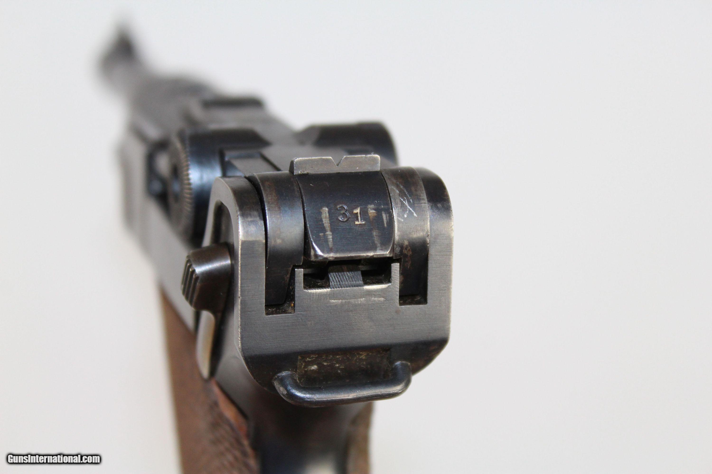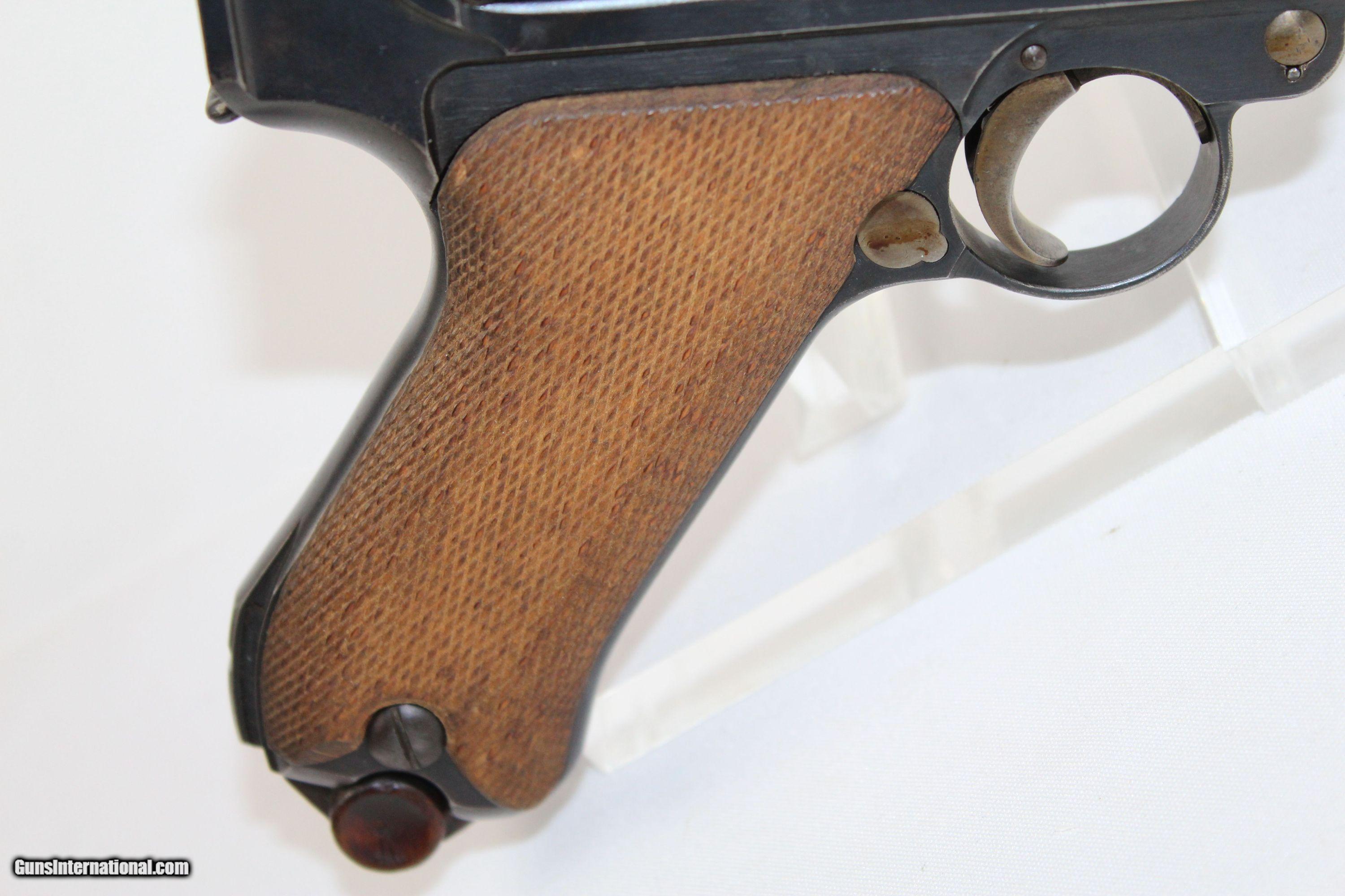 Description: LATE-WWI German P.08 LUGER Pistol Dated “1918” Imperial German Military Marked 9mm Parabellum Pistol Here we present a Late-World War I Dated P.08 Luger Pistol, made in 1918 by DWM in Berlin, Germany. The Luger became and remained the iconic sidearm of Germany in both World Wars. This one bears the acceptance marks and proofs of the Imperial German military. This one is in fantastic condition and will make a great addition to your collection. The top of the toggle is marked “DWM”, the manufacturer. The chamber is marked with the year of manufacture, “1918”. The right side of the receiver bears the Imperial German acceptance marks. The top right of the barrel is proof marked. All numbers match. Overall condition is fine. The original blue finish is about 95% with strong straw coloring on the small parts. Serial numbers match throughout, including the grips and magazine. The grips are in very good shape, with normal wear to the checkering and a small sliver missing from the left panel near the safety lever. The bore clean and well-rifled. The action is excellent and strong. This firearm is classified as a Curio & Relic. Barrel is 4 inches. Caliber: 9mm Luger Overall condition as seen in photos. Very Fast. Very Safe. FREE SHIPPING. Will need to be sent to your local FFL or C&R licensee. This firearm is classified as a Curio & Relic. Guaranteed AUTHENTIC & Includes CERTIFICATE OF AUTHENTICITY. ancestryguns $1950 #5075 SOLD Curio/Relic: Yes |
