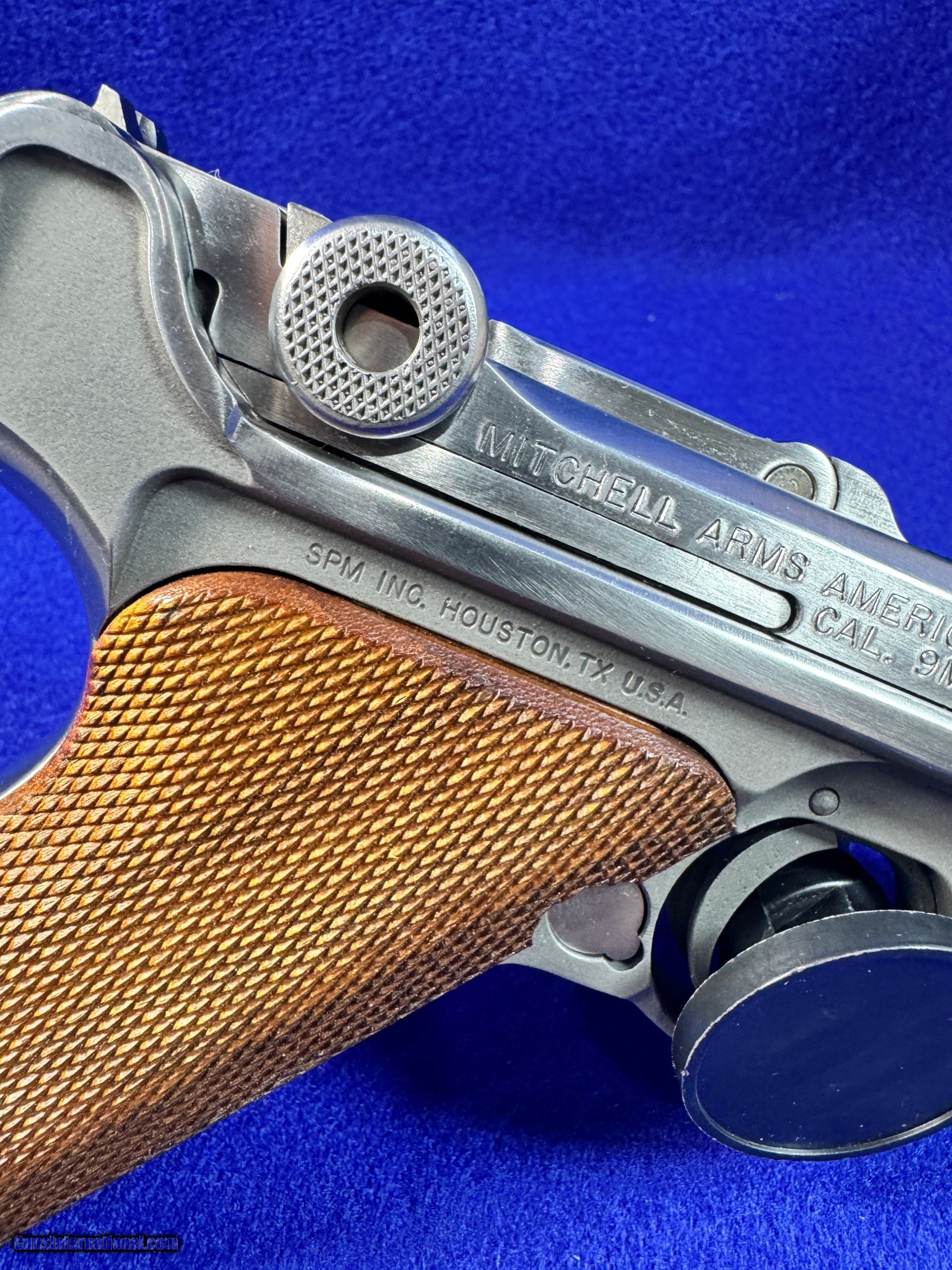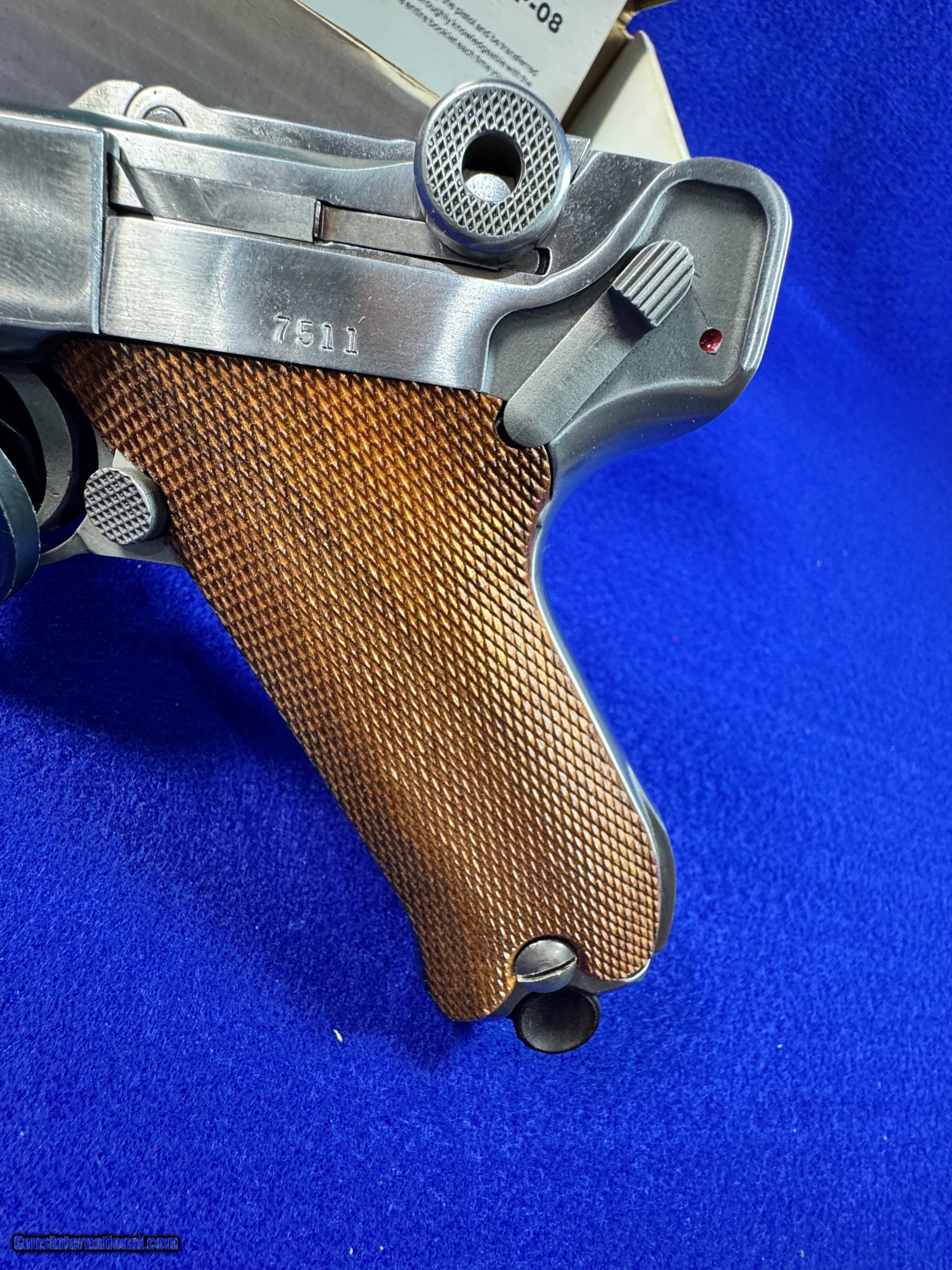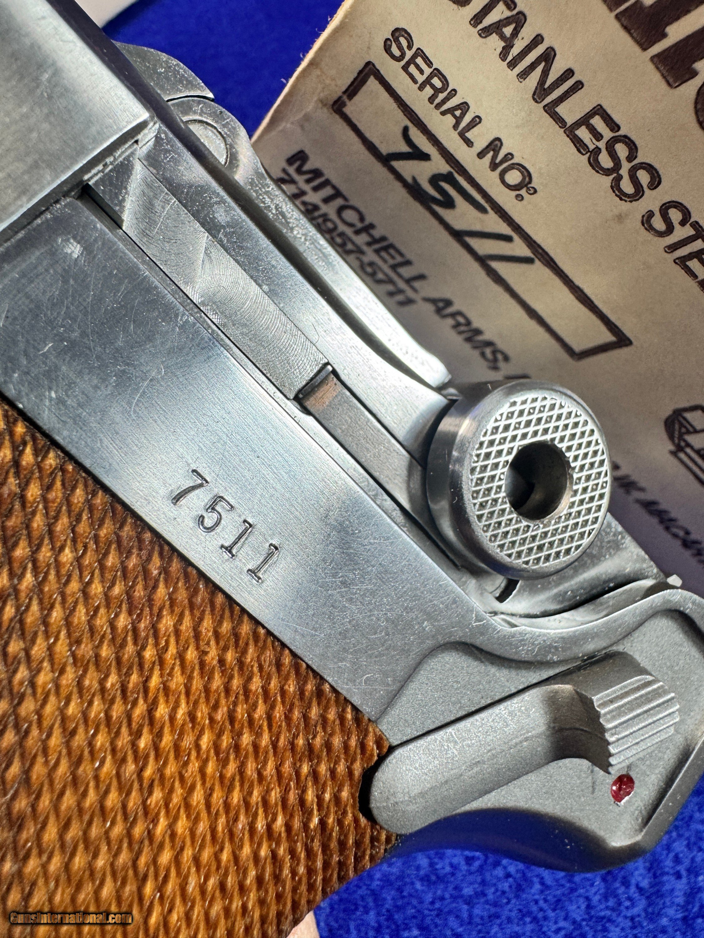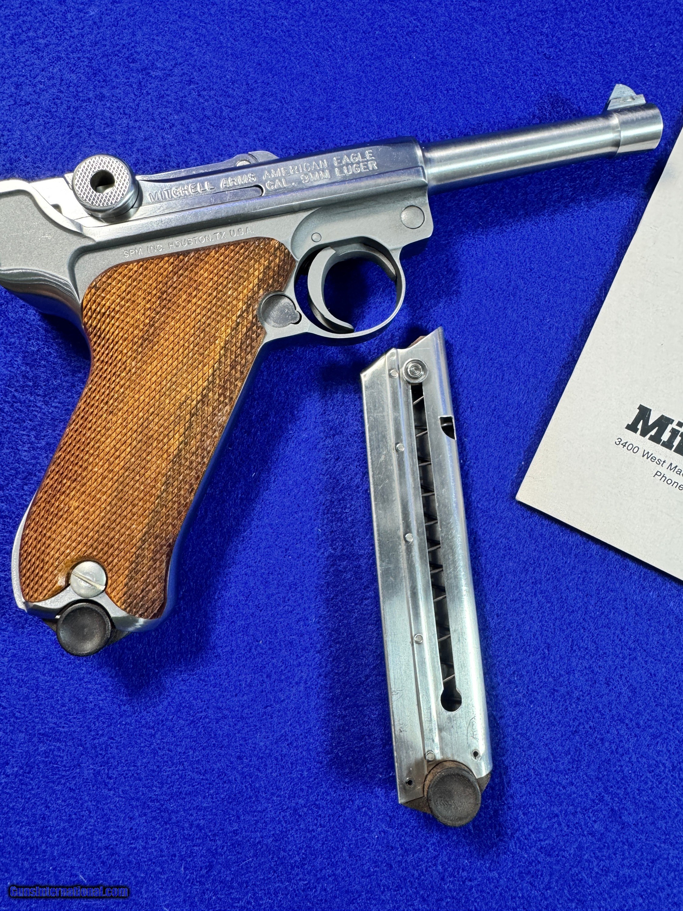 Description: Like new in Box Mitchell Arms American Eagle P.08 Luger. This gun is chambered for 9MM Luger and features a 4" barrel. It is the American Eagle version of the famed German Luger featuring contoured front grip strap, stainless steel finish with toggle action and checkered American walnut grips. The toggle stamp features an American Eagle dated 1993. The gun ships with its matching factory box with original papers and extra wood based magazine. The bore is bright and shiny and the functions work as expected. The Mitchell Arms "American Eagle" P.08 is a 20th-century reproduction of the iconic German Luger. Produced in the 1990s, this firearm was a direct response to the immense market demand from collectors who wanted the Luger's famous design without the high cost and fragility of an original historic piece. Mitchell Arms' version, often made of stainless steel, was marketed as a high-quality "shooter's" replica. It represents a significant trend where modern manufacturing was used to recreate legendary firearms for a new generation of enthusiasts. I accept Post Office Money Orders, Personal Check, Zelle and credit card as payment. All Credit Cards incur a 2.99% fee which is in addition to the final price as shown in the Order. Please allow me to give you a complete total. All Credit Cards will need to be done over the phone. Thank You. Insurance is not included in shipping. Please allow me to add that to the total at your request at a rate of 2% per every $100. Thank you for looking. Please let me know any questions. Many more pictures available. Handgun Caliber: 9x19mm Parabellum (9mm Luger, 9x19mm NATO) Manufacturer: Mitchell Arms Model: American Eagle-P08 Luger Serial Number: 7511 Barrel Length: 4 Condition: Like New Metal Condition: 98% Wood Condition: 99% Bore Condition: 10 out of 10 Action: Semi Auto Stock: Walnut Manufacture Date: 1993 Extras: Box, Papers, extra mag Price: $1,795.00 Shipping: $45.00 Buy Now Contact Seller |