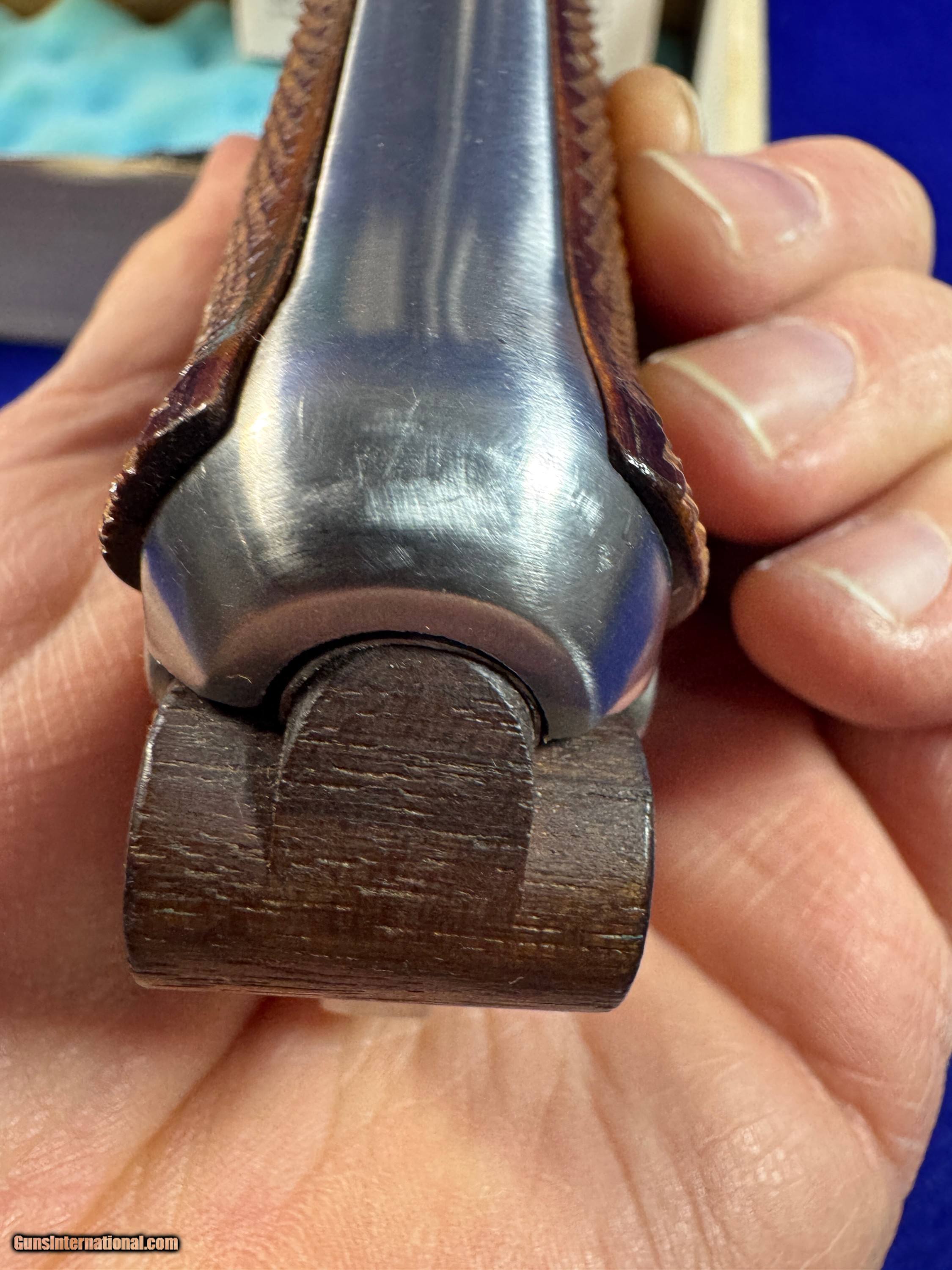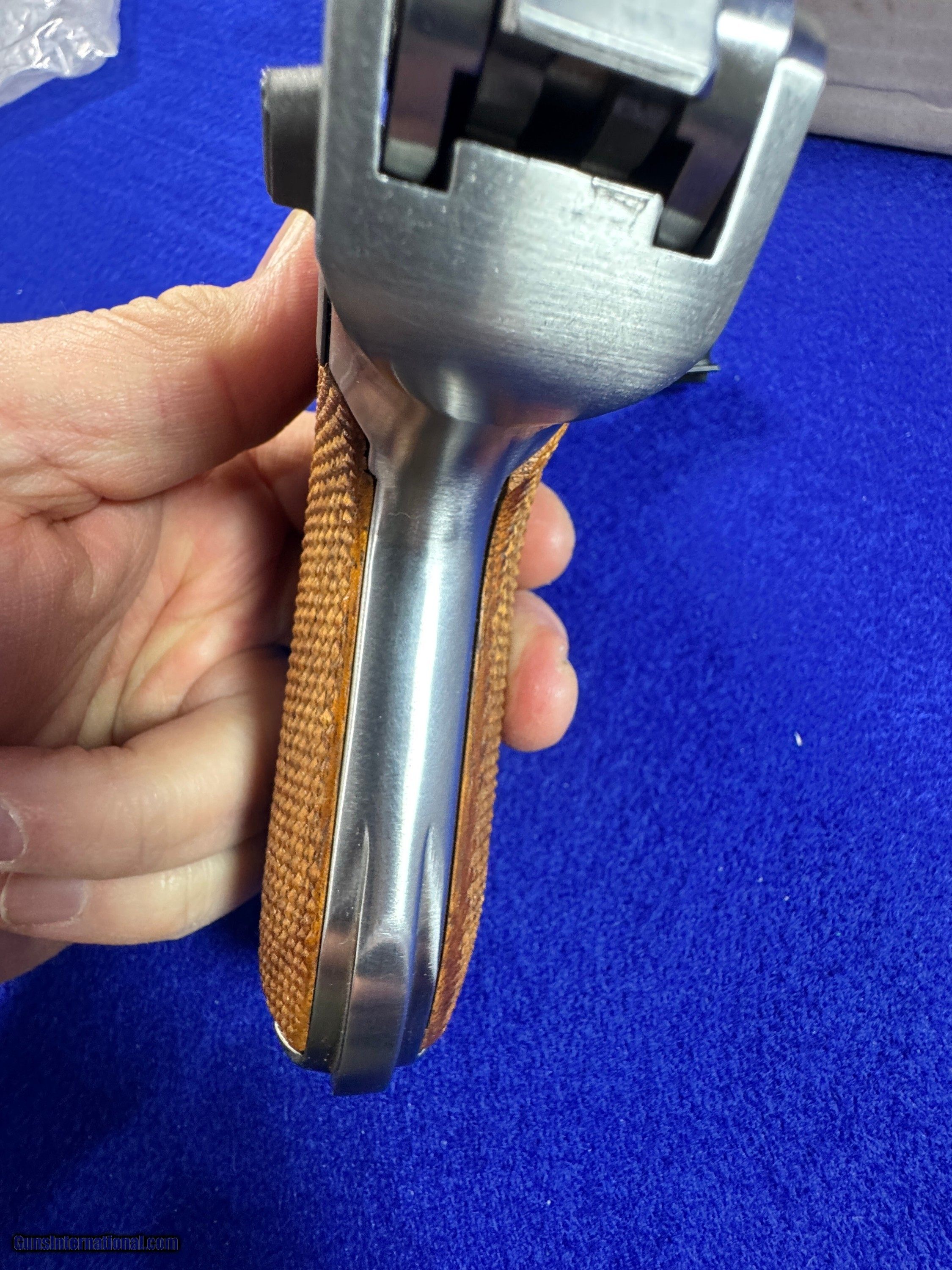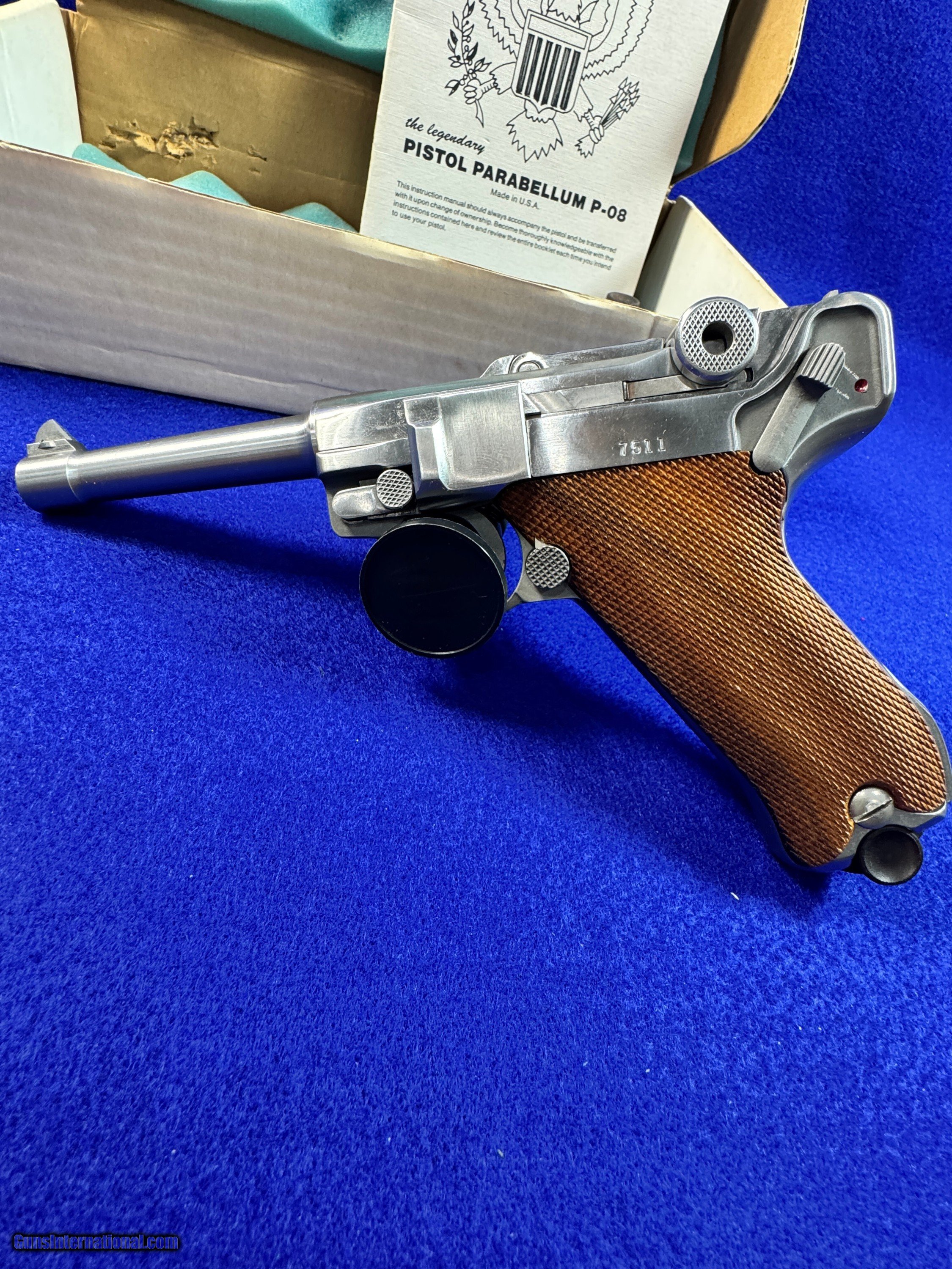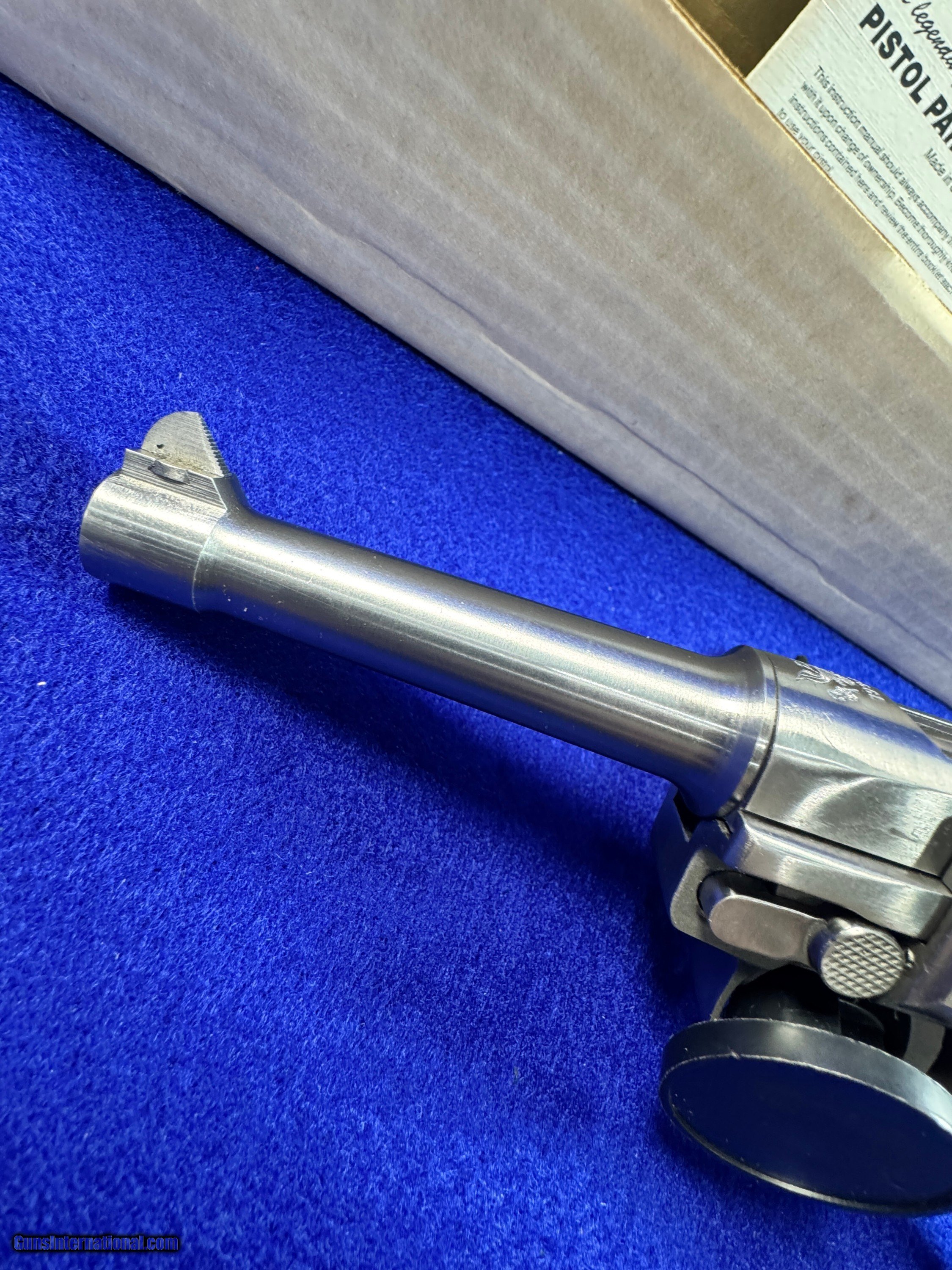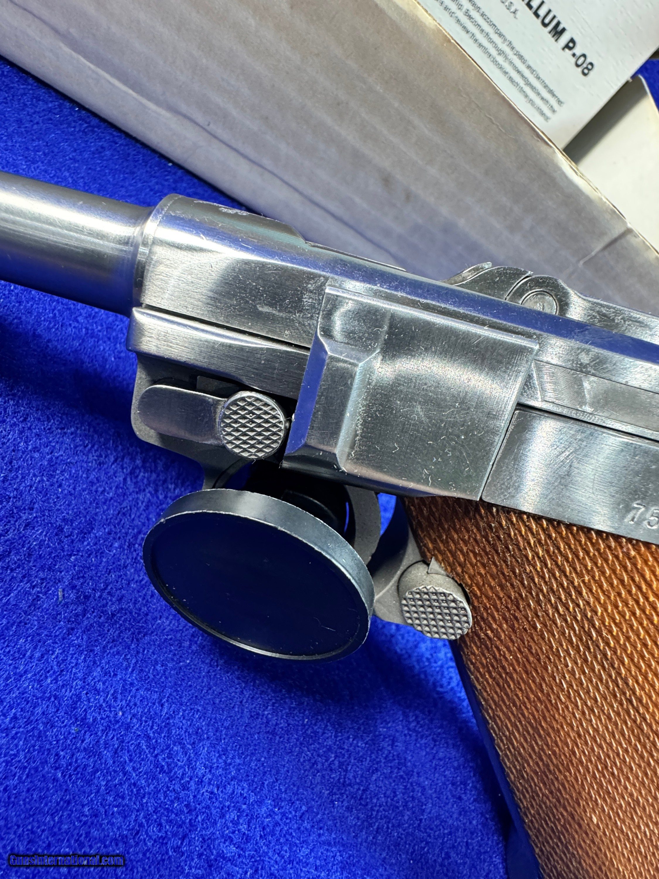 Description: Like new in Box Mitchell Arms American Eagle P.08 Luger. This gun is chambered for 9MM Luger and features a 4" barrel. It is the American Eagle version of the famed German Luger featuring contoured front grip strap, stainless steel finish with toggle action and checkered American walnut grips. The toggle stamp features an American Eagle dated 1993. The gun ships with its matching factory box with original papers and extra wood based magazine. The bore is bright and shiny and the functions work as expected. The Mitchell Arms "American Eagle" P.08 is a 20th-century reproduction of the iconic German Luger. Produced in the 1990s, this firearm was a direct response to the immense market demand from collectors who wanted the Luger's famous design without the high cost and fragility of an original historic piece. Mitchell Arms' version, often made of stainless steel, was marketed as a high-quality "shooter's" replica. It represents a significant trend where modern manufacturing was used to recreate legendary firearms for a new generation of enthusiasts. I accept Post Office Money Orders, Personal Check, Zelle and credit card as payment. All Credit Cards incur a 2.99% fee which is in addition to the final price as shown in the Order. Please allow me to give you a complete total. All Credit Cards will need to be done over the phone. Thank You. Insurance is not included in shipping. Please allow me to add that to the total at your request at a rate of 2% per every $100. Thank you for looking. Please let me know any questions. Many more pictures available. Handgun Caliber: 9x19mm Parabellum (9mm Luger, 9x19mm NATO) Manufacturer: Mitchell Arms Model: American Eagle-P08 Luger Serial Number: 7511 Barrel Length: 4 Condition: Like New Metal Condition: 98% Wood Condition: 99% Bore Condition: 10 out of 10 Action: Semi Auto Stock: Walnut Manufacture Date: 1993 Extras: Box, Papers, extra mag Price: $1,795.00 Shipping: $45.00 Buy Now Contact Seller |