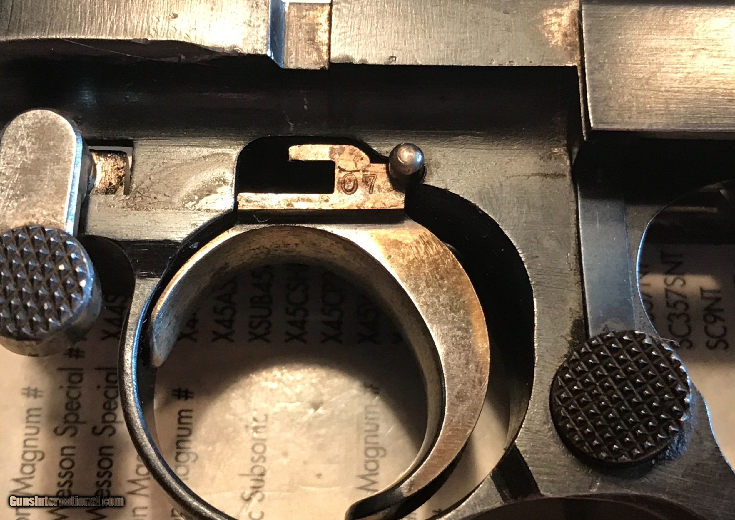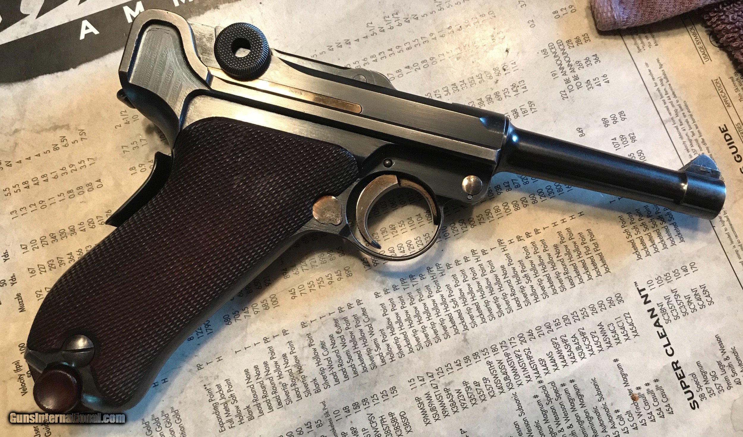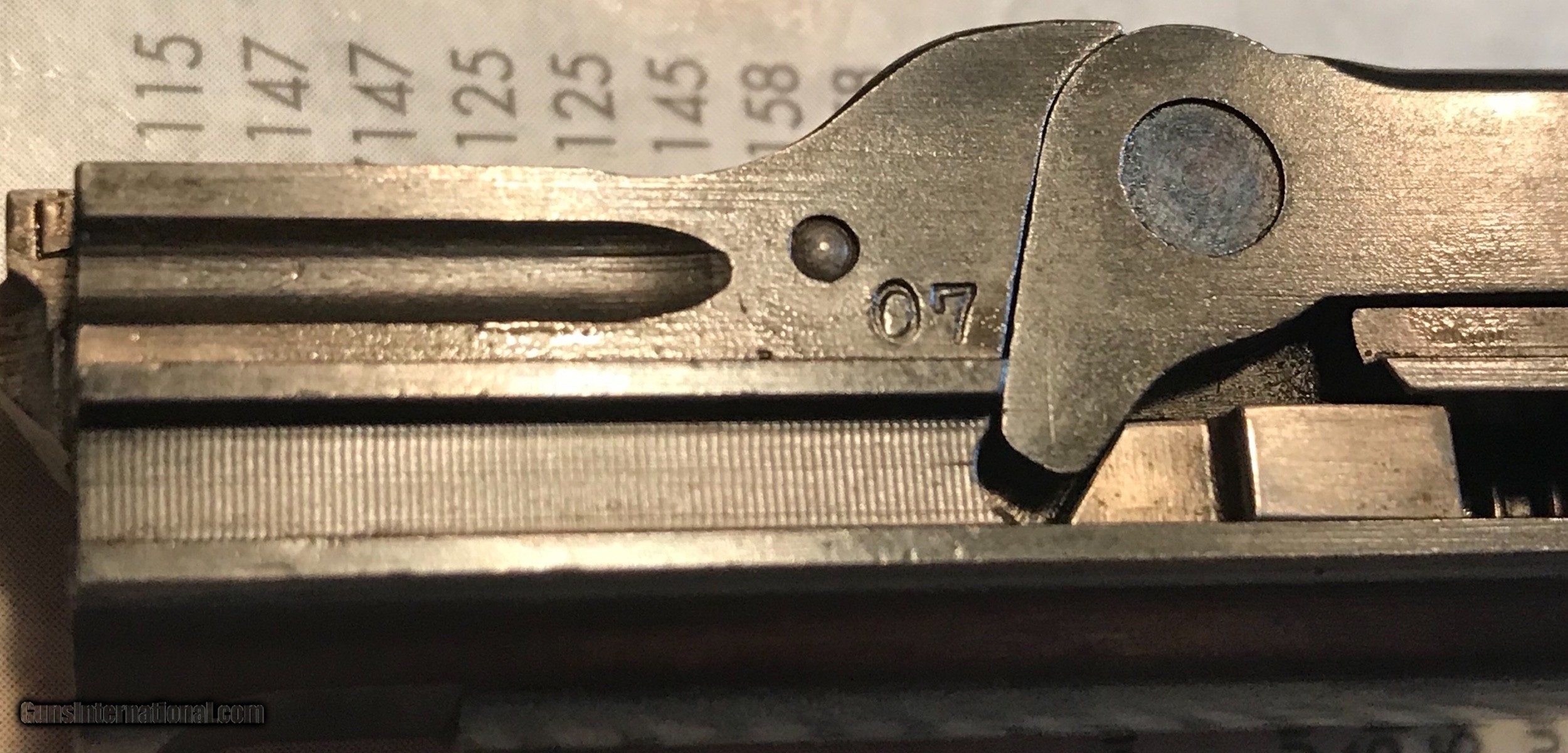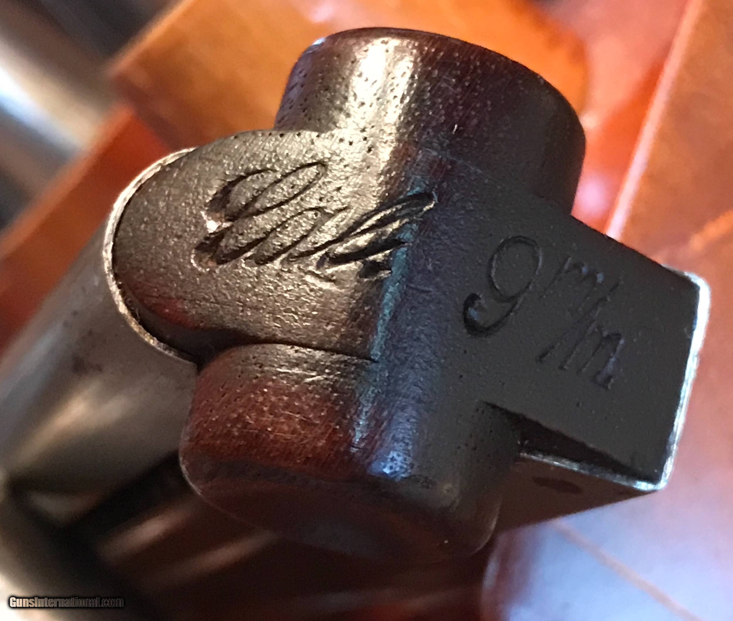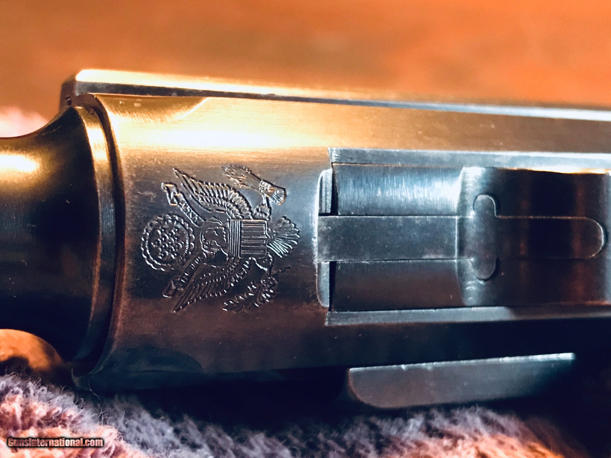 Description: Outstanding...sn34007, circa 1910. Early 9mm with short 3 7/8” fat barrel. 100% original, 95%plus blue, 65-70% straw. Mechanically about unfired. Bore outstanding. Great magazine. These early DWM 1906 American Eagles have no proof marks at all. Shipped to your FFL for $5500.00. Gary 570-428-5742 EST SOLD |