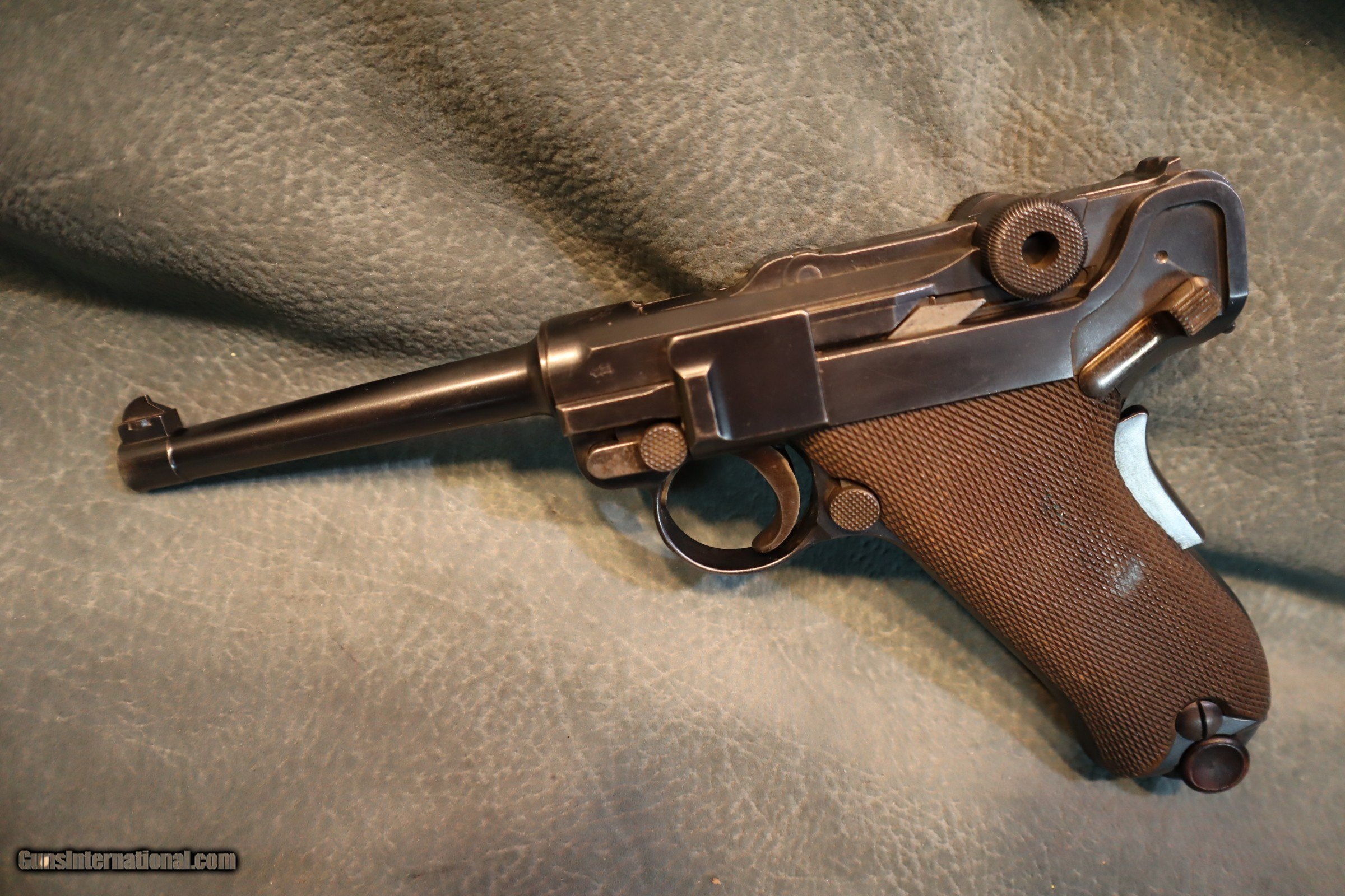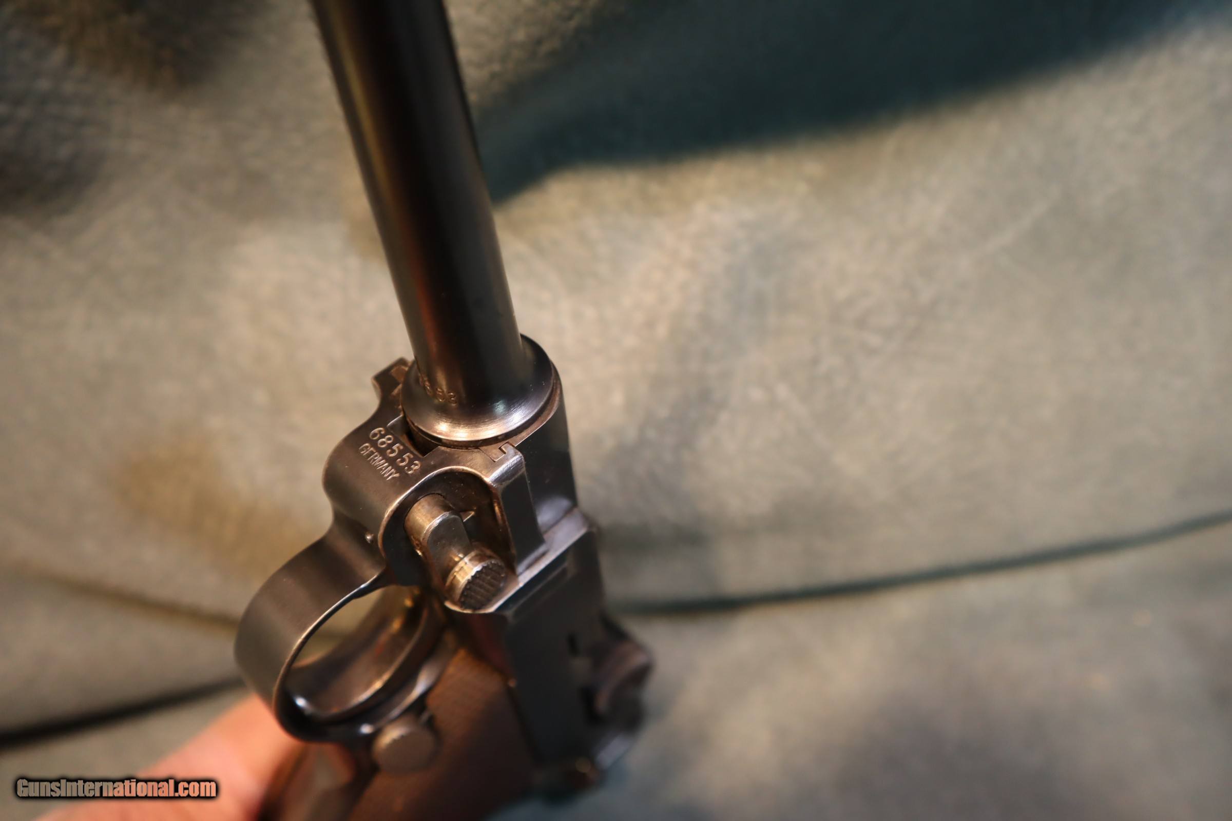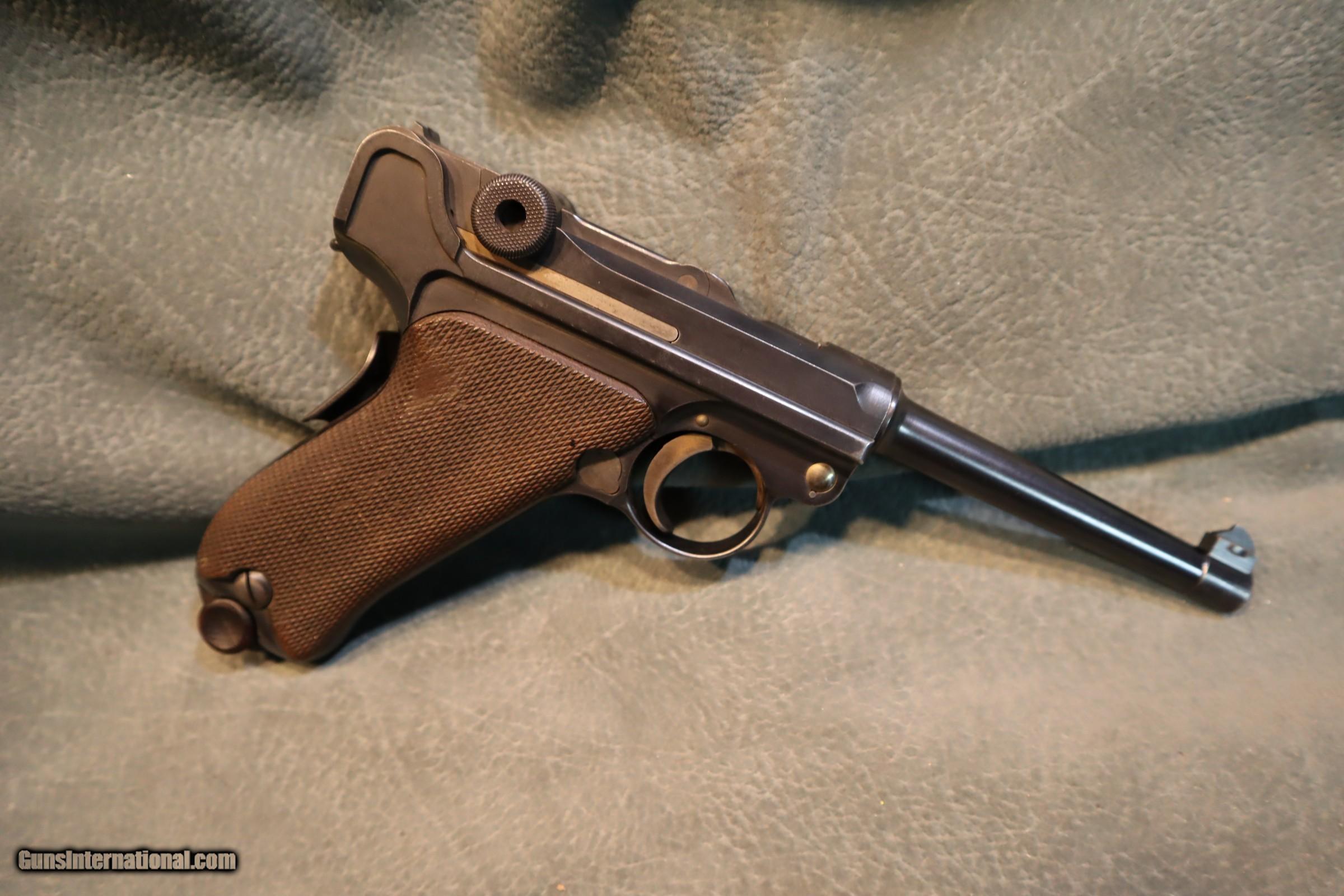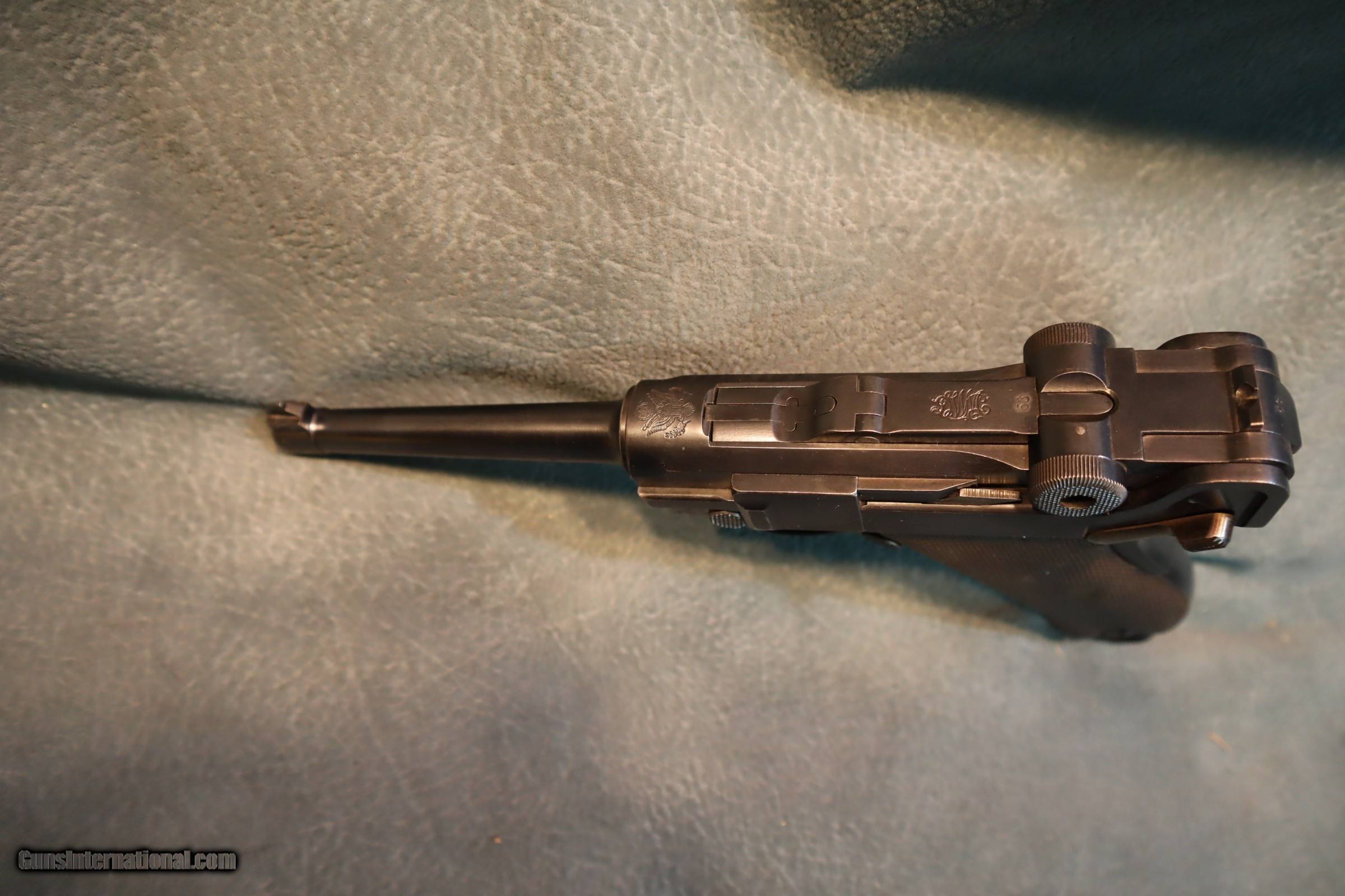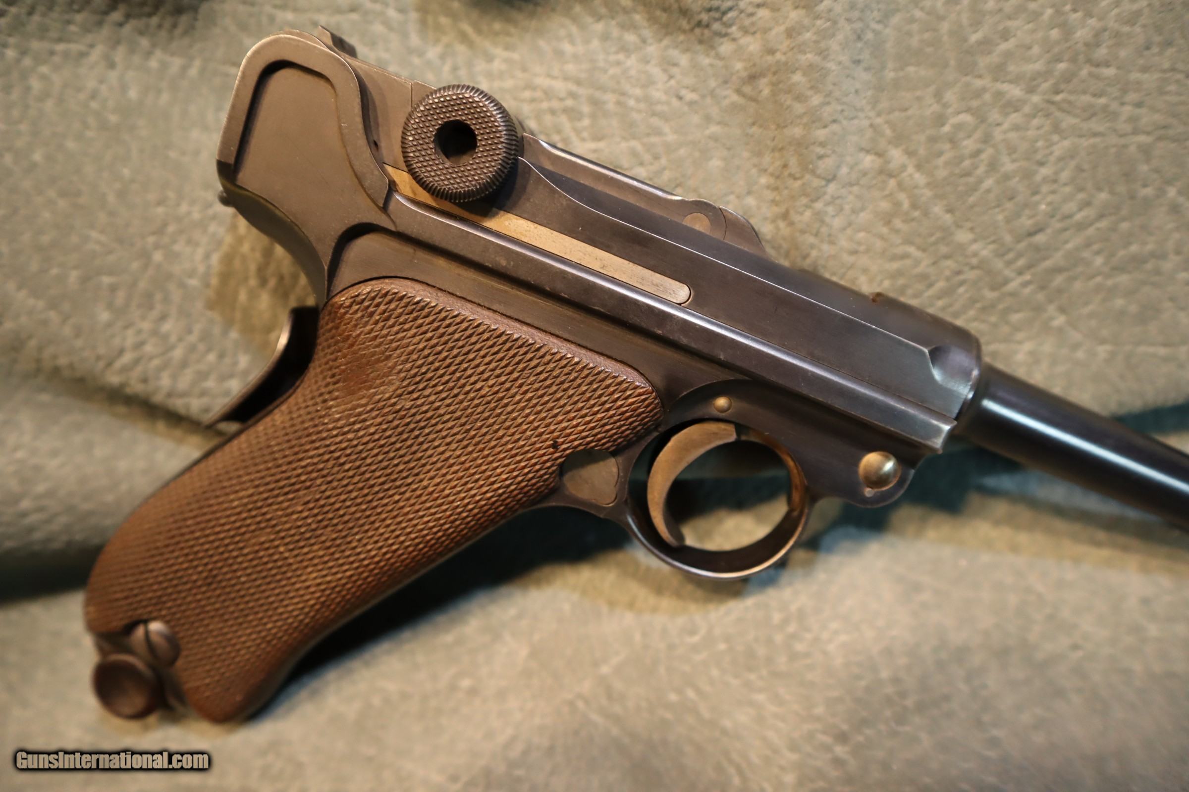 Description: Luger 1906 American Eagle 30 Luger,4 3/4" barrel,serial #68553,nice bluing and straw parts,very fine original condition. GUN COLLECTIONS WANTED FOR CASH! We buy, sell, consign and trade new and used firearms. This is our 48th year in business. We offer 90 day layaways with 20% down. No return on layaways. Firearms will need to be transferred through a FFL dealer. Prices reflect a cash discount. There will be 3% added to credit card sales. We trade for gold and silver. THANK YOU! SOLD |