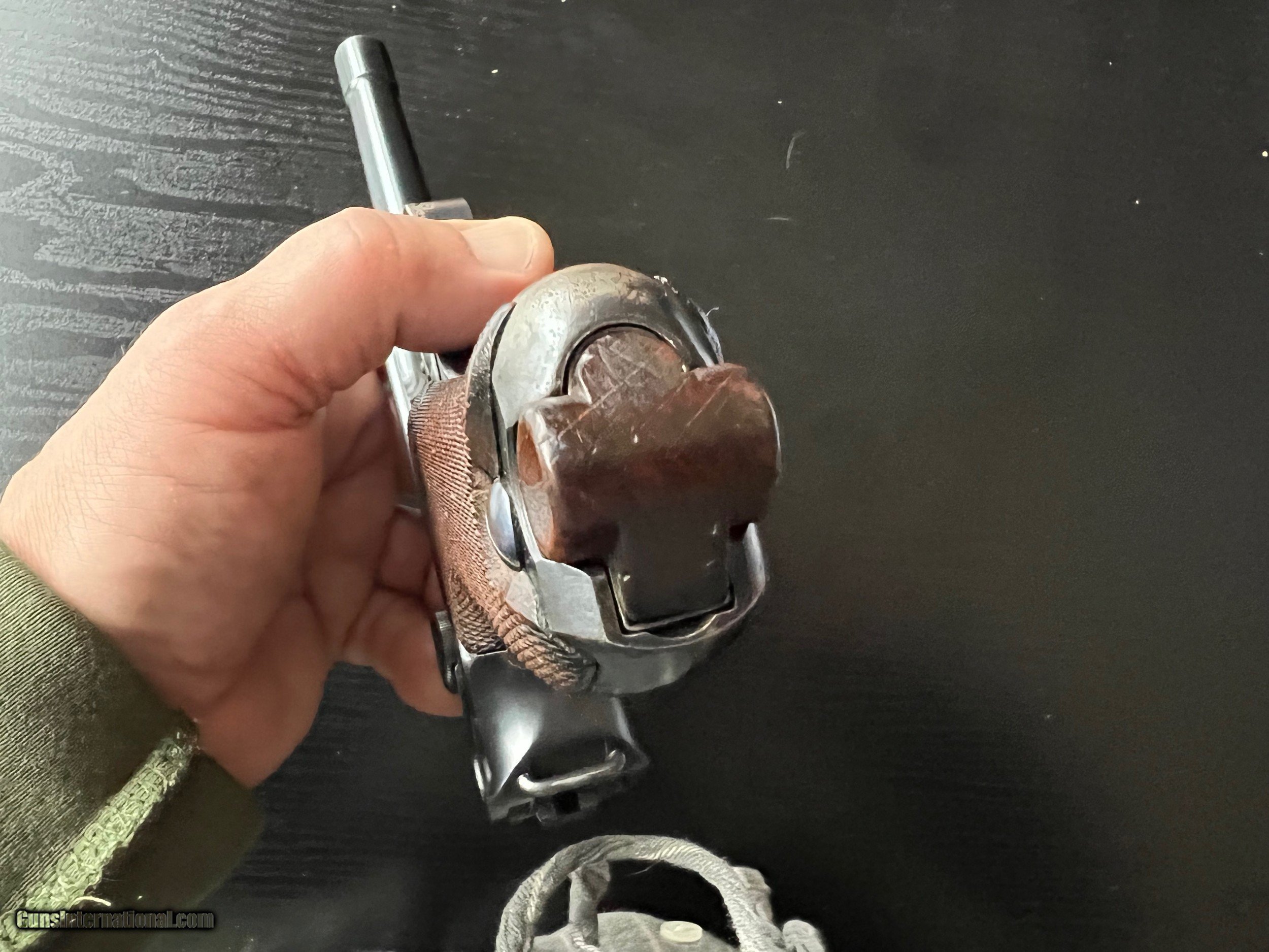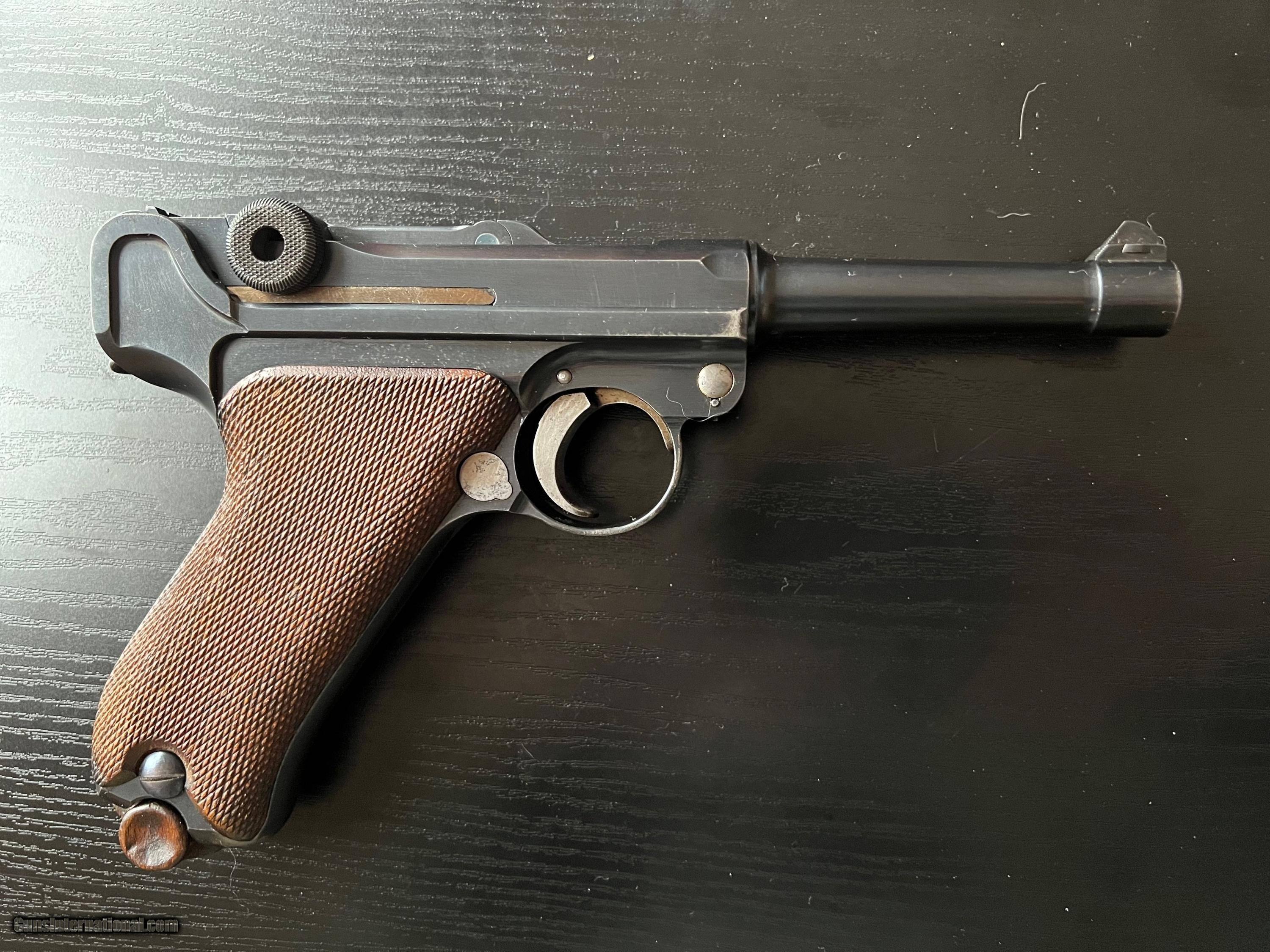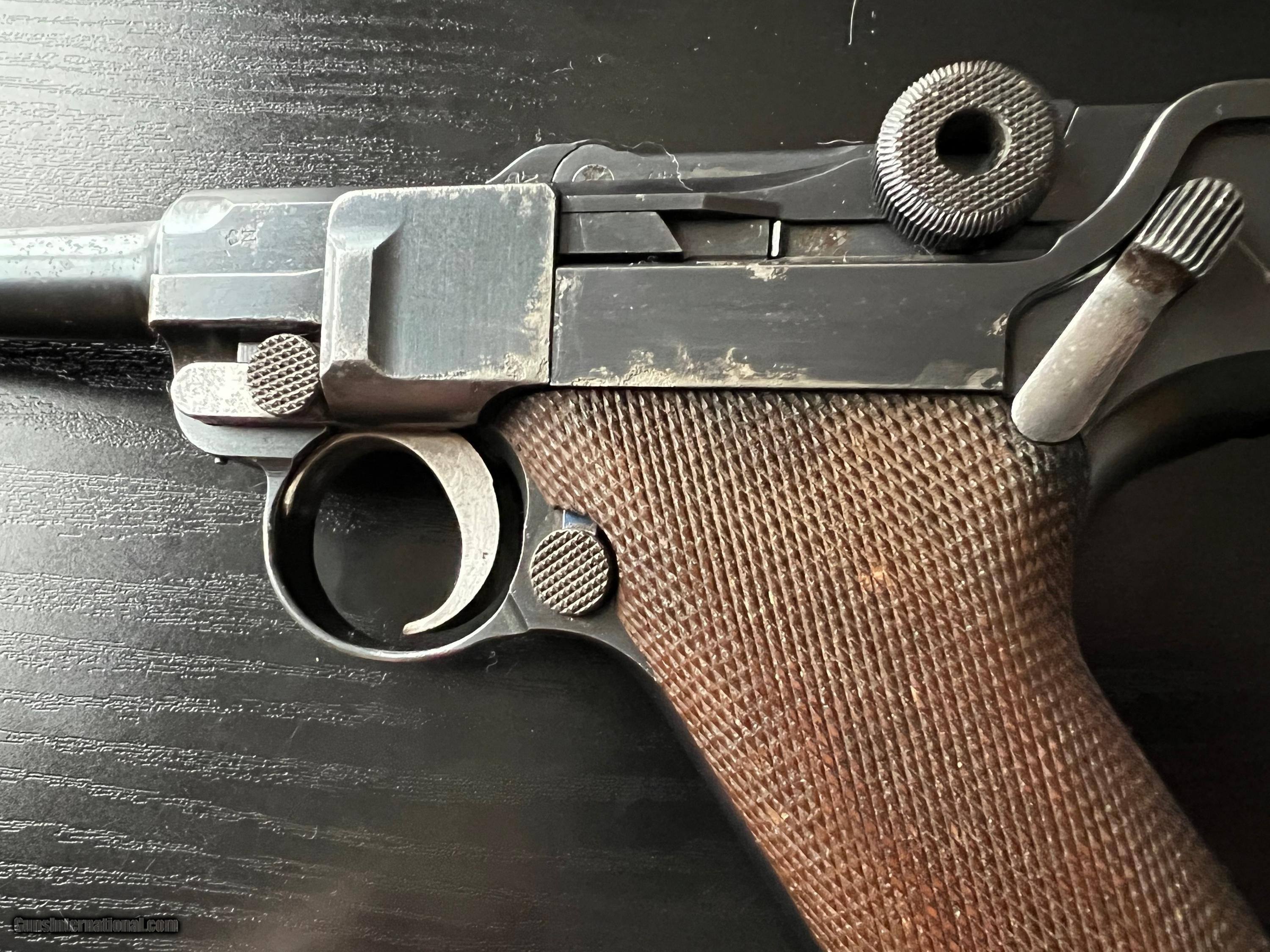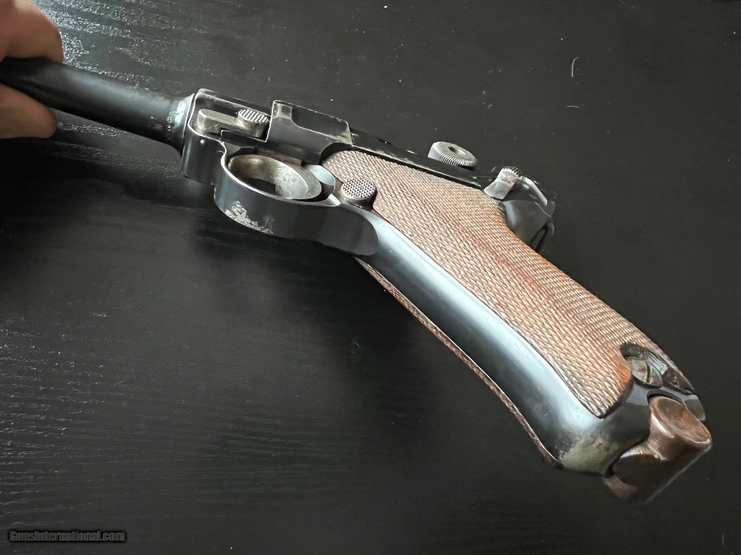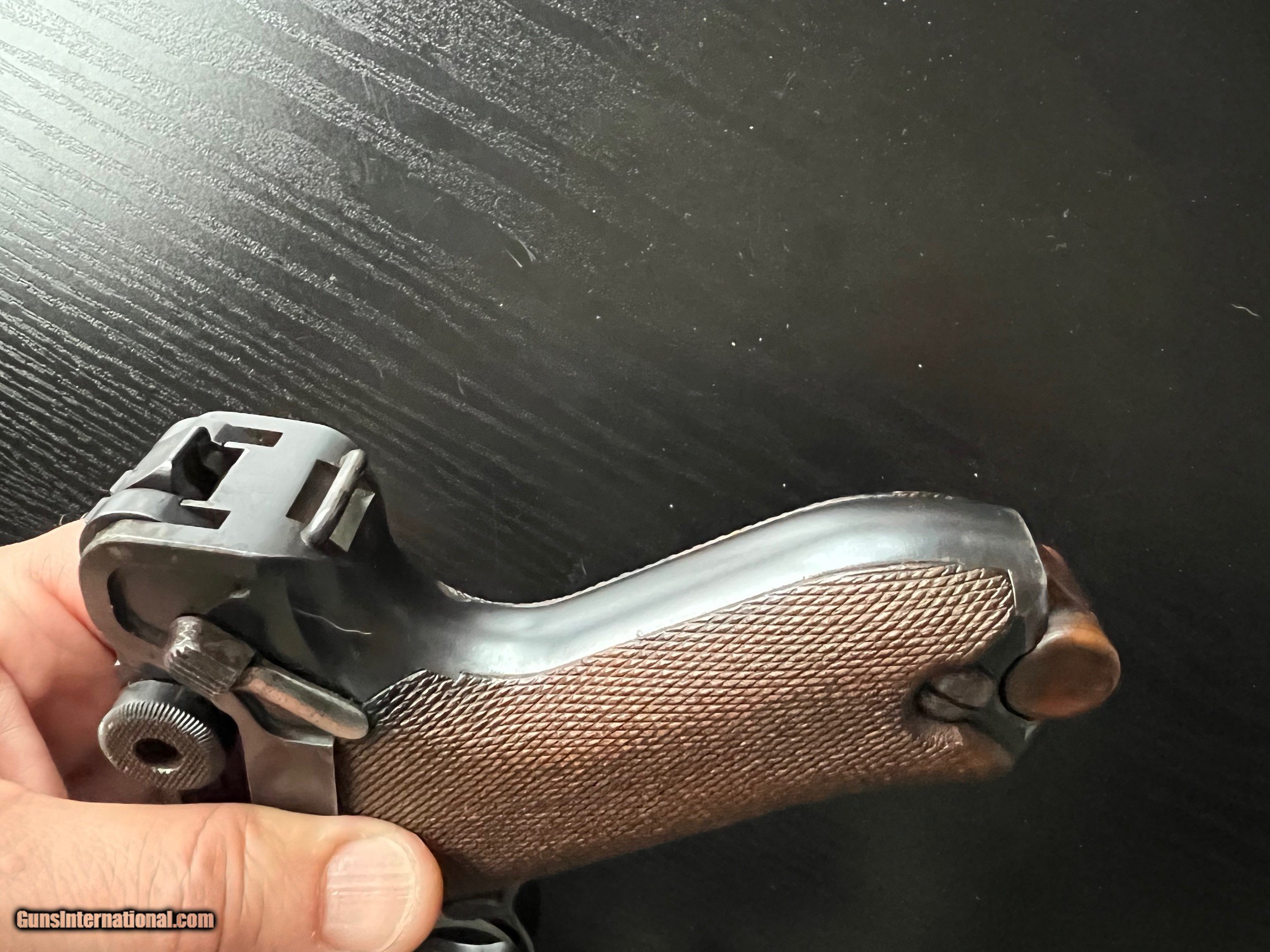 Description: SOLD This is an all original Luger 1908 model, made around 1913 by DWM, right before the start of WWI. It is chambered in 9mm Para. The early pre-war Lugers had no stock lug on the back strap and no hold-open and are sought after by collectors. This particular gun is in all original condition with near perfect finish on the right side and on the grip straps. It also has perfect internals. Unfortunately, it was probably not stored properly and developed some pinprick pitting and blue wear on the left side and on top of the barrel, on the side plate and the left side of the frame. There is some blue wear on the underside of the trigger guard as well. The quality of commerical DWM bluening is a notch above its military blue. It is an all matching gun with correct original unnumbered magazine. Beautiful bore and grips. It is a very nice representative, all original example, priced at 50% discount to a comparable high condition gun. 3-day inspection FFL or C&R(where allowed) $30 shipping in CONUS SOLD Curio/Relic: Yes |