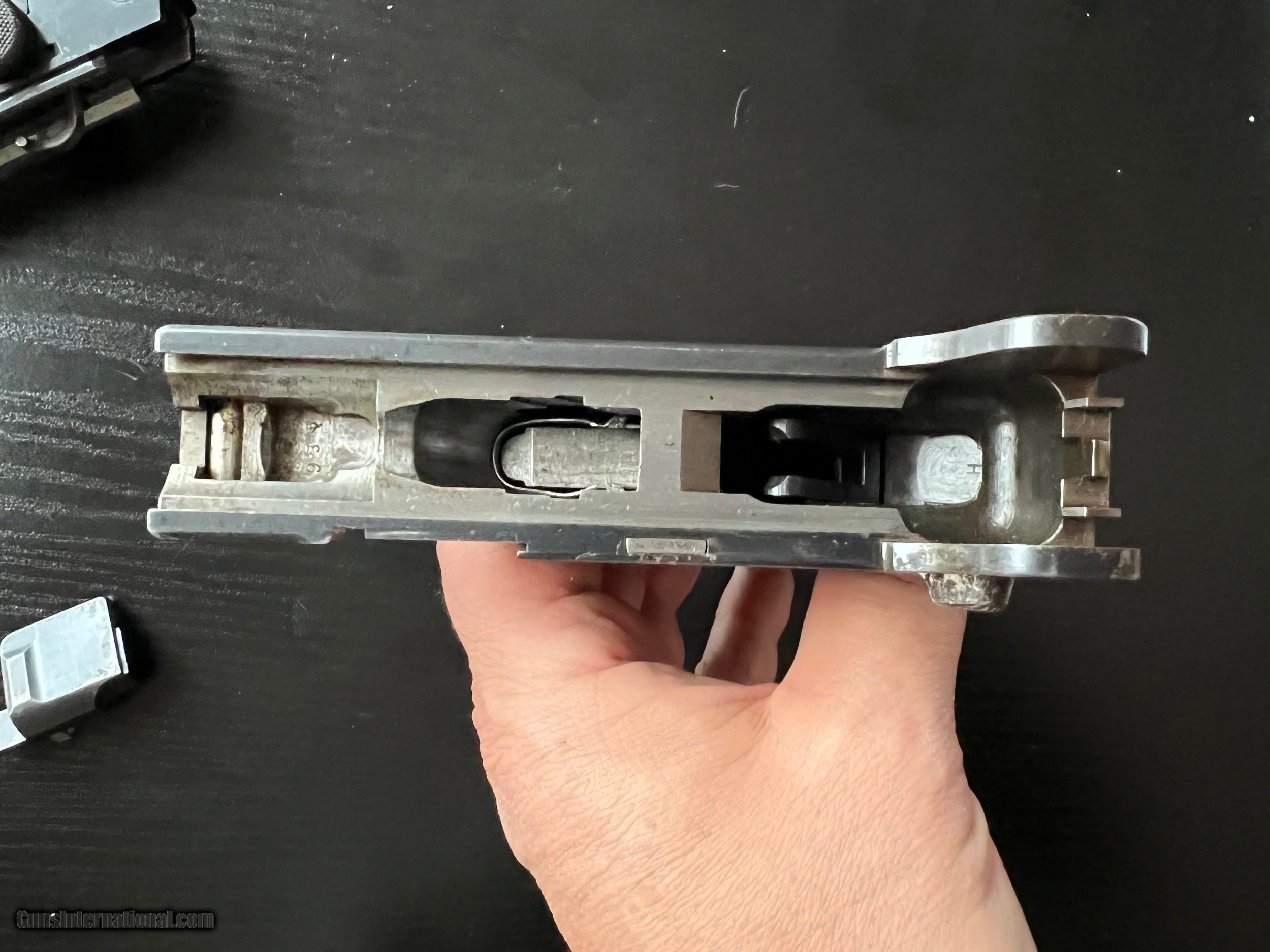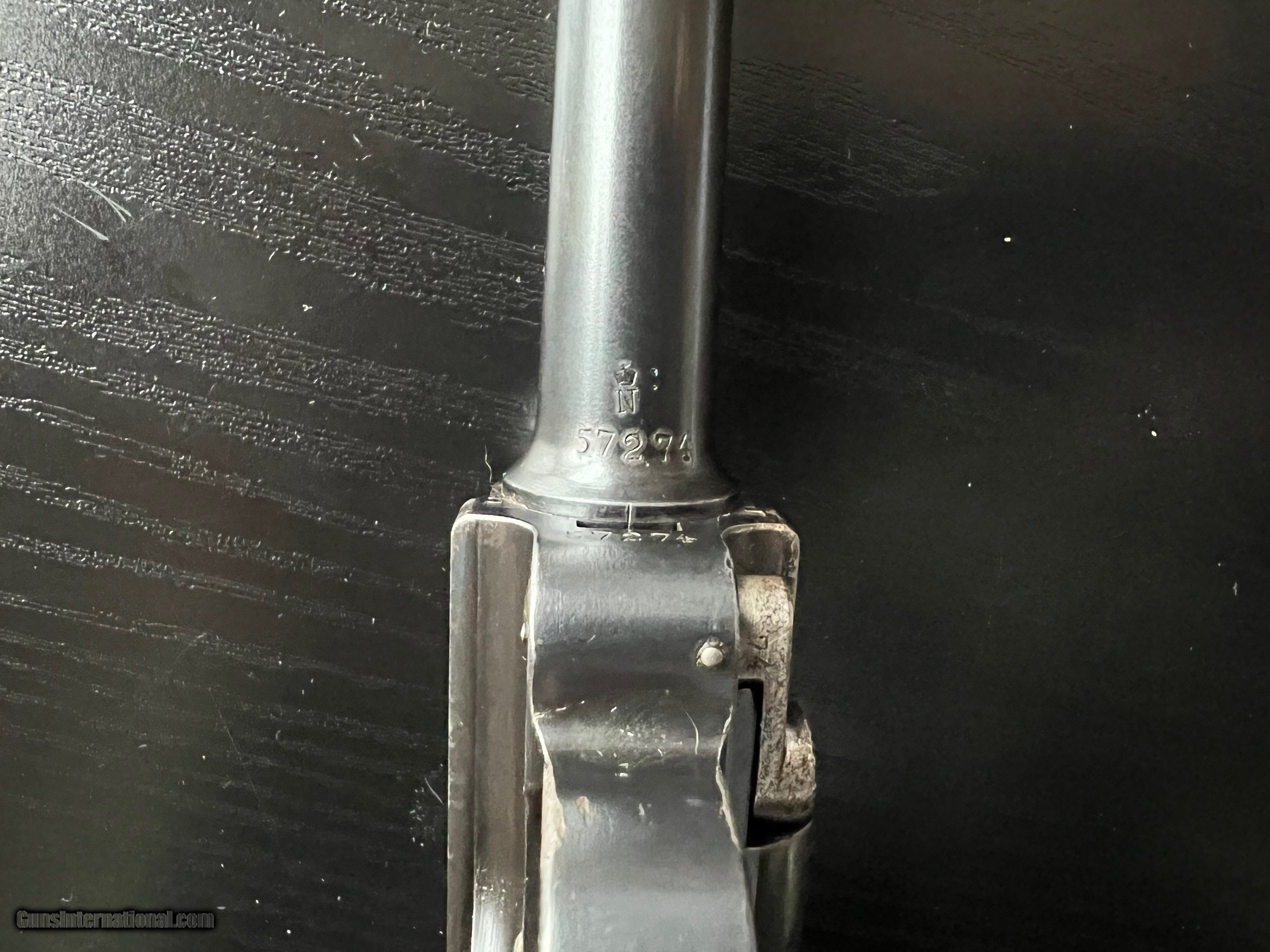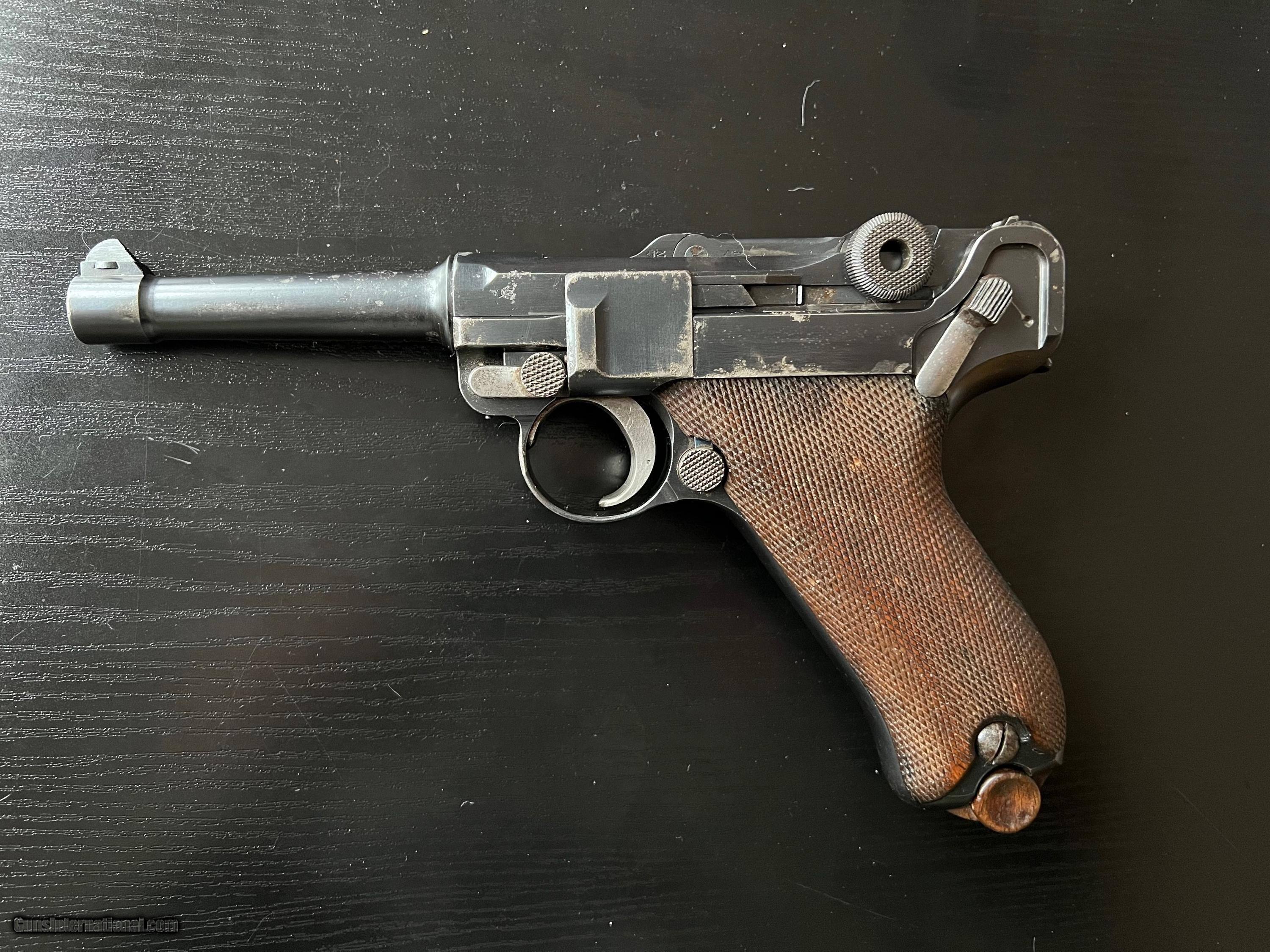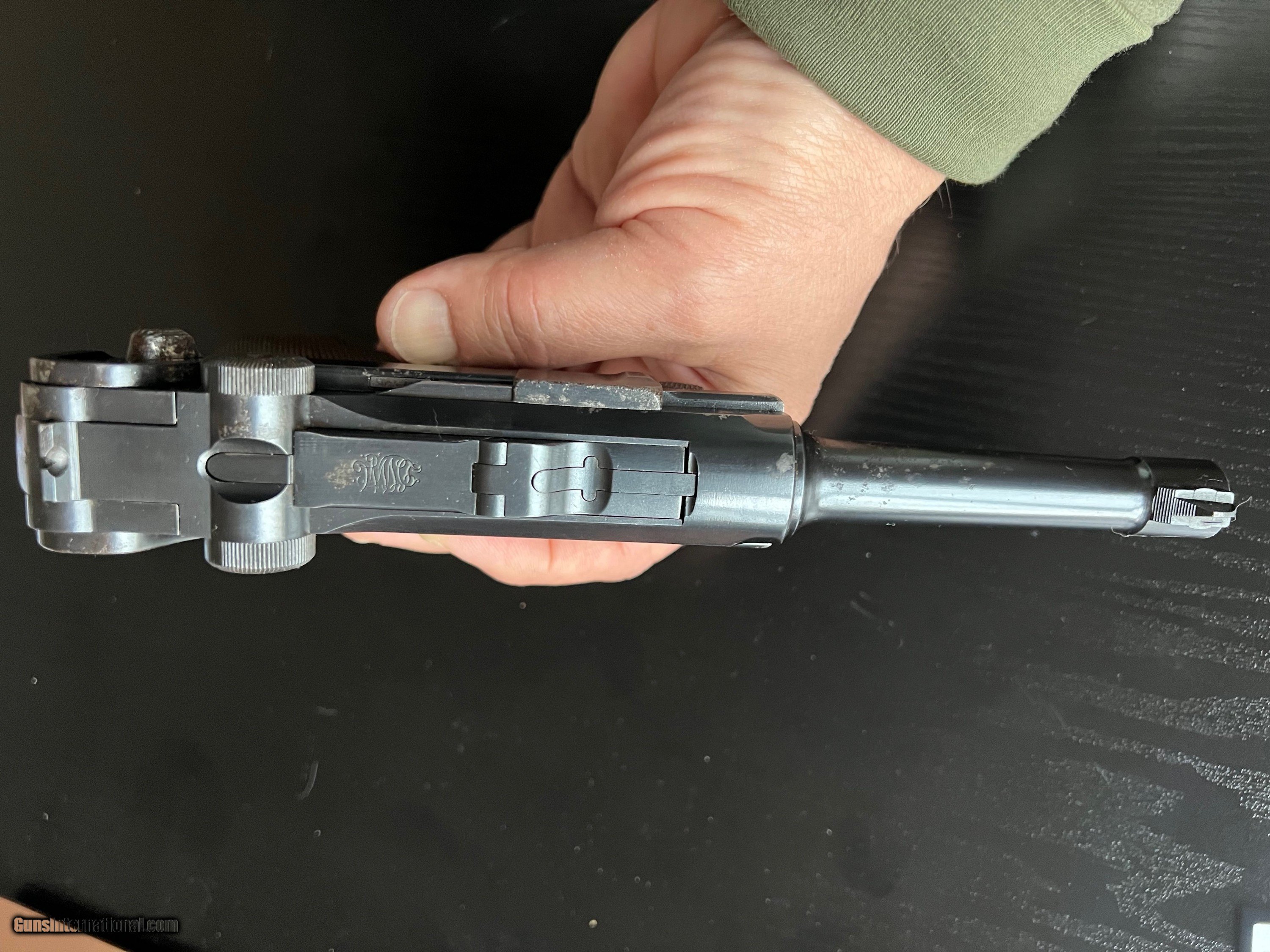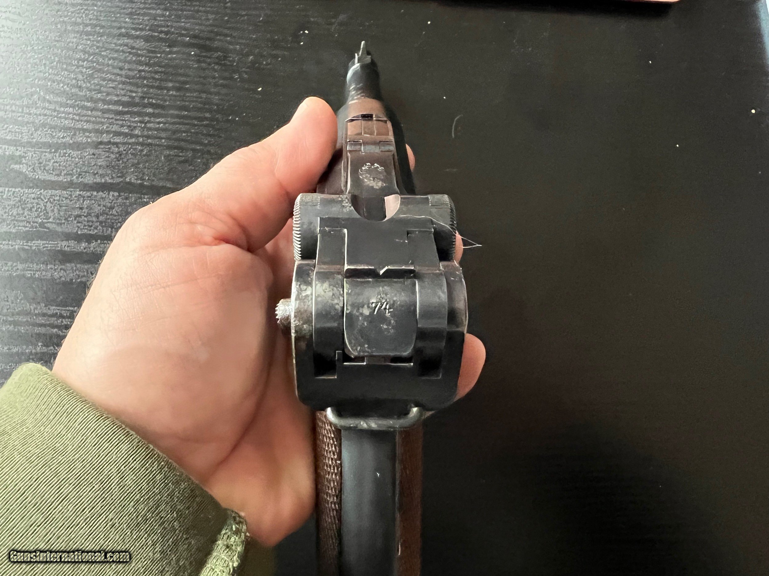 Description: SOLD This is an all original Luger 1908 model, made around 1913 by DWM, right before the start of WWI. It is chambered in 9mm Para. The early pre-war Lugers had no stock lug on the back strap and no hold-open and are sought after by collectors. This particular gun is in all original condition with near perfect finish on the right side and on the grip straps. It also has perfect internals. Unfortunately, it was probably not stored properly and developed some pinprick pitting and blue wear on the left side and on top of the barrel, on the side plate and the left side of the frame. There is some blue wear on the underside of the trigger guard as well. The quality of commerical DWM bluening is a notch above its military blue. It is an all matching gun with correct original unnumbered magazine. Beautiful bore and grips. It is a very nice representative, all original example, priced at 50% discount to a comparable high condition gun. 3-day inspection FFL or C&R(where allowed) $30 shipping in CONUS SOLD Curio/Relic: Yes |