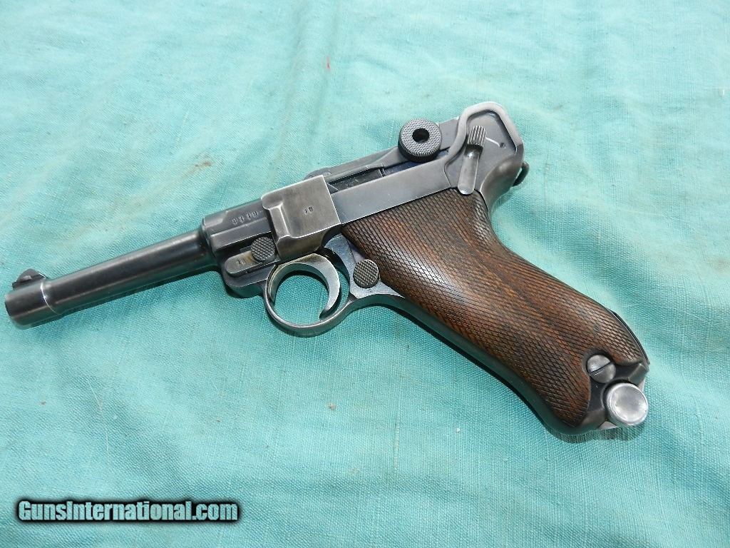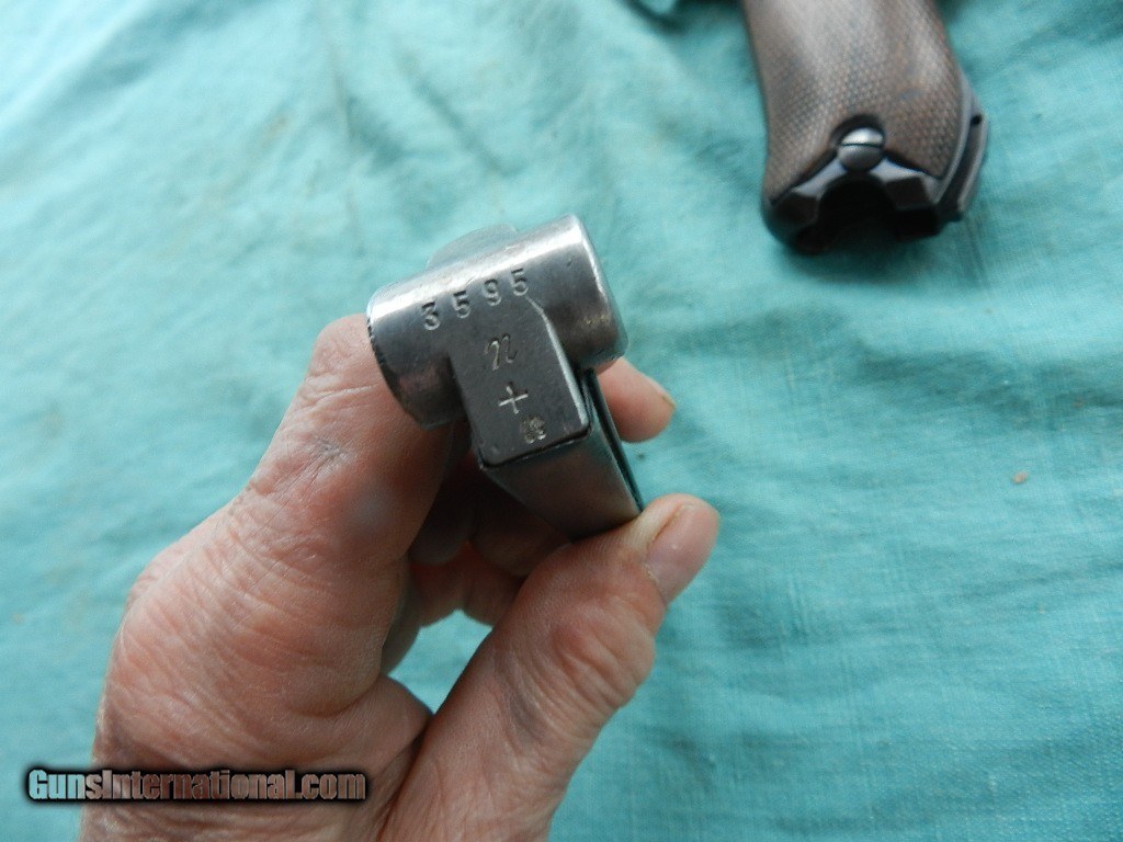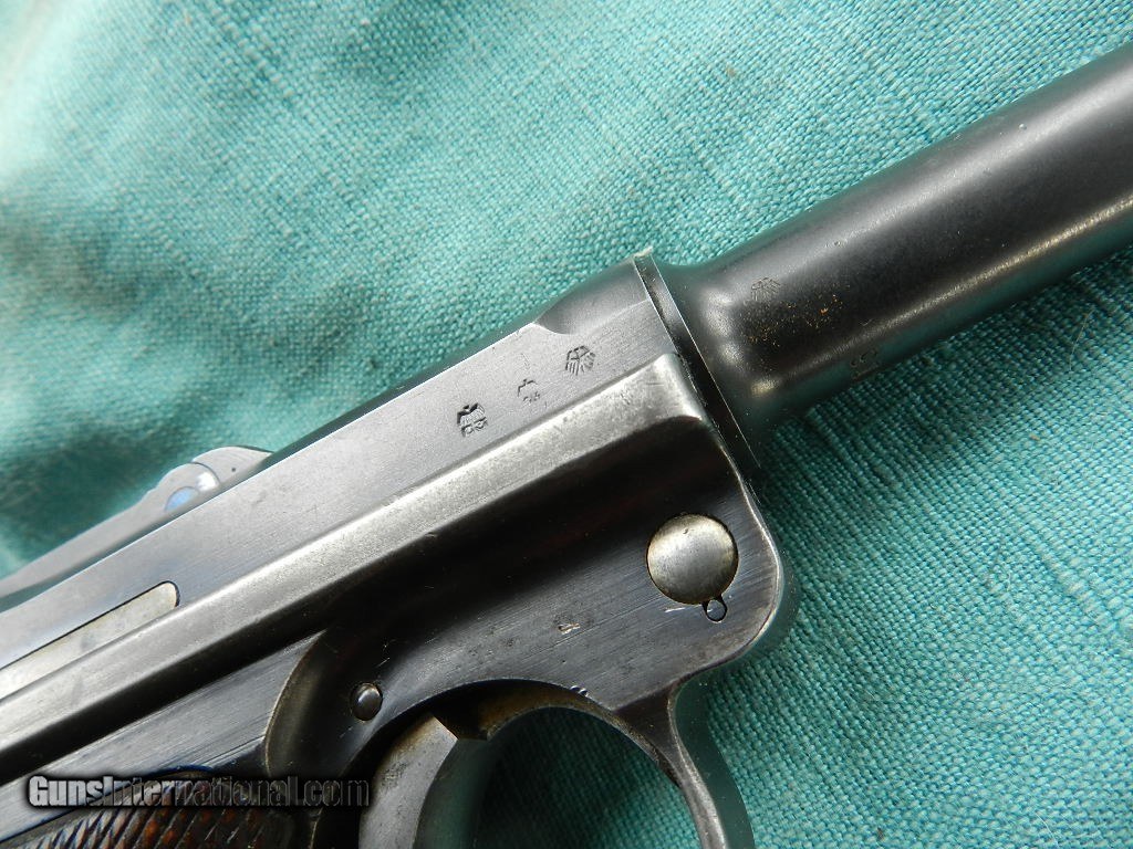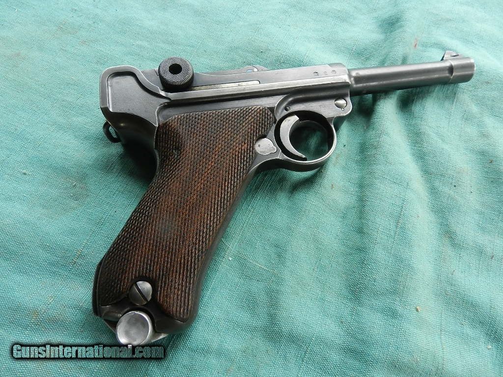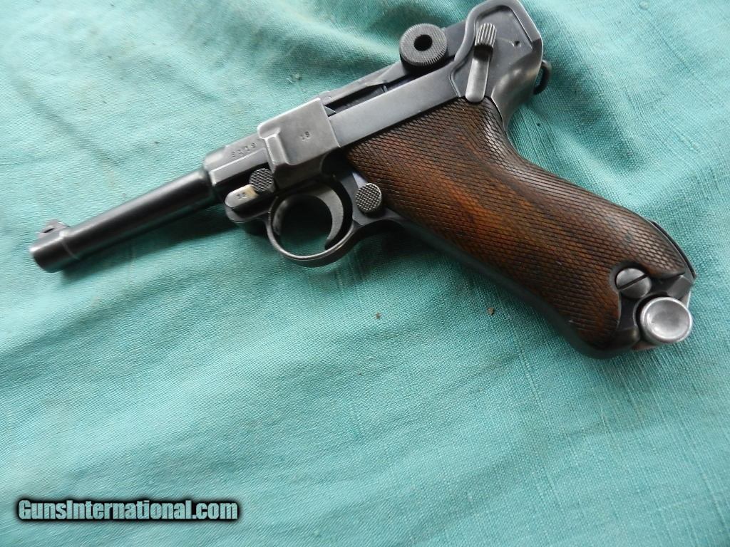 Description: <<<<SOLD>>>> A clean original Luger dated 1936 s/42 with all numbers matching including the firing pin. German walnut grips are good with some flatening and on the left side more wear is evident as this was a holstered gun, maybe for several years. The 4 " long bore is very clean, shiny, and has strong rifling.The slide and upper gun has most of the blue and the grip straps have most of the wear. SN 9119 with an M underneath the Sn on the frame, Some straw coor on the trigger , extractor and take-down latch. Comes with an original miltary mag. with an aluminum base and a SN 3595N / Overall a bvery clean pre-war German Military Luger.Shipping may be higher than stated as shippers raise their prices twice year without notice! When buying a gun always have it examined by a competent gunsmith before shooting. To buy a gun from me you must get a direct email for me, with details, and shipping cost. We don’t have a web site .I prefer money orders or a check. Item ships when funds come in. If you can only pay with a card let me know. I try to keep guns affordable, which means I make less money than most dealers. You won’t get altitude sickness, or nose bleed, with my prices! I consistently have the best selection of older guns If you attempt to buy, you must still contact us for details . Best to email to buy. Sometimes a local person can stop buy and purchase before the gun is removed. Sometimes not home to get calls. Some guns are required shipment to a gun dealer near you for a transfer to you when it arrives. Otherwise many older or black powder guns ship to your door. With the widest selection of older guns at great prices, We don’t have a store, and sell on the internet only. I’m easy to get along with. Thank You. SOLD Curio/Relic: Yes |