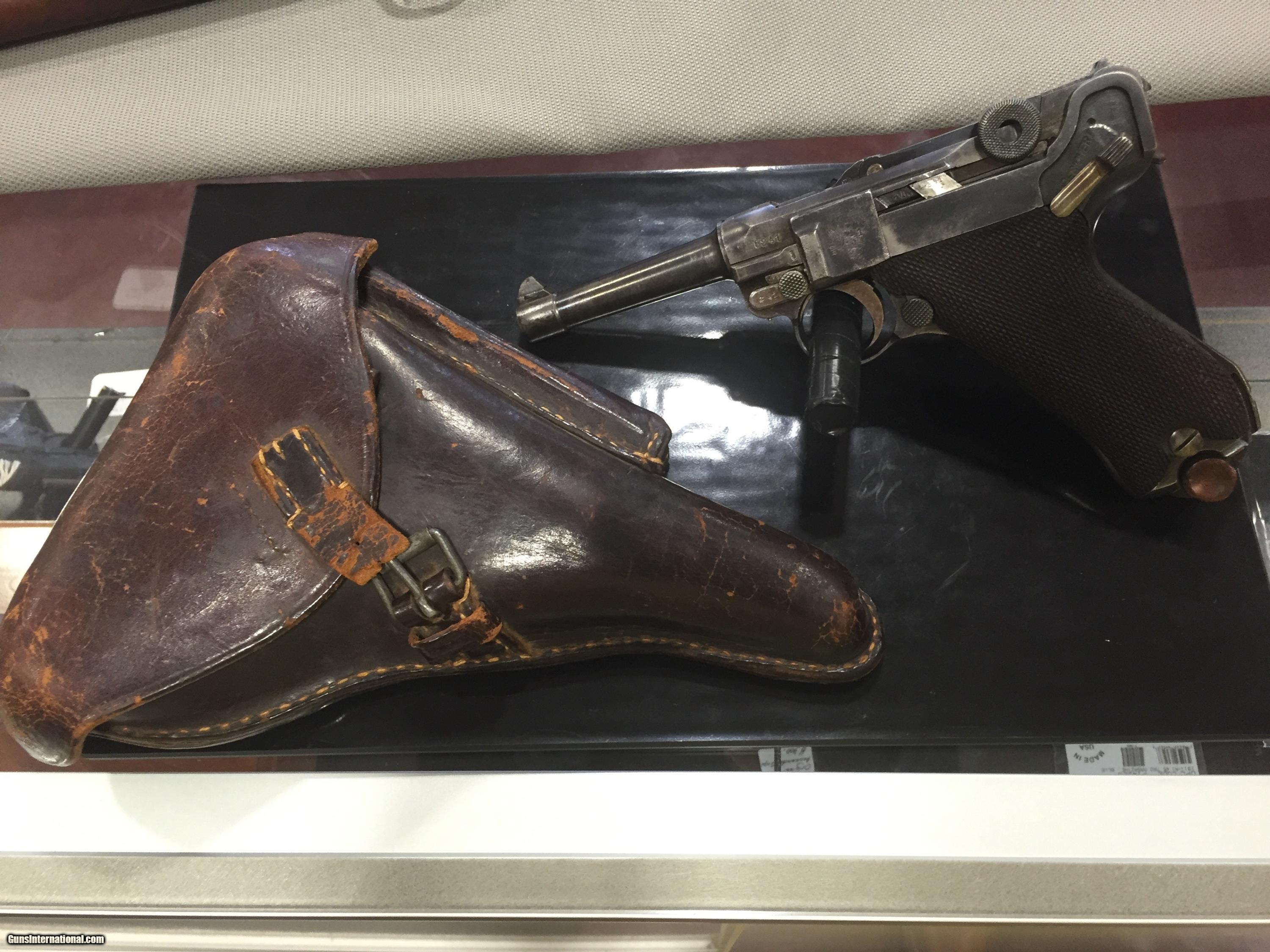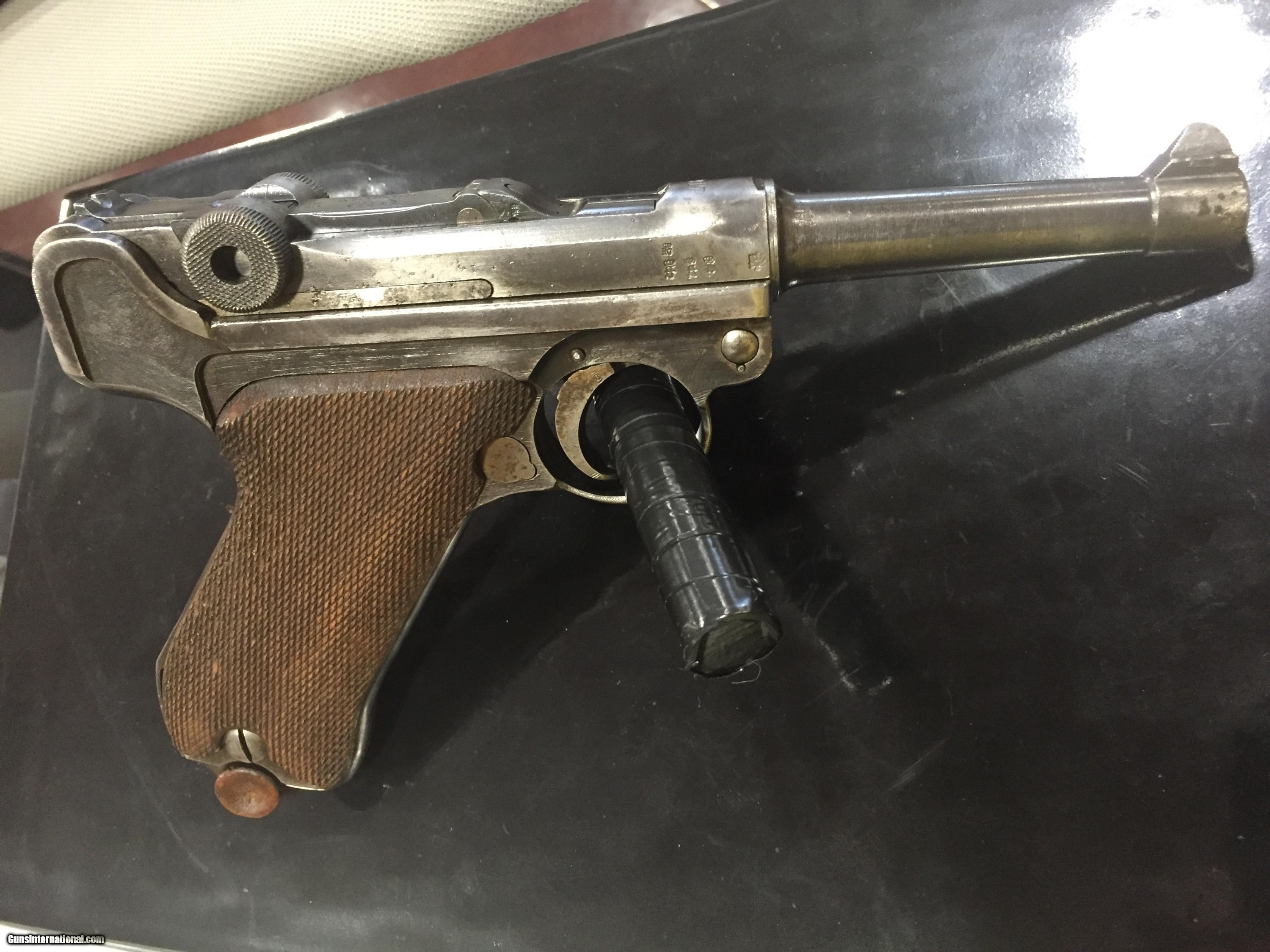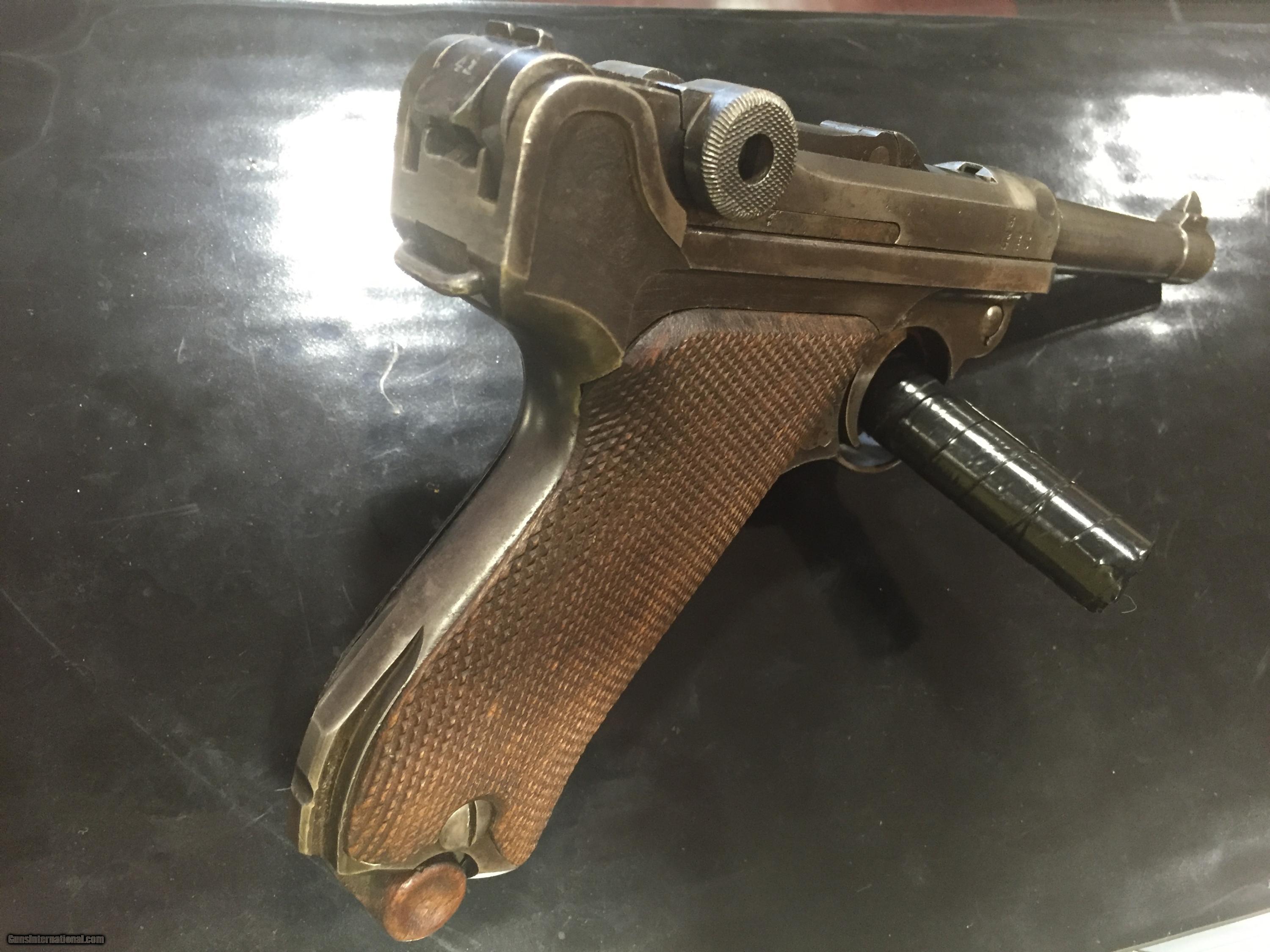 Description: !!! ANTIQUE LUGER 9MM MILITARY PISTOL !!! THIS IS AN AWESOME LUGER 9MM MILITARY PISTOL THAT WAS POSSIBLY MANUFACTURED IN 1917. THIS LUGER IS IN GOOD CONDITION FOR ITS AGE AND FUNCTIONS WELL. THIS GUN COMES WITH A NICE ORIGINAL HOLSTER AND BREAK DOWN TOOL. THIS GUNS MAGAZINE HAS A WALNUT WOOD BASE PLATE. ALL MATCHING NUMBERS. +$25.00 SHIPPING CHARGE SOLD |