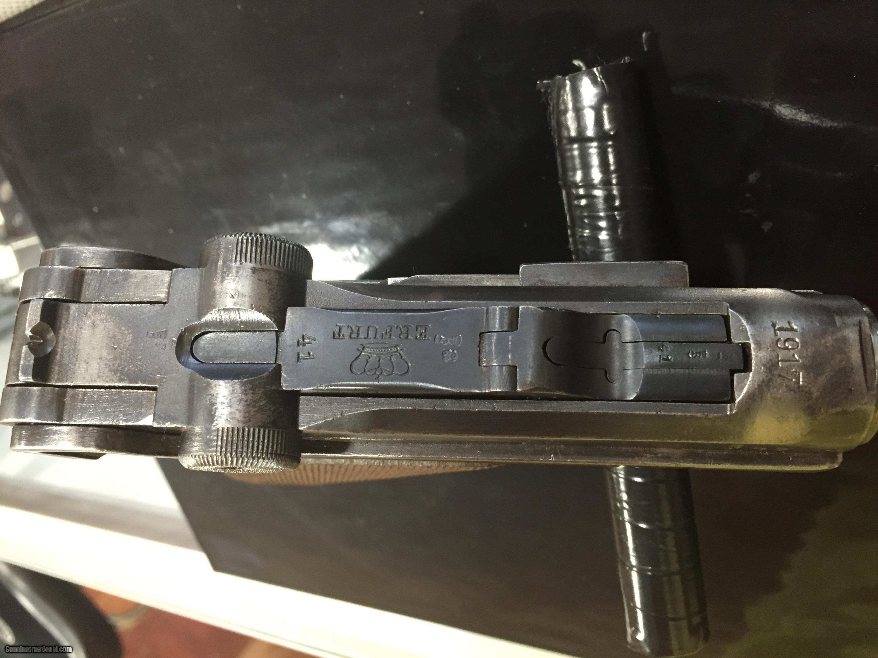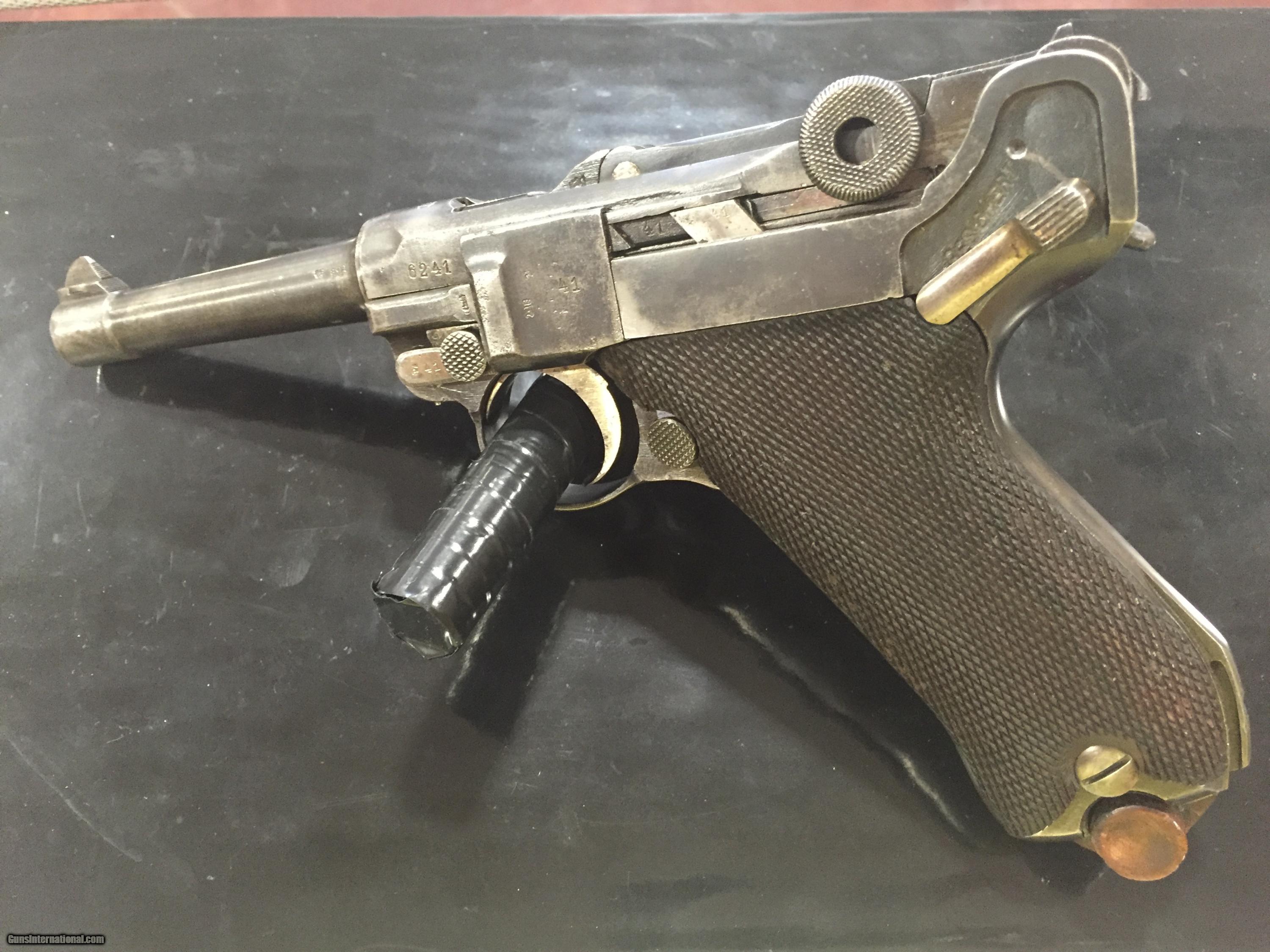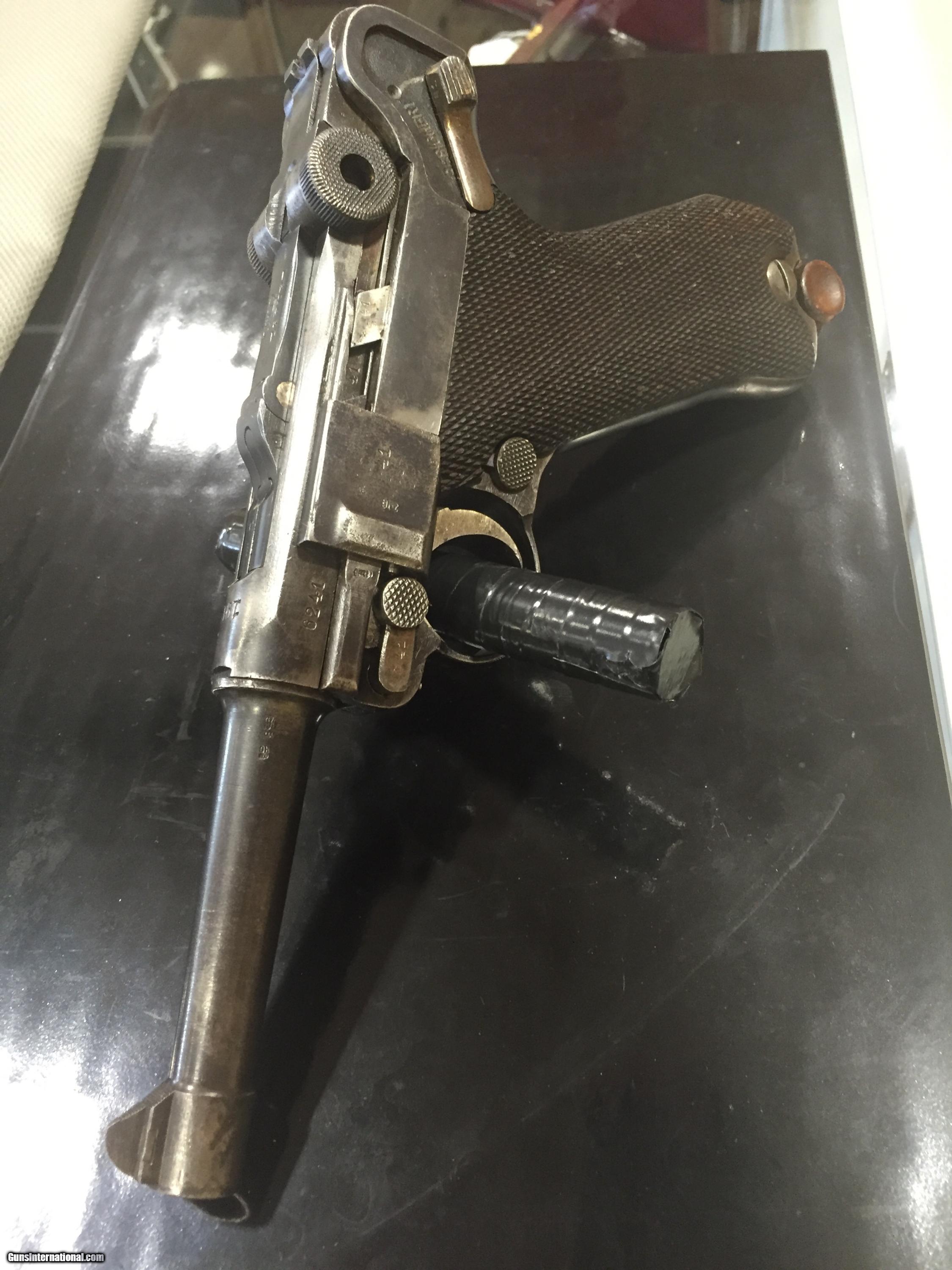 Description: !!! ANTIQUE LUGER 9MM MILITARY PISTOL !!! THIS IS AN AWESOME LUGER 9MM MILITARY PISTOL THAT WAS POSSIBLY MANUFACTURED IN 1917. THIS LUGER IS IN GOOD CONDITION FOR ITS AGE AND FUNCTIONS WELL. THIS GUN COMES WITH A NICE ORIGINAL HOLSTER AND BREAK DOWN TOOL. THIS GUNS MAGAZINE HAS A WALNUT WOOD BASE PLATE. ALL MATCHING NUMBERS. +$25.00 SHIPPING CHARGE SOLD |