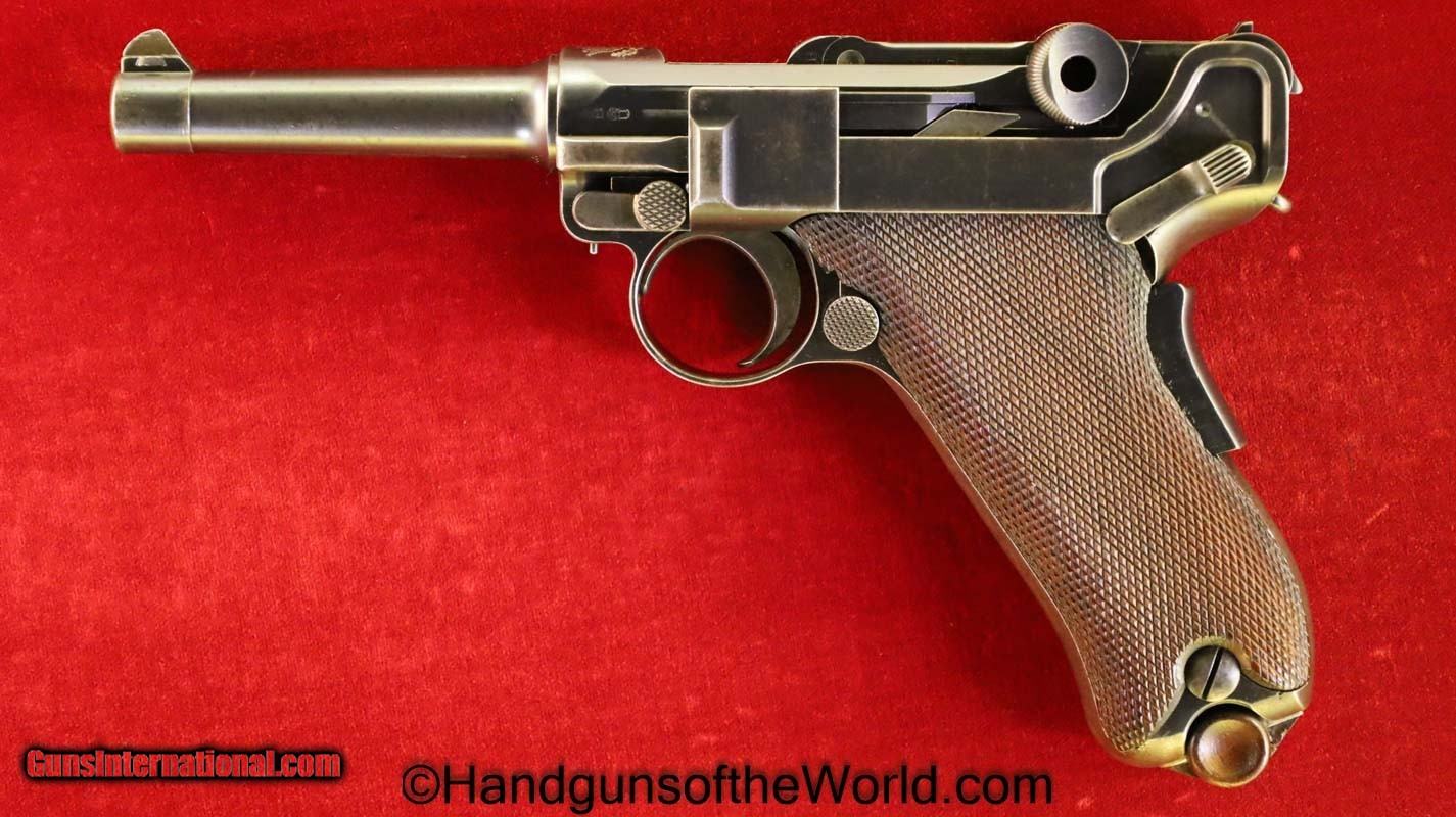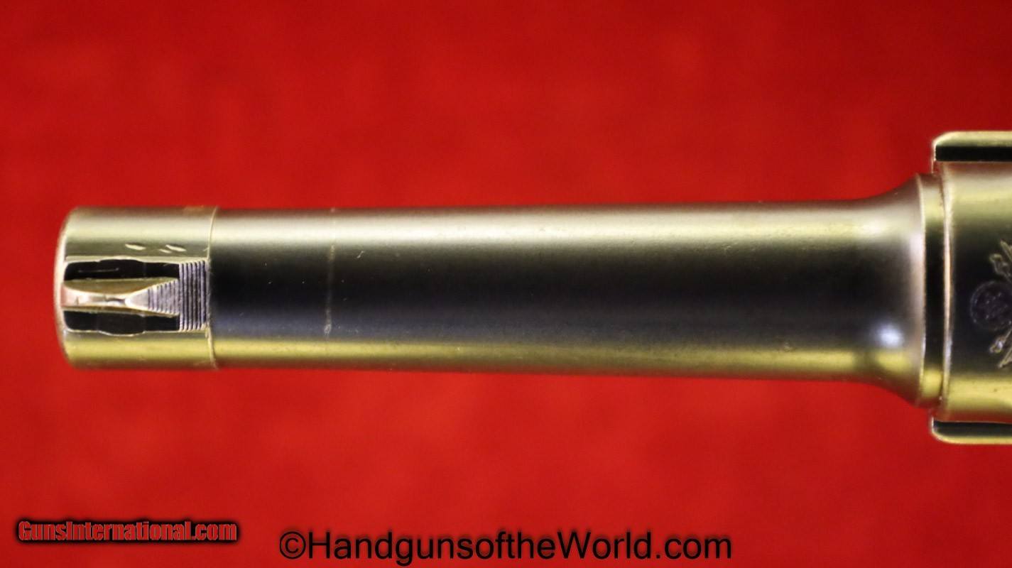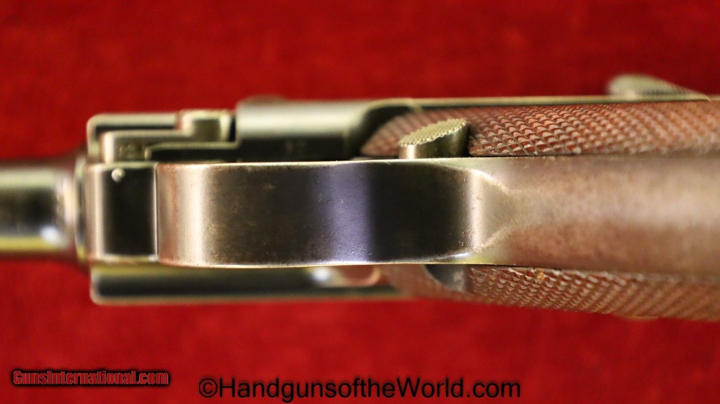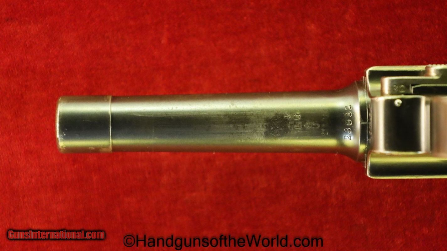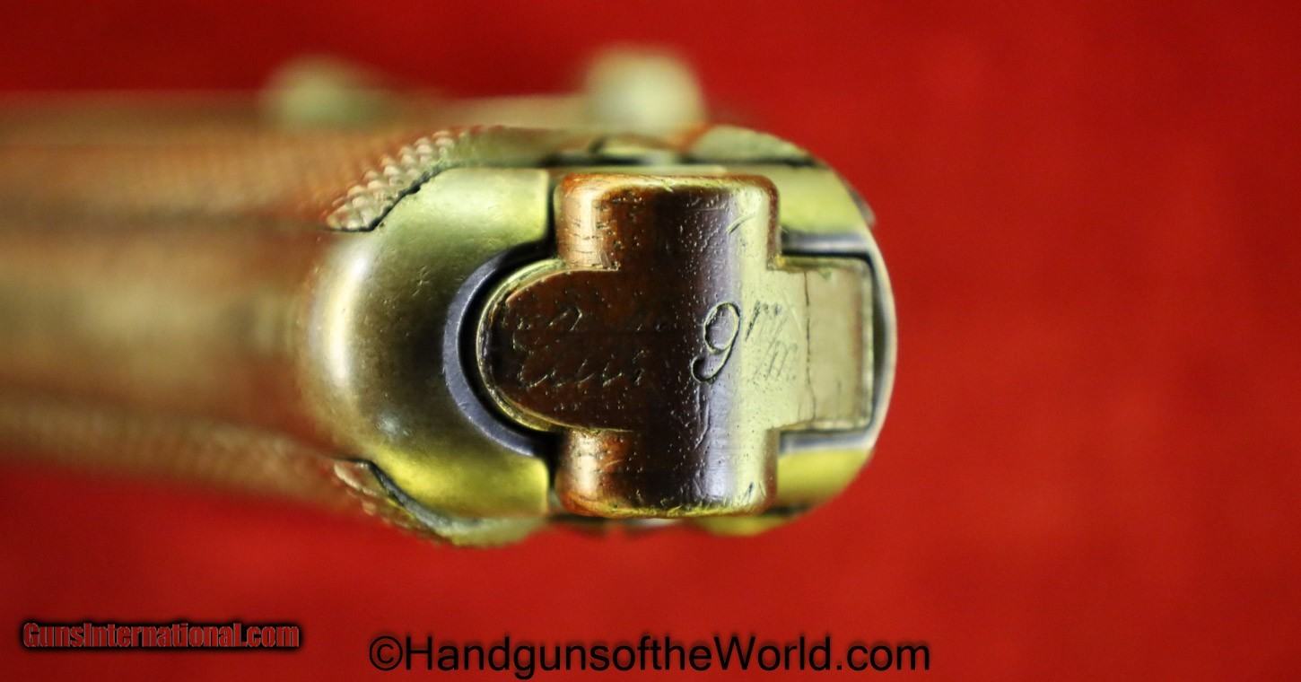 Description: DWM 1902 Luger, 9mm. This has the American Eagle on the top of the chamber. This variation is known as the Fat Barrel, as it was the 1st Luger to have a 9mm, 4″ barrel. Only about 800 of these were manufactured. This one is German BUG proofed. The grips are from a different pistol, but the other parts are all matching. The magazine is correctly marked Cal 9mm in script. The blue rates about 80% and the bore is Fair-Good. Curio/Relic: Yes Handgun Caliber: 9x19mm Parabellum (9mm Luger, 9x19mm NATO) Manufacturer: DWM Model: Luger Price: $10,995.00 Shipping: $35.00 Contact Seller |