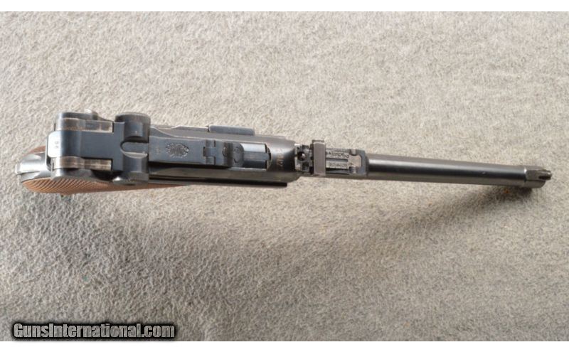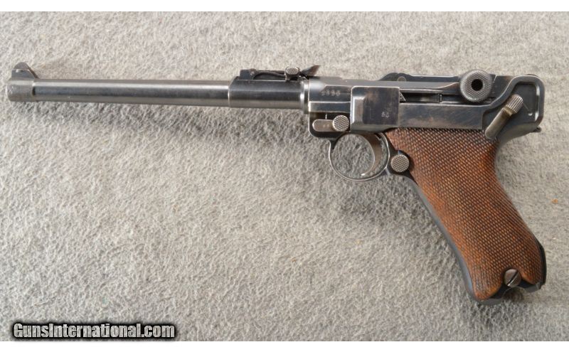 Description: This is a very good and hard to find DWM Luger 1917 Artillery in 9MM. The blue shows wear on the high points and edges but is still quite good. The straw colors still have good gold color but are not minty. The 8 inch barrel is in good condition with an 800 meter adjustable rear sight and some pitting on the left side of the sight band. This pistol comes with 2 wood button mags and 1 is matching the serial number. The serial numbers on the barrel, front of frame, extractor, front and back toggle, sight, takedown lever and side plate all match. The wood grips are also quite nice with very minor wear and are a little loose from age. The bore is still very good. This nice WWI pistol comes with a homemade fitted holster. SOLD Curio/Relic: Yes Manufacturer: 1917 Caliber Info: 9MM Chambers: Semi-Auto. Metal Condition: Very good. Wood Condition: Very good. Bore Condition: Very good. Barrels: 8 inch with sights. Triggers: Single straw color. Stock: Checkered walnut grips. Weight: 35 Oz. Sights: 800 meter adjustable rear and a blade front. Extras: Comes with 1 extra mag and the holster. Item Location: Owatonna, MN |