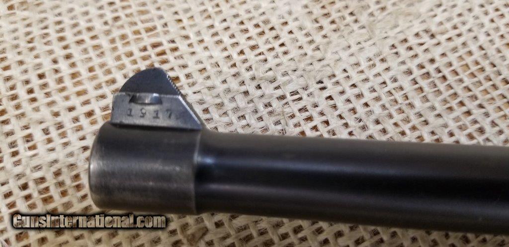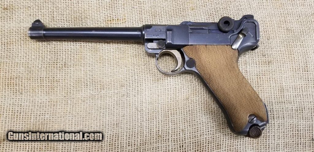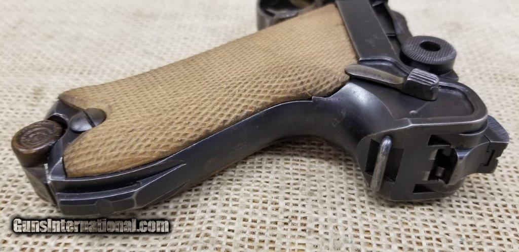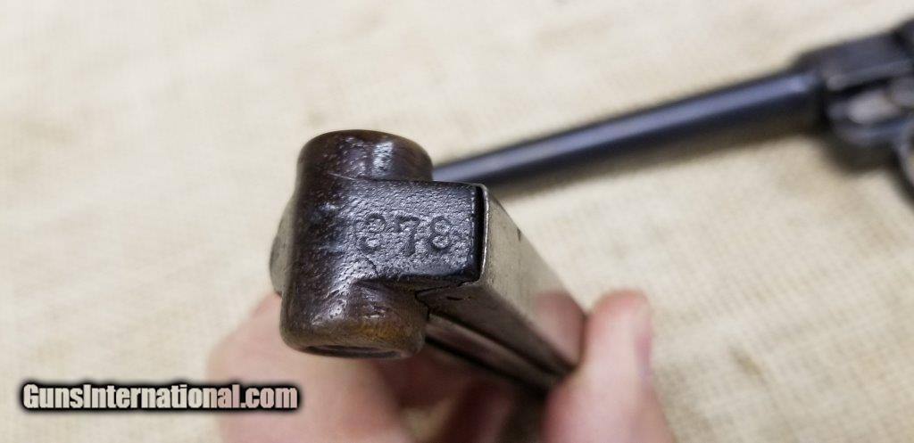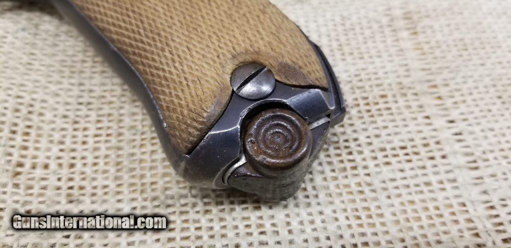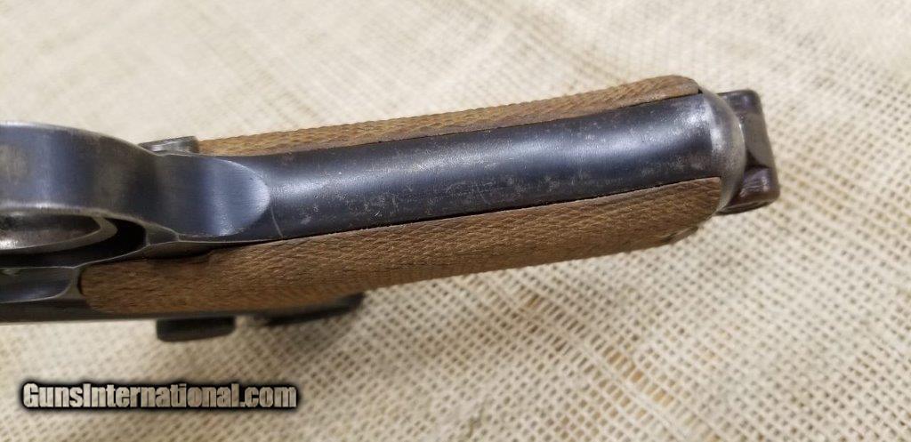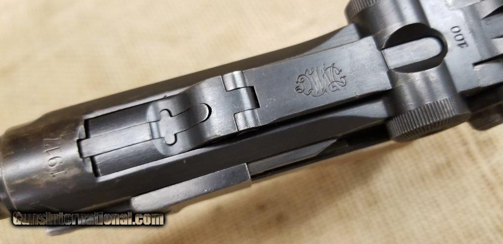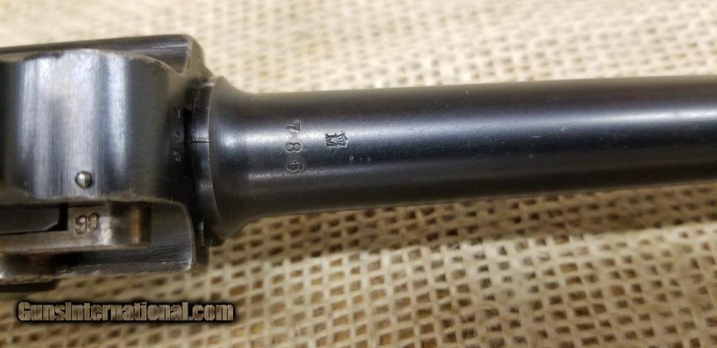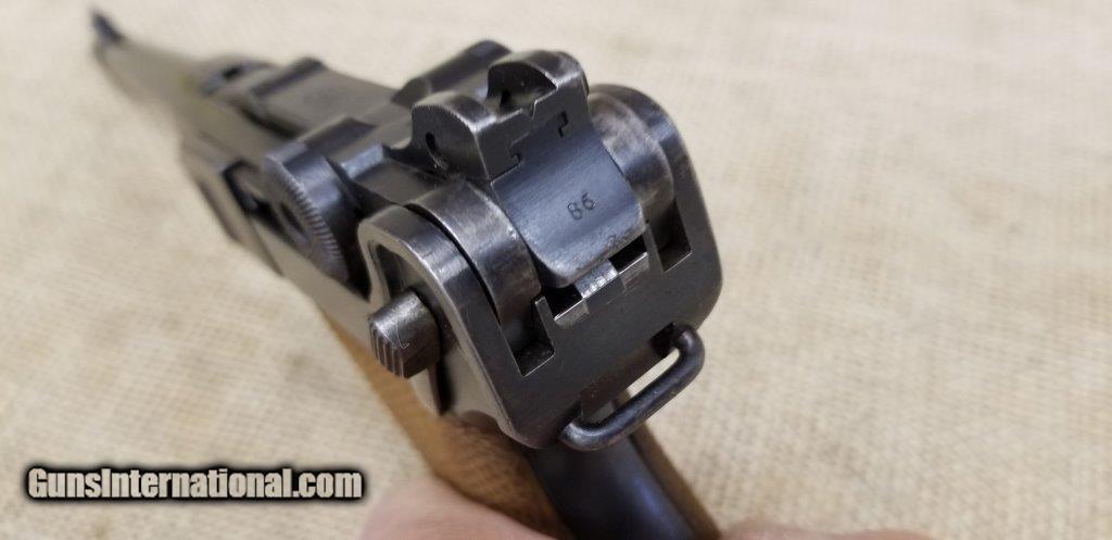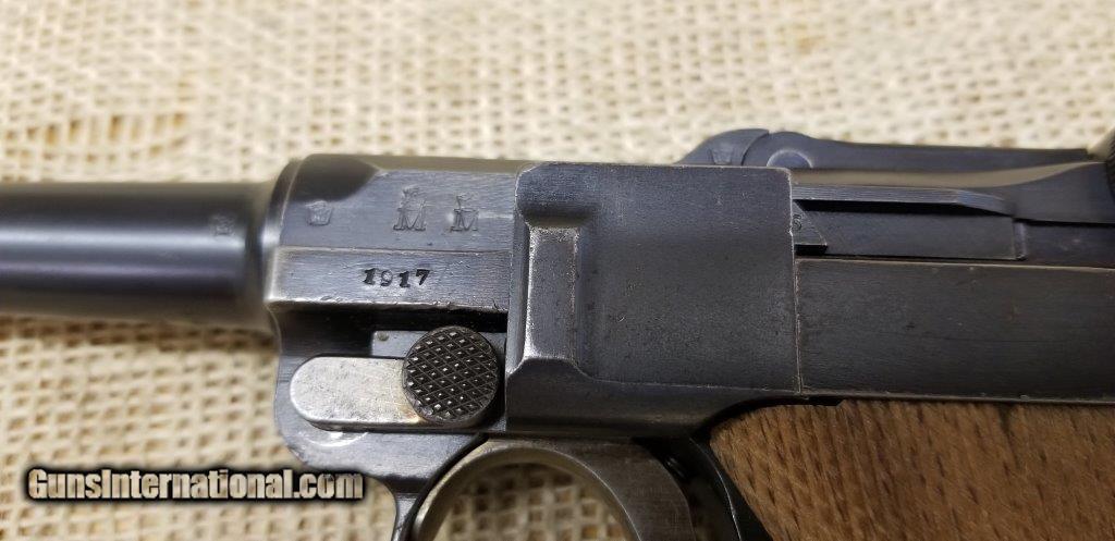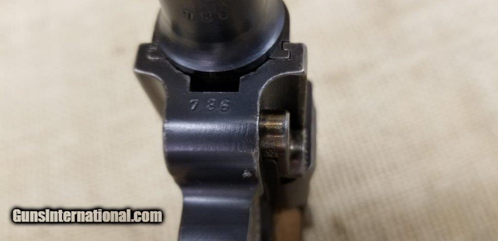 Description: 1917 DWM Navy Luger 1917 stamped over chamber and on left side of frame and on left side of front sight 786 serial number 100 meter rear sight all matching except magazine, 378 serial number 86 stamped on all parts that should be including backside of grips magazine is correct with concentric circle wood base Naval proofs on frame and barrel 6 inch barrel with good bore SOLD Curio/Relic: Yes Manufacturer: DWM Model: P08 |