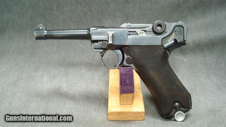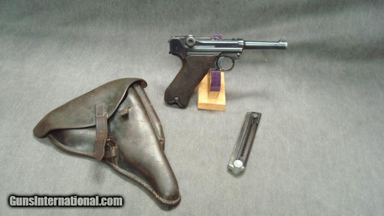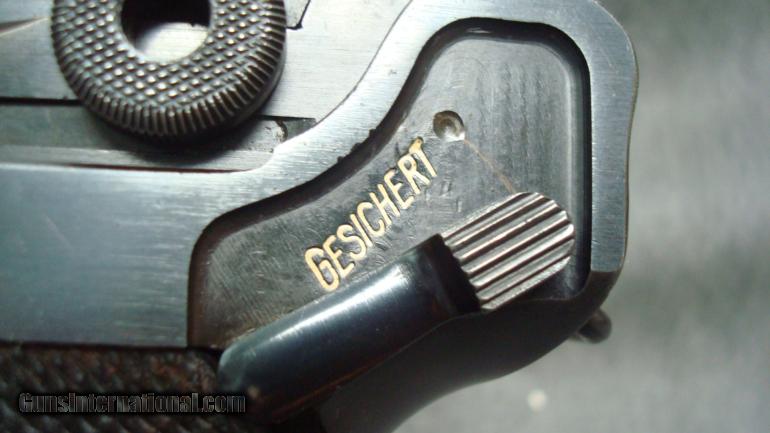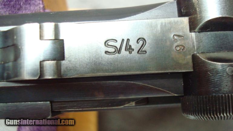 Description: Luger S/42 9mm. Serial number 9197. Built 1938. All numbers matching gun. Very nice remaining blue. Excellent bore. Only one numbers matching clip. Holster in good condition. No tool or rod. Original wood grips. Best way to contact for speedy reply is by phone 203-214-2743. Buyer is responsible for shipping and insurance. 3-day inspection period. Buyer responsible for return shipping & insurance. SOLD |