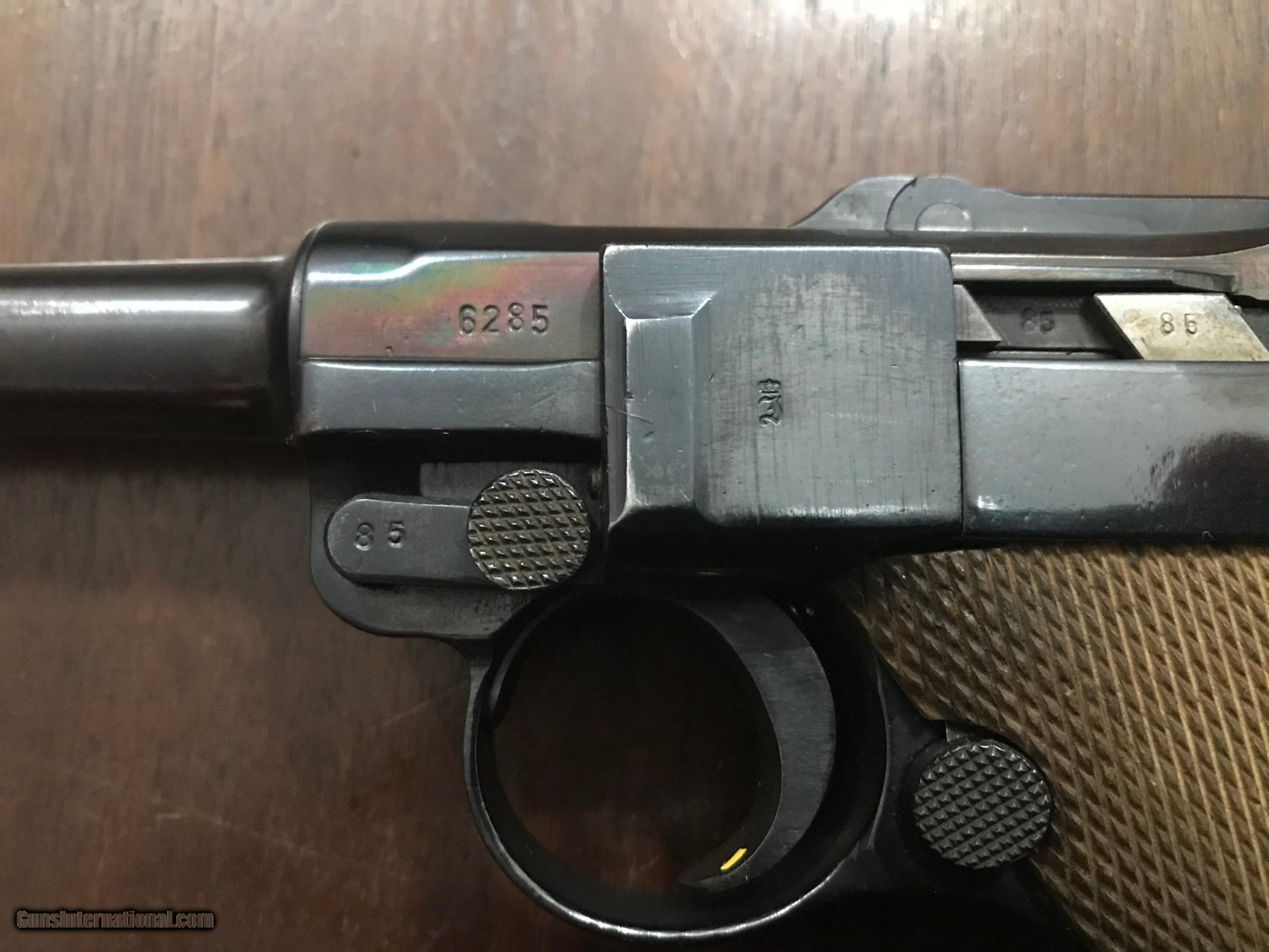 Description: Luger S/42 G date Luger Chamber Marks - Mauser "S/42" "G" Code - German Military Contract 1935 Luger Toggle Marks - Mauser Production "S/42" Code 1935-1939 Side markings - Mauser Military Proof G date and later models As you can see by the pictures, pistol is in very good condition. SOLD Curio/Relic: Yes Serial Number: 6285 |