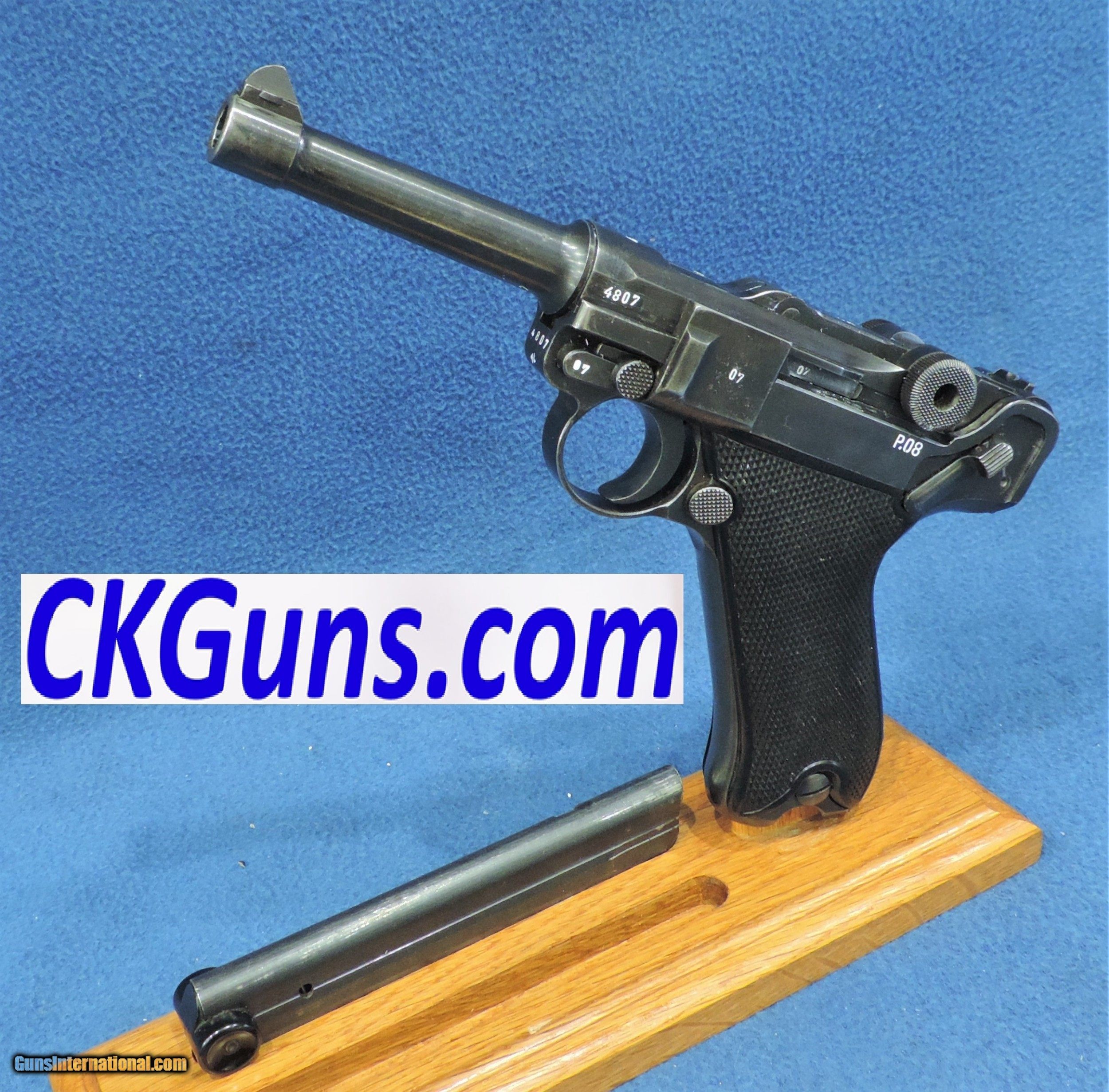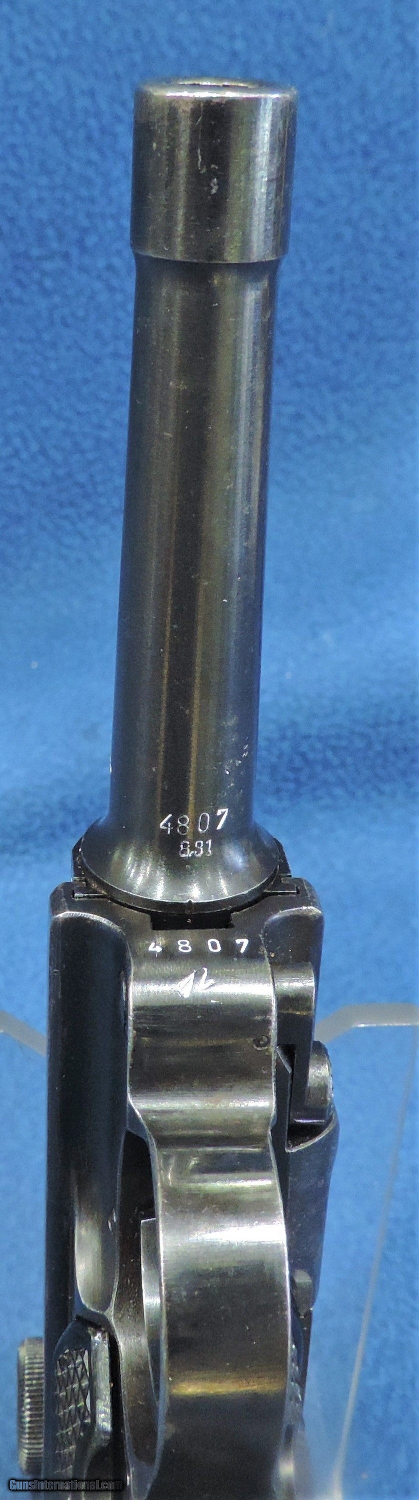 Description: Inv. 7290 Mauser (Black, Black Widow Luger) P-08, Cal. 9mm, Ser. 4897r. What a find this G.I. bring back is, fantastic condition, a real "Holster Queen." The original blue is at least 98-99%. The only loss is due primarily to sharp edge silvering and a little holster wear. The grips strap show no sign of graying. All parts match. The gun has the proper Eagle/359 and Eagle/N proofs on the slide, barrel and bolt. The scarce original "Black Widow" plastic grips are in fine condition. No chips or splits, just a few flattened points from the holster. The slide rails, feed ramp and bolt face show very little use. The bore, like the rest of the gun is pristine. Mirror bright with razor sharp rifling. Not spot of frost anywhere. It comes with one correct TDX black plastic bottomed mag. Stamped FXO /P08, Eagle/53. This beautiful "Holster Queen" ss as close to "as issued" as you can find. It is a great investment and a centerpiece for the most critical collector. It comes with our "Purchase Satisfaction Guarantee" ......$2995. To purchase this firearm or if you want to request more information contact us at: Email ckguns[at]ymail[dot]com Phone 201-512-0002 Cell 201-575-6838 FAX 201-215-4759 We accept most major credit cards. Prices shown are Discounted 3% for Cash or Check. The buyer must be familiar with all the laws governing the purchase and the ownership of firearms in their own city and state. The Yankee Armorer, Inc is not responsible for any failure to comply with or observe these laws. The Yankee Armorer, Inc will only ship after full payment and receipt of all required documents. Shipping: Add $35.00 for handguns, $45.00 for long guns. New Jersey buyers are subject to a 7% sales tax. The Yankee Armorer, Inc offers a 3 day inspection period with full refund upon return of intact firearm and in the original condition. The Yankee Armorer, Inc offers a no interest lay away program - 25% down; 25% in 30 days; 25% in 60 days; and full payment in 90 days. Any violation of this policy is subject to restocking and forfeiture of all payments. Any variation from this policy must be agreed to in advance. Unshipped Cancelled sales are subject to a 20% restocking fee. Be advised that all firearms sold by The Yankee Armorer, Inc. or the Gun Exchange, LLC (SELLER) are sold as collector’s items. They have not been fired or tested for safety and must be examined by a license gunsmith prior to use. By purchasing any item from the (SELLER), you are agreeing to hold the (SELLER) free from any damages or lawsuits of any nature. Any item left for transfer or storage will be charged to $25.00 per month, per item from the day of its receipt. Any variation from this policy must be agreed to in advance. Store hours 10:00 am to 5:00 pm Tuesday -Saturday. It's always best to call for appointment. Store 201-512-0002, cell 201-575-6838. SOLD |