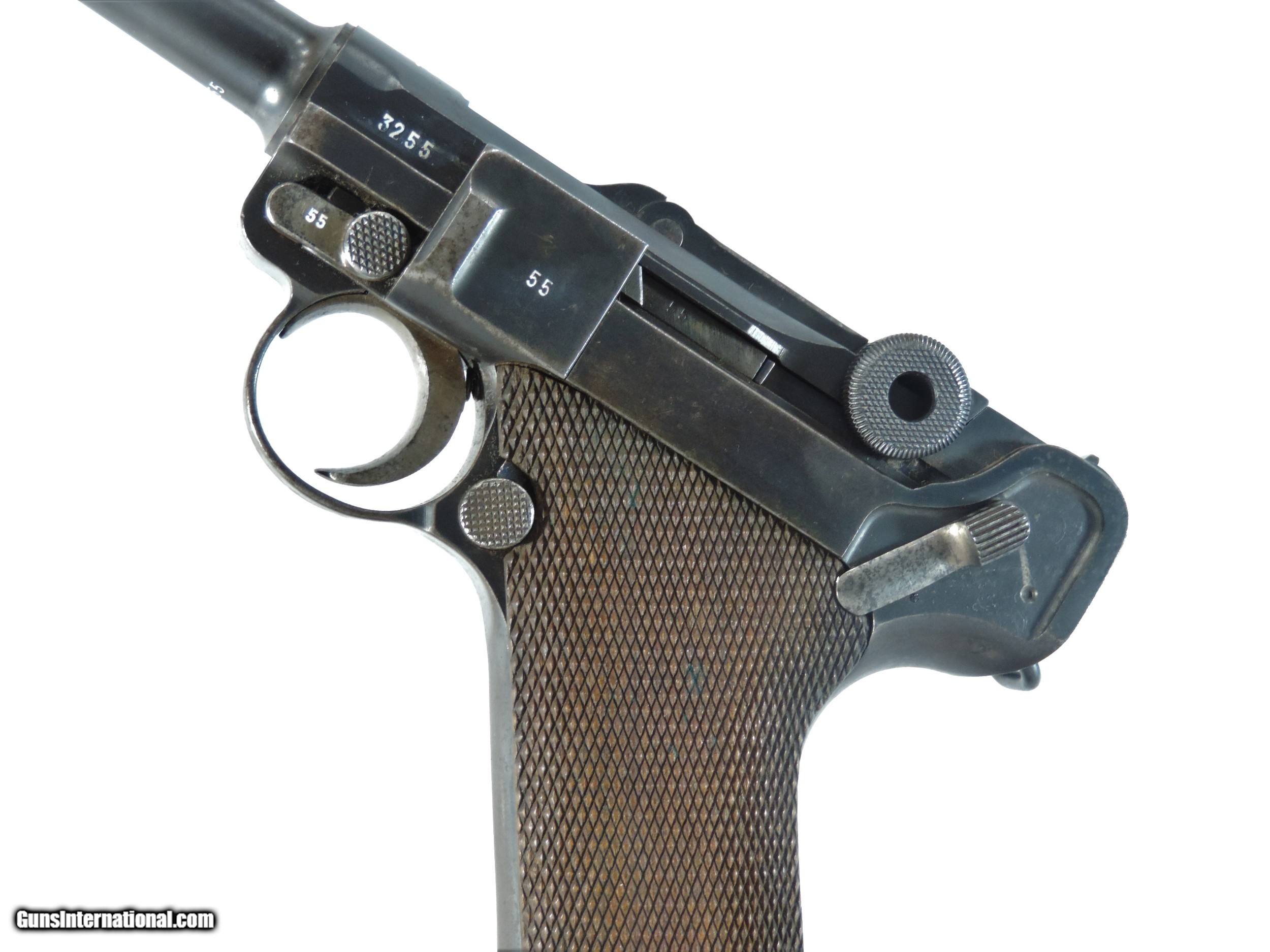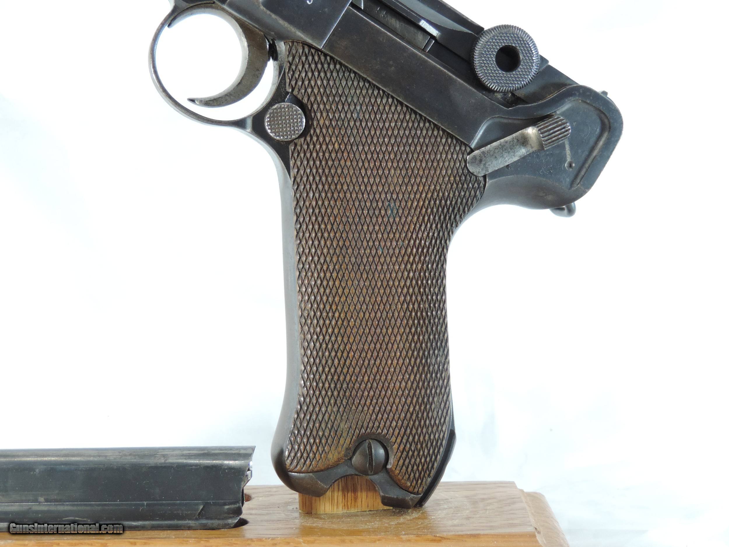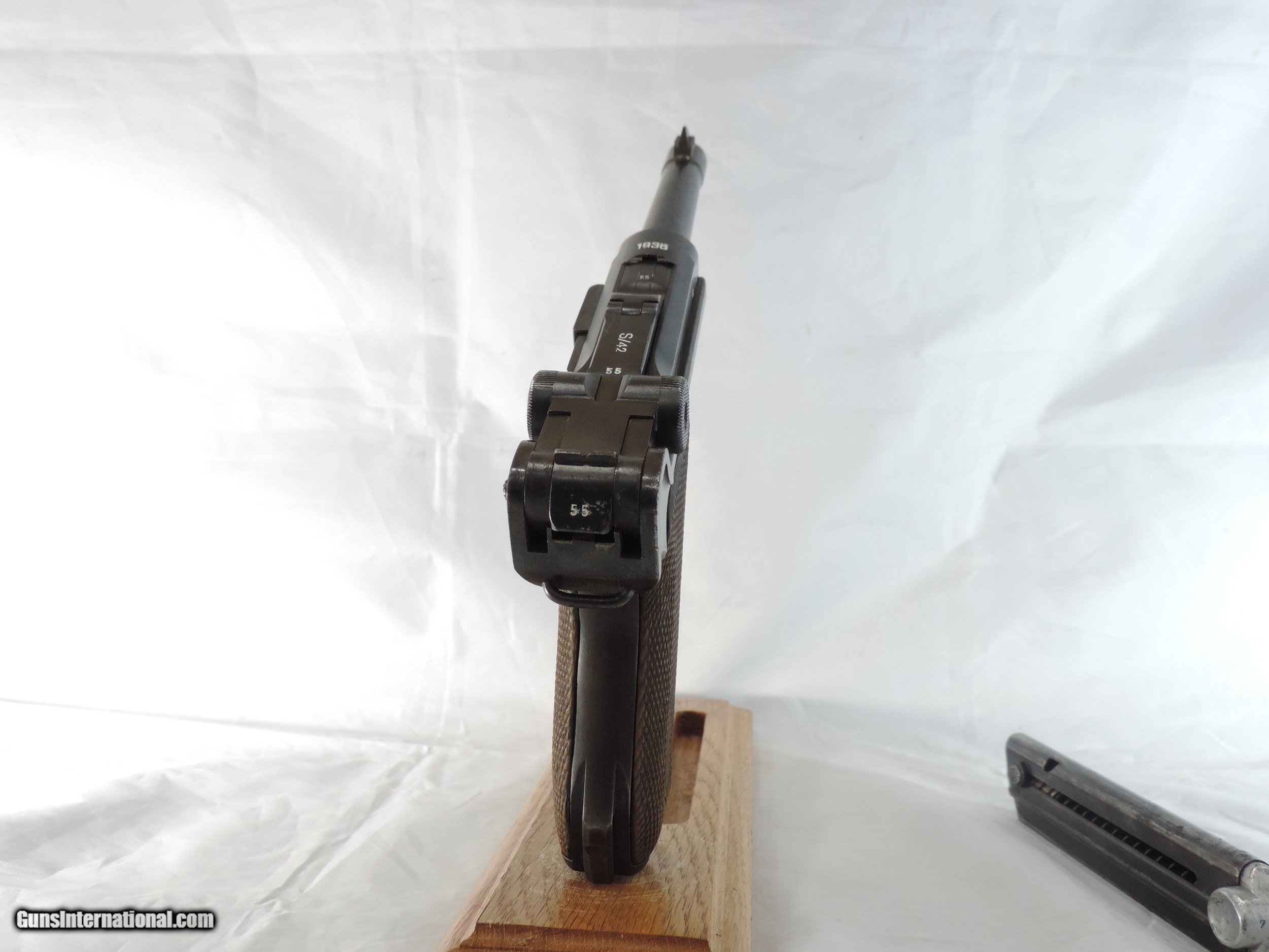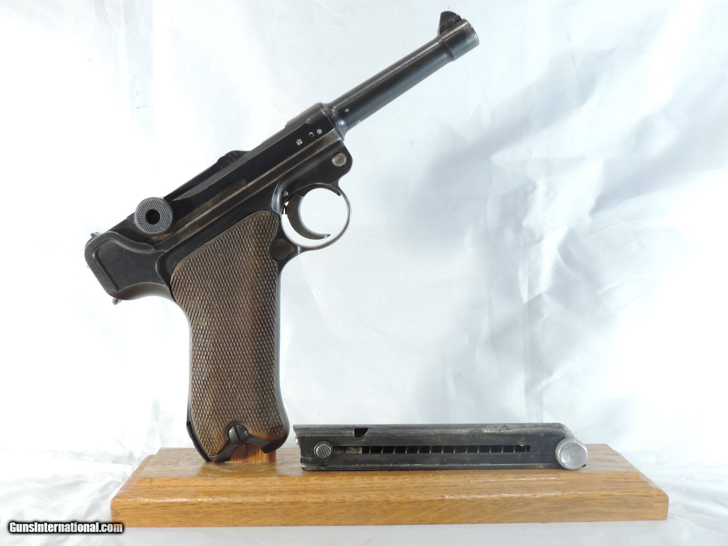 Description: INV. 7900 MAUSER (NAZI LUGER) P-08, S/42 1936, CAL. 9 MM, SER. 3255 h. THE BLUED AND THE STRAWED PARTS FINISH WOULD RATE ABOUT 90-95%. THERE IS THE USUAL SHARP EDGE SILVERING, SIDE PLATE WEAR AND SCATTERED LIGHT PIN PRICKS FROM HOLSTER STORAGE. THE GRIP STRAPS SHOW VERY LITTLE TONING. ALL PARTS HAVE THE PROPER NAZI WAFFENAMTS. THE CHECKERED GRIPS ARE PERFECT, NO SPLITS, DINGS OR FLATTENED POINTS. THE SLIDE RAILS, BOLT FACE, AND FEED RAMP SHOW LITTLE USE. THE BORE IS MIRROR BRIGHT WITH RAZOR SHARP REFILING AND A TOUCH OF LIGHT SCATTERED FROST. IT COMES WITH ONE NON MATCHING MAGAZINE. FOR THE COLLECTOR/SHOOTER THAT DOESN'T NEED A MINTY GUN HERE'S A CHANCE TO GET A REALLY FINE EXAMPLE AT A VERY MODEST PRICE. ONLY.....SHIPPED ... $2095.*** ***PURCHASE SATISFACTION GUARANTEED. To purchase this firearm or if you want to request more information contact us at: Email ckguns[at]ymail[dot]com Phone 201-512-0002 Cell 201-575-6838 FAX 201-215-4759 We accept most major credit cards. Prices shown are Discounted 3% for Cash or Check. The buyer must be familiar with all the laws governing the purchase and the ownership of firearms in their own city and state. The Yankee Armorer, Inc is not responsible for any failure to comply with or observe these laws. The Yankee Armorer, Inc will only ship after full payment and receipt of all required documents. Shipping: Add $35.00 for handguns, $45.00 for long guns. New Jersey buyers are subject to a 7% sales tax. The Yankee Armorer, Inc offers a 3 day inspection period with full refund upon return of intact firearm and in the original condition. The Yankee Armorer, Inc offers a no interest lay away program - 25% down; 25% in 30 days; 25% in 60 days; and full payment in 90 days. Any violation of this policy is subject to restocking and forfeiture of all payments. Any variation from this policy must be agreed to in advance. Unshipped Cancelled sales are subject to a 20% restocking fee. Be advised that all firearms sold by The Yankee Armorer, Inc. or the Gun Exchange, LLC (SELLER) are sold as collector’s items. They have not been fired or tested for safety and must be examined by a license gunsmith prior to use. By purchasing any item from the (SELLER), you are agreeing to hold the (SELLER) free from any damages or lawsuits of any nature. Any item left for transfer or storage will be charged to $25.00 per month, per item from the day of its receipt. Any variation from this policy must be agreed to in advance. Store hours 10:00 am to 5:00 pm Tuesday -Saturday. It's always best to call for appointment. Store 201-512-0002, cell 201-575-6838. SOLD Handgun Caliber: 9x19mm Parabellum (9mm Luger, 9x19mm NATO) |