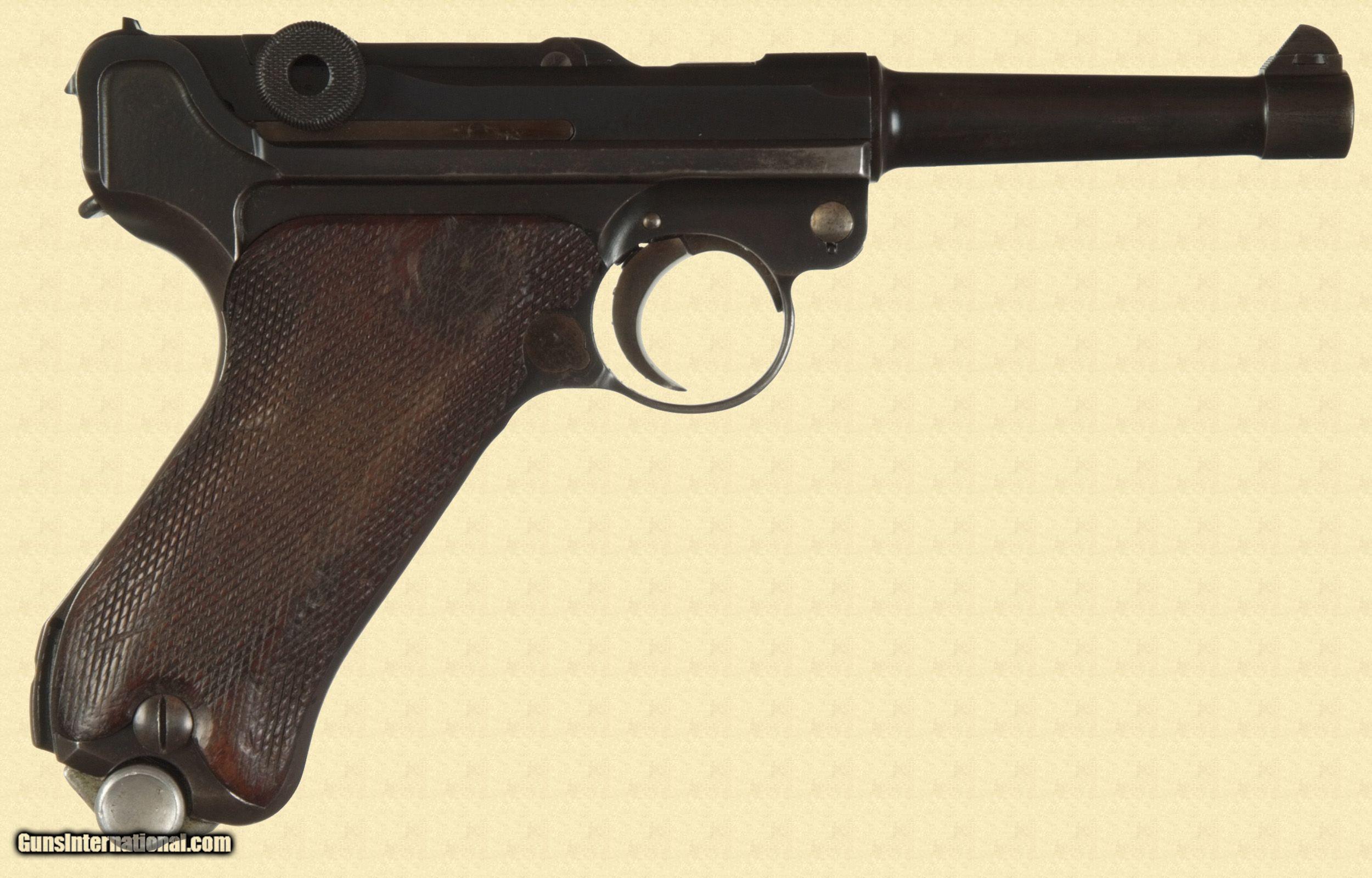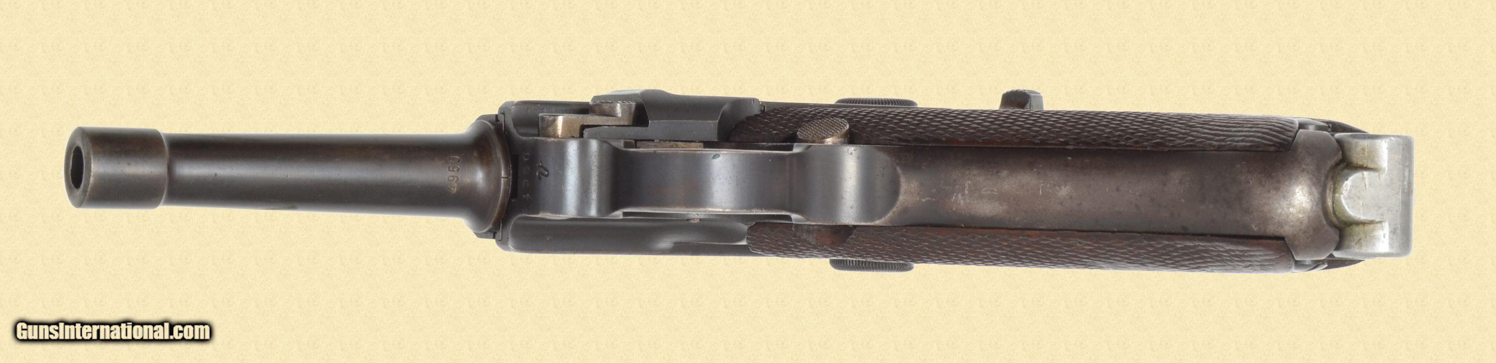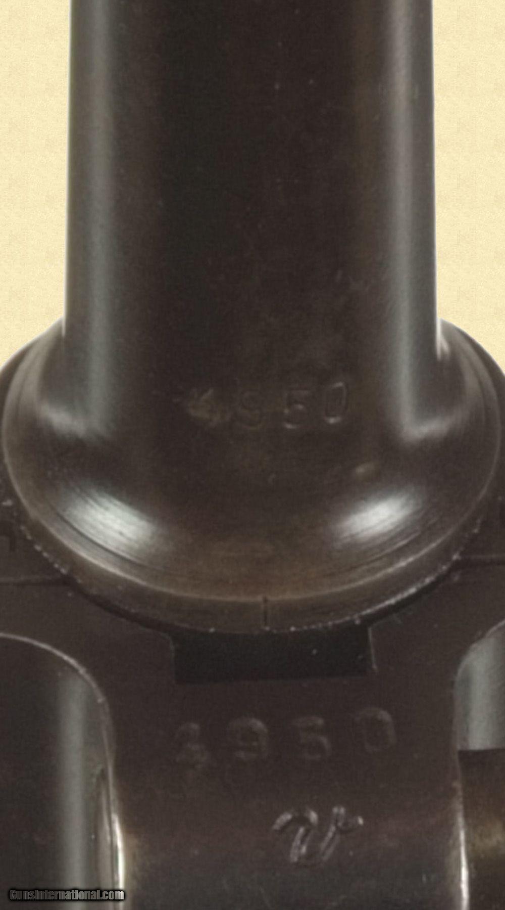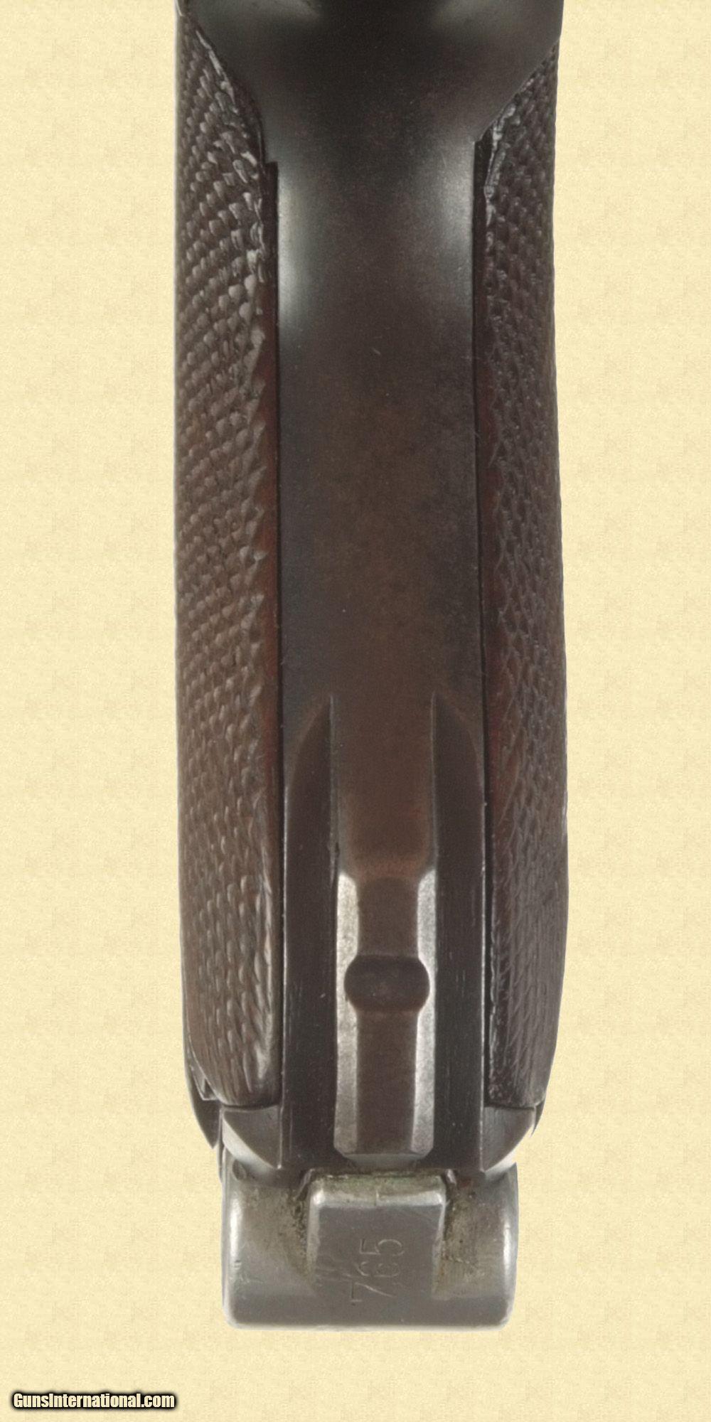 Description: 30 LUGER; 85% blue, 75% straw, excellent bore, good grips, 4'' barrel, Palestinian contract v suffix small banner. Original blue finish, strawed small parts and matching number checkered walnut grips. Matching except the proper un-numbered magazine marked on the tail of the base 7,65. The top of the toggle has the small Mauser banner logo and the top of the chamber is stamped with the date 1937. Crown/U proofs appear on the left side of the receiver and breechbolt and front of the front sight base. The metal finish shows wear and handling as do the grips, the right panel showing the most wear with an area of compression to the checkering at the top. Mechanically fine with a bright sharp bore. C&R/FFL Please call (309)342-5800 Tues-Fri, 10 am -6pm (CST), or Sat 1pm-6pm (CST), to speak with our sales team for further information, or to purchase firearms. FEDERAL FIREARMS LICENSE (FFL): is required on all shipments of modern guns. We must wait for a copy from your dealer before we can ship to them. We will also ship C&R eligible firearms to Curio and Relic (C&R) license holders. We accept your signed, legible FFL and C&R licenses via fax at 309/ 342-5730 (always on), email at FFLsimpsonltd or through the mail at Simpson Ltd; 140 S Seminary St; Galesburg, IL 61401. Pre-1898 firearms and non-firearms items are exempt from licensing requirements. All items shipped to an Illinois address will be charged 8.75% sales tax. NOTE: Because of recent shipping restrictions and charges placed on us by UPS and FedEx (handguns must ship via next day or 2nd day air and they have added a $10 surcharge for parcels over 48”. Our return policy lasts a maximum of 3 days from the time you receive your item. If 3 days have passed since you received your purchase, and we have not been contacted by you, unfortunately, we can’t offer you a refund or exchange. If you are not happy with your purchase, please contact us by phone and/or email to arrange for a return. Items must be shipped back to us to arrive with 7 days of notification of return. SOLD Curio/Relic: Yes Serial Number: 4950v |
