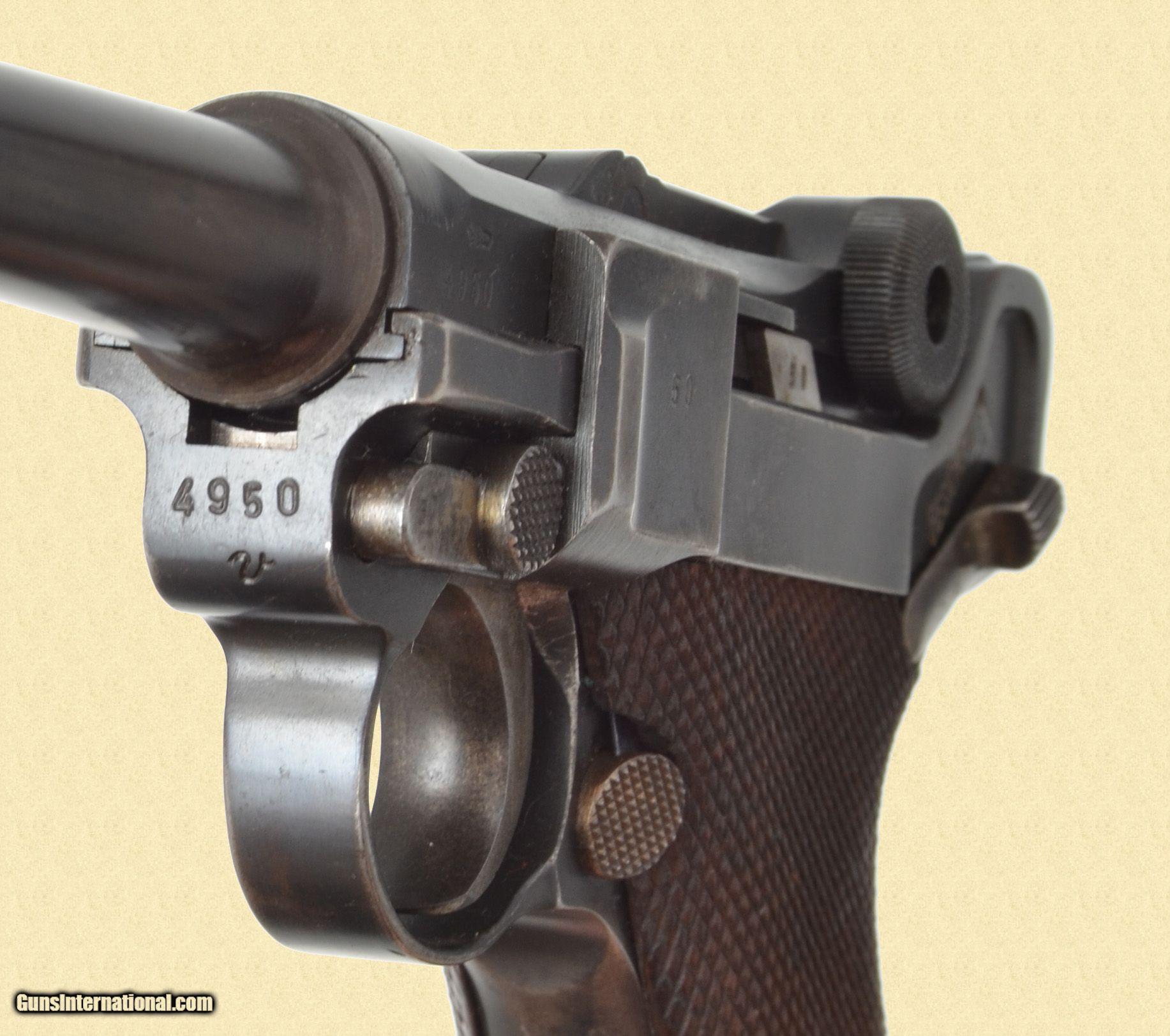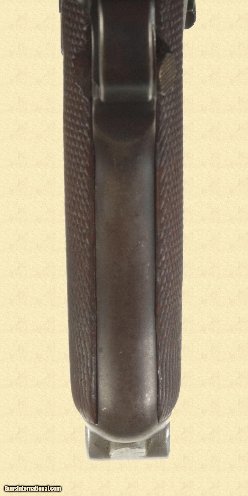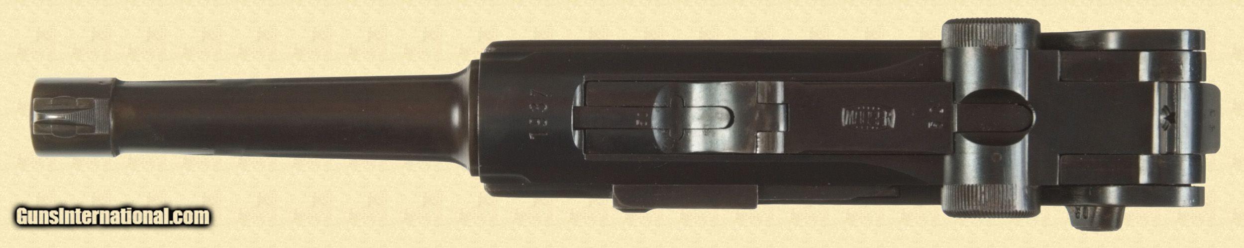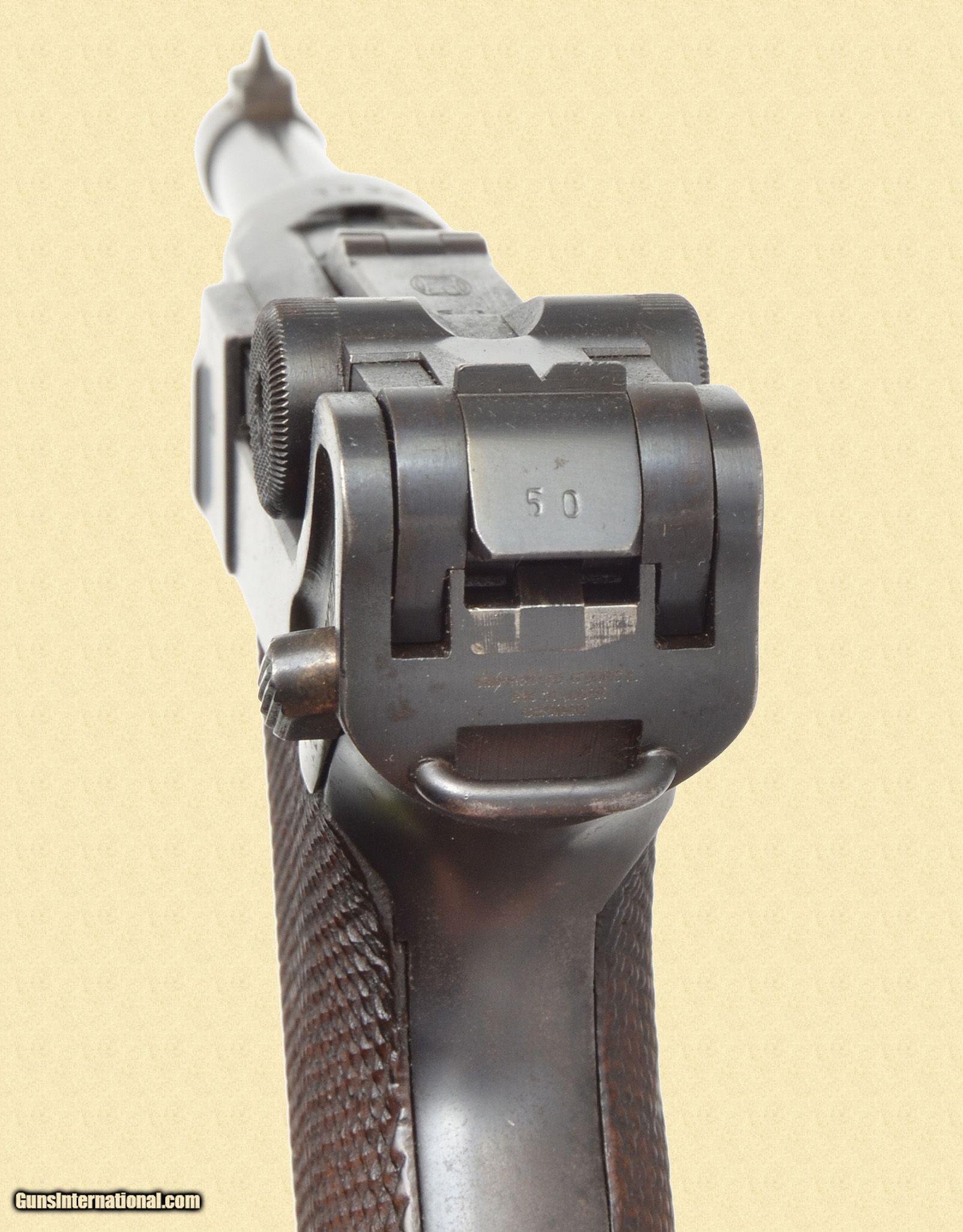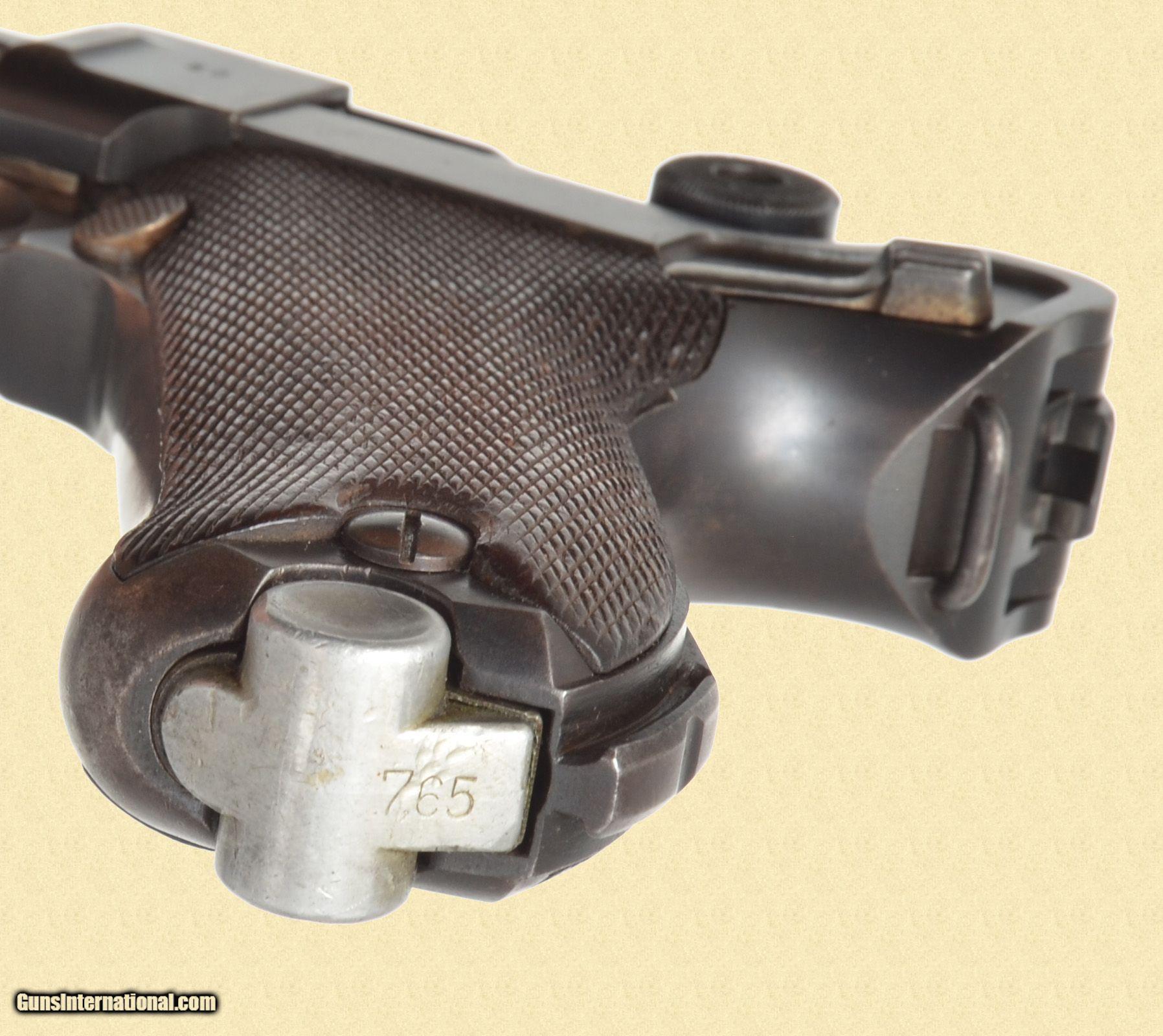Description: 30 LUGER; 85% blue, 75% straw, excellent bore, good grips, 4'' barrel, Palestinian contract v suffix small banner. Original blue finish, strawed small parts and matching number checkered walnut grips. Matching except the proper un-numbered magazine marked on the tail of the base 7,65. The top of the toggle has the small Mauser banner logo and the top of the chamber is stamped with the date 1937. Crown/U proofs appear on the left side of the receiver and breechbolt and front of the front sight base. The metal finish shows wear and handling as do the grips, the right panel showing the most wear with an area of compression to the checkering at the top. Mechanically fine with a bright sharp bore. C&R/FFL Please call (309)342-5800 Tues-Fri, 10 am -6pm (CST), or Sat 1pm-6pm (CST), to speak with our sales team for further information, or to purchase firearms. FEDERAL FIREARMS LICENSE (FFL): is required on all shipments of modern guns. We must wait for a copy from your dealer before we can ship to them. We will also ship C&R eligible firearms to Curio and Relic (C&R) license holders. We accept your signed, legible FFL and C&R licenses via fax at 309/ 342-5730 (always on), email at FFLsimpsonltd or through the mail at Simpson Ltd; 140 S Seminary St; Galesburg, IL 61401. Pre-1898 firearms and non-firearms items are exempt from licensing requirements. All items shipped to an Illinois address will be charged 8.75% sales tax. NOTE: Because of recent shipping restrictions and charges placed on us by UPS and FedEx (handguns must ship via next day or 2nd day air and they have added a $10 surcharge for parcels over 48”. Our return policy lasts a maximum of 3 days from the time you receive your item. If 3 days have passed since you received your purchase, and we have not been contacted by you, unfortunately, we can’t offer you a refund or exchange. If you are not happy with your purchase, please contact us by phone and/or email to arrange for a return. Items must be shipped back to us to arrive with 7 days of notification of return. SOLD Curio/Relic: Yes Serial Number: 4950v |