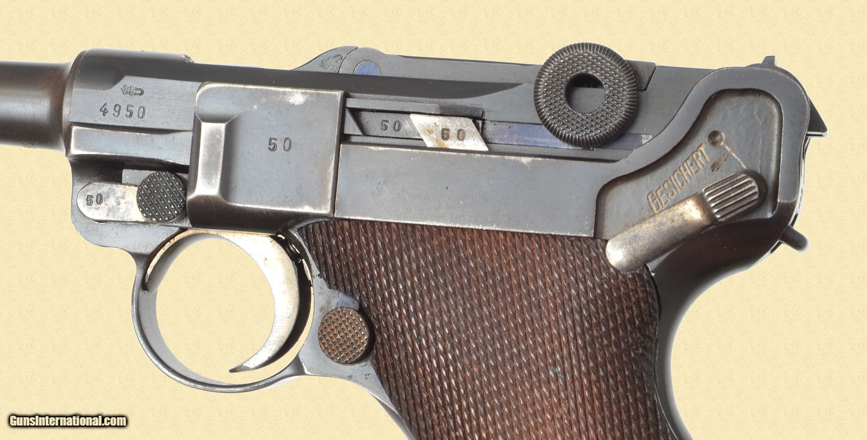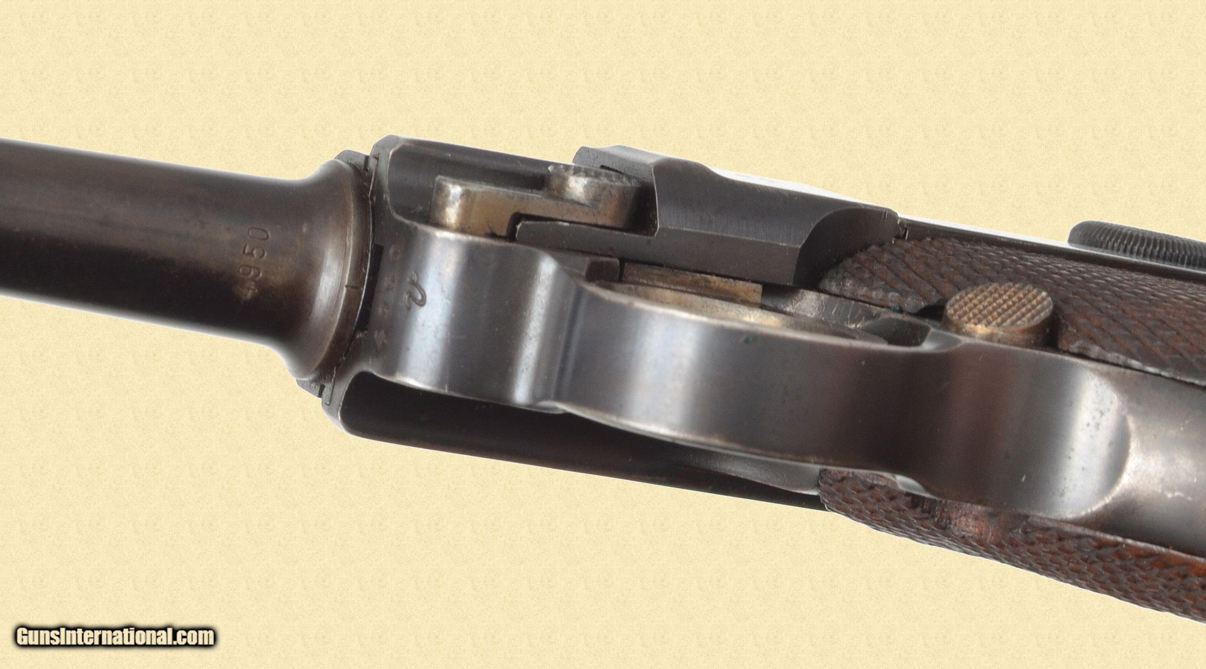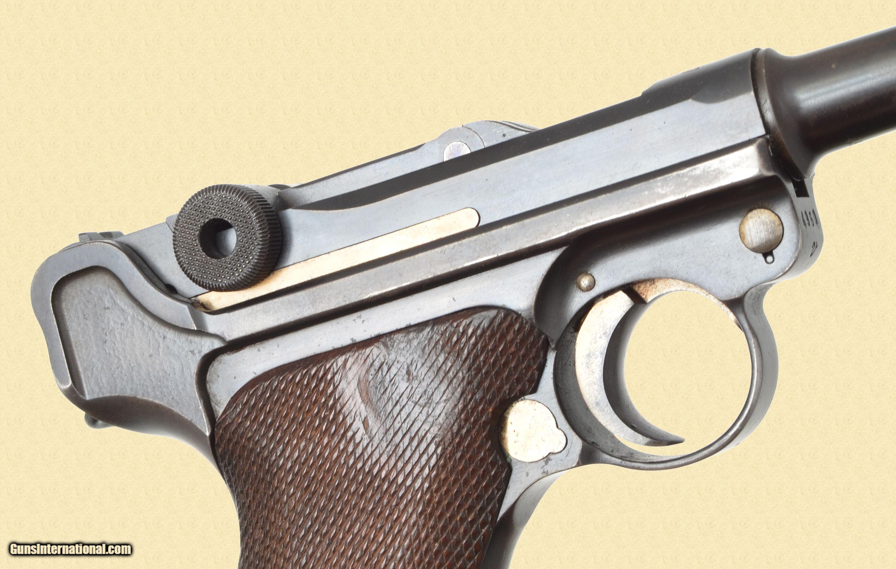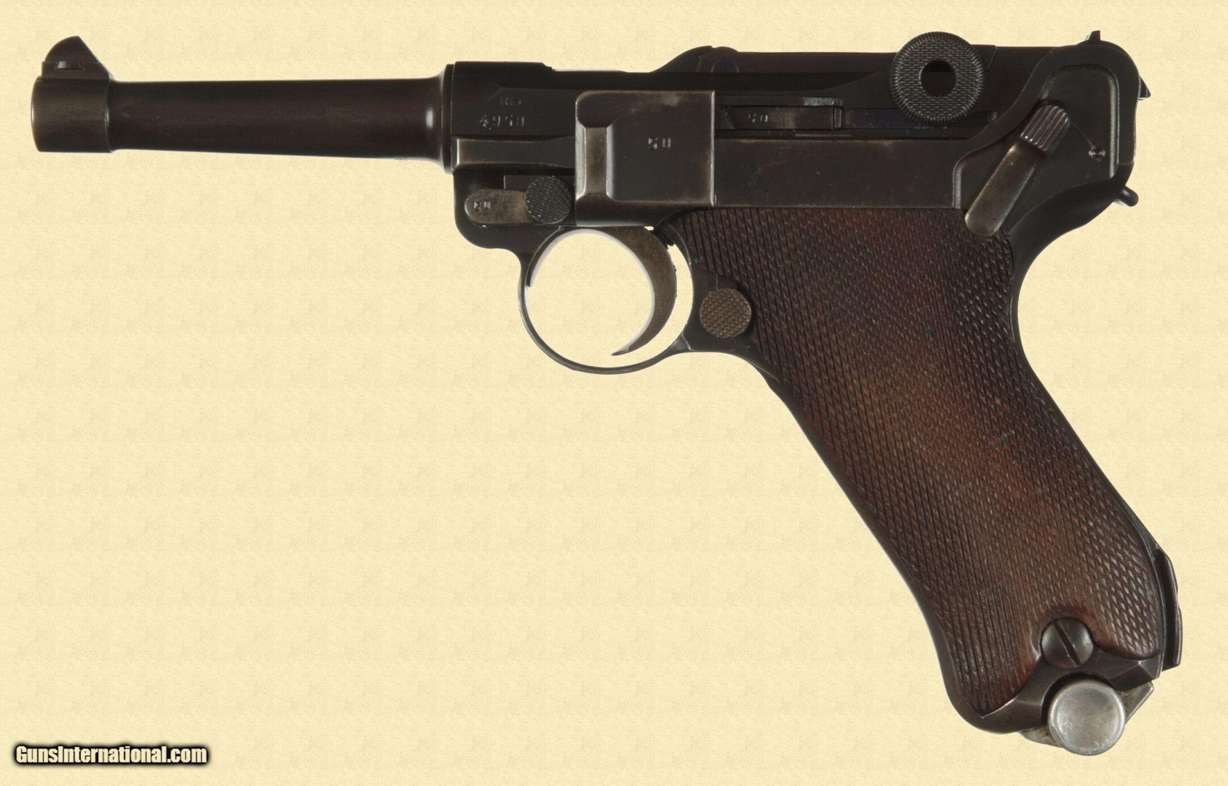 Description: 30 LUGER; 85% blue, 75% straw, excellent bore, good grips, 4'' barrel, Palestinian contract v suffix small banner. Original blue finish, strawed small parts and matching number checkered walnut grips. Matching except the proper un-numbered magazine marked on the tail of the base 7,65. The top of the toggle has the small Mauser banner logo and the top of the chamber is stamped with the date 1937. Crown/U proofs appear on the left side of the receiver and breechbolt and front of the front sight base. The metal finish shows wear and handling as do the grips, the right panel showing the most wear with an area of compression to the checkering at the top. Mechanically fine with a bright sharp bore. C&R/FFL Please call (309)342-5800 Tues-Fri, 10 am -6pm (CST), or Sat 1pm-6pm (CST), to speak with our sales team for further information, or to purchase firearms. FEDERAL FIREARMS LICENSE (FFL): is required on all shipments of modern guns. We must wait for a copy from your dealer before we can ship to them. We will also ship C&R eligible firearms to Curio and Relic (C&R) license holders. We accept your signed, legible FFL and C&R licenses via fax at 309/ 342-5730 (always on), email at FFLsimpsonltd or through the mail at Simpson Ltd; 140 S Seminary St; Galesburg, IL 61401. Pre-1898 firearms and non-firearms items are exempt from licensing requirements. All items shipped to an Illinois address will be charged 8.75% sales tax. NOTE: Because of recent shipping restrictions and charges placed on us by UPS and FedEx (handguns must ship via next day or 2nd day air and they have added a $10 surcharge for parcels over 48”. Our return policy lasts a maximum of 3 days from the time you receive your item. If 3 days have passed since you received your purchase, and we have not been contacted by you, unfortunately, we can’t offer you a refund or exchange. If you are not happy with your purchase, please contact us by phone and/or email to arrange for a return. Items must be shipped back to us to arrive with 7 days of notification of return. SOLD Curio/Relic: Yes Serial Number: 4950v |