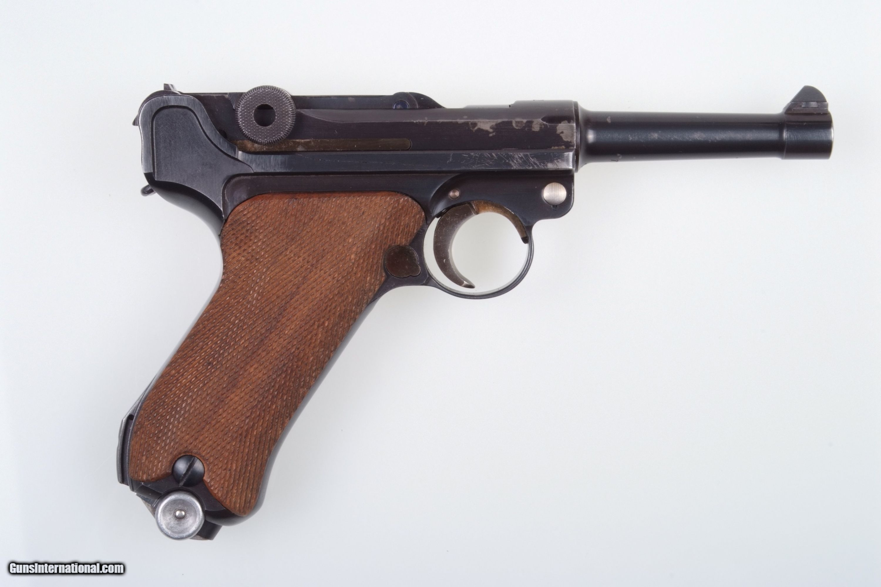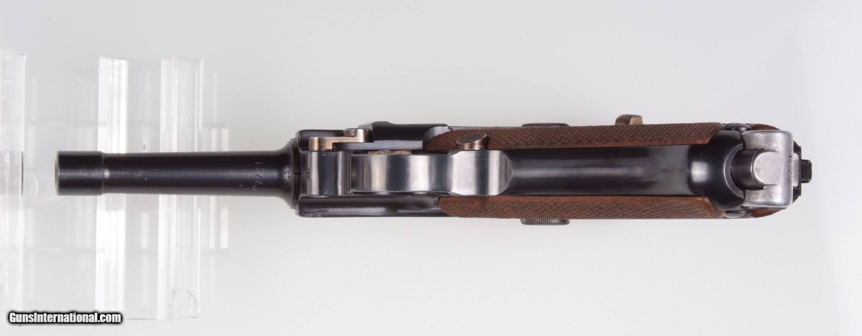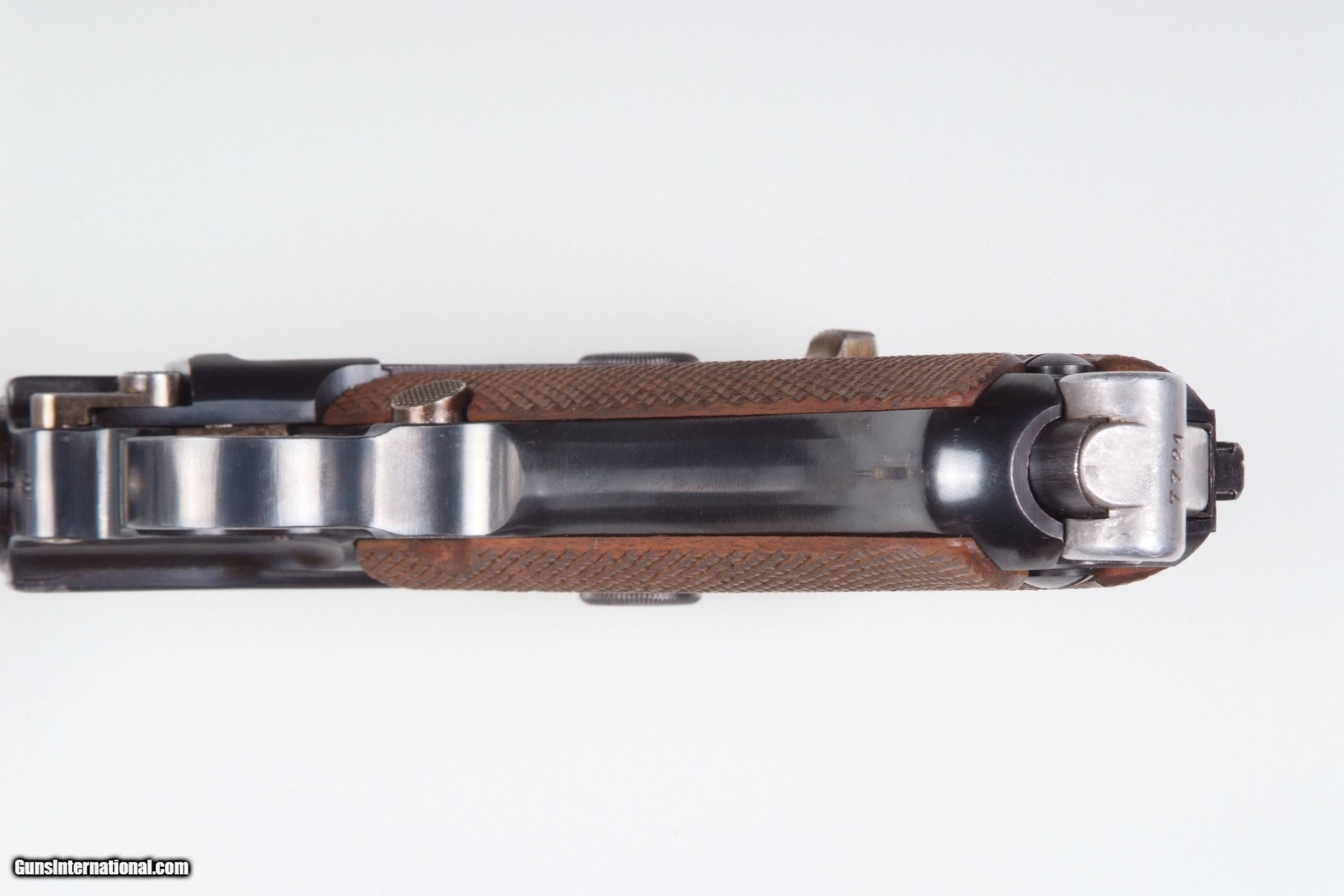 Description: Standard late production Swedish contract Luger with 3 7/8” barrel having a drift adjustable front sight and fixed rear sight. Full serial number appears under barrel, on left receiver and on forward frame where it is accompanied by the “w” suffix. As typical for the Swedish pistols, major parts are salt blued with the small parts remaining strawed. Disassembly shows all matching serial numbers including the rear toggle pin. Walnut checkered grips are unnumbered. Complete with unique unmarked maroon holster and two factory matching magazines. Synopsis: Swedish Contract Commerical Mauser Banner with “42” chamber date, Swedish holster and two matching magazines. Condition: Approximately 97% bright original salt blue with most of the spotted finish localized to the right side of the receiver and rail with some fine scratches on the barrel. The balance of the pistol including the grip straps is nearly 99% with strawed small parts reflecting that same condition. Sharply checkered grips show minimal handling. Mirror bore. Perfect manual mechanics. Same high condition magazines and holster. An extraordinary and rare rig whose left side presents beautifully and could no doubt be enhanced by judicious touchup. A HISTORIC INVESTMENT! ~~Insured shipping fee of $75; most packages shipped using FedEx 2nd Day.~~ SOLD Manufacturer: Mauser Serial Number: 7721w Caliber Info: 7.65 Luger |