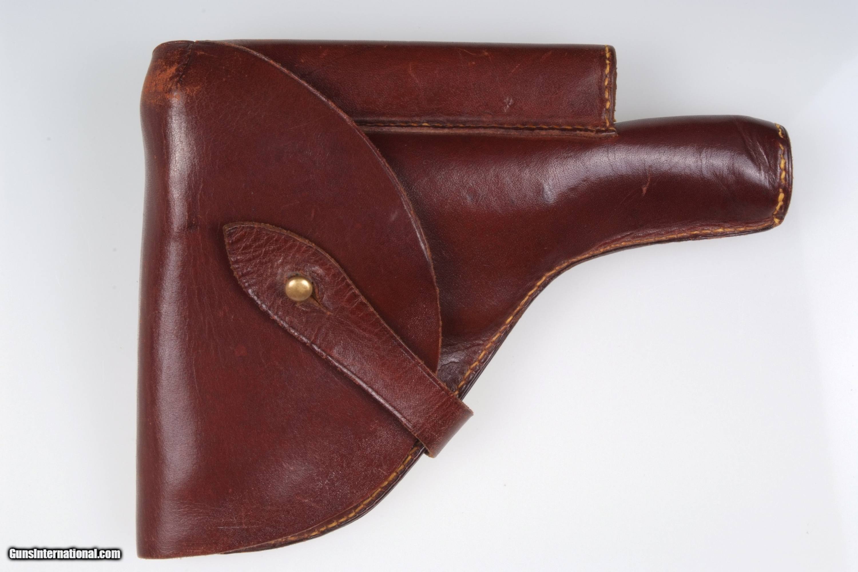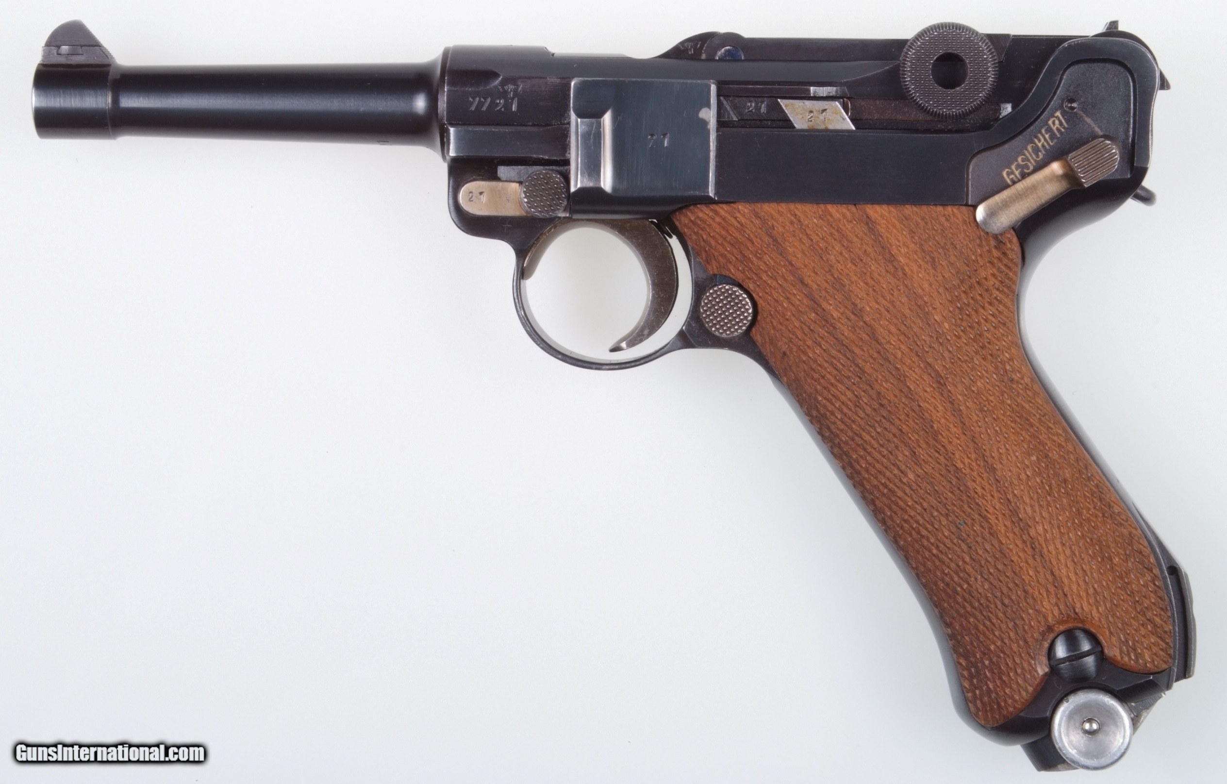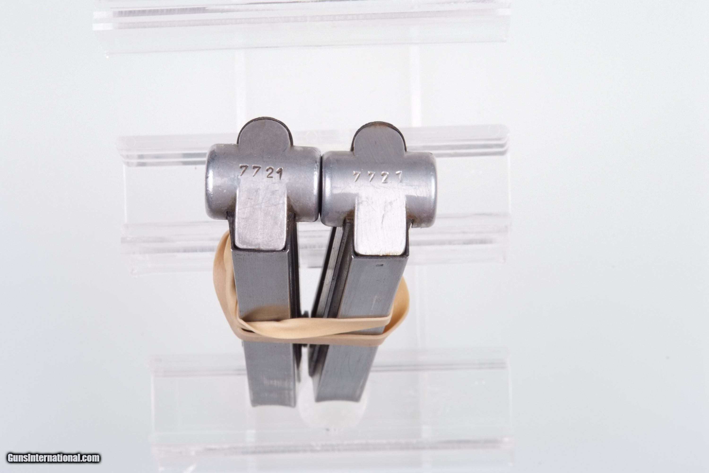 Description: Standard late production Swedish contract Luger with 3 7/8” barrel having a drift adjustable front sight and fixed rear sight. Full serial number appears under barrel, on left receiver and on forward frame where it is accompanied by the “w” suffix. As typical for the Swedish pistols, major parts are salt blued with the small parts remaining strawed. Disassembly shows all matching serial numbers including the rear toggle pin. Walnut checkered grips are unnumbered. Complete with unique unmarked maroon holster and two factory matching magazines. Synopsis: Swedish Contract Commerical Mauser Banner with “42” chamber date, Swedish holster and two matching magazines. Condition: Approximately 97% bright original salt blue with most of the spotted finish localized to the right side of the receiver and rail with some fine scratches on the barrel. The balance of the pistol including the grip straps is nearly 99% with strawed small parts reflecting that same condition. Sharply checkered grips show minimal handling. Mirror bore. Perfect manual mechanics. Same high condition magazines and holster. An extraordinary and rare rig whose left side presents beautifully and could no doubt be enhanced by judicious touchup. A HISTORIC INVESTMENT! ~~Insured shipping fee of $75; most packages shipped using FedEx 2nd Day.~~ SOLD Manufacturer: Mauser Serial Number: 7721w Caliber Info: 7.65 Luger |