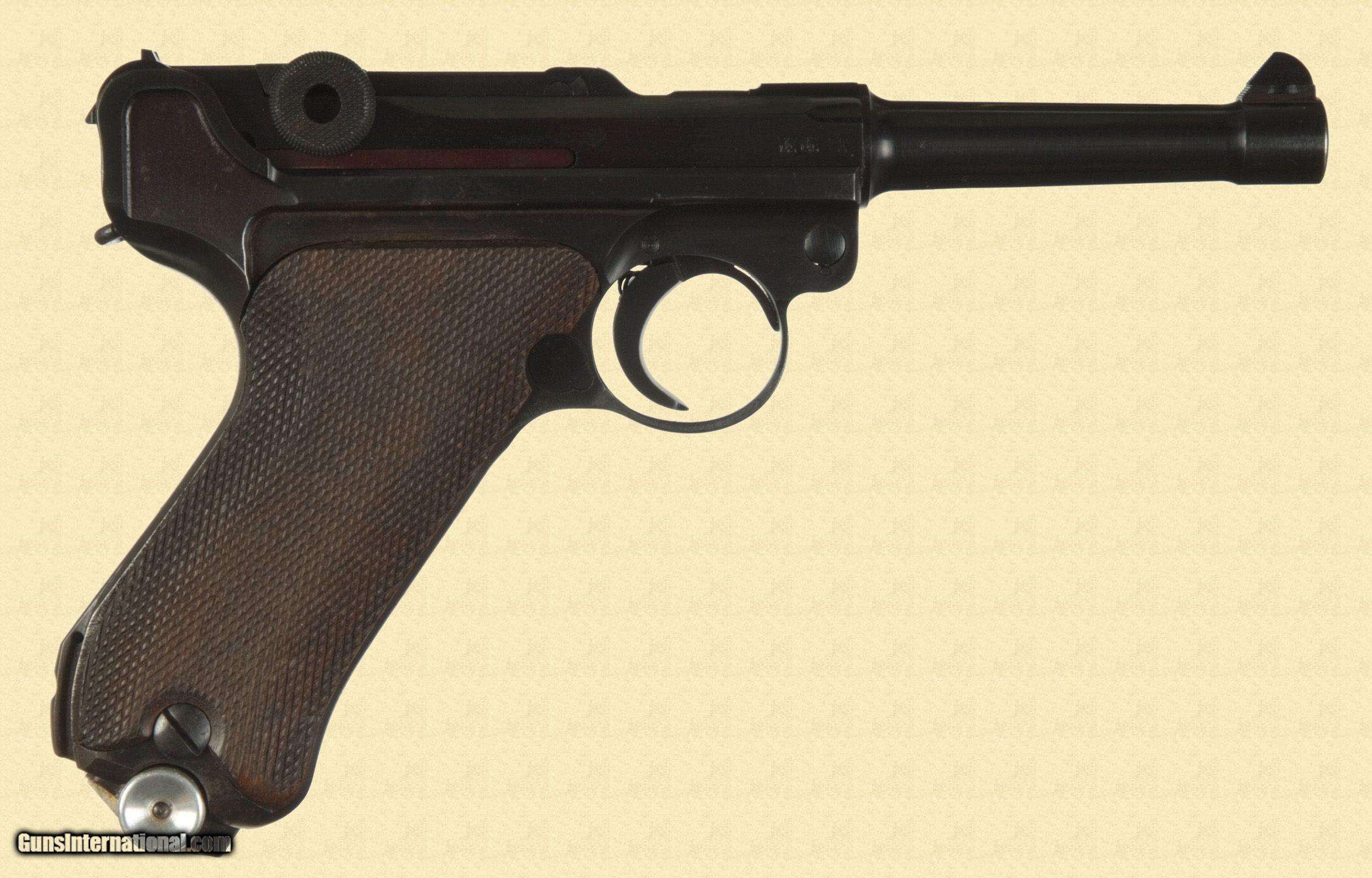 Description: 9 mm; 97% blue, excellent bore, very good grips, 4'' barrel, Matching except un-numbered fxo aluminum bottom magazine. Sideplate has a spot of finish at top edge. Very minor holster wear on expected areas. Right side of frame has some finish loss and minor pitting above grip panel. Grip straps have some minor surface rusting. Rig, includes the proper holster with takedown tool, extra un-numbered magazine, cleaning rod and rare leather lanyard. FEDERAL FIREARMS LICENSE (FFL): is required on all shipments of modern guns. We must wait for a copy from your dealer before we can ship to them. We will also ship C&R eligible firearms to Curio and Relic (C&R) license holders. We accept your signed, legible FFL and C&R licenses via fax at 309/ 342-5730 (always on), email at FFLsimpsonltd or through the mail at Simpson Ltd; 140 S Seminary St; Galesburg, IL 61401. Pre-1898 firearms and non-firearms items are exempt from licensing requirements. All items shipped to an Illinois address will be charged 8.75% sales tax. NOTE: Because of recent shipping restrictions and charges placed on us by UPS and FedEx (handguns must ship via next day or 2nd day air and they have added a $10 surcharge for parcels over 48”. Our return policy lasts a maximum of 3 days from the time you receive your item. If 3 days have passed since you received your purchase, and we have not been contacted by you, unfortunately, we can’t offer you a refund or exchange. If you are not happy with your purchase, please contact us by phone and/or email to arrange for a return. Items must be shipped back to us to arrive with 7 days of notification of return. SOLD Curio/Relic: Yes Serial Number: 4383m |