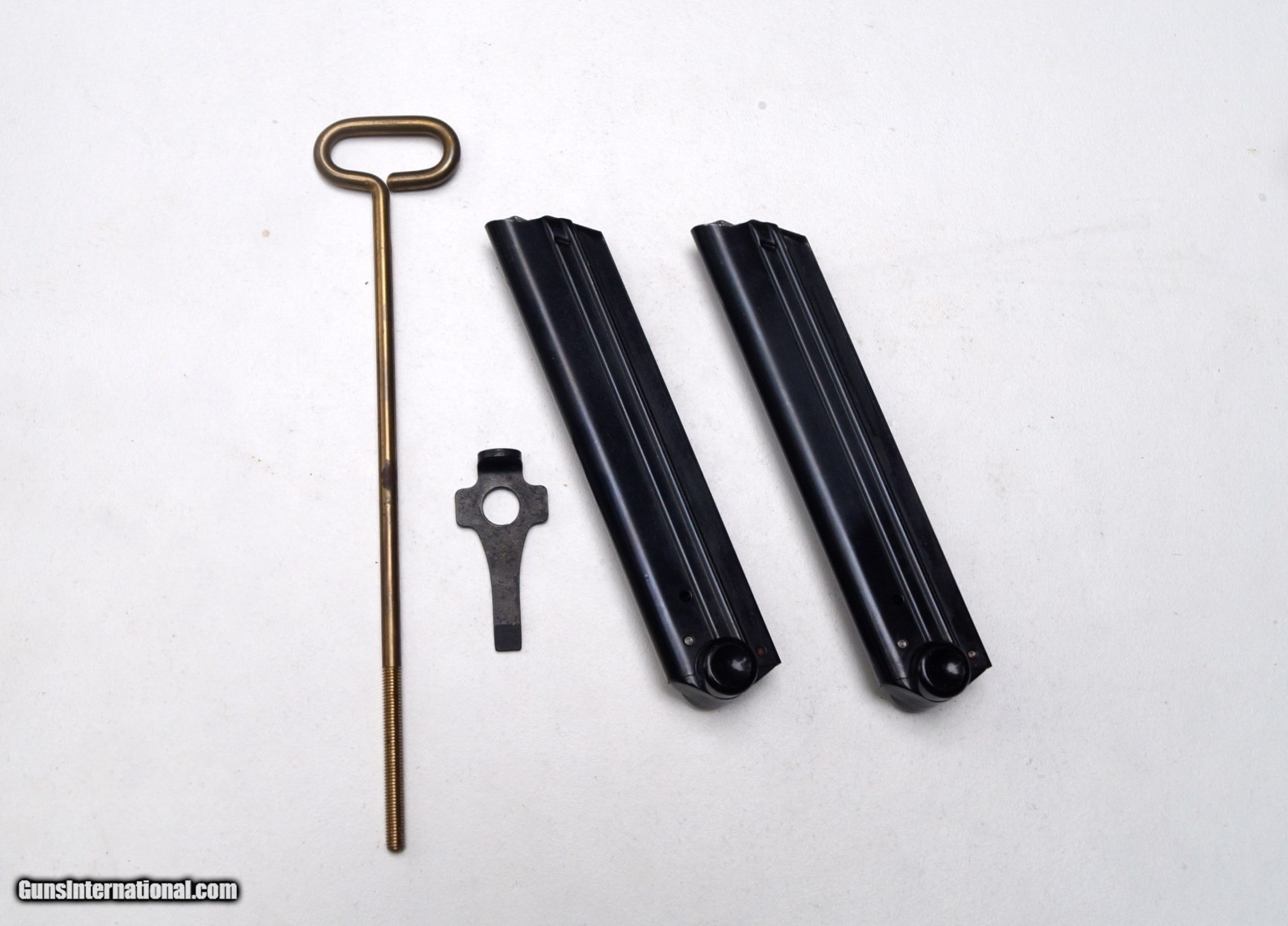 Description: THIS IS A MAUSER INTERARMS AMERICAN EAGLE LUGER WITH A 6" BARREL, 9MM. THE LUGER IS NEW IN THE BOX , NEVER SHOT. ALL ORIGINAL, NUMBER MATCHING, MECHANICALLY CORRECT (THE GUN WILL SHOOT). THE LUGER COMES IN ITS ORIGINAL BOX, 2 MAGAZINES, 1 LOADING TOOL AND A CLEANING ROD. THEY DON'T COME BETTER THAN THIS. SOLD |
