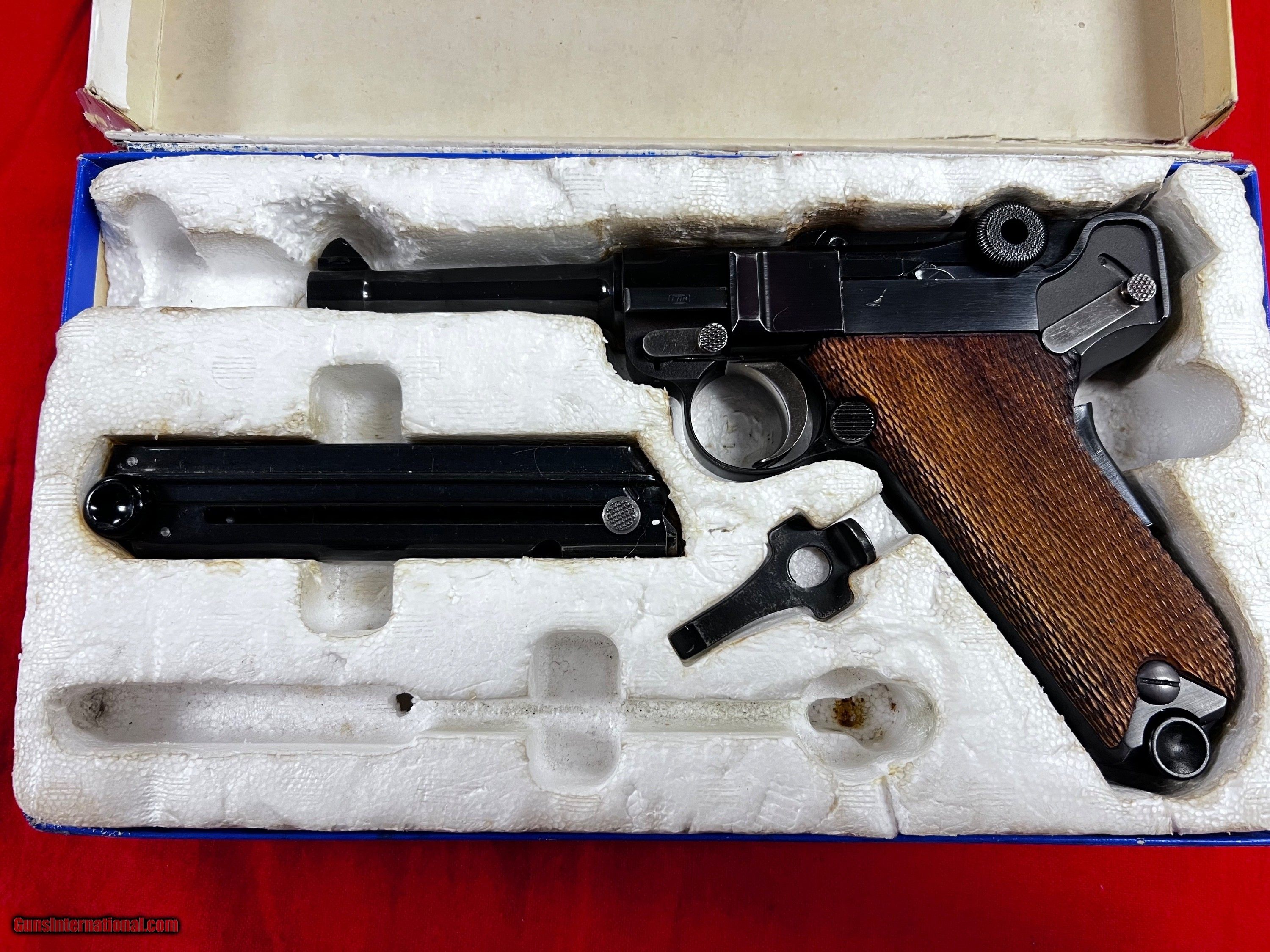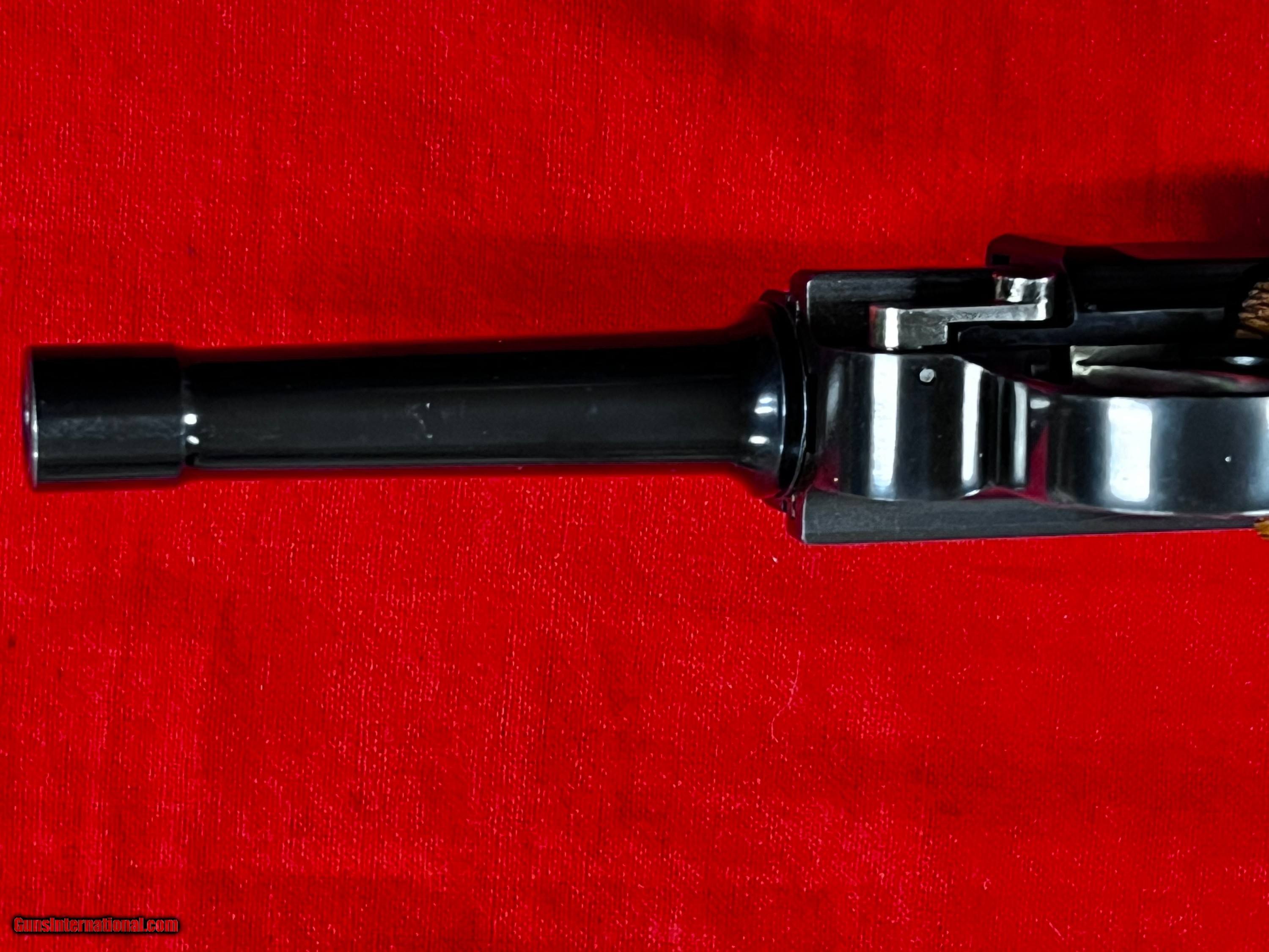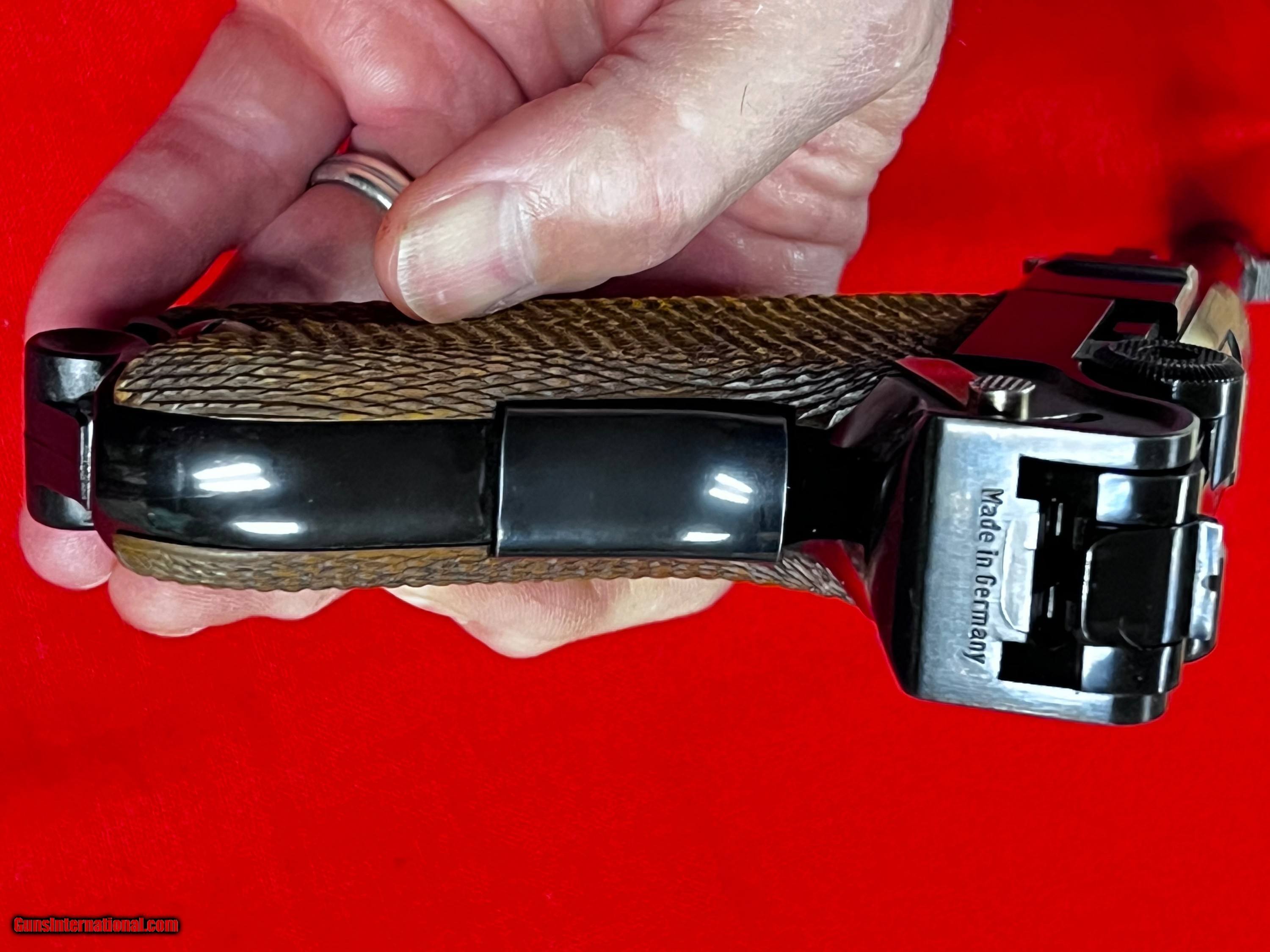Excellent in factory box with two mags, loading tool, manual and test target Swiss pattern four inch 9mm