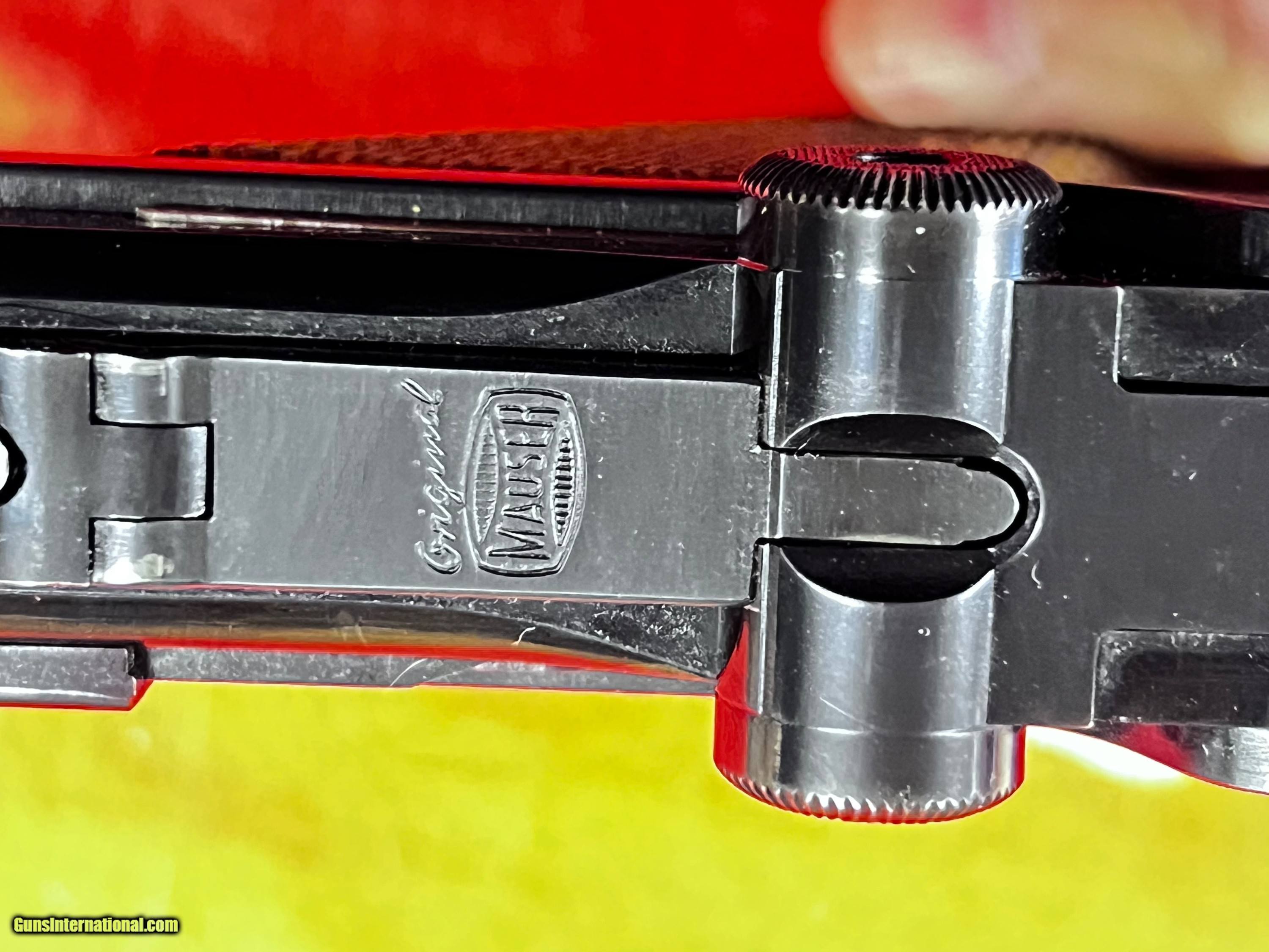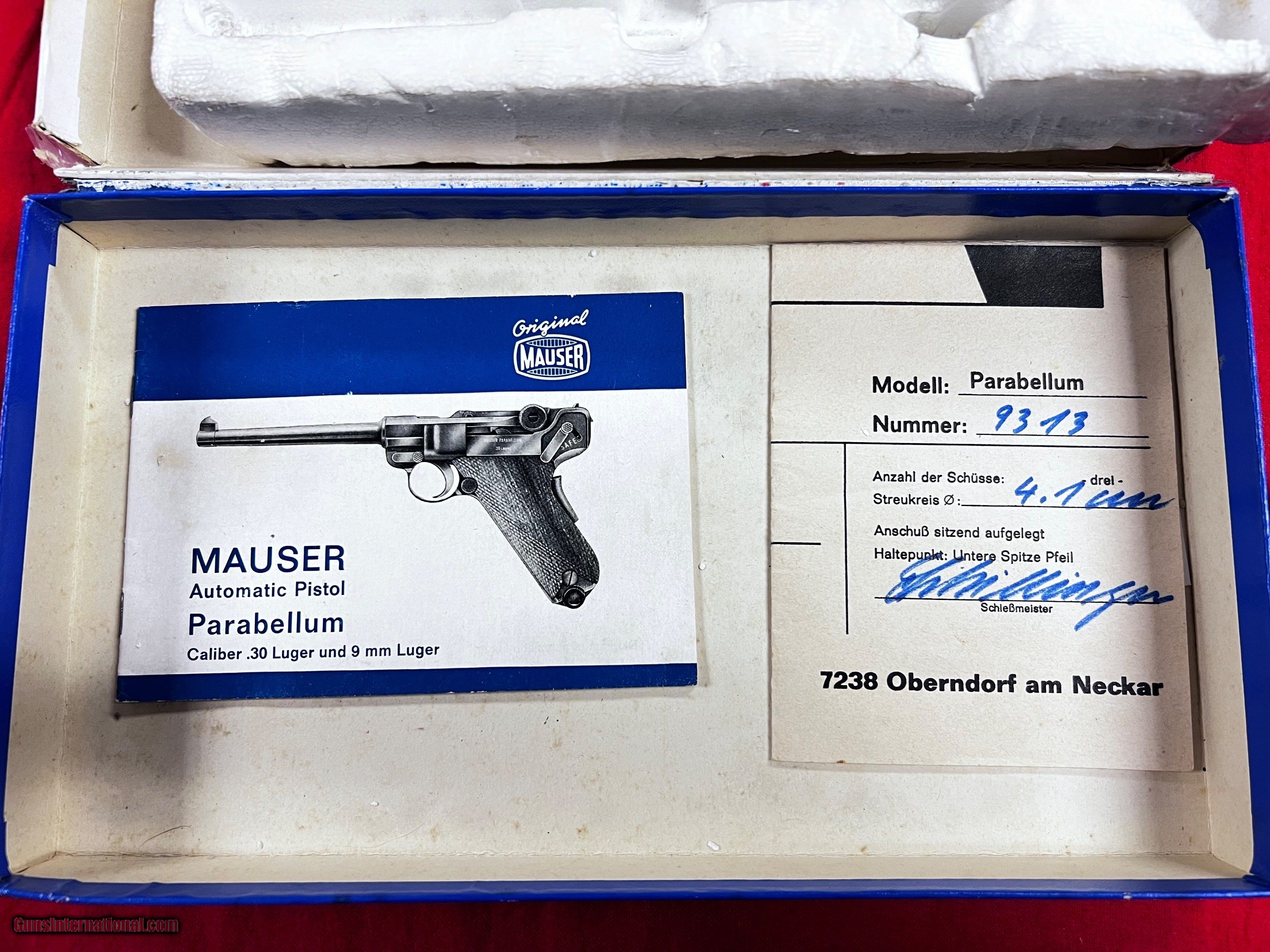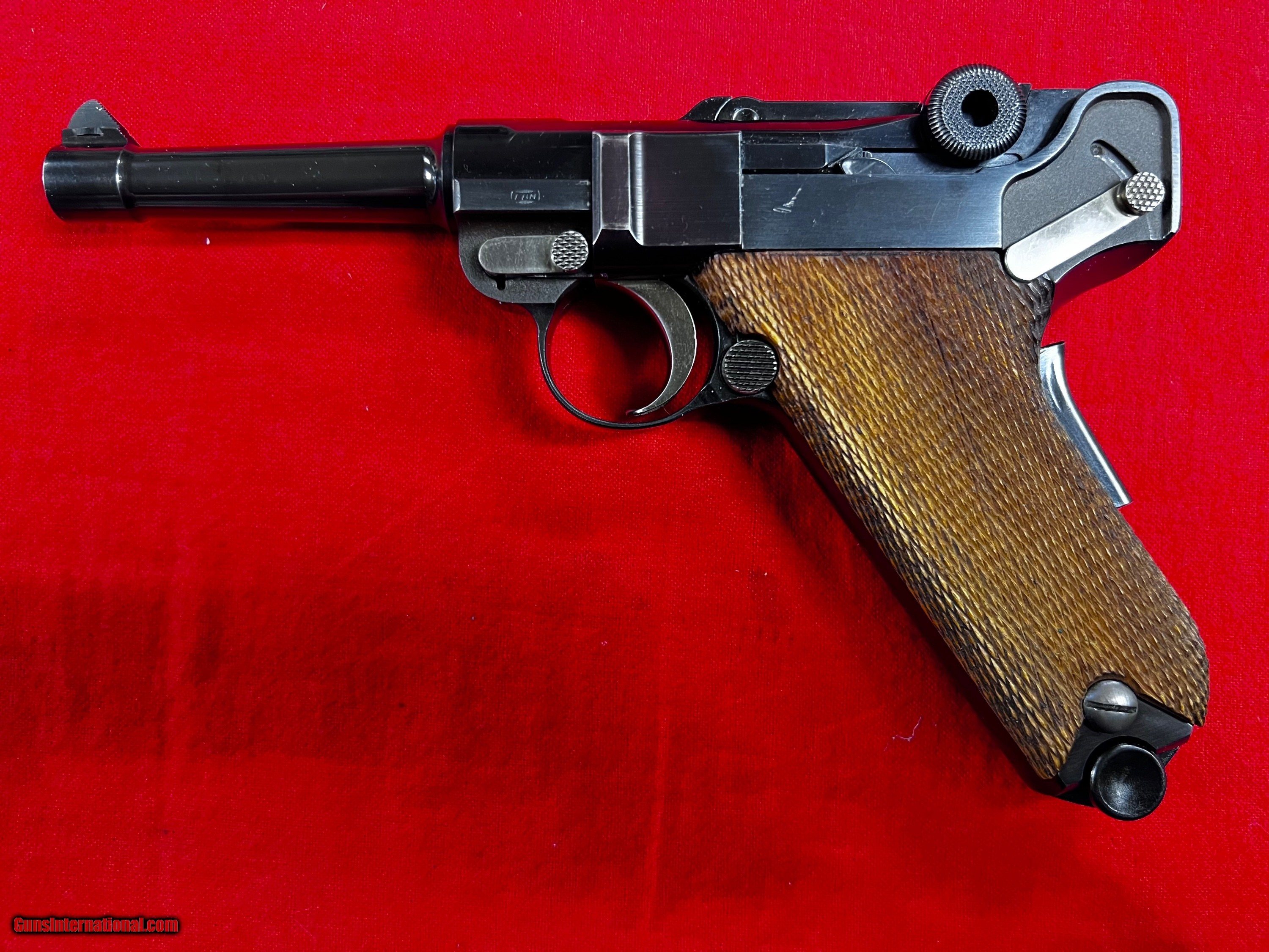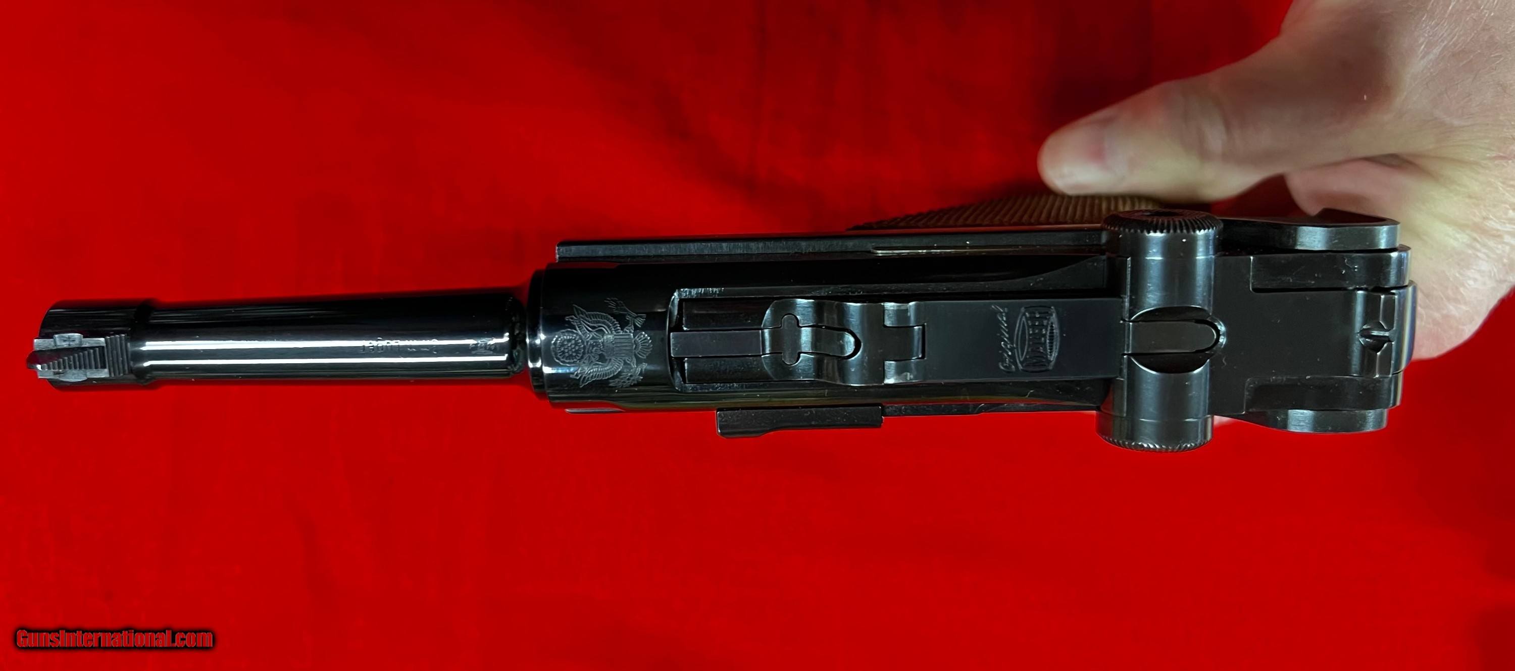 Excellent in factory box with two mags, loading tool, manual and test target Swiss pattern four inch 9mm