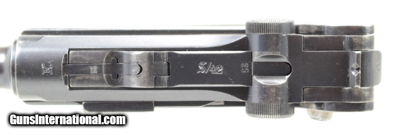 Description: This is an ORIGINAL MAUSER, K-DATE LUGER. All Numbers Match Except Mag. Letter K on Chamber Indicates 1934 Production (First Military Contract under Nazi's) Script S in Mauser Manufacture Code S/42 on Toggle. Gothic S on Small Parts (Takedown Lever, Sideplate, Front of Trigger Guard, Trigger, Mag Release, ETC. Last two digits of SN on all small Parts. Proofs are B-90, S-91 and Early Eagle. SOLD Curio/Relic: Yes |