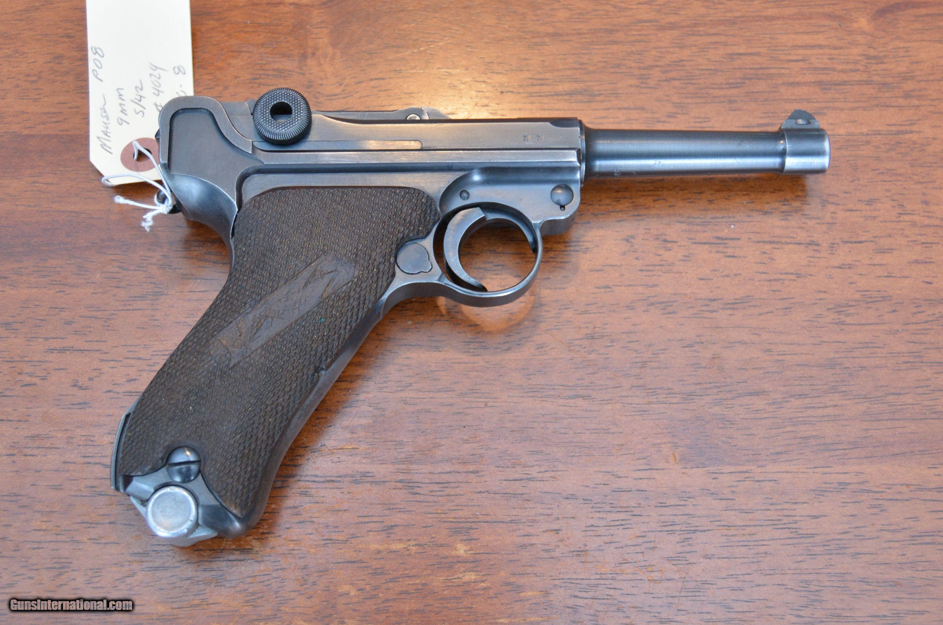 Description: Mauser (Luger) P-08, Code S/42 Dated 1938, Ser. 4024 S My friend and customer from California has asked me to sell his 9mm P-08 Luger by Mauser. This pistol bears serial # 4024 s. This example is 100% parts matching for the pistol with the exception being the magazine. I have personally disassembled the pistol and verified serialized parts content to be correct. There are no importers marks to be found this is a GI Bring Back. The pistol retains well over 94% of its original bluing. The wear areas for this pistol are on the front of the grip frame and the back on the shoulder stock lug. There is some very light and shallow pitting on the top of the barrel. There is some very light surface wear on the top of the frame from holster storage and carry. The various proof marks are quite legible. The major deductions or deletes would be in the surviving condition of the grips. While neither are cracked there are numerous chips missing along the edges and some of the diamonds are worn down. Worst is the right panel which at some point suffered from the GI apparently carving his name or something into the right panel. The supplied magazine has an aluminum bottom and is serial # 4492. Yes, we can and do ship firearms into California. Shipping will be $20.00 USPS Priority Mail. If illegal to own in your area don’t buy. Payment with US Funds from US Banks ONLY!!! We accept Cash, Checks, Money Order and US Postal Money Orders. Lay Away available. We also accept Visa, MasterCard, AMEX and Discover at 2.8% service fee. All items ship when final payment clears, no exceptions. Sorry we cannot accept PayPal for firearms or ammunition, their policy not ours. Please make sure to check our other offerings as we are consigning some very interesting and desirable firearms this month. We do have a law away plan for all our items. We cannot accept PayPal for firearms or ammunition, their rules not ours. Call 865-805-1187 for details or questions. SOLD Manufacturer: Mauser byf 42 Model: P-08 Serial Number: 4024 Condition: Excellent Metal Condition: 94% Bore Condition: Very good to Excellent Action: Semi Auto |