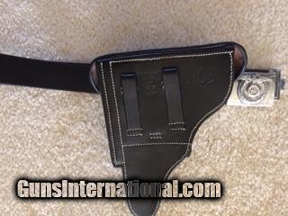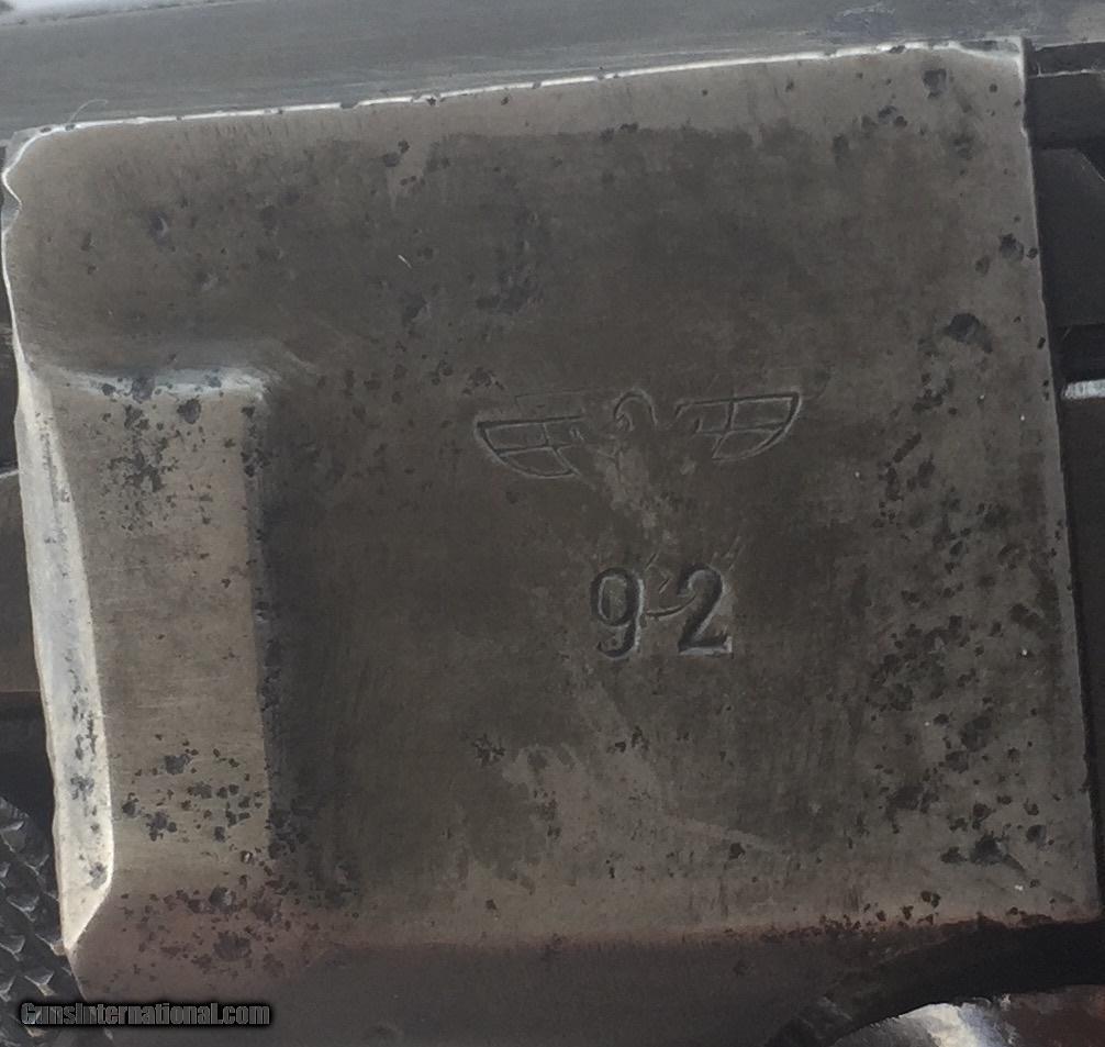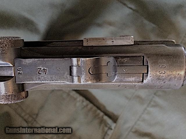 Description: Mauser Luger Code 42, 9mm. NAZI Eagle has faint double mis-mark on left side of receiver. Bore OK, Finish shows some pitting. Good shape. Shoots fine and accurately. Matching numbers, with no number on magazine. SN 4692 or 92 shown on major parts. Included std. nickle magazine. Gesichert shown (Protected-Safety) on safety. 1939 on top of receiver. Std. bakelite grips in good shape with no cracks or pits. Comes with new black leather luger holster and belt with SS Nazi Marked buckle. Belt and holster are reproductions. Luger is very real. C&R. Ships UPS or FEDEX. SOLD Curio/Relic: Yes Manufacturer: Mauser Model: P08 Serial Number: 4692 Caliber Info: 9mm Condition: Used Metal Condition: pits Bore Condition: some pits Action: Toggle |