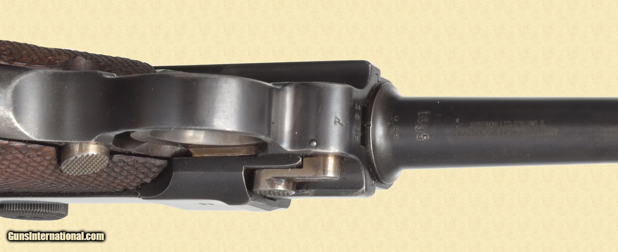 Description: 9 mm; 85% blue, 50% straw, fair bore, good grips, 4'' barrel, Original blue finish, strawed small parts and checkered walnut grips. Numbered parts are matching except the magazine and toggle pin. The extractor and grip panels are not numbered. Magazine is a blued sheet steel variation with aluminum base which has been re-numbered 4000x with a stick eagle/63 proof. Top of toggle stamped with the Mauser code "S/42" and the top of the chamber is stamped with the date code "G" (1935). Right side of receiver stamped with an eagle/211 proof and an S/92 proof. Droop wing eagle military acceptance marks. Barrel marked over the left side with an eagle/211 proof. Our import mark on the bottom of the barrel. Mechanically fine. C&R/FFL Please call (309)342-5800 Tues-Fri, 10 am -6pm (CST), or Sat 1pm-6pm (CST), to speak with our sales team for further information, or to purchase firearms. FEDERAL FIREARMS LICENSE (FFL): is required on all shipments of modern guns. We must wait for a copy from your dealer before we can ship to them. We will also ship C&R eligible firearms to Curio and Relic (C&R) license holders. We accept your signed, legible FFL and C&R licenses via fax at 309/ 342-5730 (always on), email at FFLsimpsonltd or through the mail at Simpson Ltd; 140 S Seminary St; Galesburg, IL 61401. Pre-1898 firearms and non-firearms items are exempt from licensing requirements. All items shipped to an Illinois address will be charged 8.75% sales tax. NOTE: Because of recent shipping restrictions and charges placed on us by UPS and FedEx (handguns must ship via next day or 2nd day air and they have added a $10 surcharge for parcels over 48”. Our return policy lasts a maximum of 3 days from the time you receive your item. If 3 days have passed since you received your purchase, and we have not been contacted by you, unfortunately, we can’t offer you a refund or exchange. If you are not happy with your purchase, please contact us by phone and/or email to arrange for a return. Items must be shipped back to us to arrive with 7 days of notification of return. LAYAWAY POLICY: We are willing to put items on layaway for you under the following conditions: The item must be priced at $500 or more with a 20% minimum deposit and must be paid off within 30 days. You may have a maximum of 2 items on layaway at one time. If the balance is not paid off within the 30 day period, all deposits and payments will be forfeited and not returned or applied to another item. SOLD Curio/Relic: Yes Serial Number: 1695d |