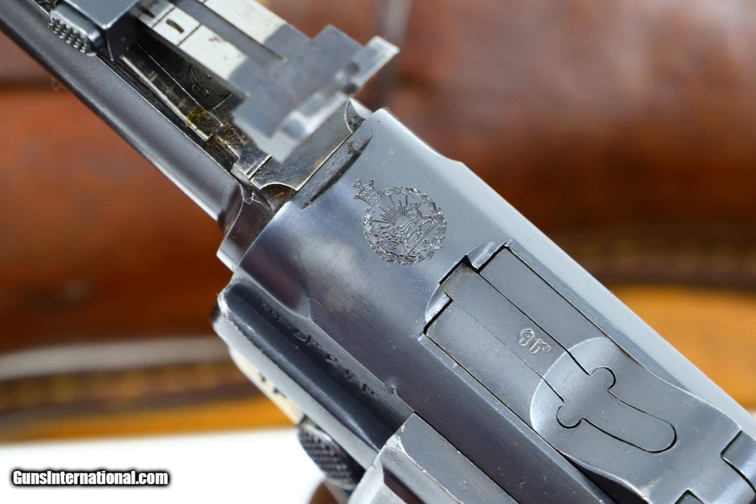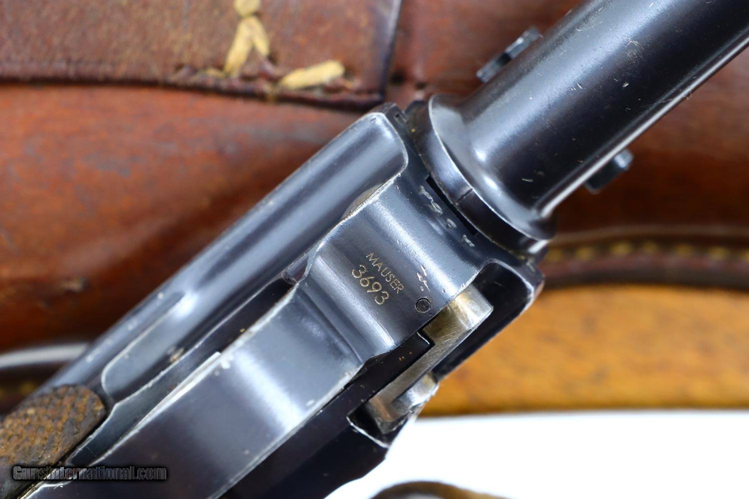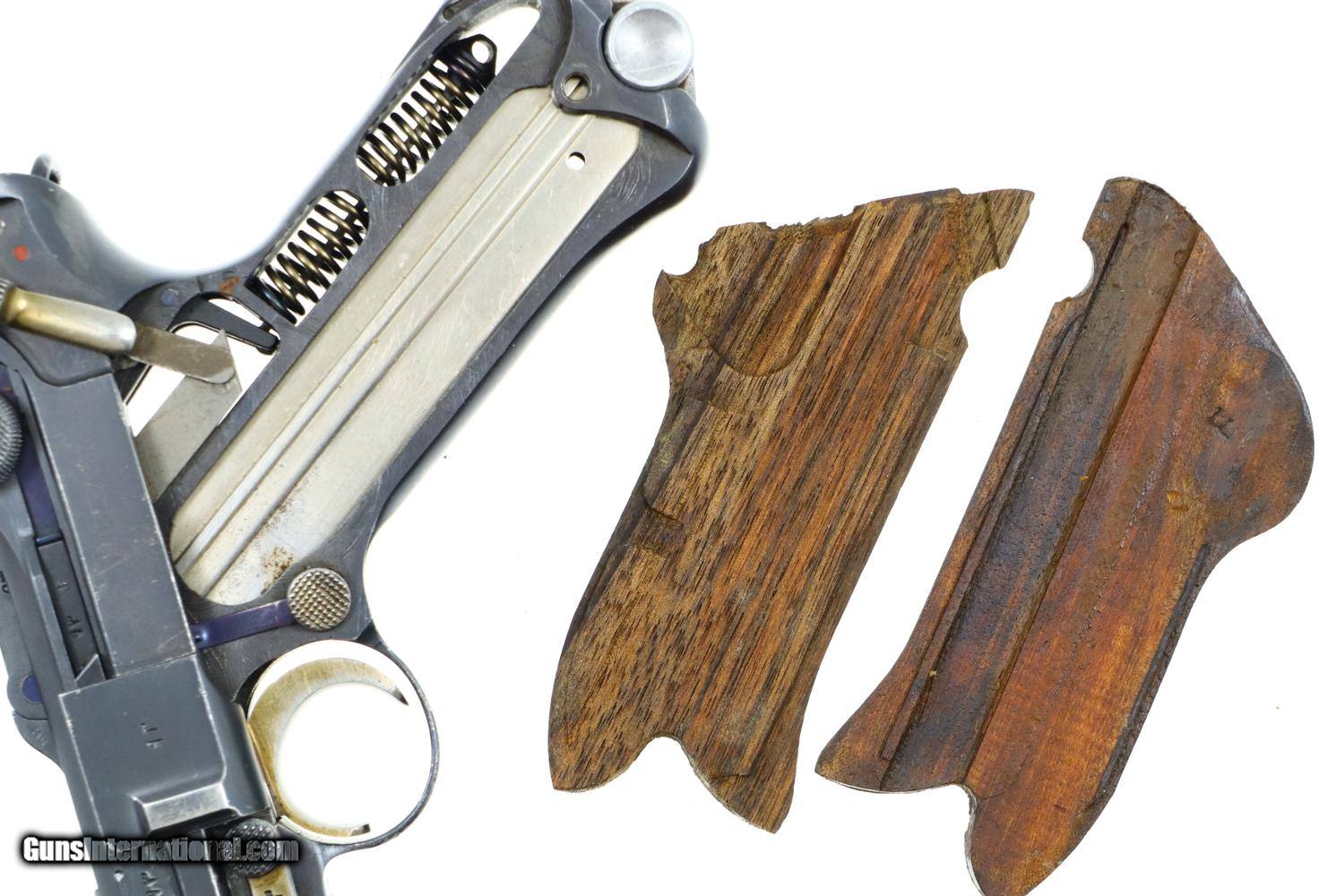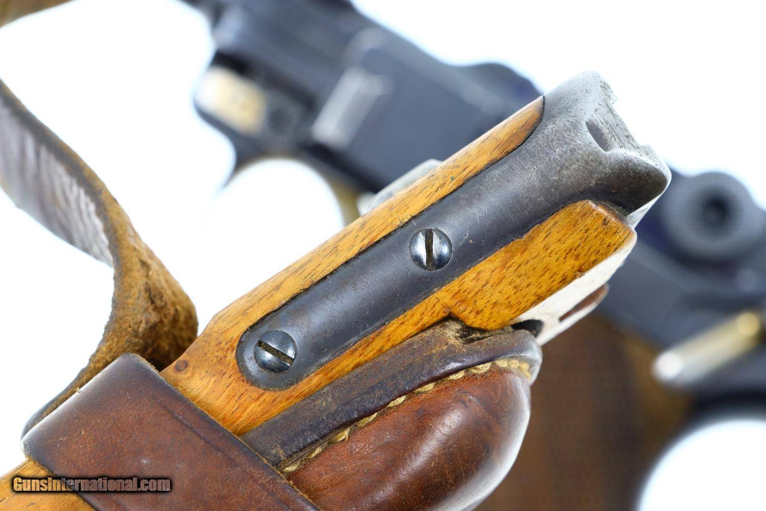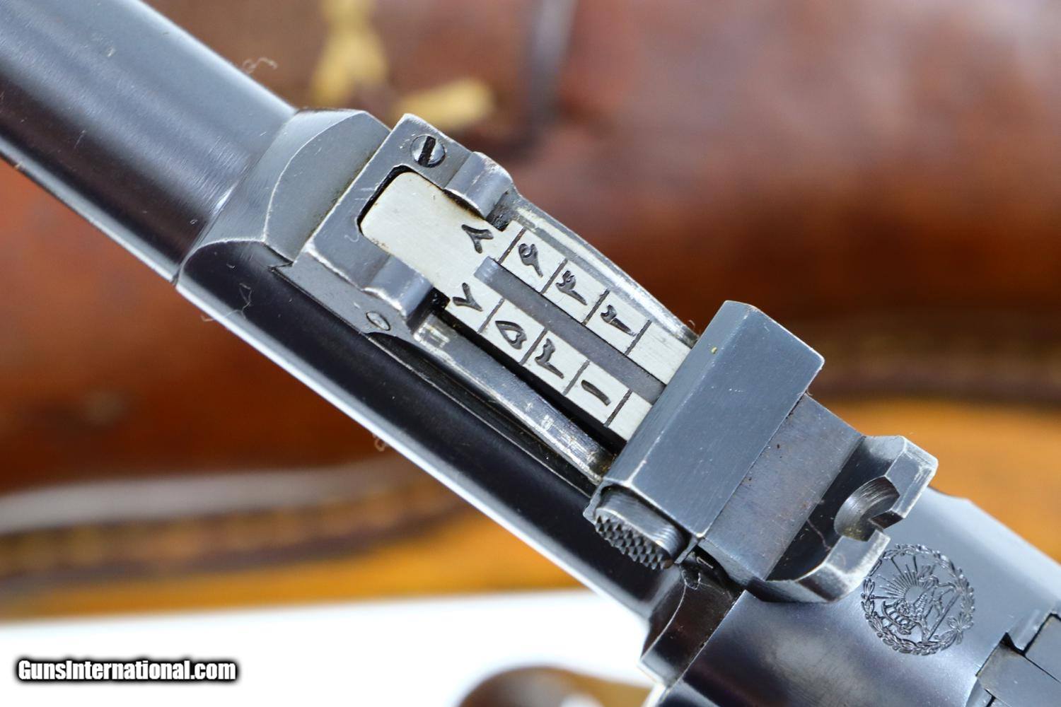 Description: Synopsis: Mauser, P08, Persian Artillery Rig, 3693, FB00835 Description: Mauser Persian Artillery P08 Luger, production limited to 1000 pistols with delivery 1935-1936, this pistol is fully matching except the unnumbered grips and the mismatched magazine. Standard configuration Artillery Luger with 8” barrel having a drift adjustable front sight and tangent rear sight marked with 8 Farsi digits. Persian crest over chamber with translated Mauser on center toggle link. Full serial number on forward frame with last two digits on all usual small parts except barrel (properly unnumbered), grips and magazine. Strawed takedown lever, trigger, safety, and magazine release button. Checkered walnut grips and nickle bodied magazine with aluminum plug. Complete with original but mismatched Persian shoulder stock rig including cleaning rod, shoulder straps and double magazine pouch. The takedown tool and boot are missing, there is an extra hole on boot strap to engage the encircling holster retainer and one of the brass studs that secures the shoulder strap loops is undersized. Condition: VG+ pistol with original finish having sharp edge and holster wear as one might expect from a gun that has seen moderate use, the replacement grips, magazine, and rig in comparable condition. Near mirror bore. Perfect manual mechanics. An unusual rig that is seldom offered for sale. ~~Insured shipping fee of $155; most packages shipped using FedEx 2nd Day.~~ SOLD Curio/Relic: Yes Manufacturer: Mauser Serial Number: 3693 Caliber Info: 9 Luger |