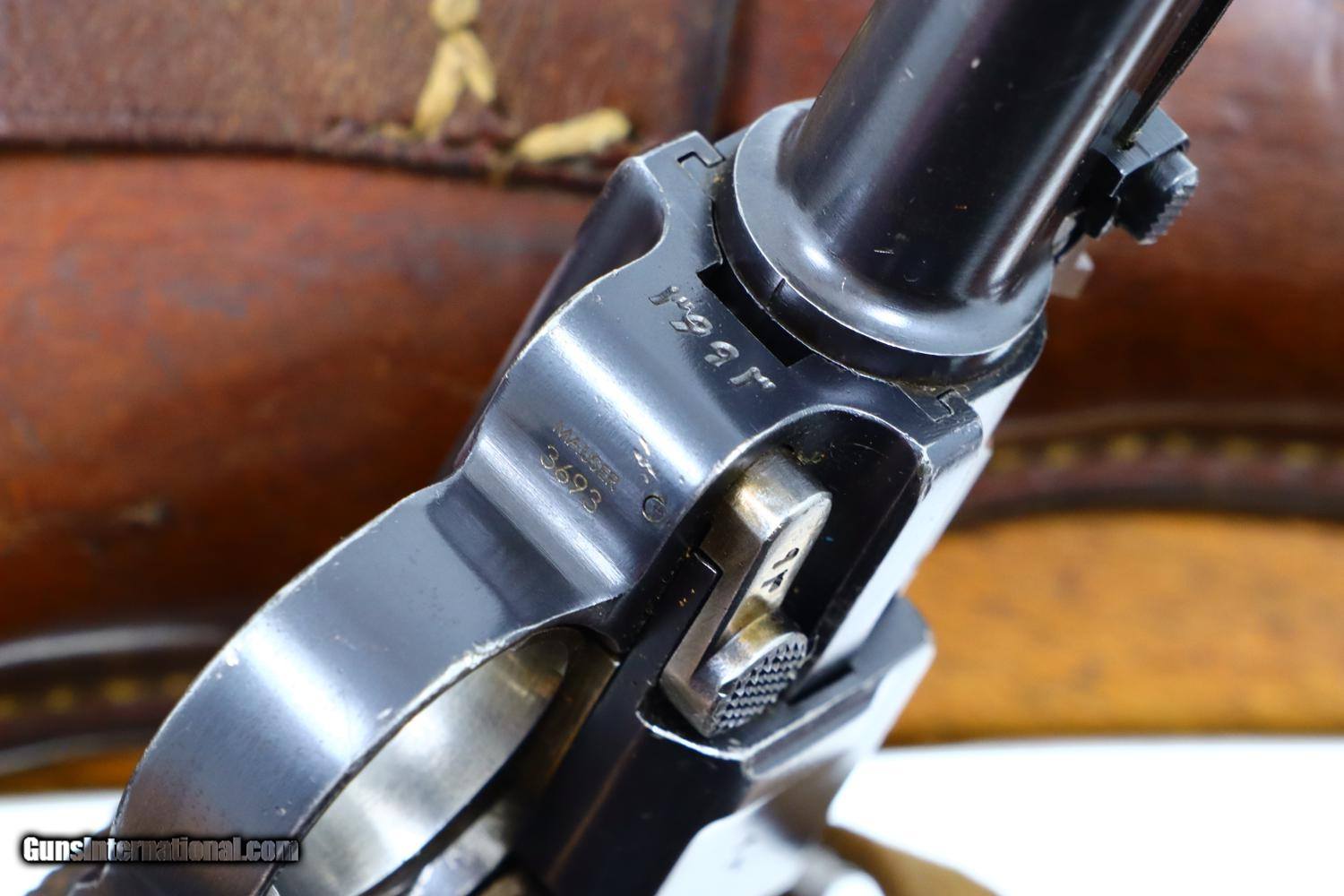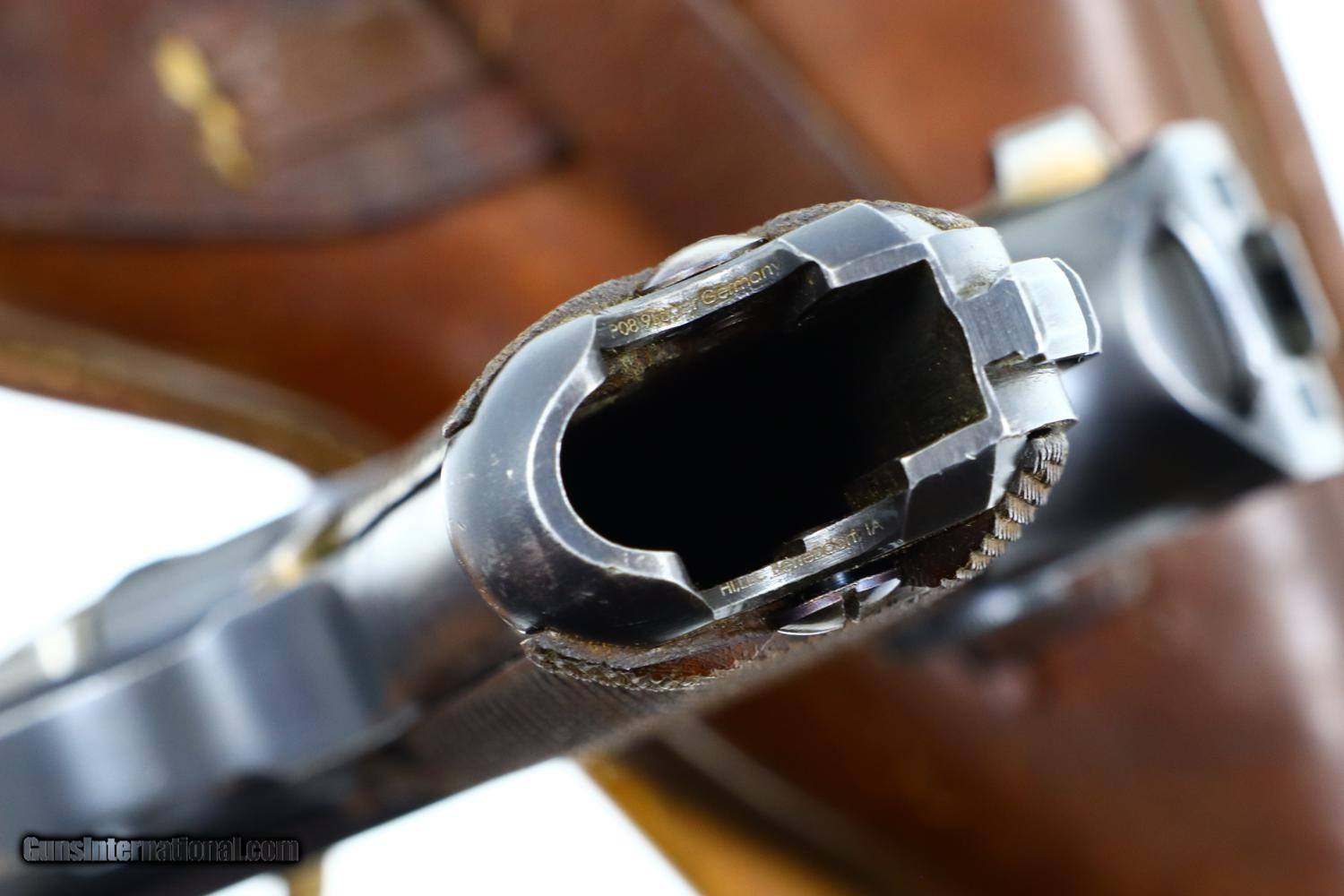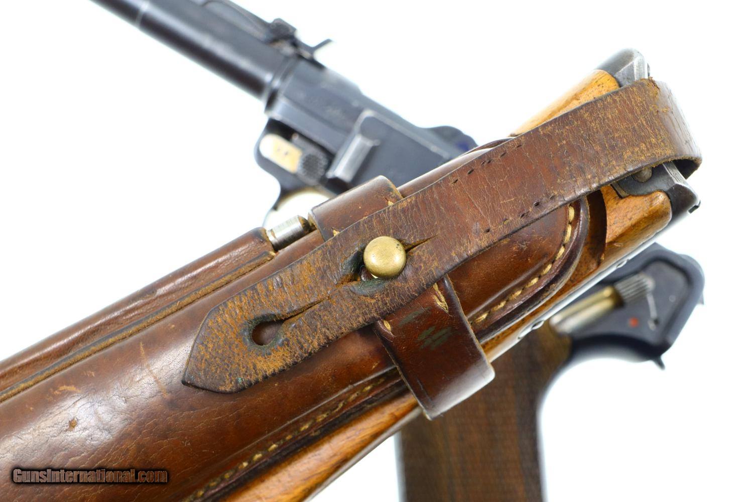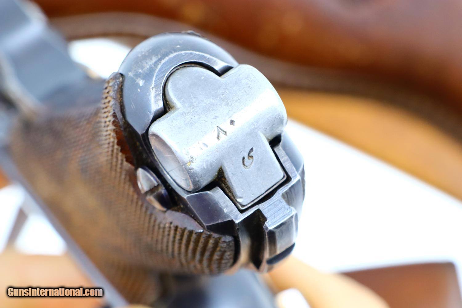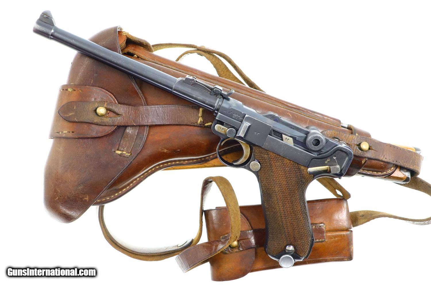 Description: Synopsis: Mauser, P08, Persian Artillery Rig, 3693, FB00835 Description: Mauser Persian Artillery P08 Luger, production limited to 1000 pistols with delivery 1935-1936, this pistol is fully matching except the unnumbered grips and the mismatched magazine. Standard configuration Artillery Luger with 8” barrel having a drift adjustable front sight and tangent rear sight marked with 8 Farsi digits. Persian crest over chamber with translated Mauser on center toggle link. Full serial number on forward frame with last two digits on all usual small parts except barrel (properly unnumbered), grips and magazine. Strawed takedown lever, trigger, safety, and magazine release button. Checkered walnut grips and nickle bodied magazine with aluminum plug. Complete with original but mismatched Persian shoulder stock rig including cleaning rod, shoulder straps and double magazine pouch. The takedown tool and boot are missing, there is an extra hole on boot strap to engage the encircling holster retainer and one of the brass studs that secures the shoulder strap loops is undersized. Condition: VG+ pistol with original finish having sharp edge and holster wear as one might expect from a gun that has seen moderate use, the replacement grips, magazine, and rig in comparable condition. Near mirror bore. Perfect manual mechanics. An unusual rig that is seldom offered for sale. ~~Insured shipping fee of $155; most packages shipped using FedEx 2nd Day.~~ SOLD Curio/Relic: Yes Manufacturer: Mauser Serial Number: 3693 Caliber Info: 9 Luger |