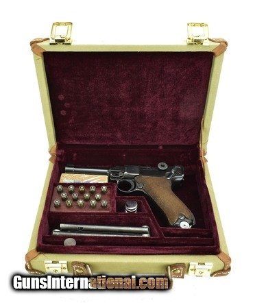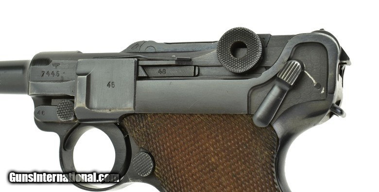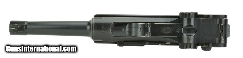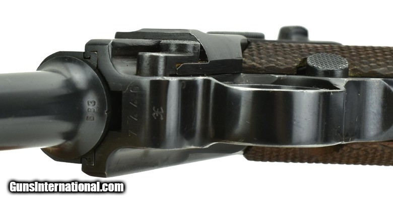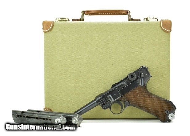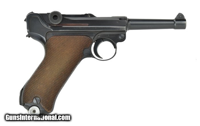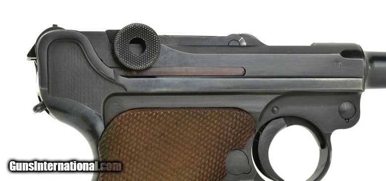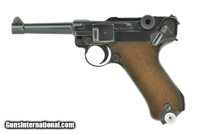 Description: Mauser Police Luger 9mm caliber pistol. Extremely fine 1941 Mauser Banner Police issue Luger. Serial numbers are all matching, including three numbered magazines. Bore is excellent. Approximately 99% original finish. Right side of frame is eagle L marked. Grip checkering is sharp. Third magazine is eagle C marked. A beautiful Mauser Banner Luger.