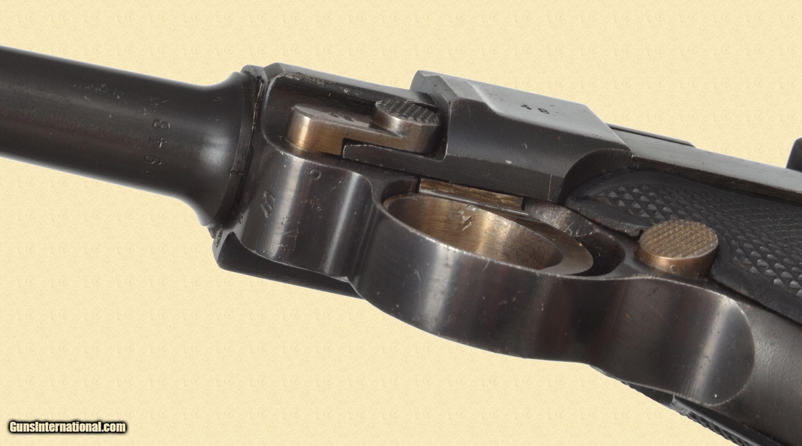 Description: 9mm; 95% blue, 90% straw, excellent bore, excellent grips, 4"'' barrel, 41 Two digit date Banner for Portuguese Navy. Rare 3rd Contract of only 25-30 guns. "SEGURANCA" marked safety. "CARREGADA" marked extractor. Matching down to firing pin & toggle pin. Excellent black plastic bottom fxo magazine. With minor dings & scratches typical of Portuguese guns, this is the nicest example of this variation we have ever seen. SOLD Curio/Relic: Yes Serial Number: 6948w |